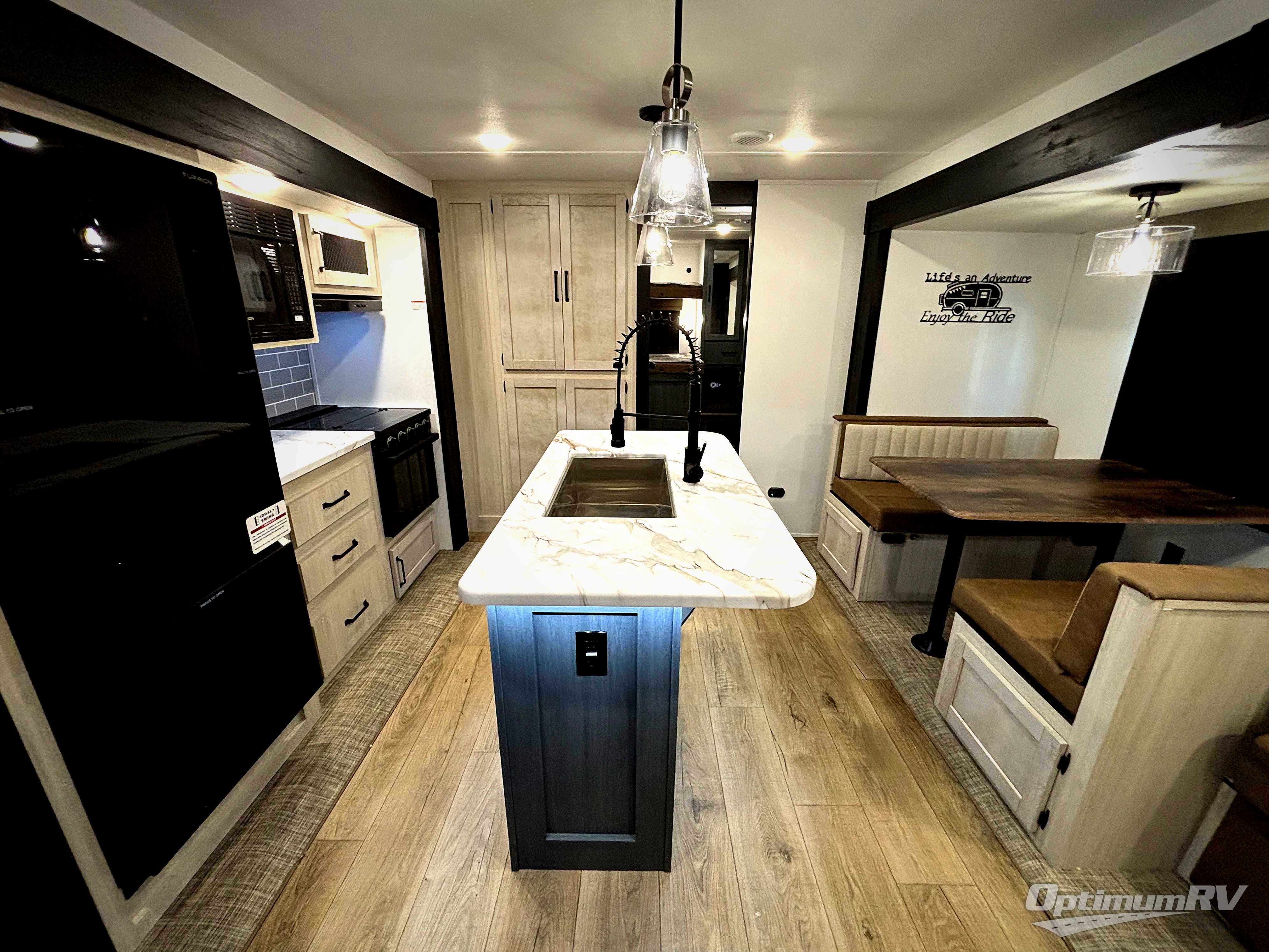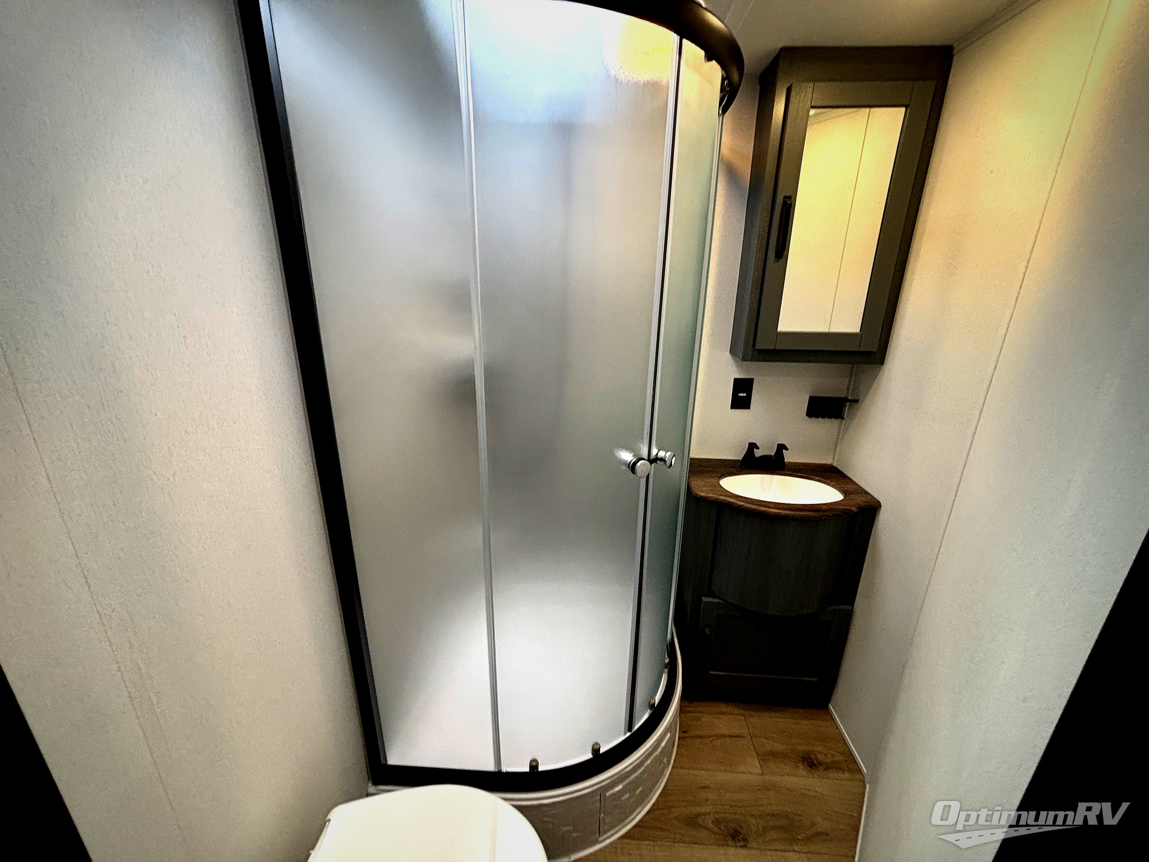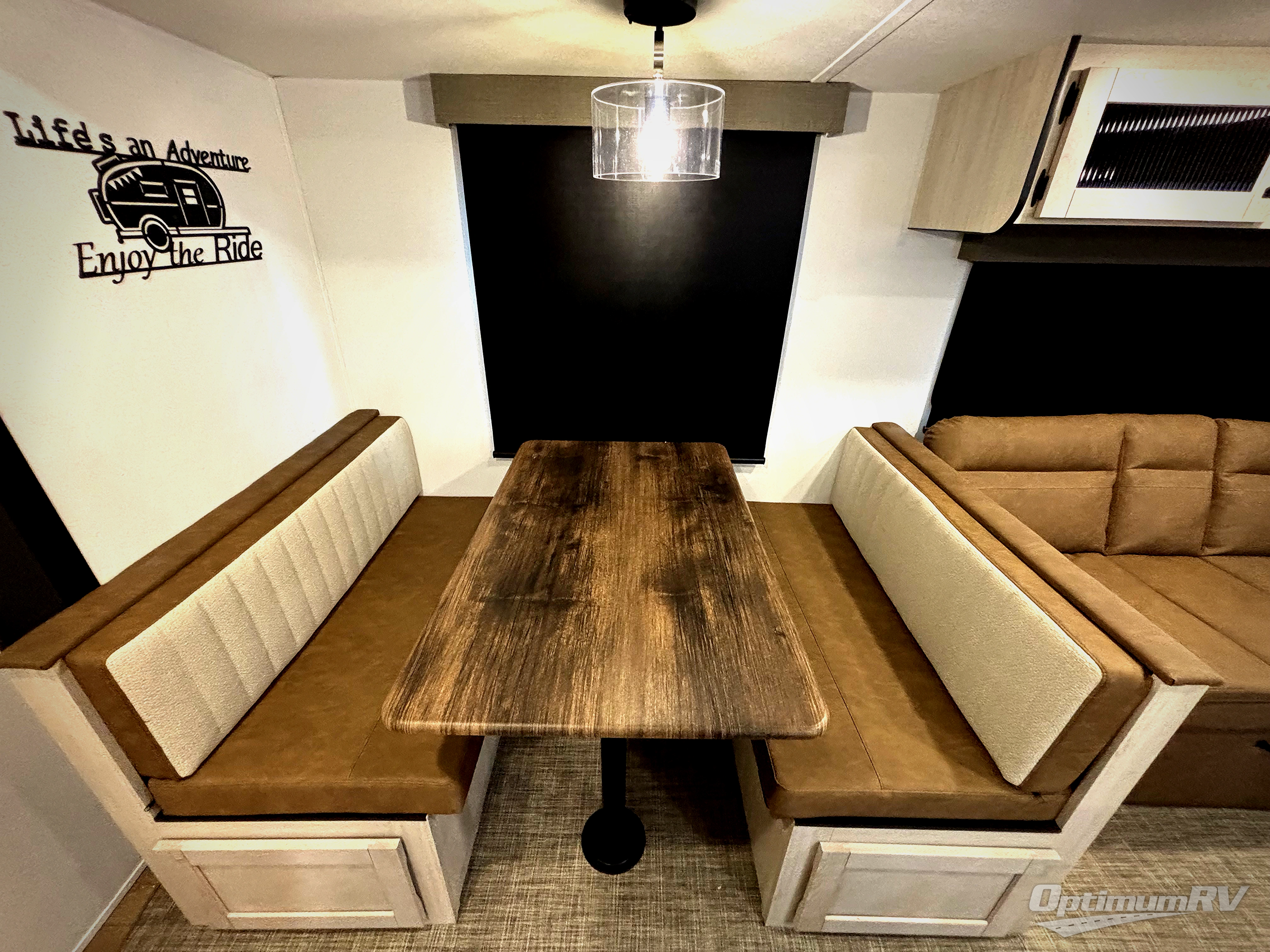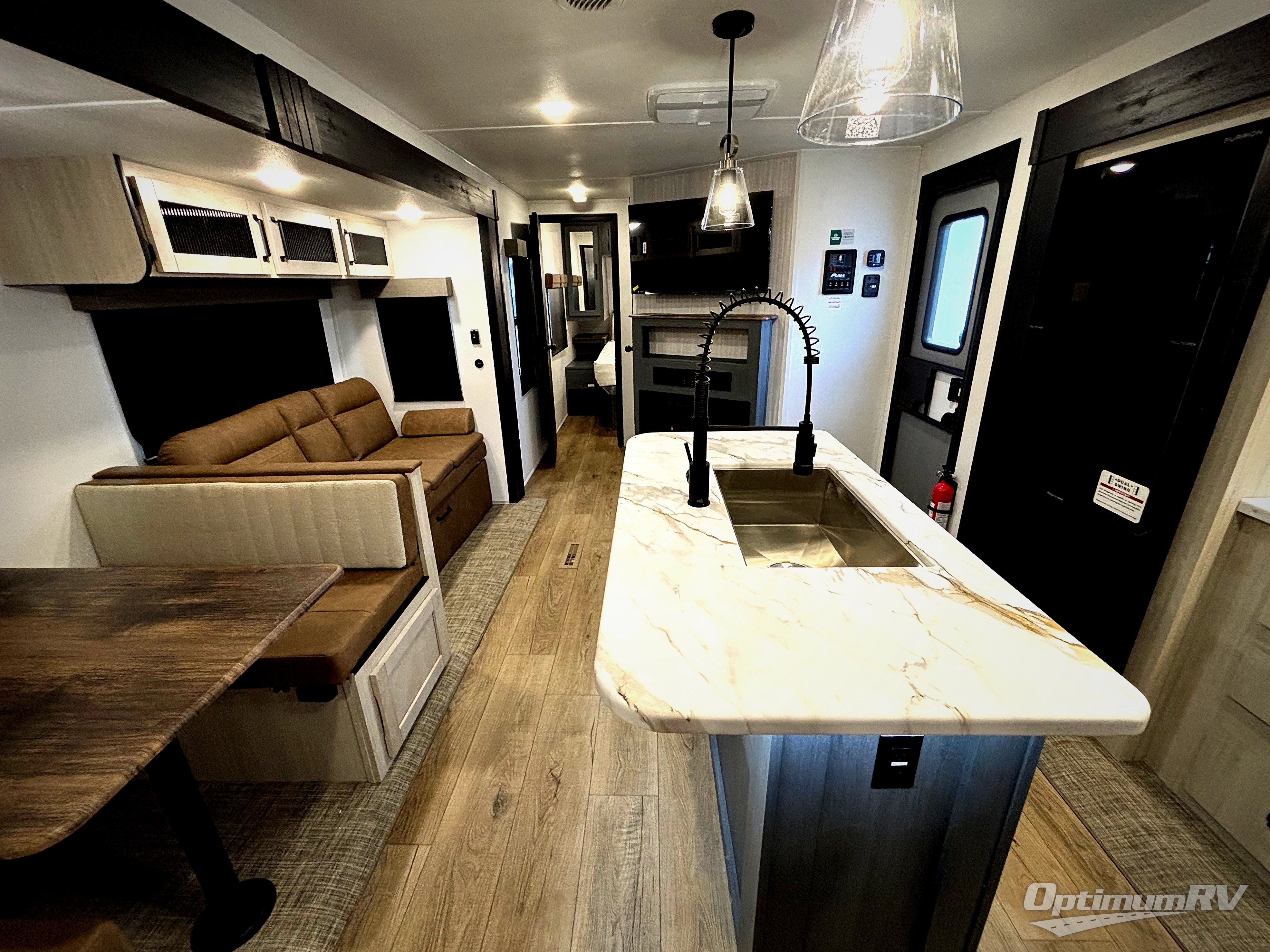 With two full bathrooms, it's a clean decision to take this travel trailer on your next family vacation! Start each morning feeling recharged after sleeping on the queen bed in the front private bedroom or in the rear private bunkhouse with an angled top bunk above a 32" x 69" double bunk bed and a 32" x 69" bunk above a 68" sofa slide. The bunkhouse also has a full bathroom with a 24" x 40" tub and one of the dual entry doors to the unit. You can relax on the sofa while enjoying the entertainment center and eat your meals prepared with the kitchen island at the booth dinette.