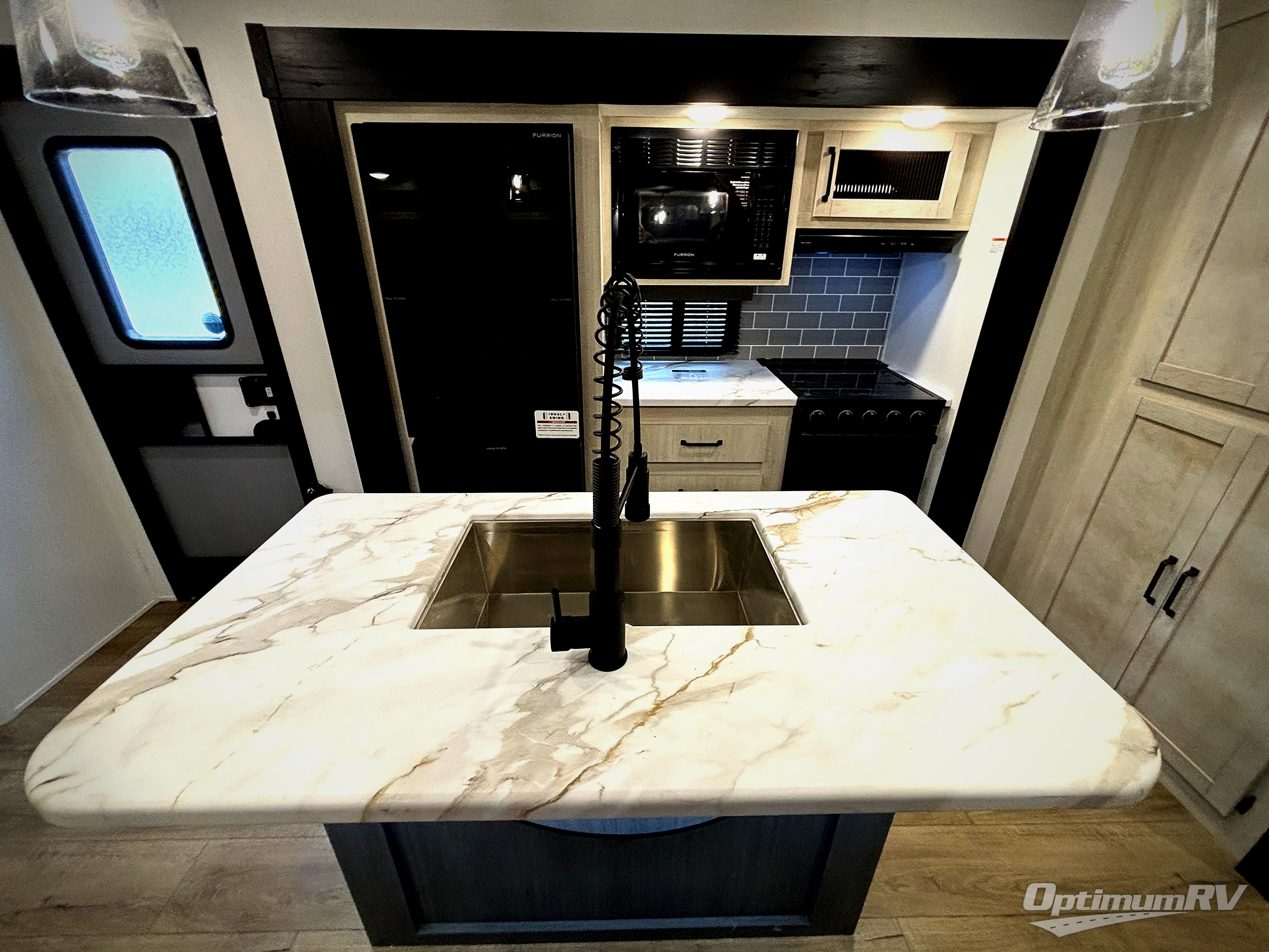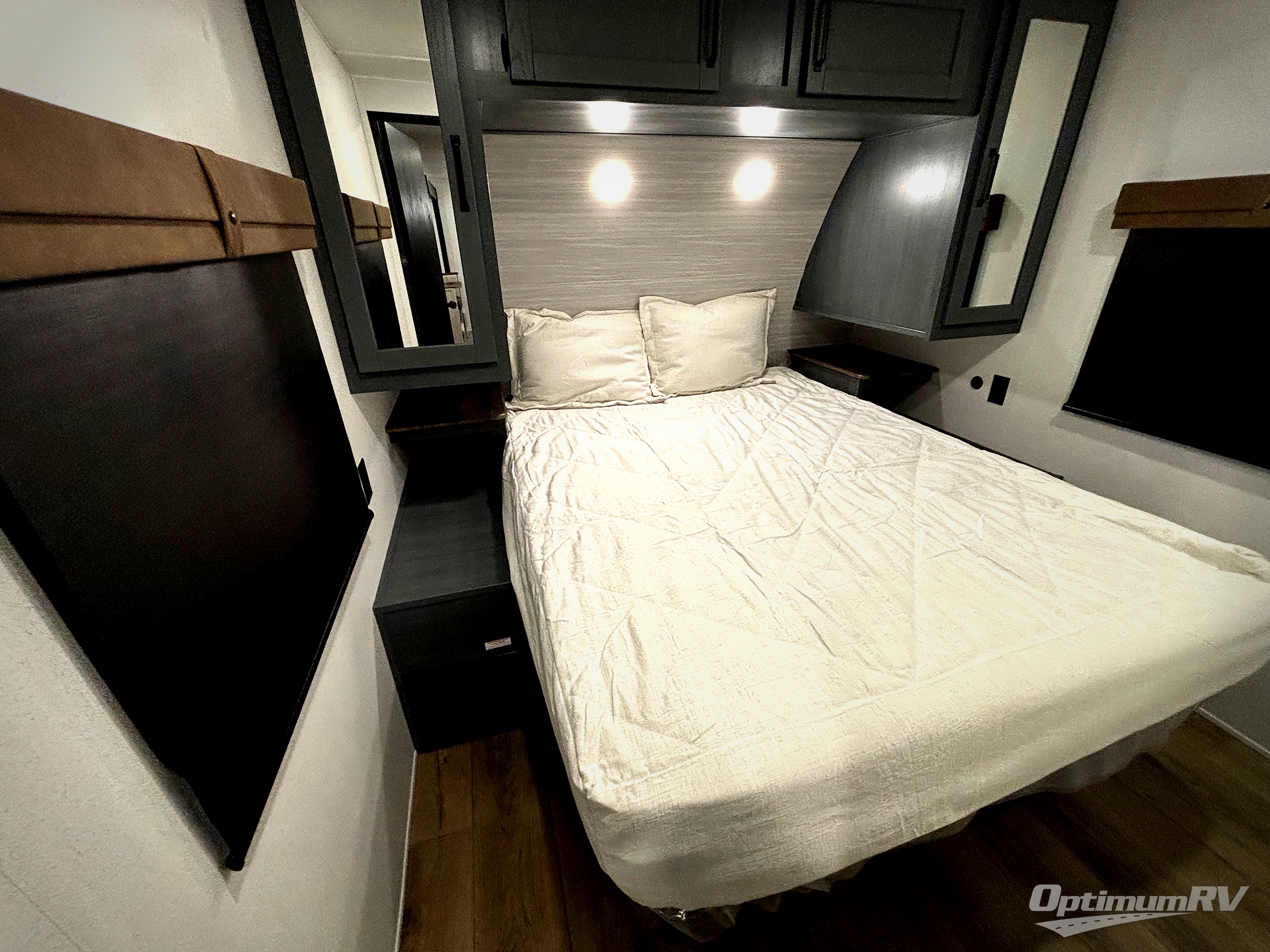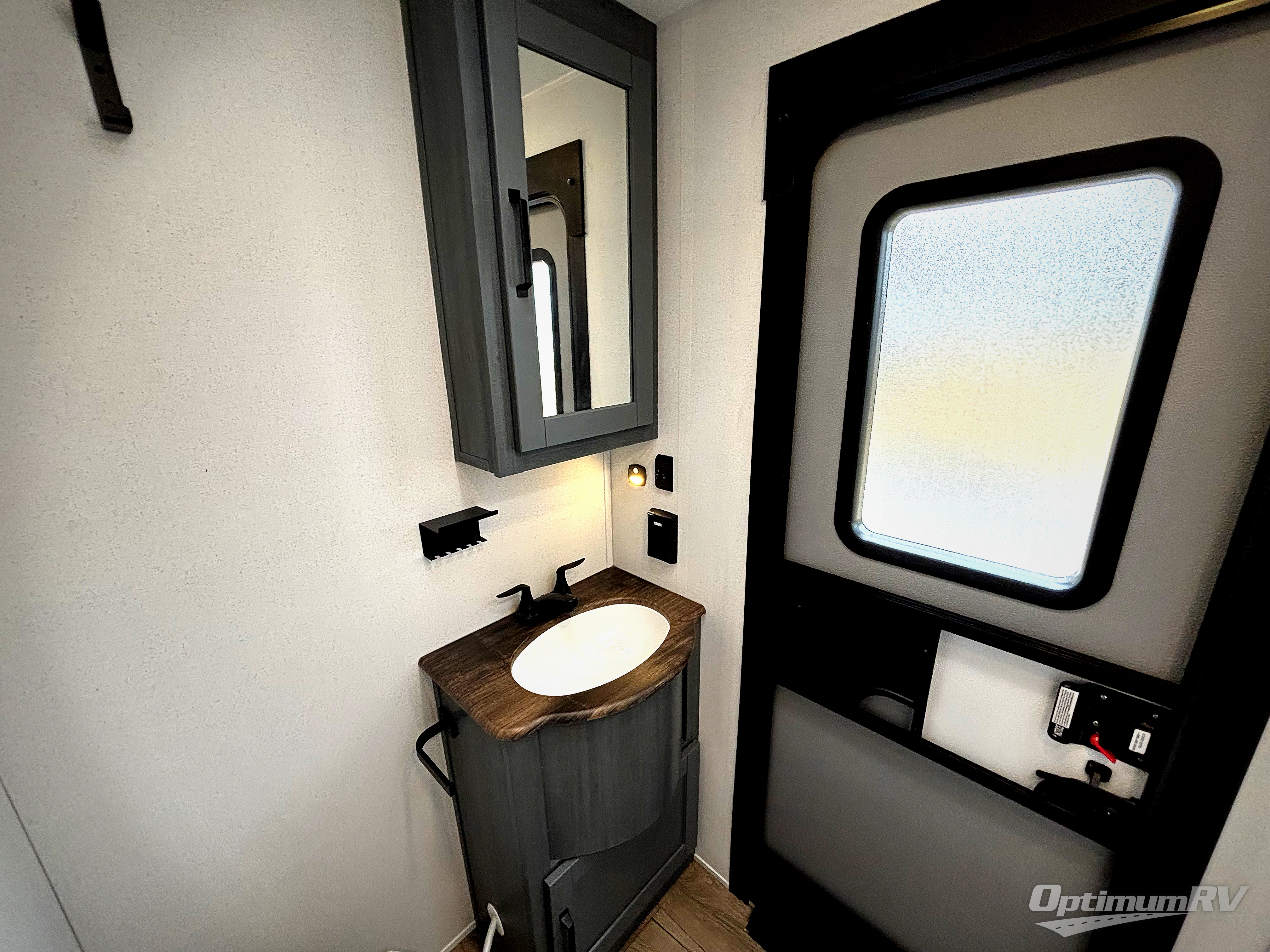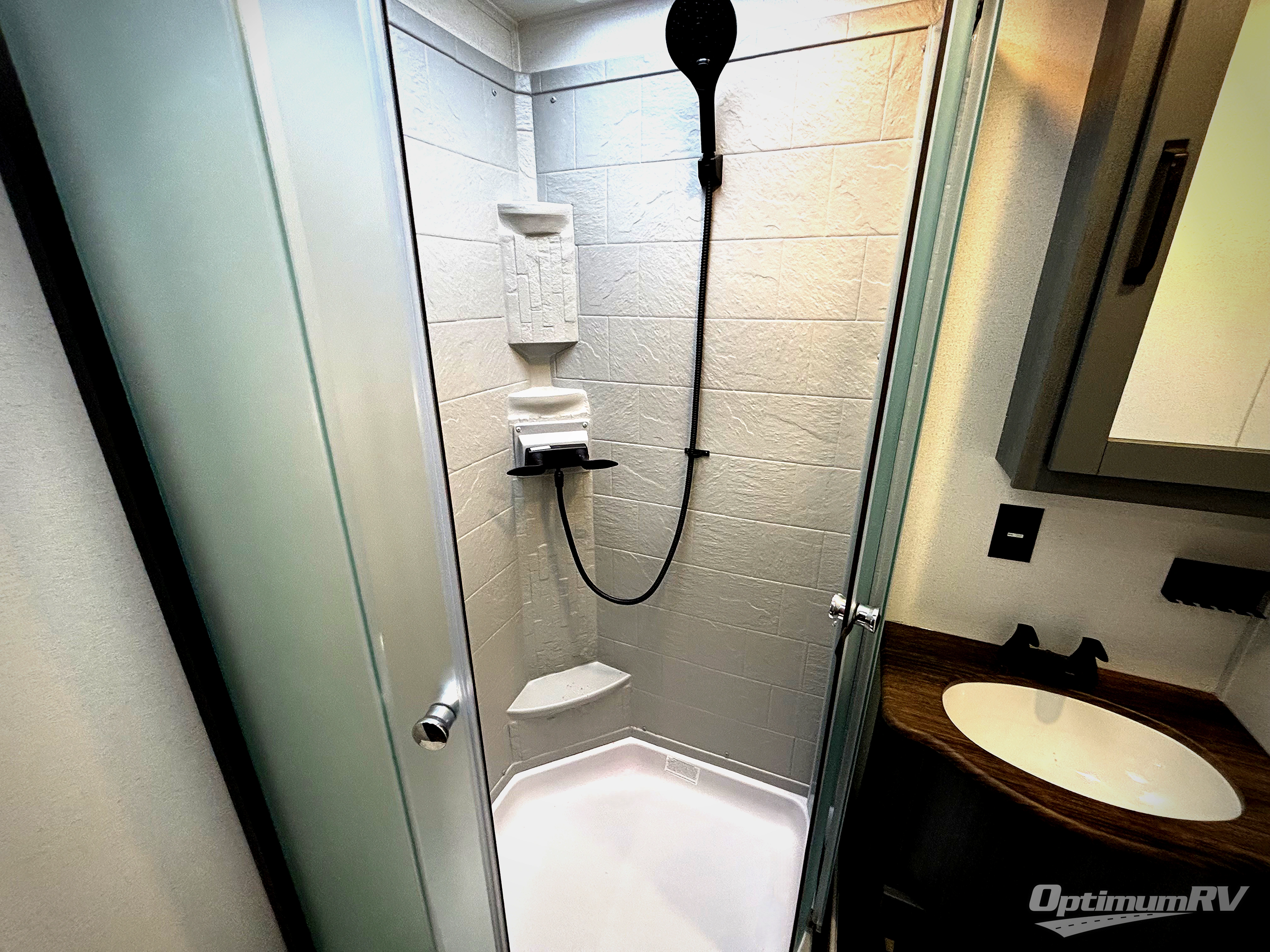 With two full bathrooms, it's a clean decision to take this travel trailer on your next family vacation! Start each morning feeling recharged after sleeping on the queen bed in the front private bedroom or in the rear private bunkhouse with an angled top bunk above a 32" x 69" double bunk bed and a 32" x 69" bunk above a 68" sofa slide. The bunkhouse also has a full bathroom with a 24" x 40" tub and one of the dual entry doors to the unit. You can relax on the sofa while enjoying the entertainment center and eat your meals prepared with the kitchen island at the booth dinette.
