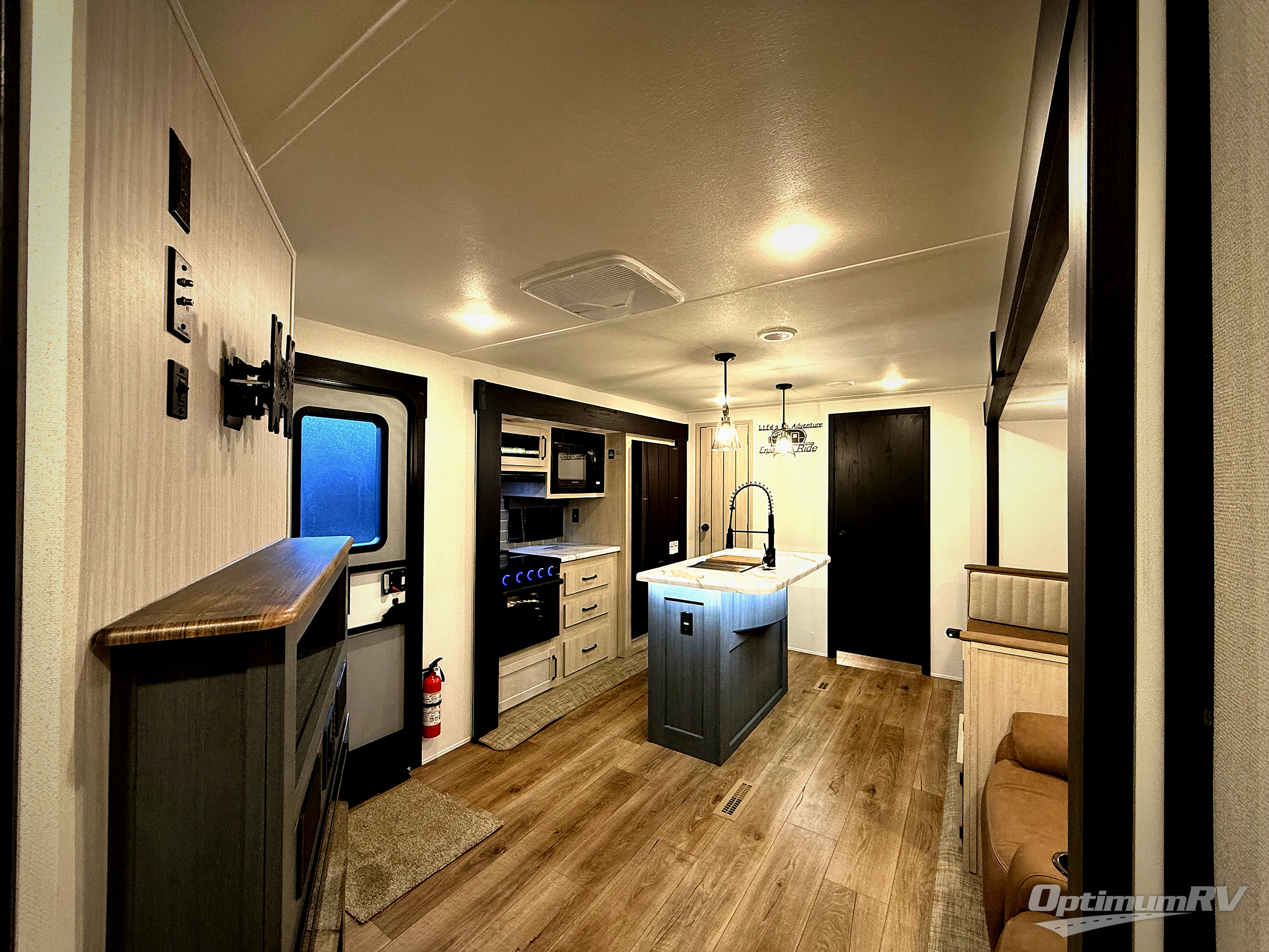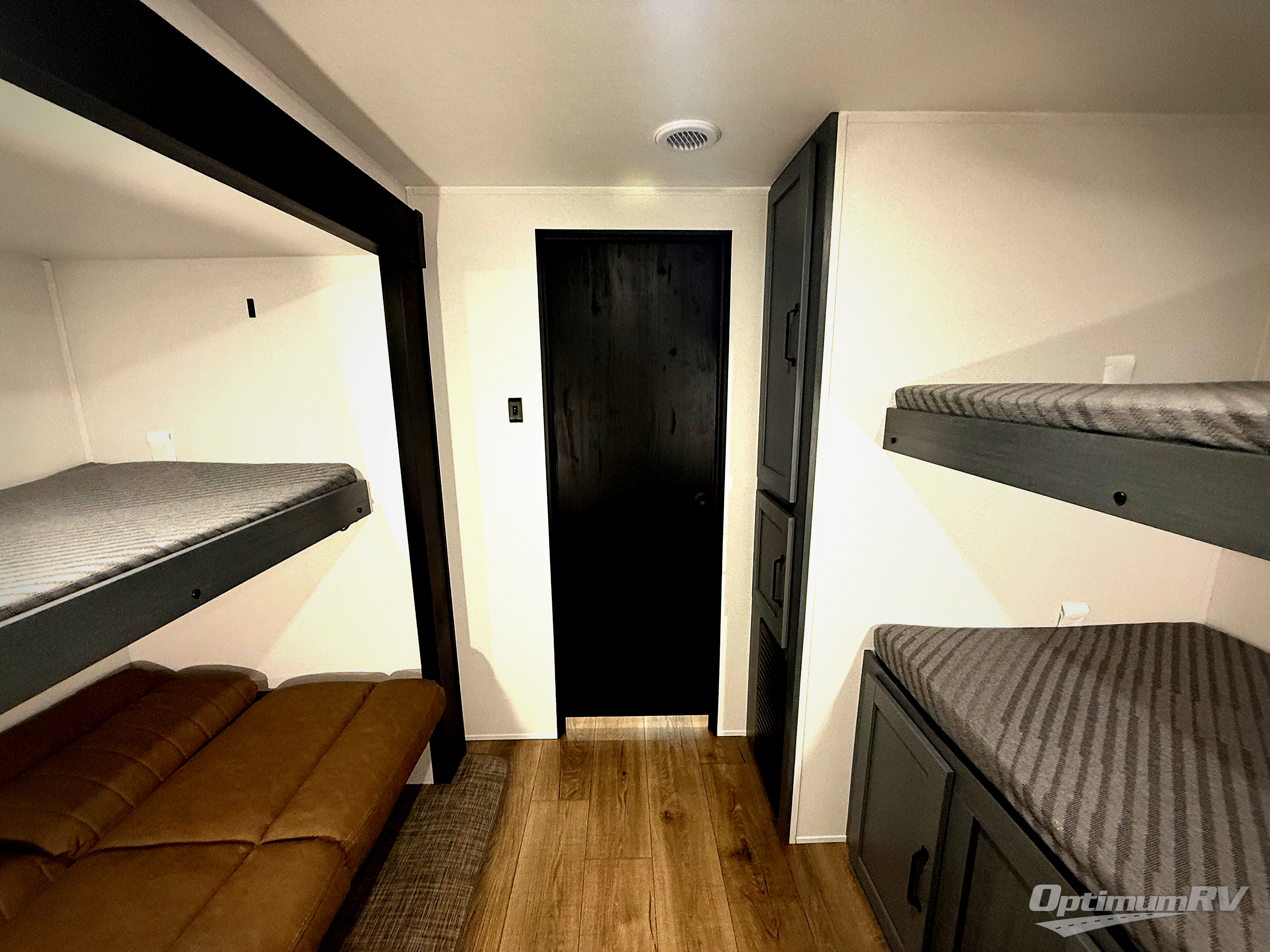 You will be the talk of the campground with this travel trailer! The front private bedroom has a queen bed slide across from a dresser and a front closet plus a second closet with washer and dryer prep. Freshen up each morning in the full bathroom with the 34" x 34" radius shower then head to the kitchen to fry up some eggs with the stainless-steel oven and range. You can enjoy your meals at the booth dinette, and the kitchen island will make your clean up easier with the sink that has a high-rise faucet and sprayer. The rear private bunkhouse has a 32" x 69" bunk above a jiffy sofa slide, a 36" x 69" bunk above a 36" x 71" bunk and a linen closet. Choose one of the outside kitchen options for even more convenience!
