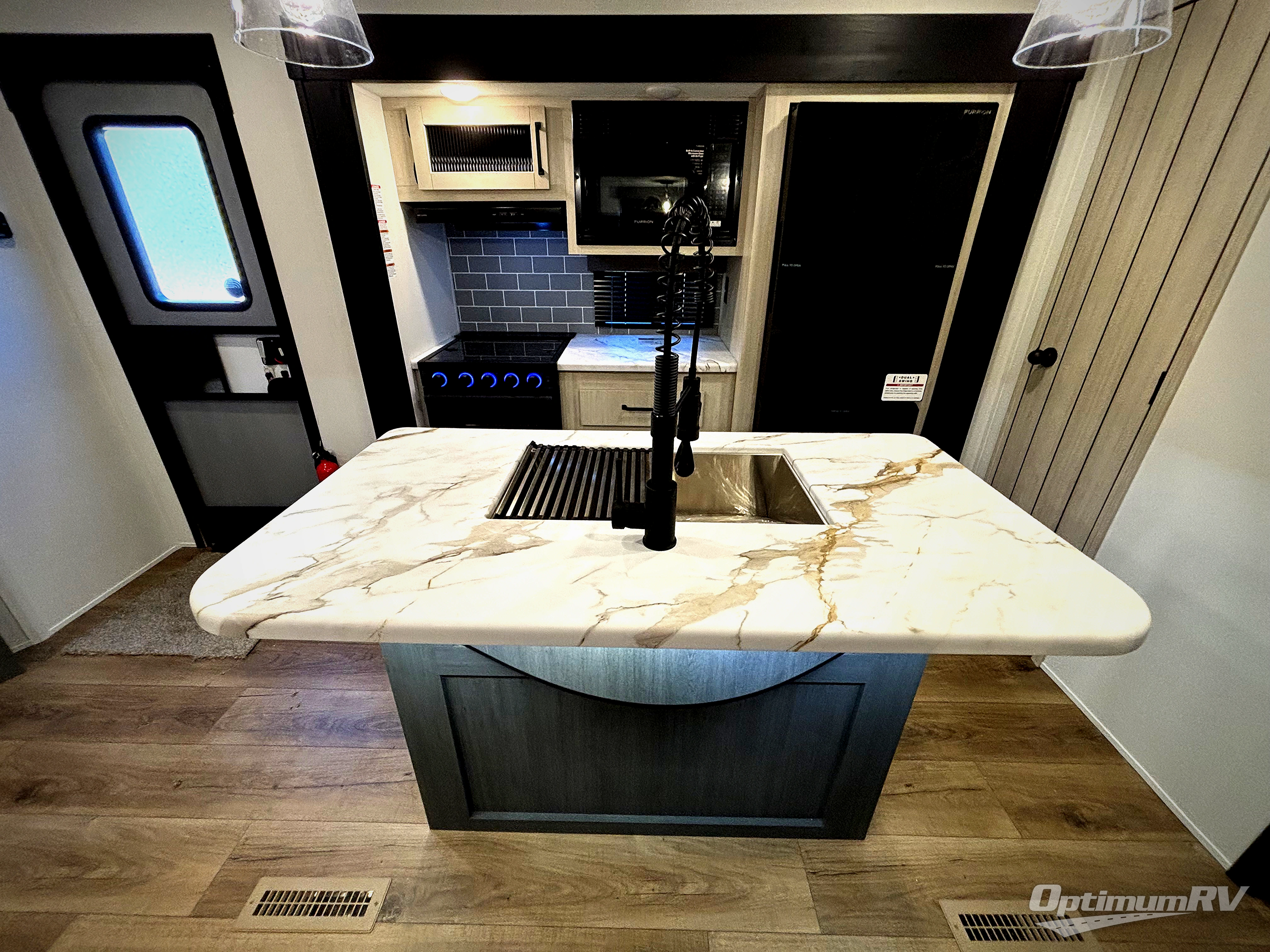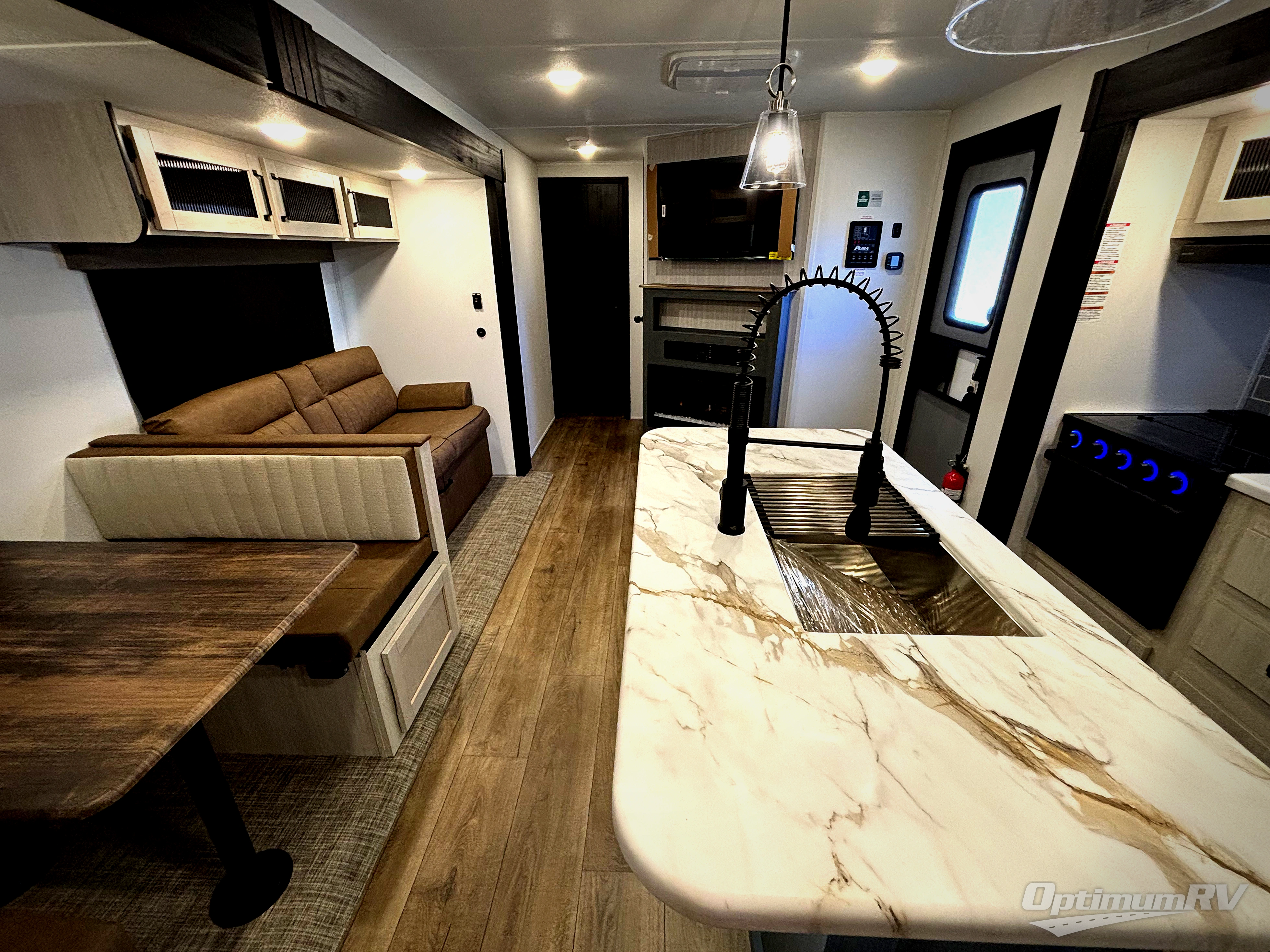 You will be the talk of the campground with this travel trailer! The front private bedroom has a queen bed slide across from a dresser and a front closet plus a second closet with washer and dryer prep. Freshen up each morning in the full bathroom with the 34" x 34" radius shower then head to the kitchen to fry up some eggs with the stainless-steel oven and range. You can enjoy your meals at the booth dinette, and the kitchen island will make your clean up easier with the sink that has a high-rise faucet and sprayer. The rear private bunkhouse has a 32" x 69" bunk above a jiffy sofa slide, a 36" x 69" bunk above a 36" x 71" bunk and a linen closet. Choose one of the outside kitchen options for even more convenience!