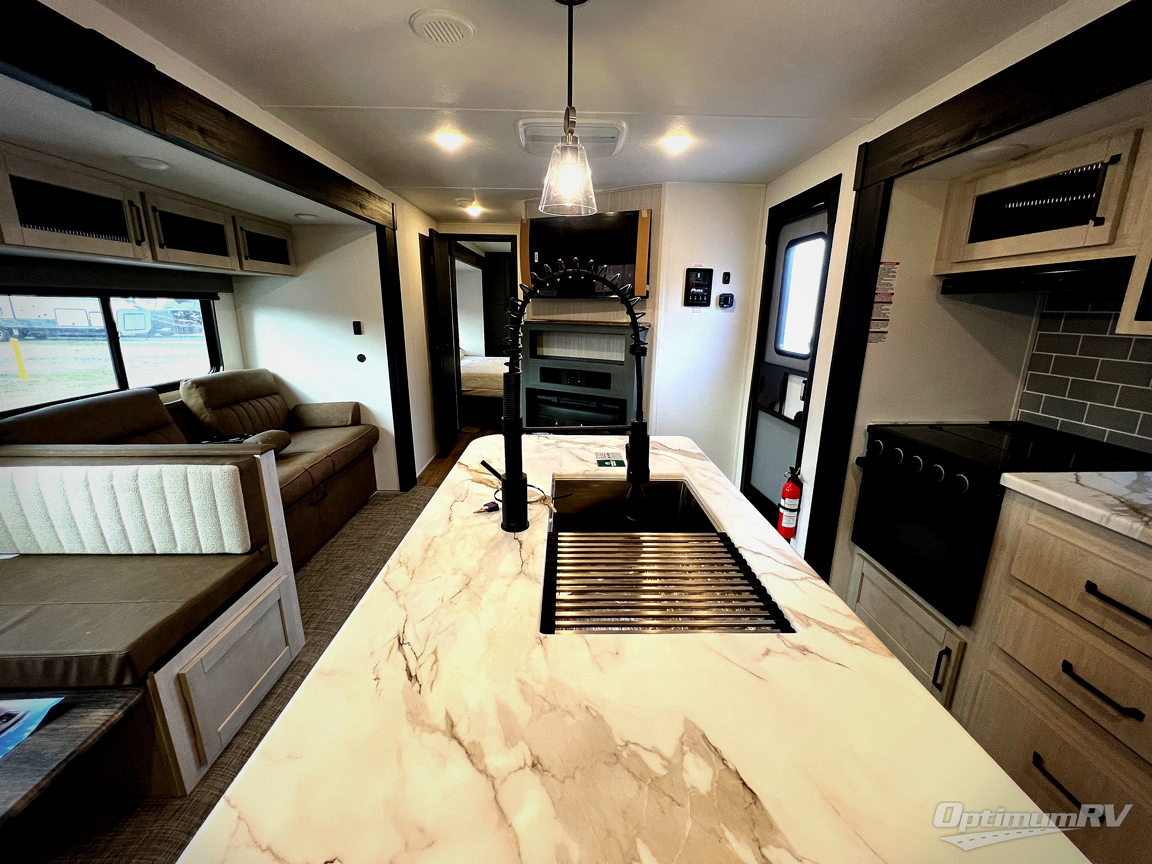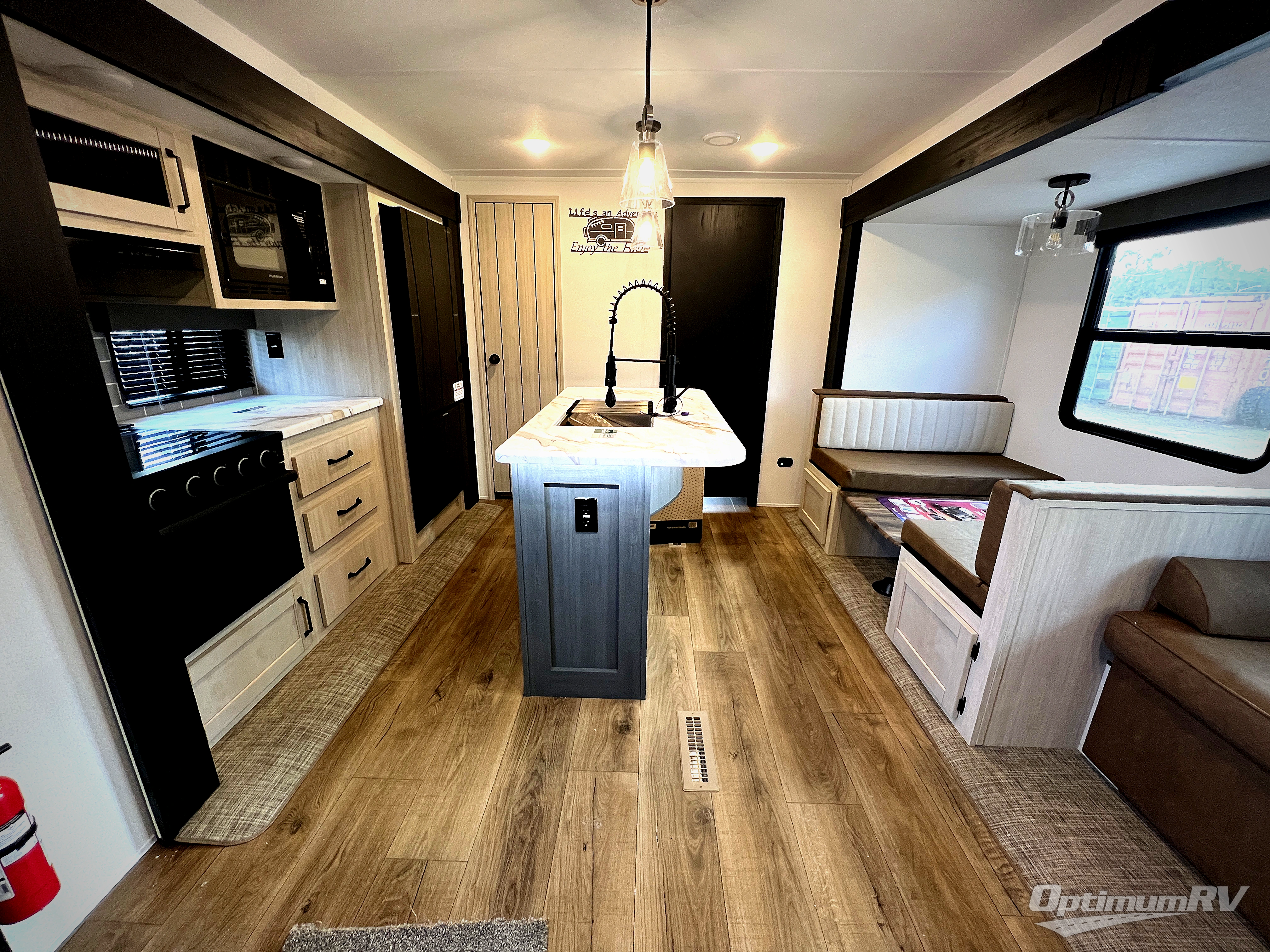 You will be the talk of the campground with this travel trailer! The front private bedroom has a queen bed slide across from a dresser and a front closet plus a second closet with washer and dryer prep. Freshen up each morning in the full bathroom with the 34" x 34" radius shower then head to the kitchen to fry up some eggs with the stainless-steel oven and range. You can enjoy your meals at the booth dinette, and the kitchen island will make your clean up easier with the sink that has a high-rise faucet and sprayer. The rear private bunkhouse has a 32" x 69" bunk above a jiffy sofa slide, a 36" x 69" bunk above a 36" x 71" bunk and a linen closet. Choose one of the outside kitchen options for even more convenience!