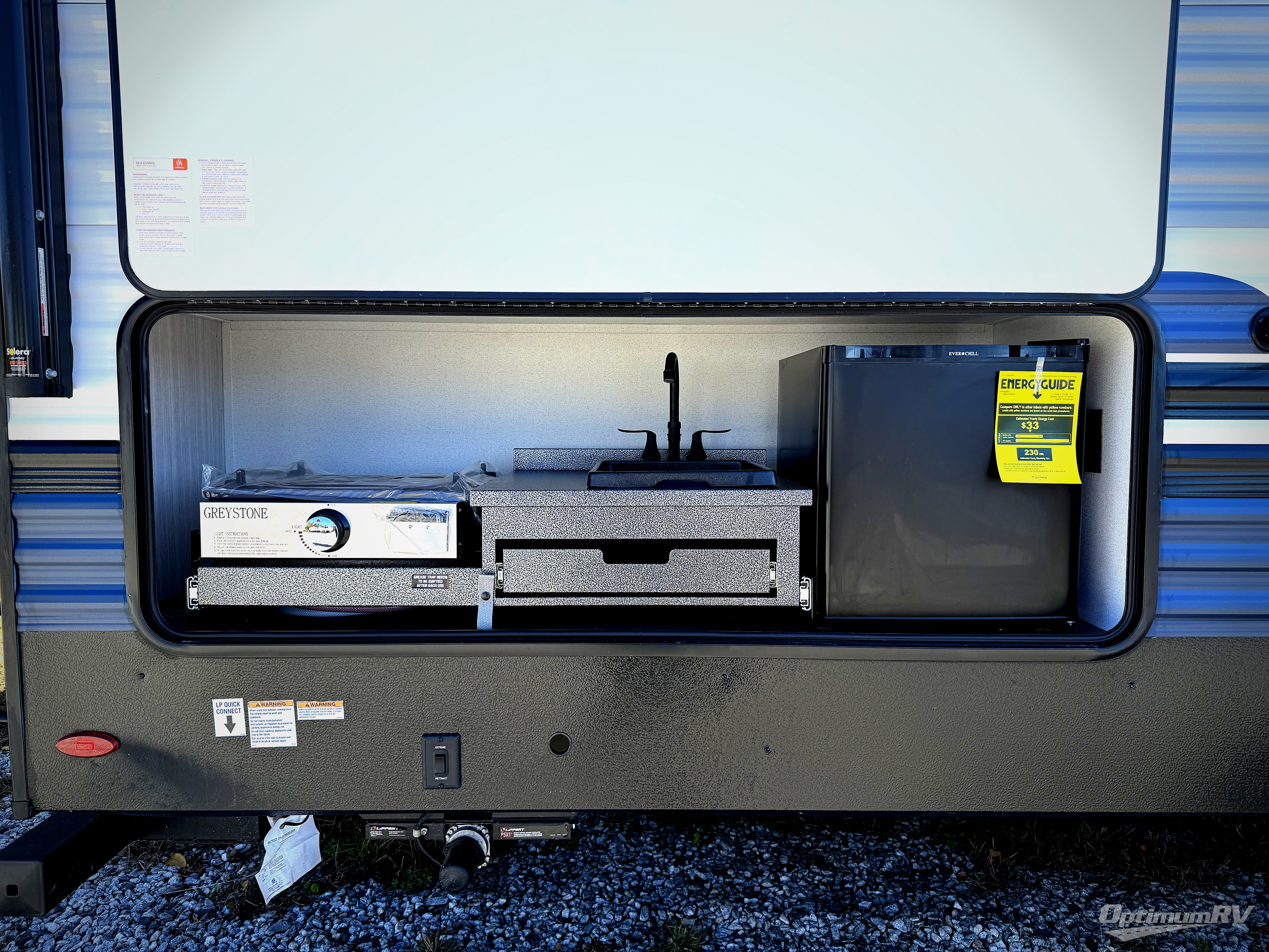 With dual entry doors and a bath and a half, you will have the ultimate in convenience with this travel trailer! The bedroom also has a front closet to keep your clothes looking their best and a queen bed slide for you to sleep your best. Everyone can freshen up in the full bathroom with the 34" x 34" radius shower and fill their bellies with scrambled eggs cooked with the stainless steel oven and range. Enjoy your meals, play games, and even sleep at the booth dinette or relax on the sofa while watching a movie with the entertainment center and fireplace. And your guests will love the rear private bunkhouse with three bunks, a jiffy sofa, and a slide out for more space! This model also includes an optional outside mini kitchen with a griddle!