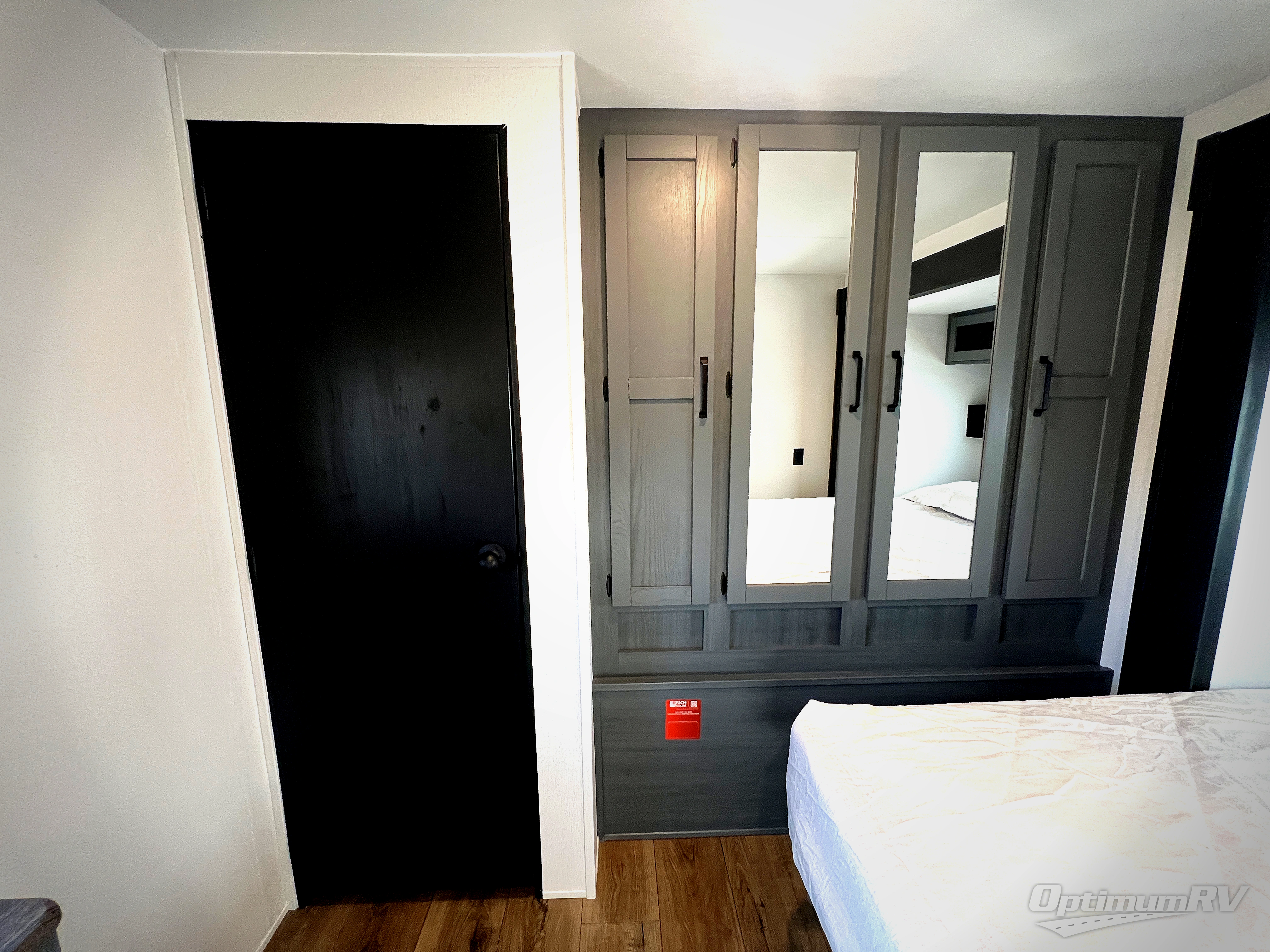 With dual entry doors and a bath and a half, you will have the ultimate in convenience with this travel trailer! The bedroom also has a front closet to keep your clothes looking their best and a queen bed slide for you to sleep your best. Everyone can freshen up in the full bathroom with the 34" x 34" radius shower and fill their bellies with scrambled eggs cooked with the stainless steel oven and range. Enjoy your meals, play games, and even sleep at the booth dinette or relax on the sofa while watching a movie with the entertainment center and fireplace. And your guests will love the rear private bunkhouse with three bunks, a jiffy sofa, and a slide out for more space! This model also includes an optional outside mini kitchen with a griddle!