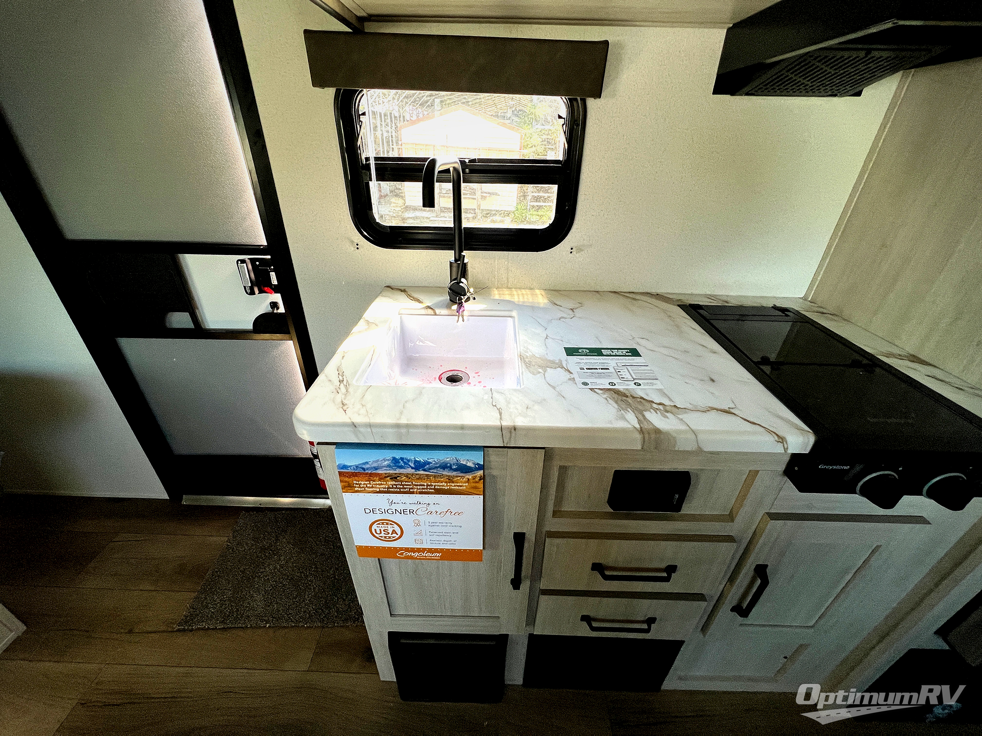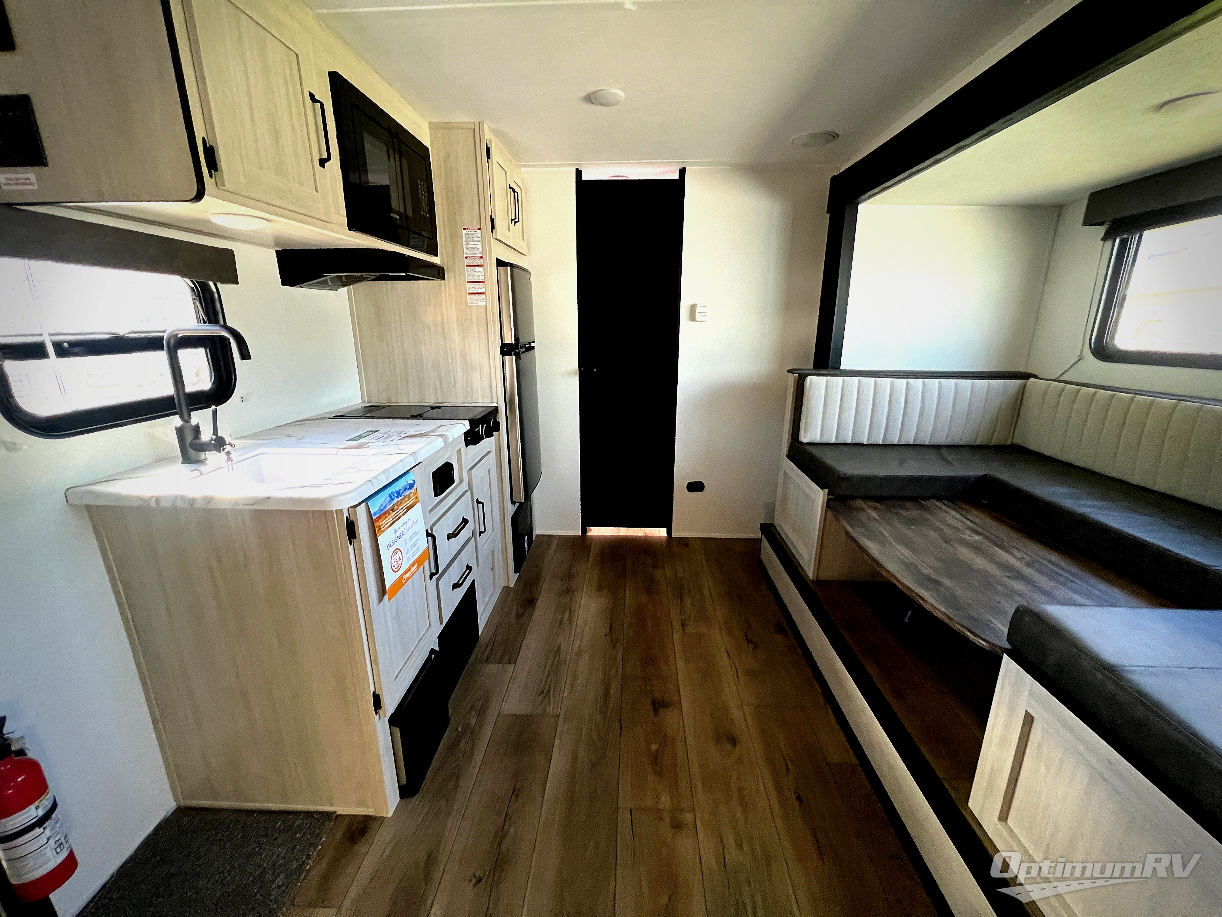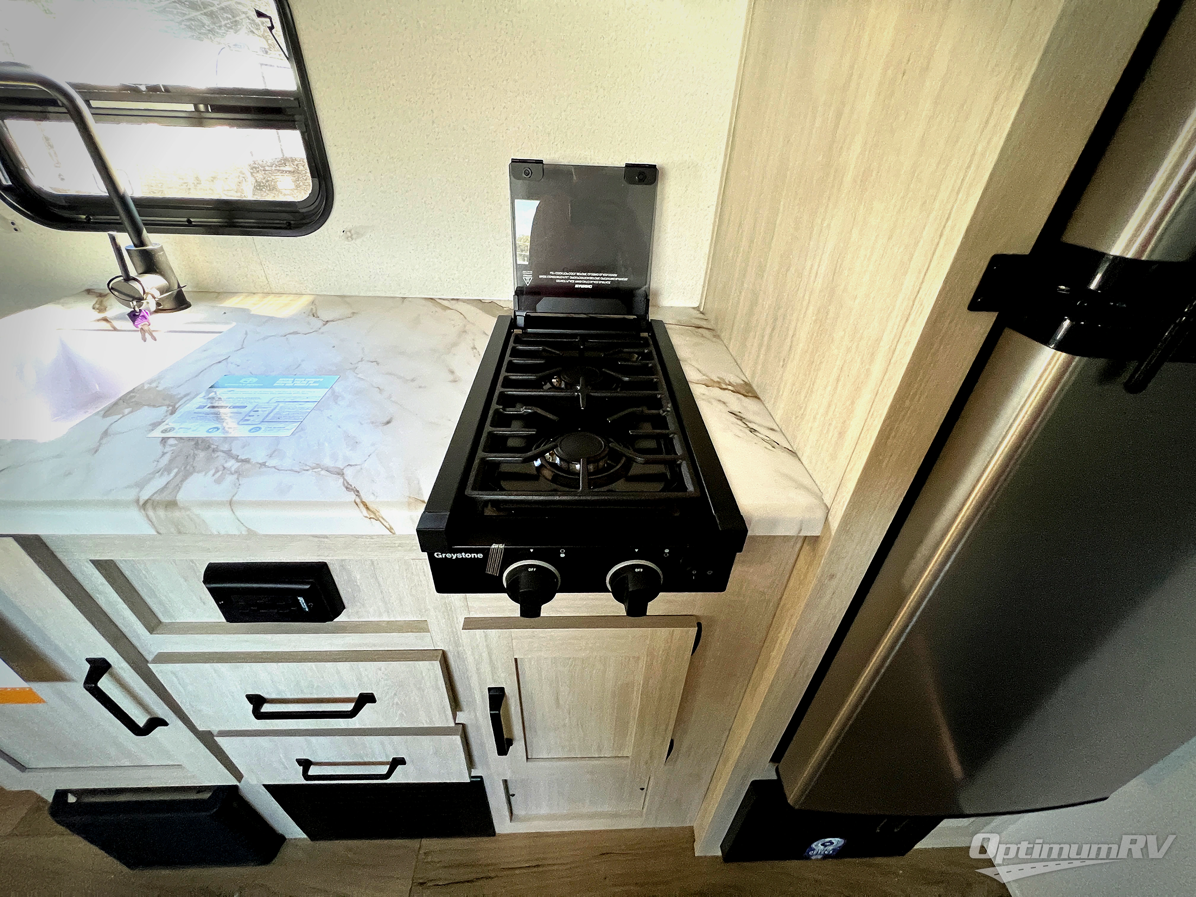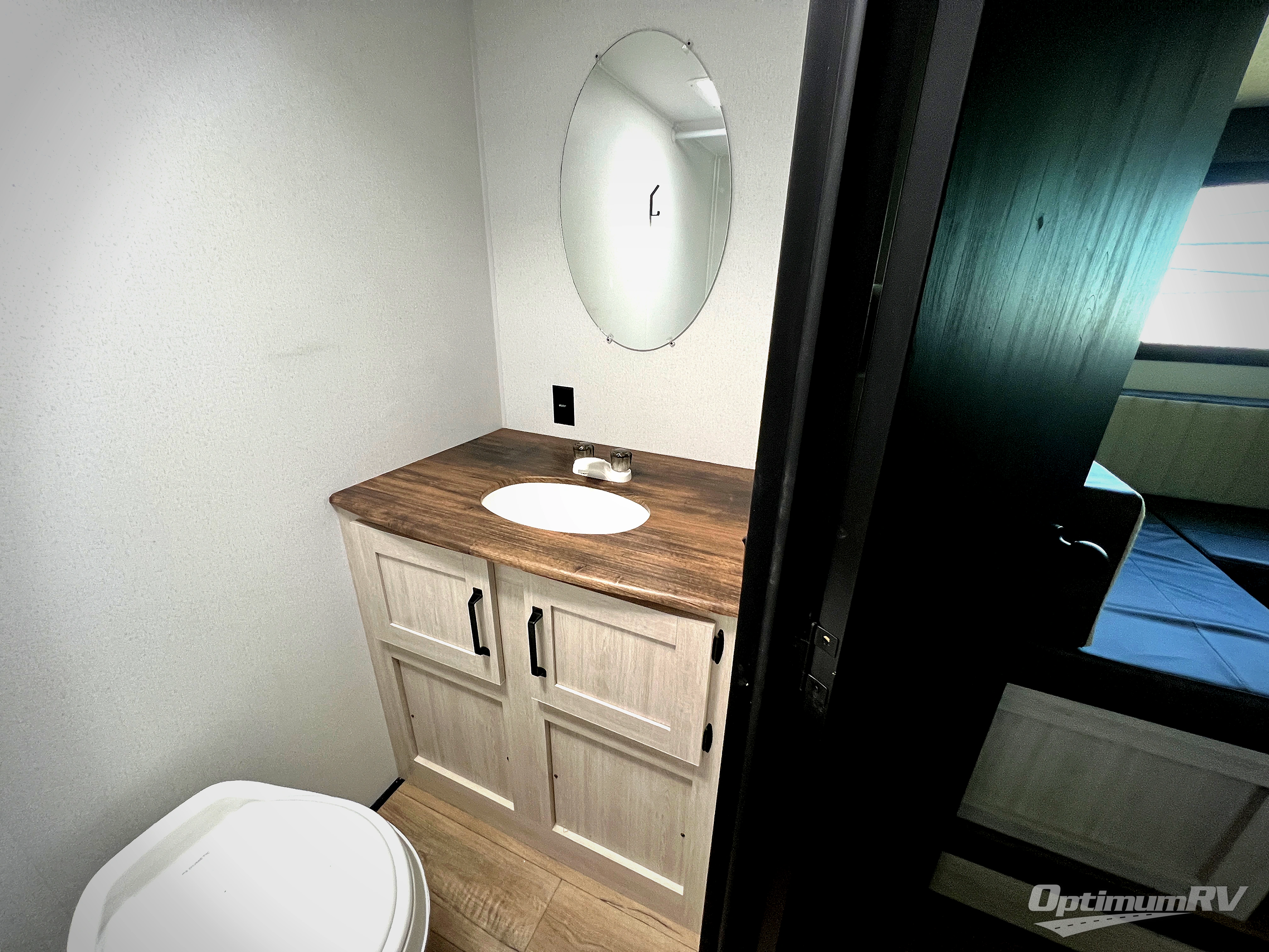 This travel trailer includes everything you need for camping trips at the lake. You'll sleep great each night on the front RV queen bed, or you can choose the optional Murphy bed with a sofa if you need more seating space during the day. The chef of your group can make meals on the two burner cooktop or in the microwave oven, then you can dine around the U-shaped dinette slide. A full rear bath includes a 36" x 30" shower, a toilet, vanity, plus a medicine cabinet to keep your things organized.