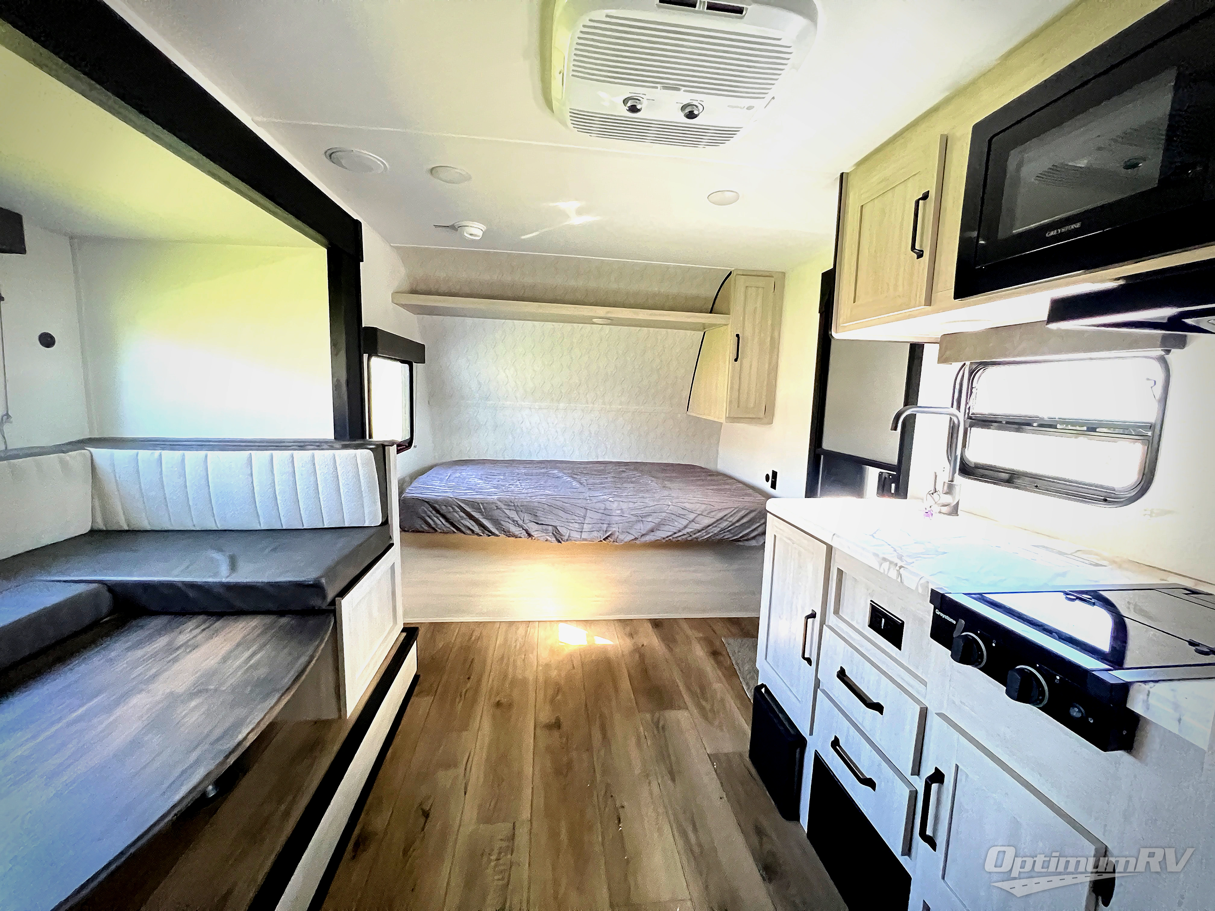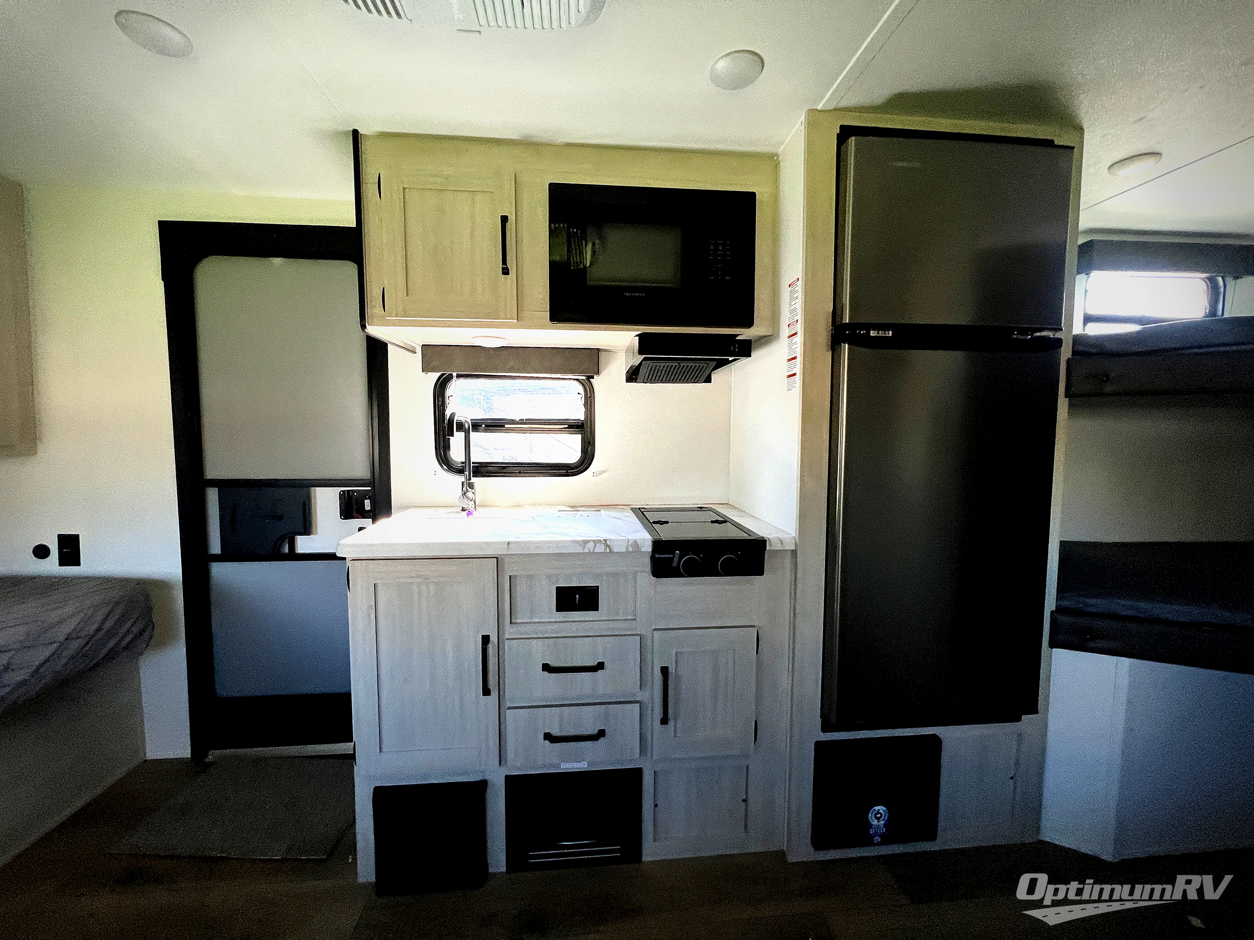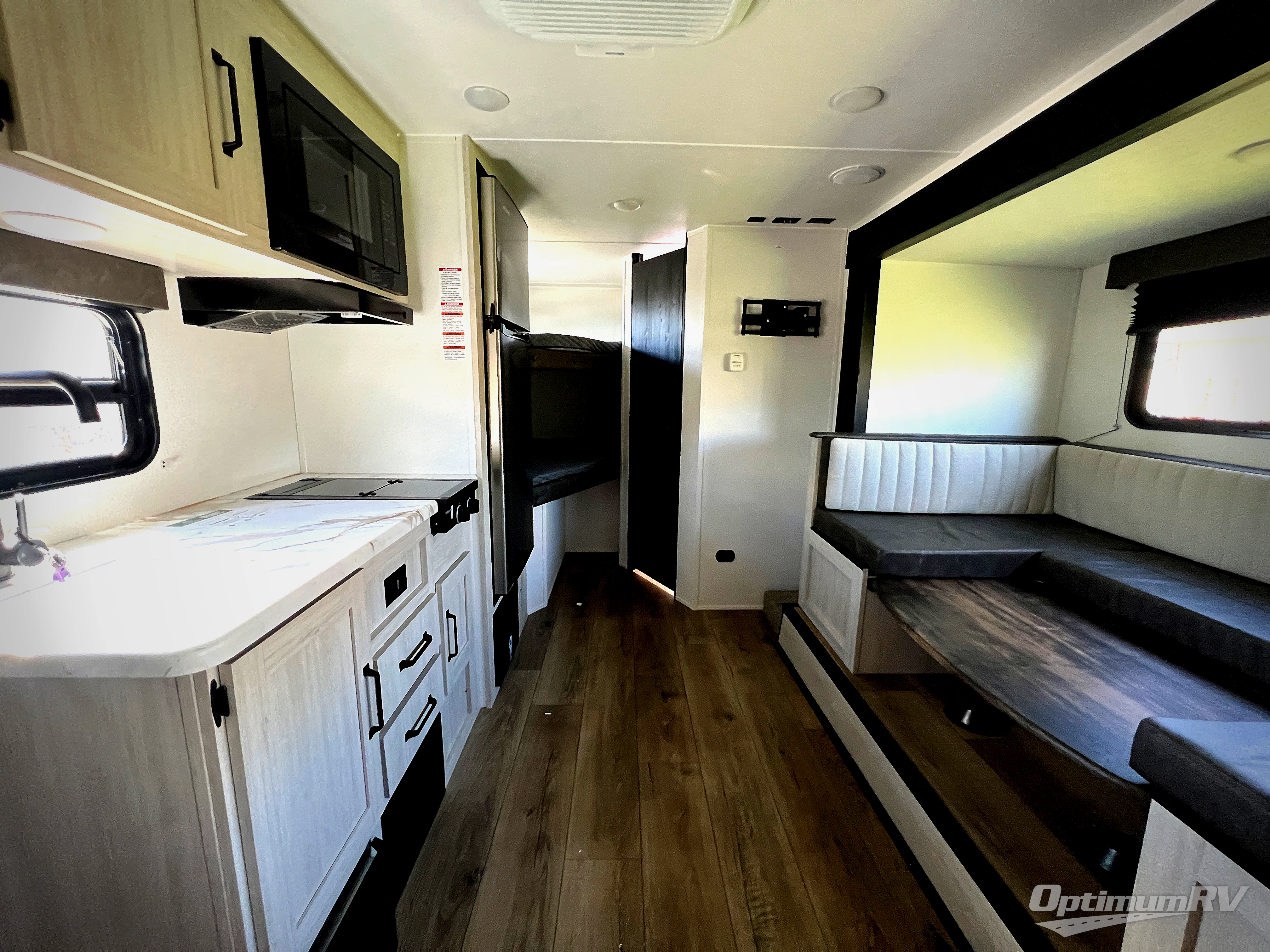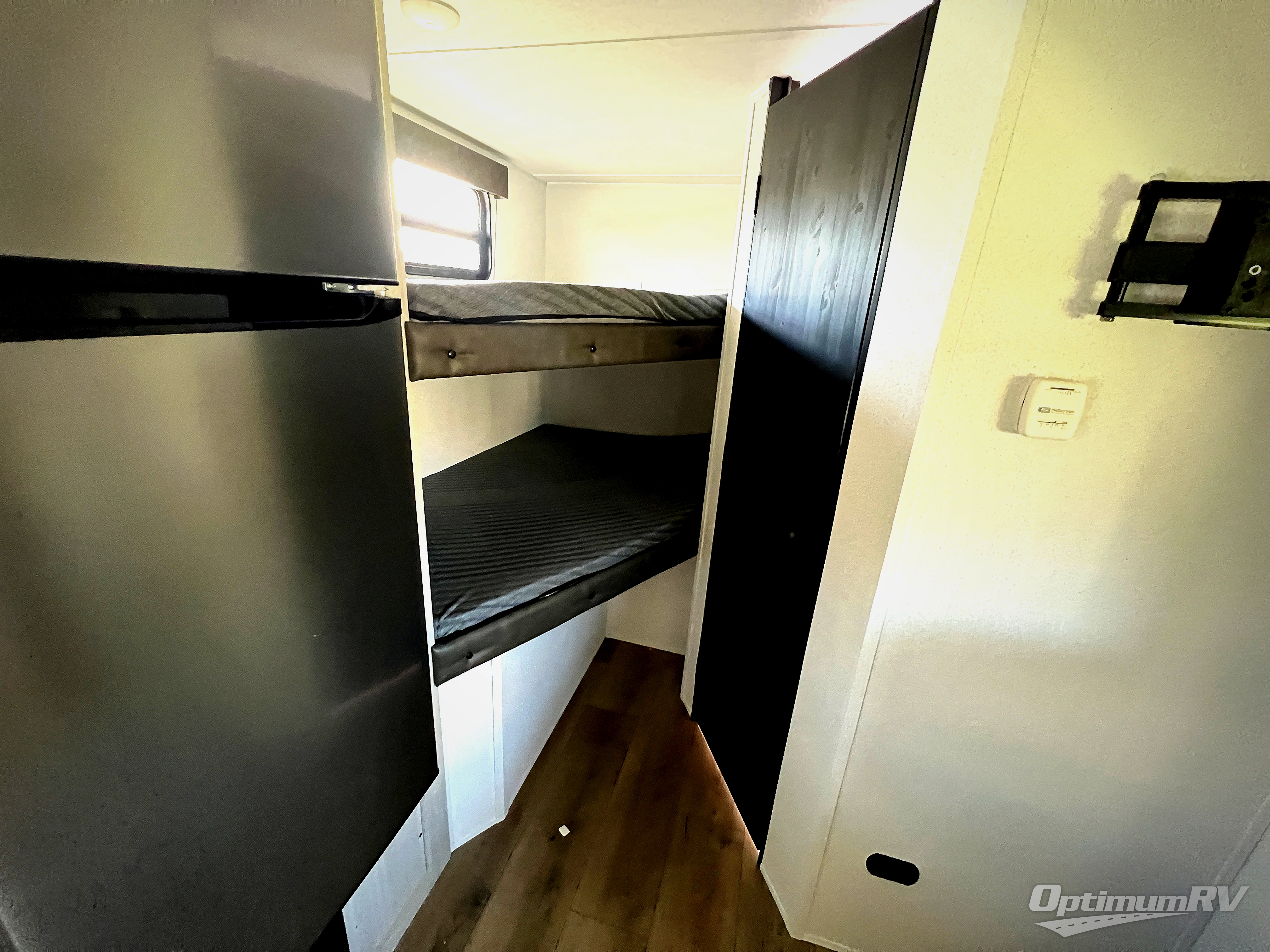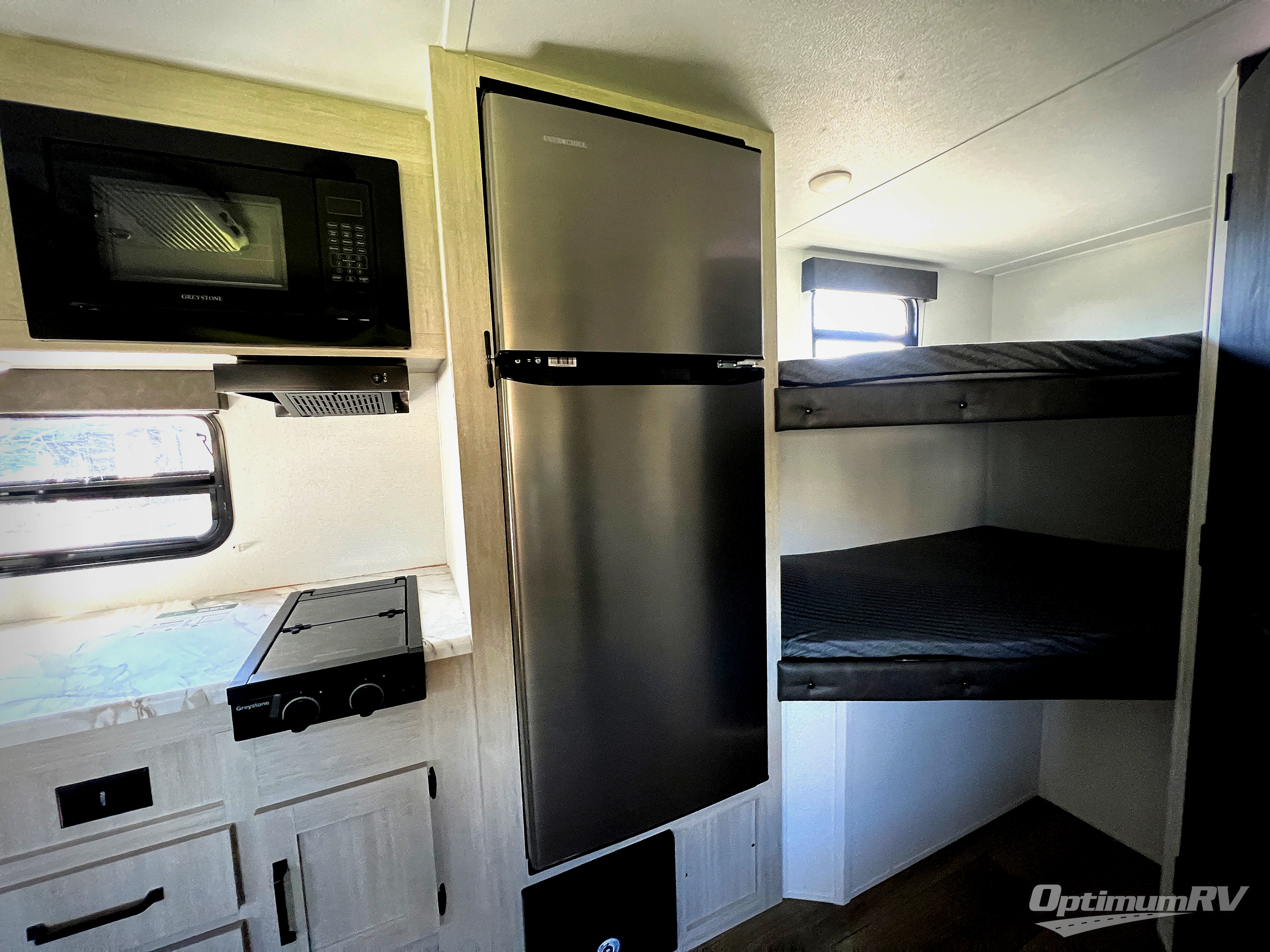 The whole gang will love camping in this travel trailer since there are double-size bunks for compact sleeping spaces and a slide out for more space to relax! The front RV queen bed is sure to provide a great night's rest, and you can choose the optional Murphy bed if you're needing more seating space during the day. Once you've made dinner on the two burner cooktop, you can dine around the U-shaped dinette. And an optional mini kitchen with a griddle is available if you'd rather cook outdoors! This unit includes ample storage space for your things, including exterior storage and storage under the bunks!