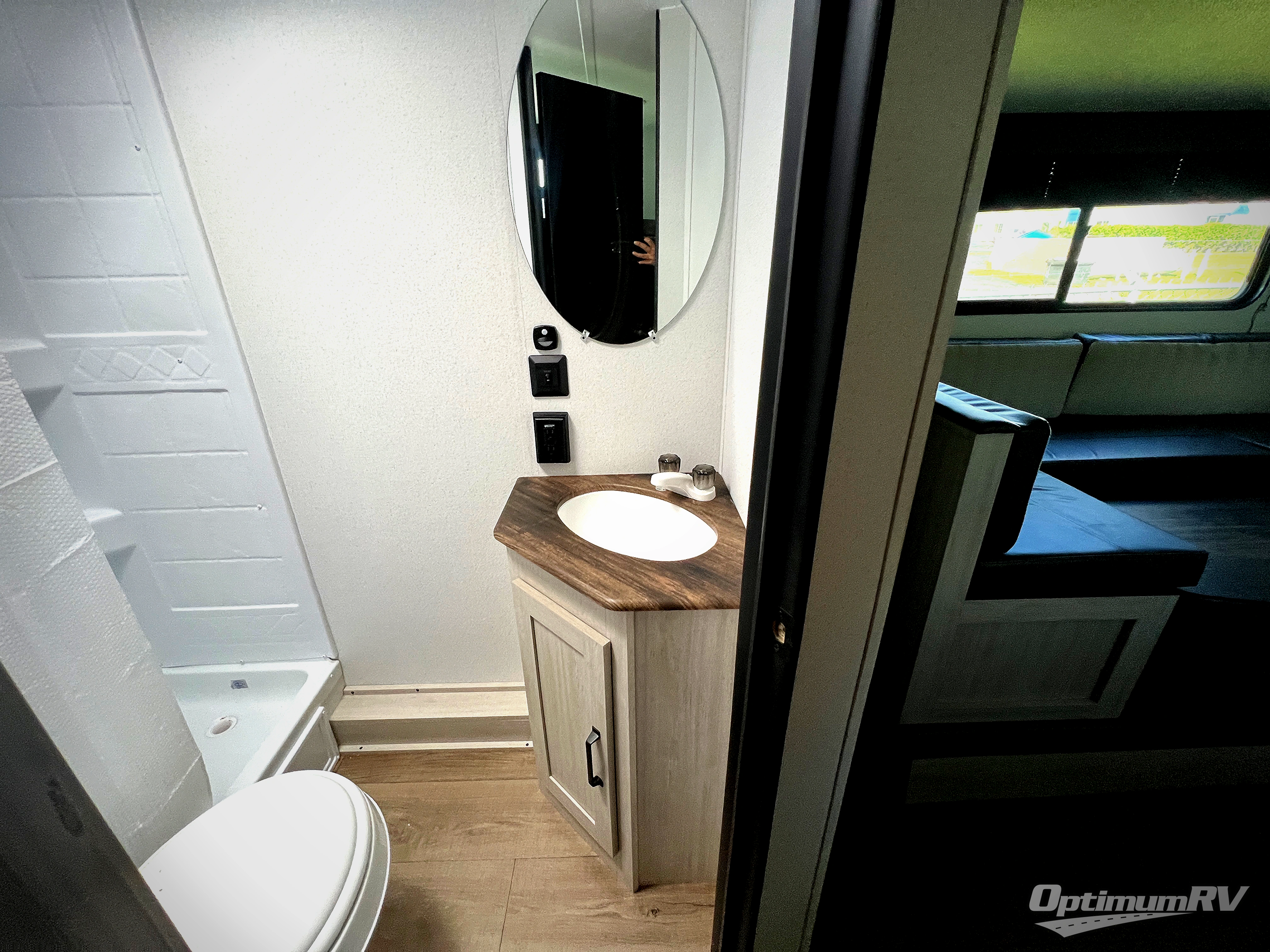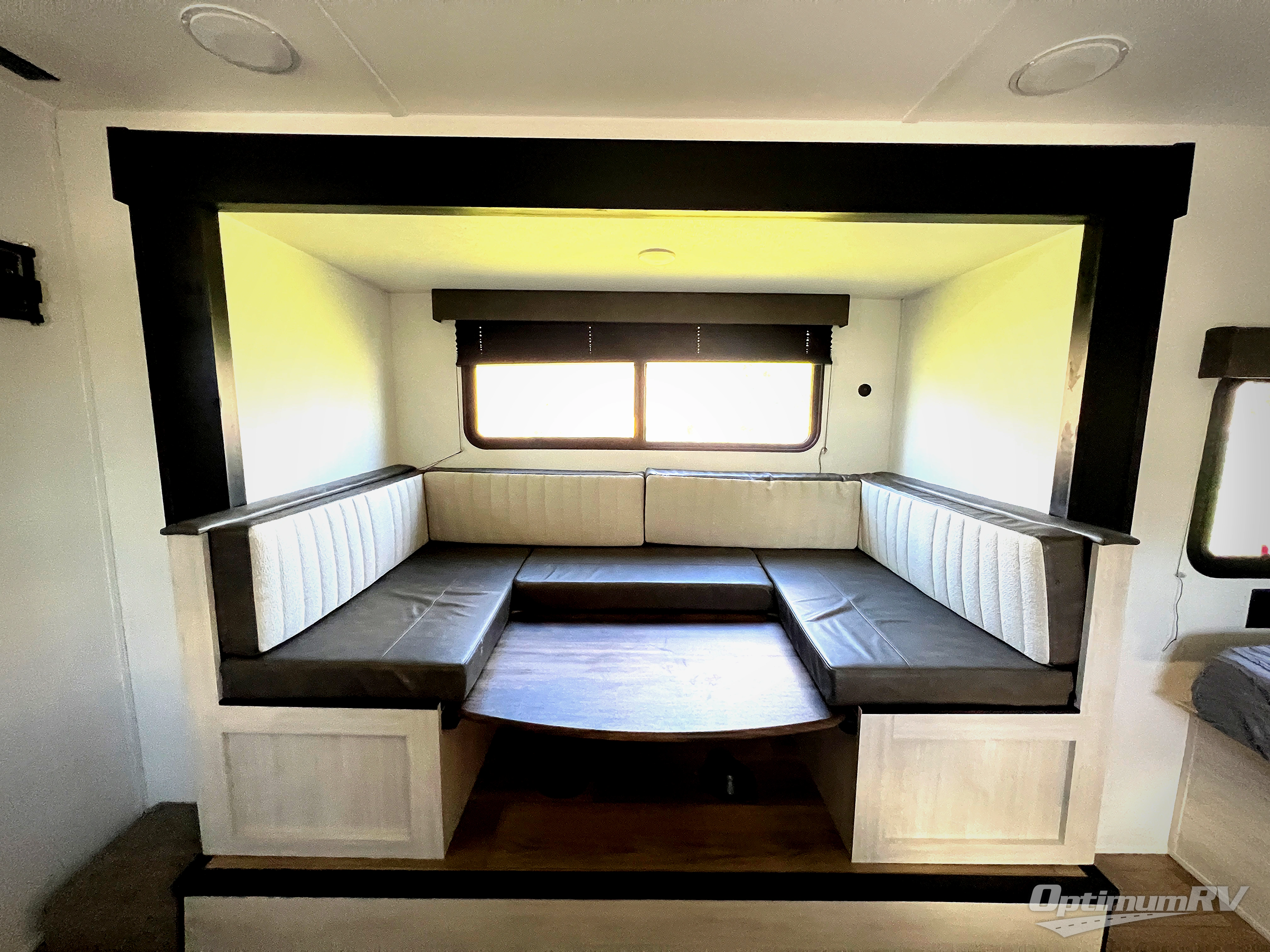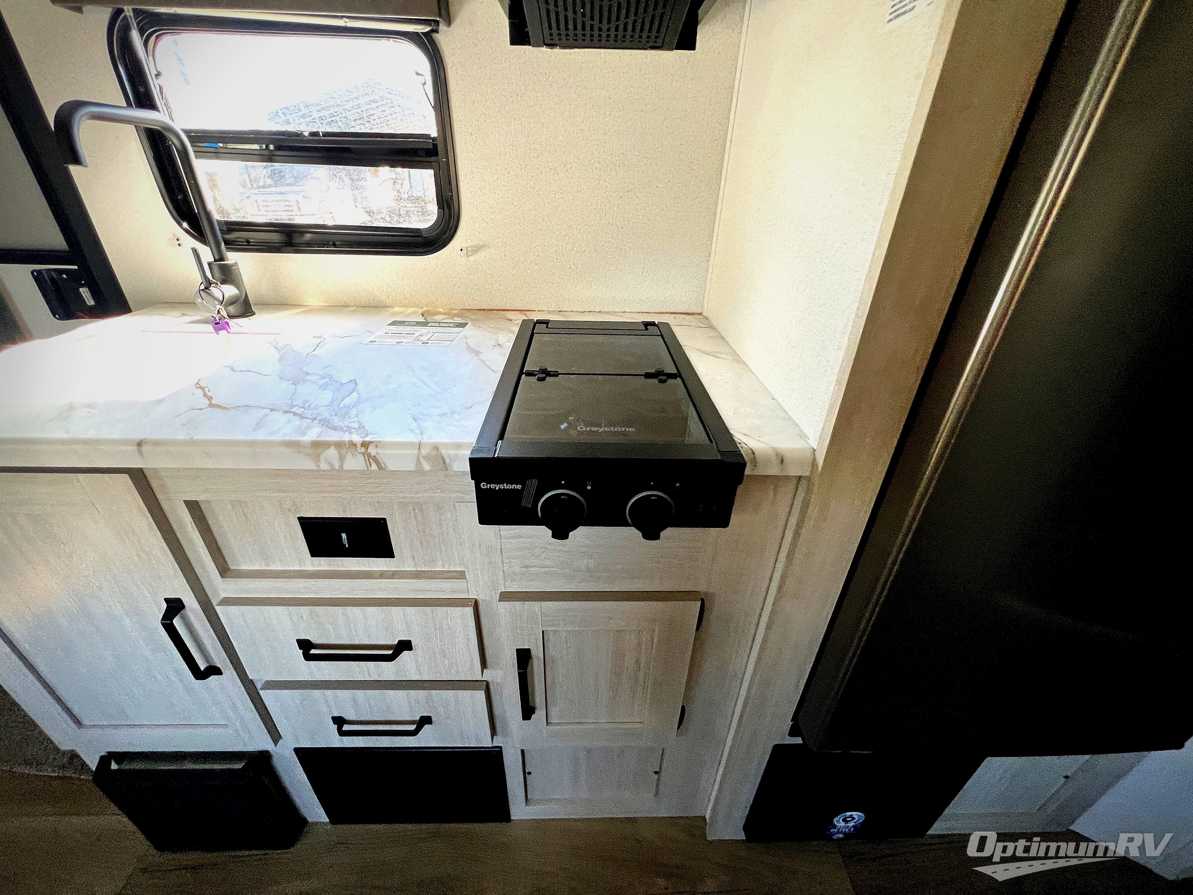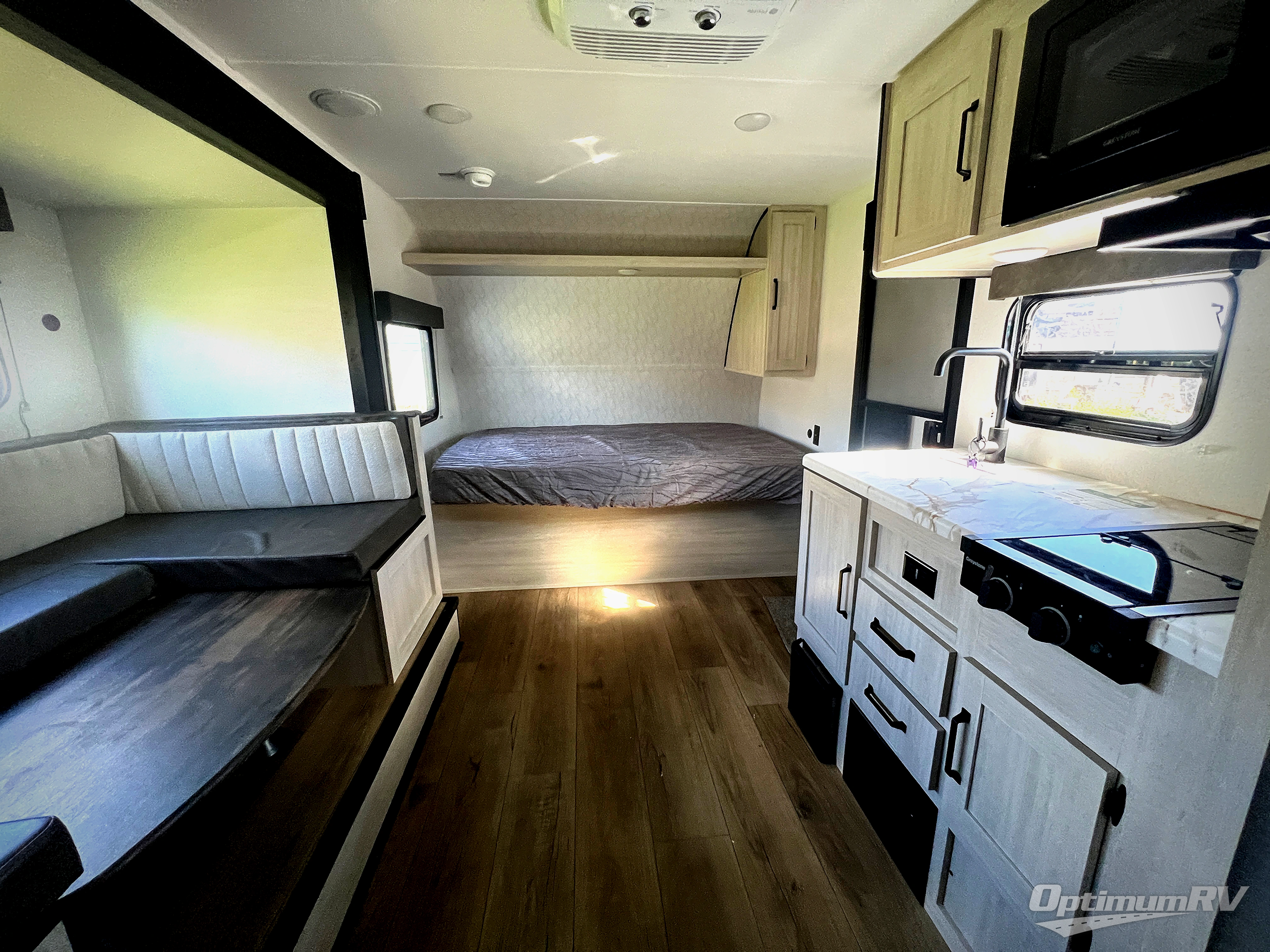 The whole gang will love camping in this travel trailer since there are double-size bunks for compact sleeping spaces and a slide out for more space to relax! The front RV queen bed is sure to provide a great night's rest, and you can choose the optional Murphy bed if you're needing more seating space during the day. Once you've made dinner on the two burner cooktop, you can dine around the U-shaped dinette. And an optional mini kitchen with a griddle is available if you'd rather cook outdoors! This unit includes ample storage space for your things, including exterior storage and storage under the bunks!