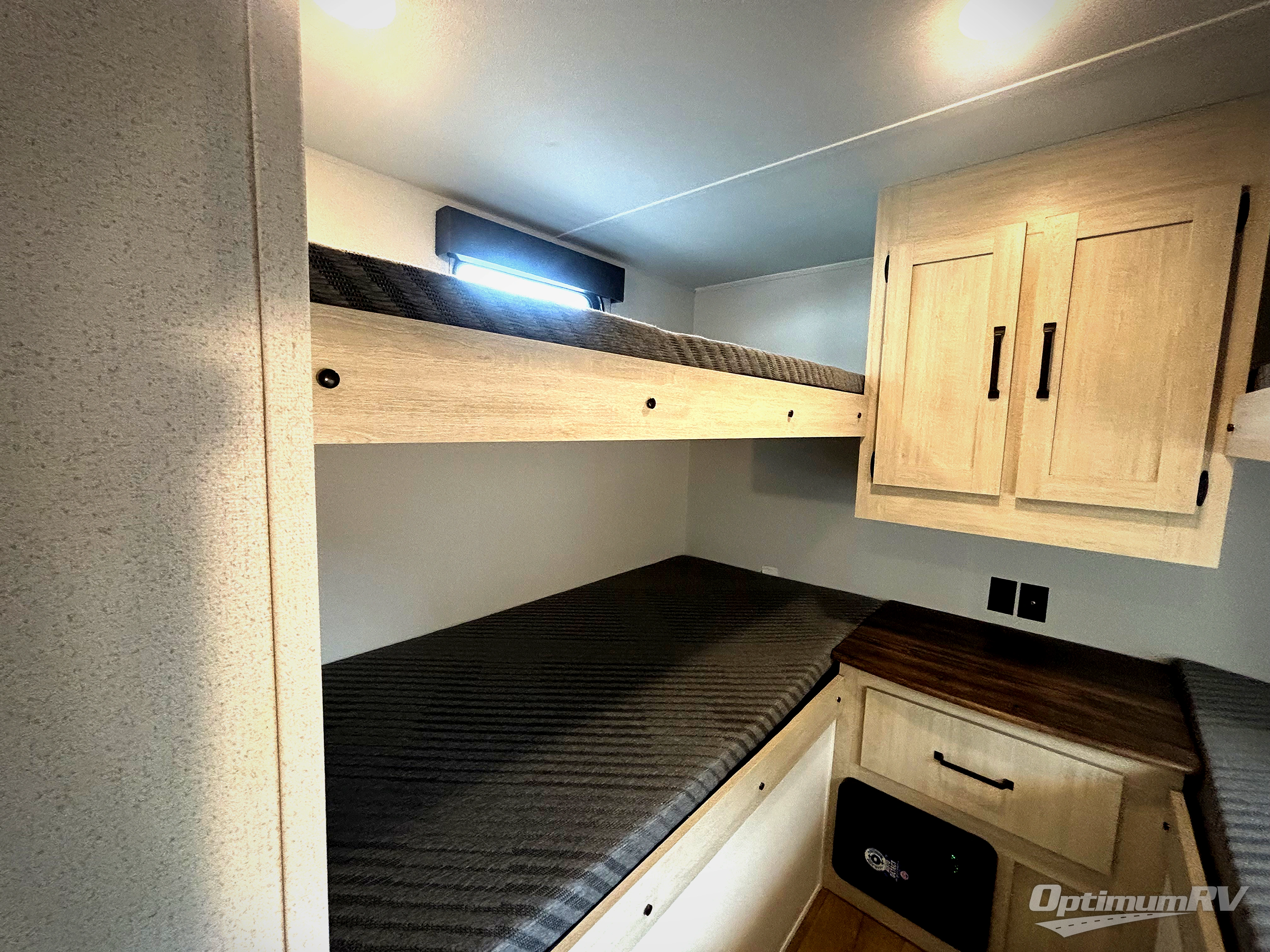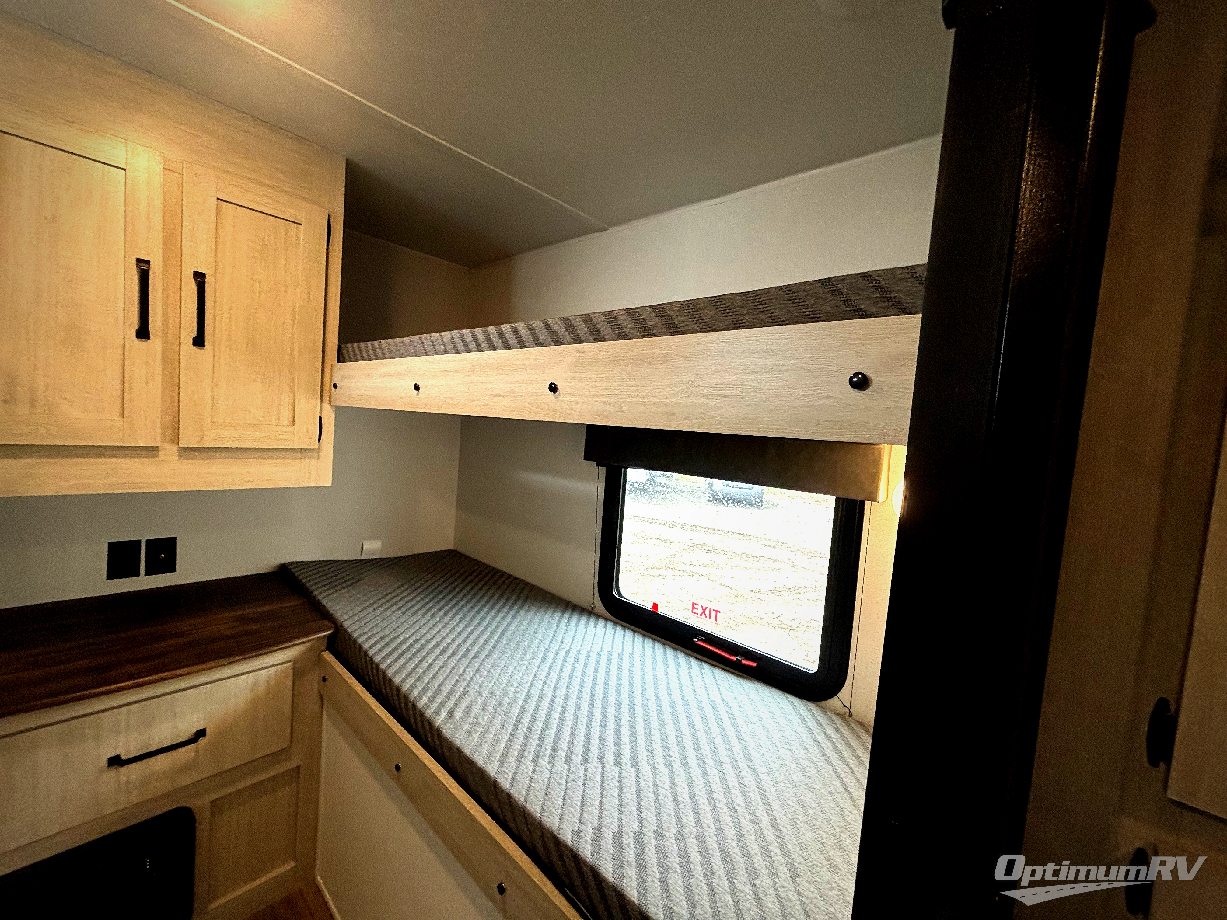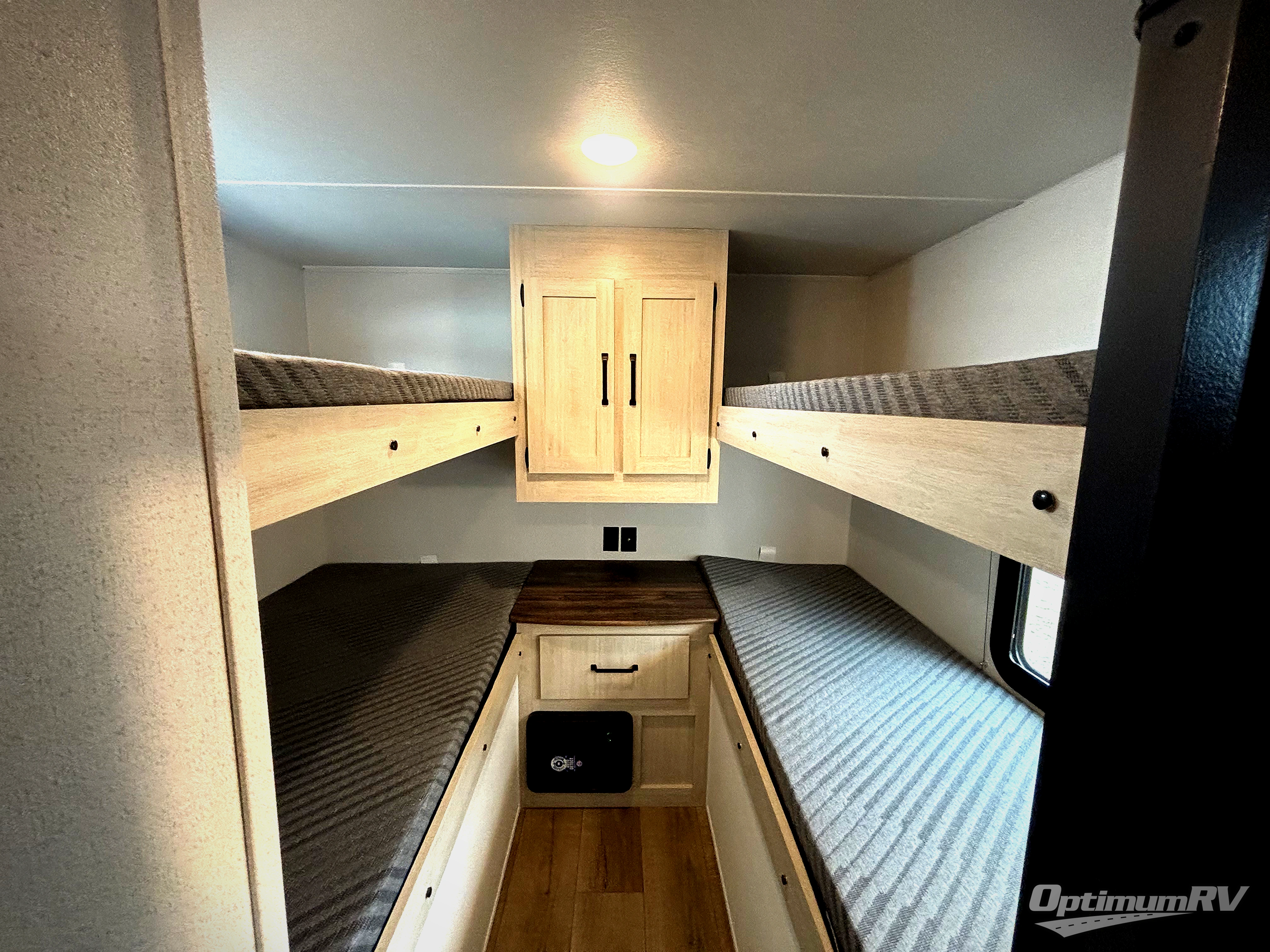 If you're looking for more space, this double axle unit features a large slide so you can walk about freely. Here, you'll find the booth dinette and sofa, which sit across from the optional TV if you want to enjoy movie nights. The full kitchen includes a stainless microwave and three burner cooktop to make meals, plus a pantry and 12V refrigerator for food storage. And an optional outside kitchen with a griddle can be added if you enjoy cooking outdoors! Your guests or littles are sure to enjoy the rear private bunkhouse with four bunk beds and a wardrobe for their things!