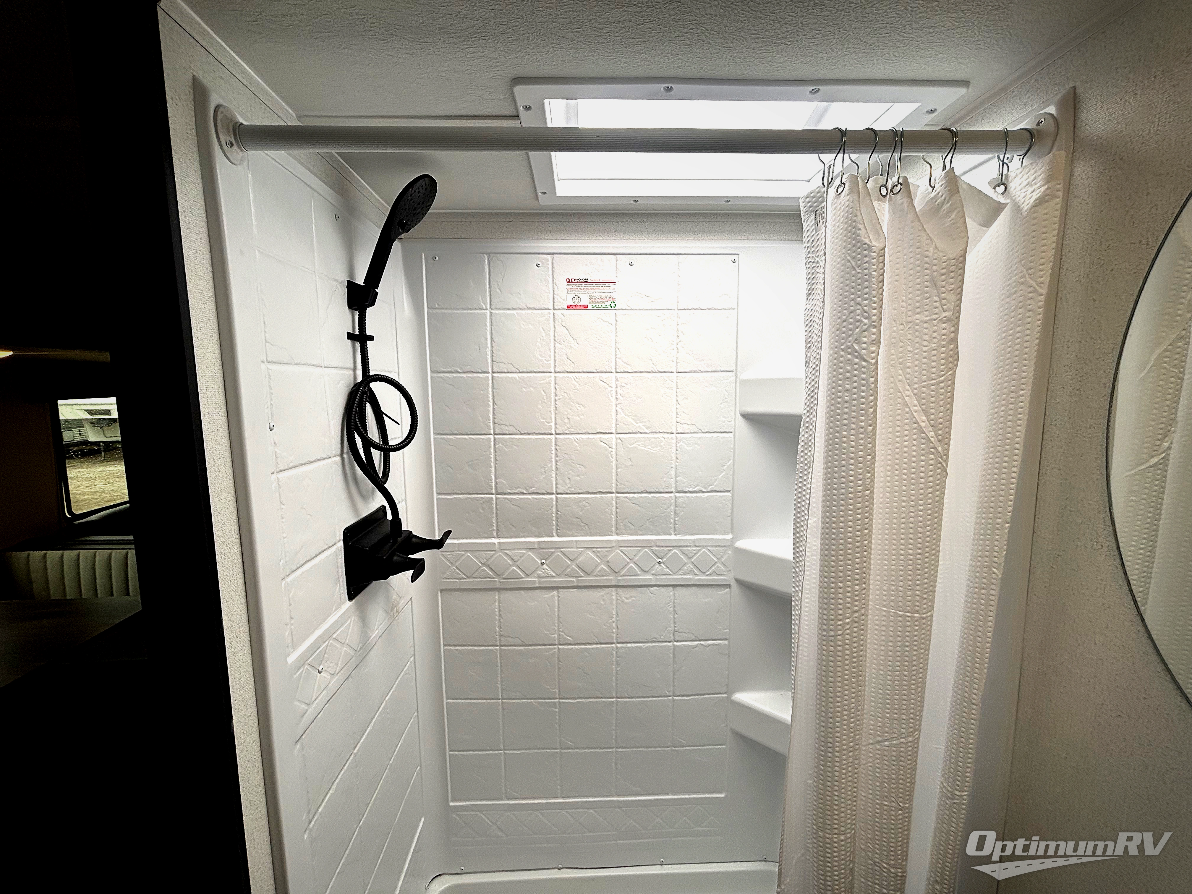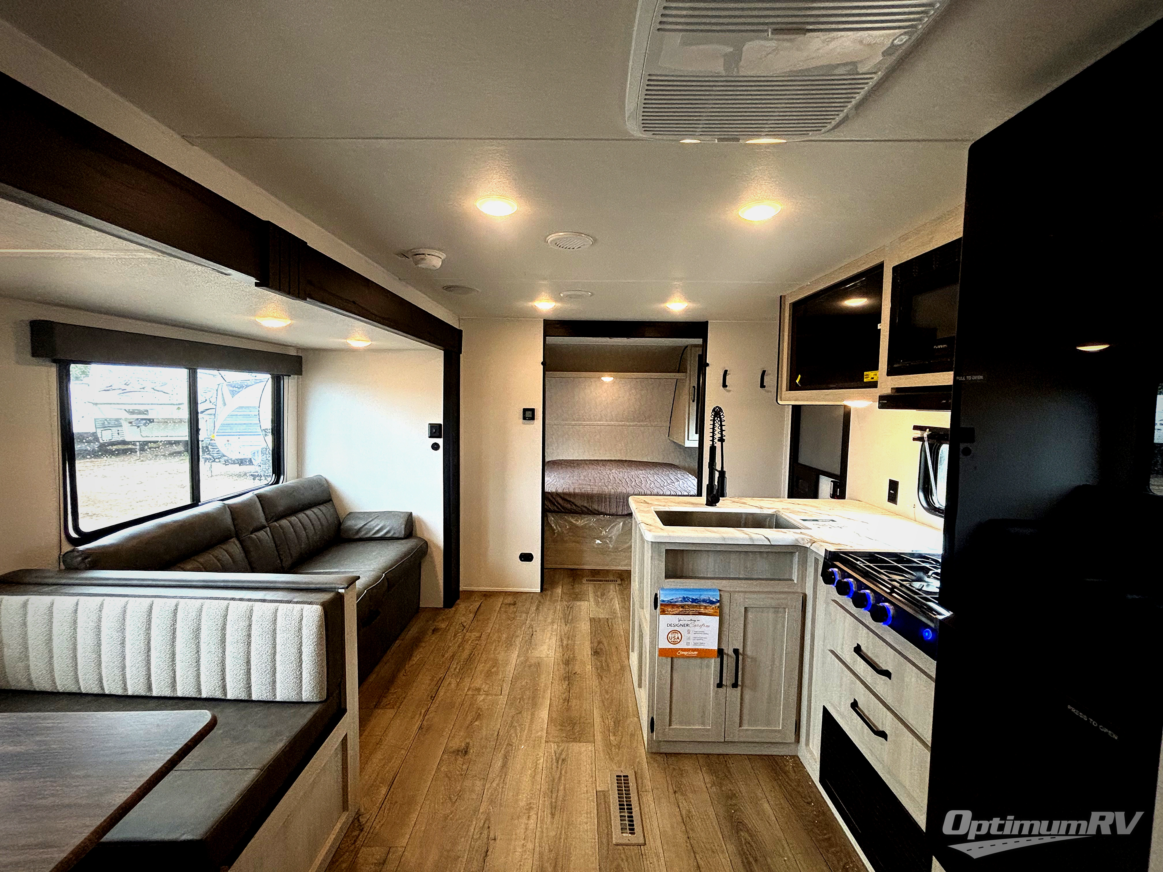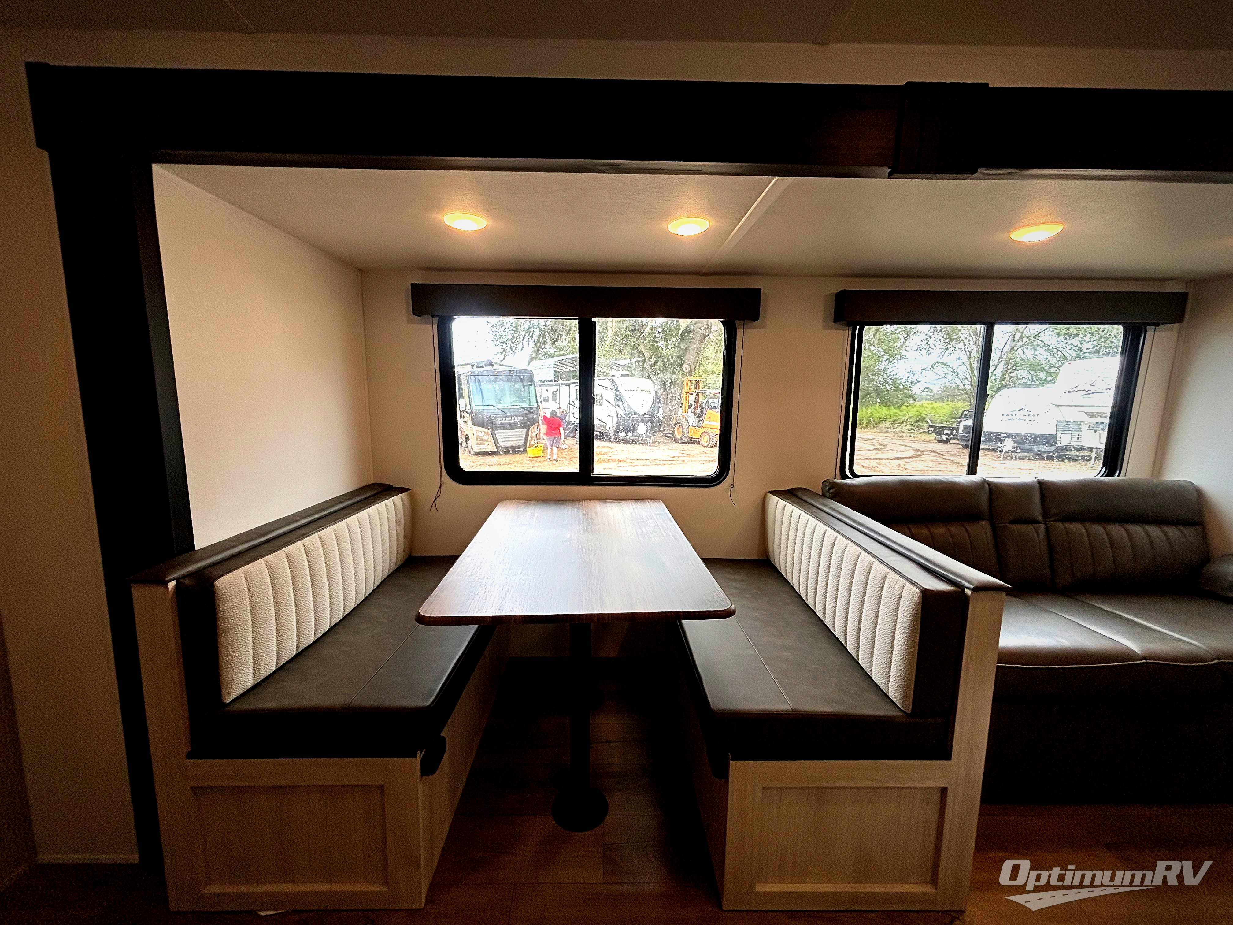 If you're looking for more space, this double axle unit features a large slide so you can walk about freely. Here, you'll find the booth dinette and sofa, which sit across from the optional TV if you want to enjoy movie nights. The full kitchen includes a stainless microwave and three burner cooktop to make meals, plus a pantry and 12V refrigerator for food storage. And an optional outside kitchen with a griddle can be added if you enjoy cooking outdoors! Your guests or littles are sure to enjoy the rear private bunkhouse with four bunk beds and a wardrobe for their things!