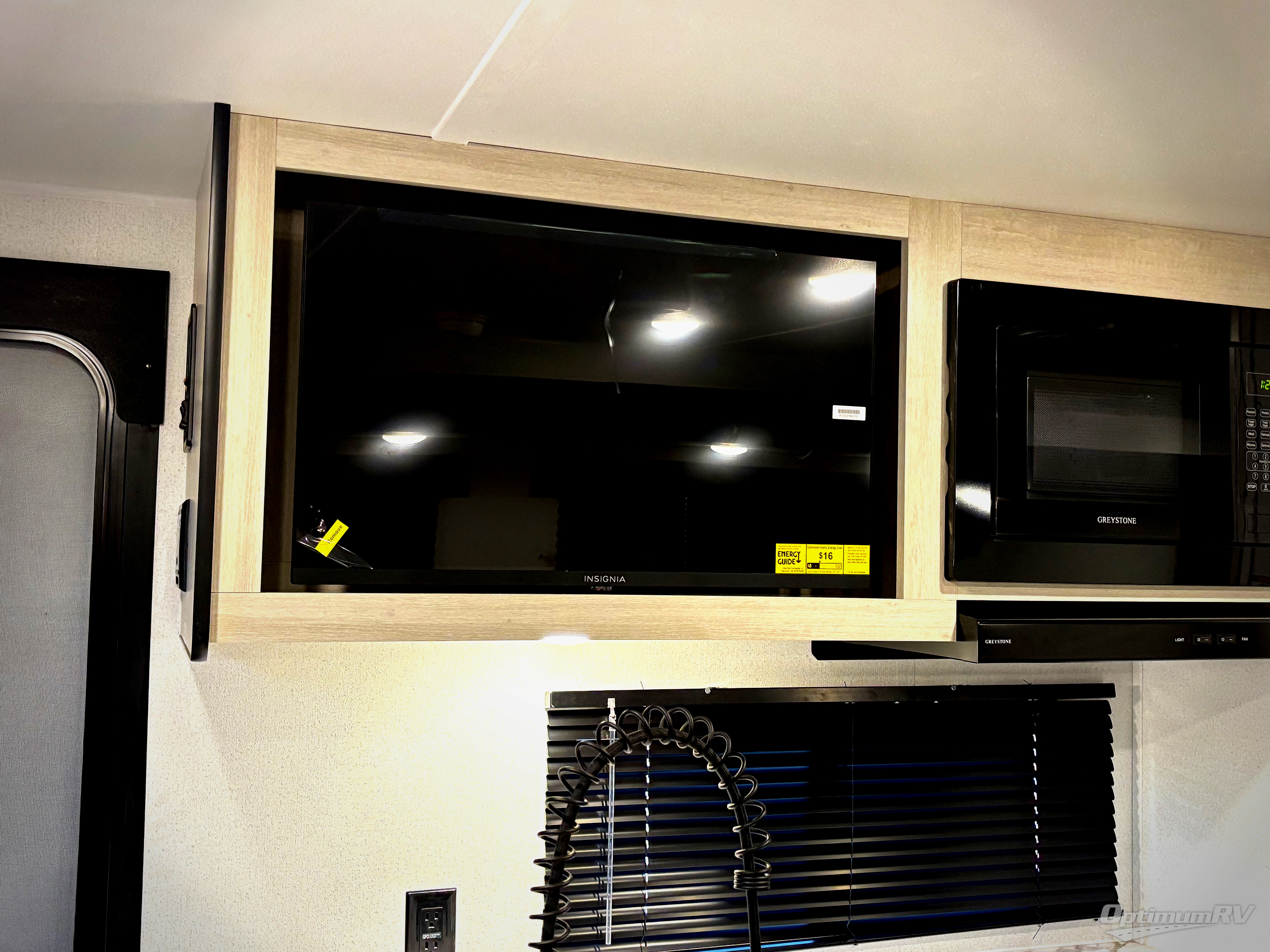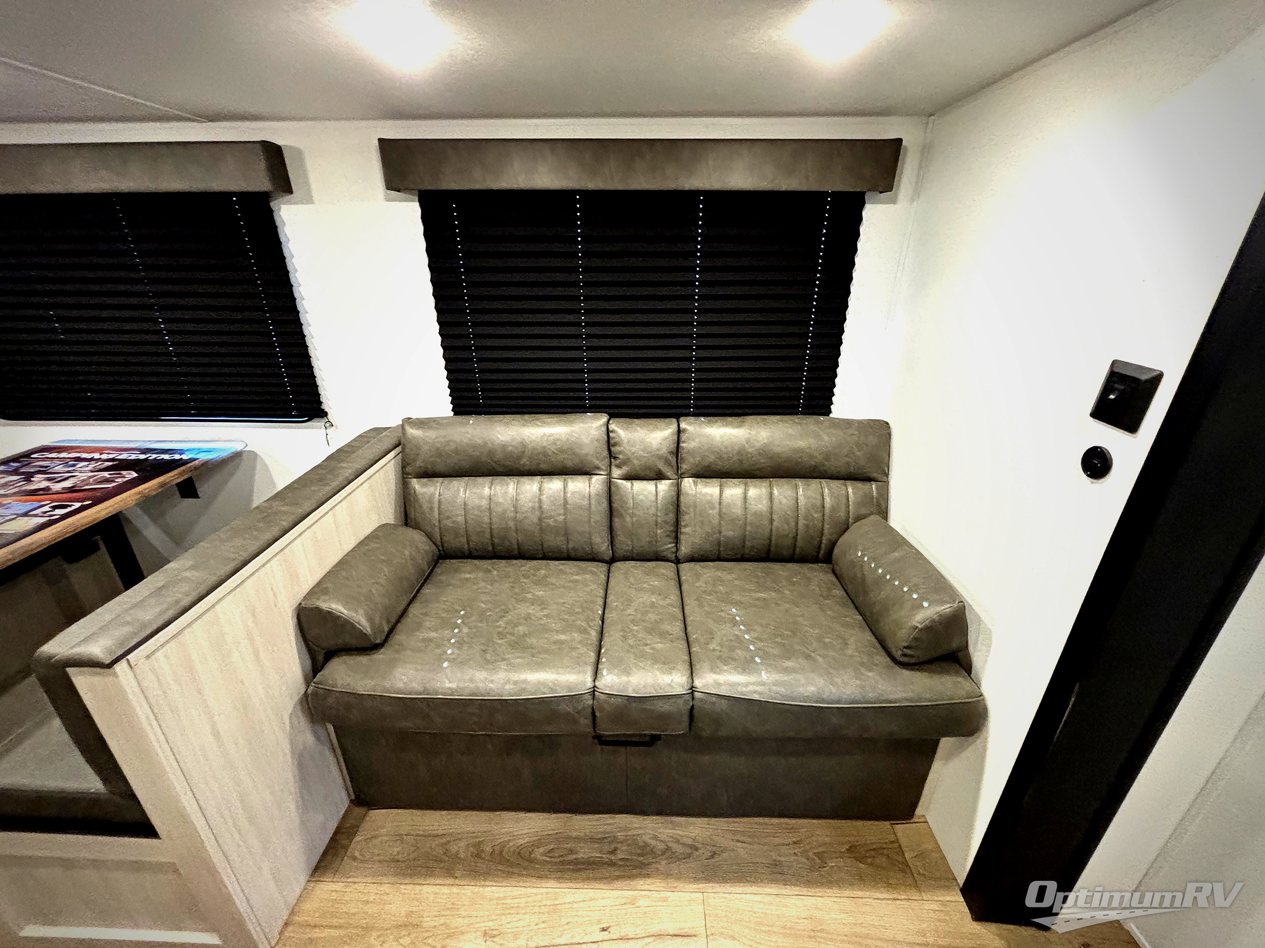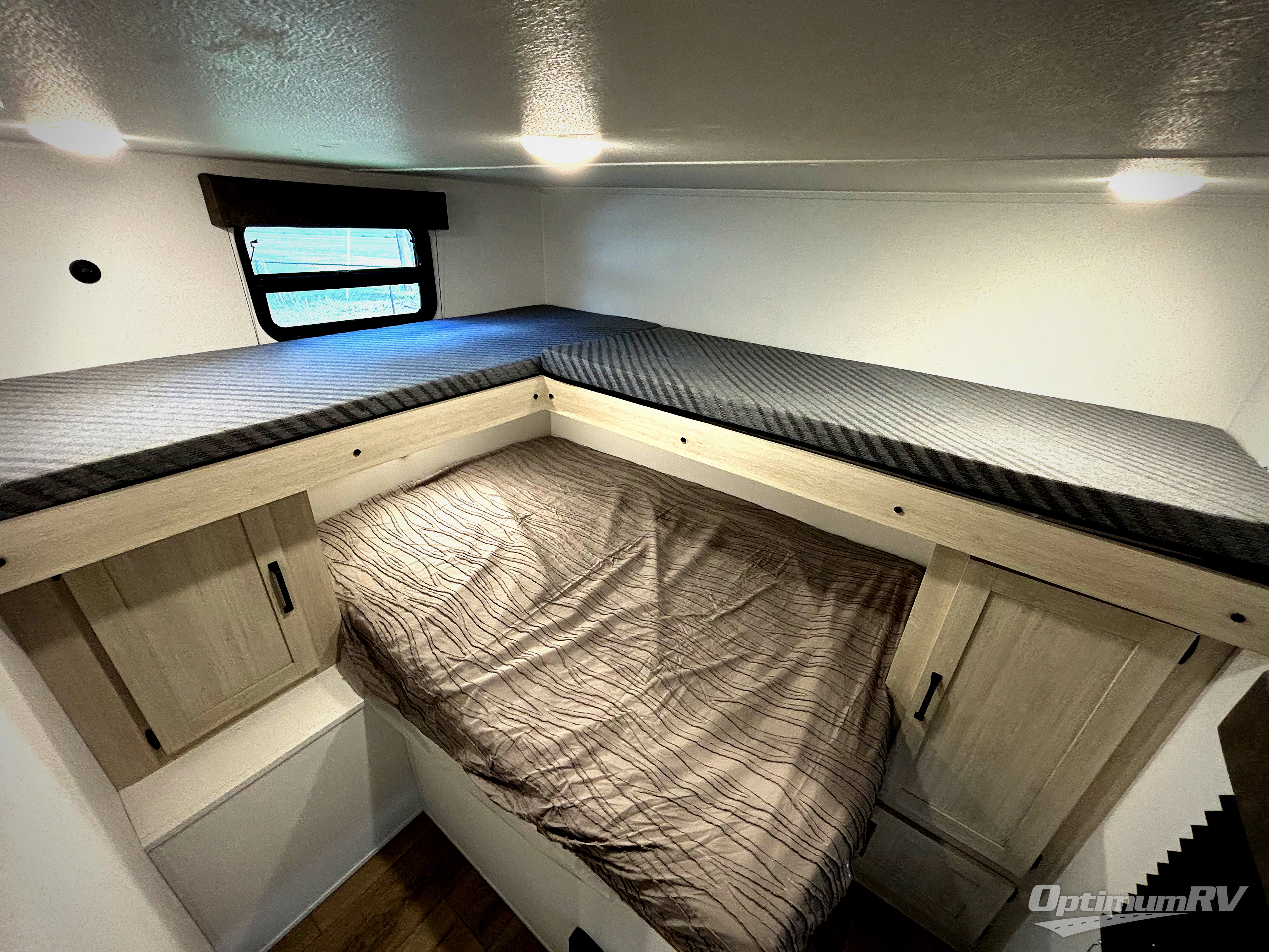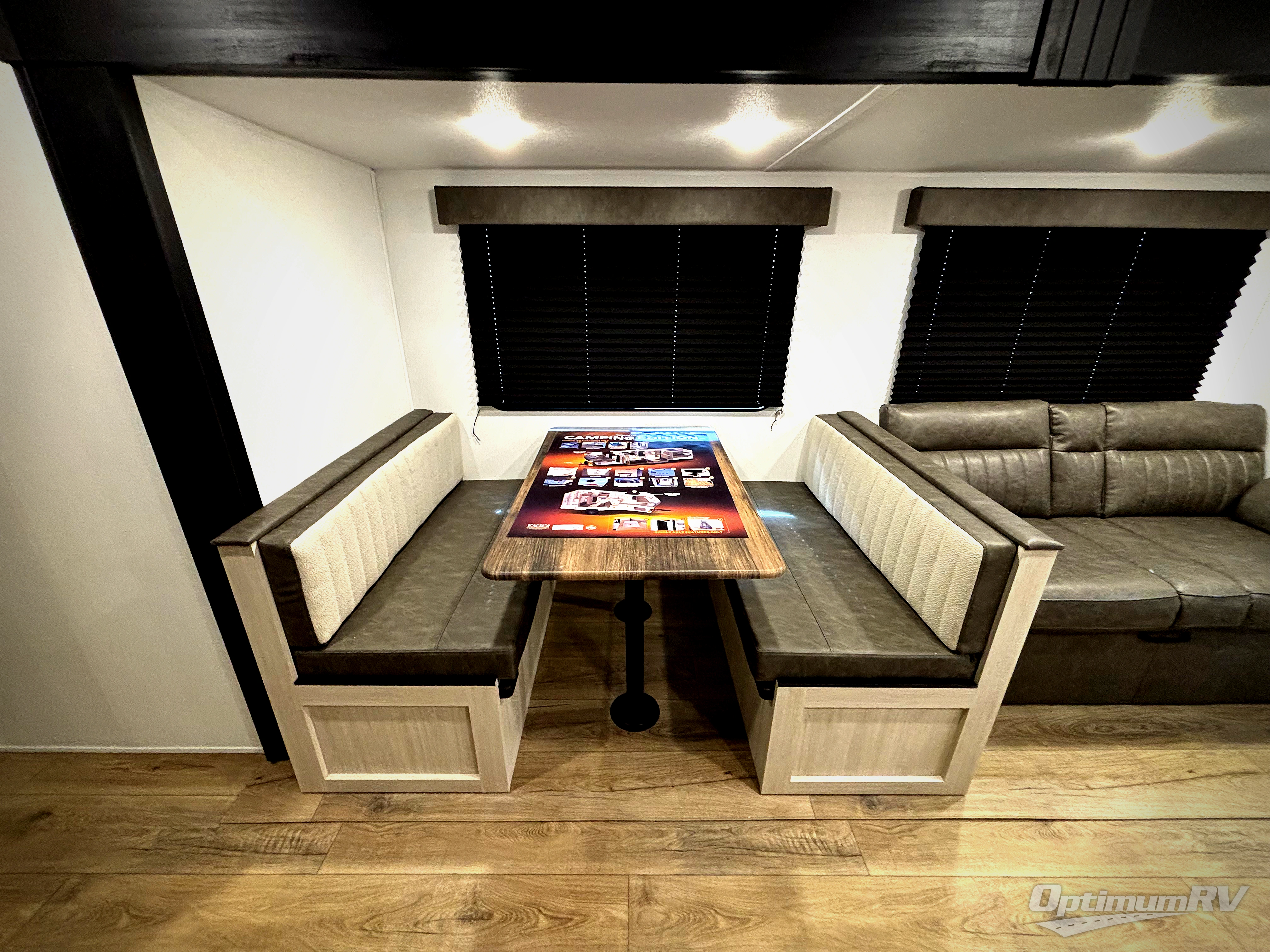 If you're looking for more space, this double axle unit features a large slide so you can walk about freely. Here, you'll find the booth dinette and sofa, which sit across from the optional TV if you want to enjoy movie nights. The full kitchen includes a stainless microwave and three burner cooktop to make meals, plus a pantry and 12V refrigerator for food storage. And an optional outside kitchen with a griddle can be added if you enjoy cooking outdoors! Your guests or littles are sure to enjoy the rear private bunkhouse with four bunk beds and a wardrobe for their things!