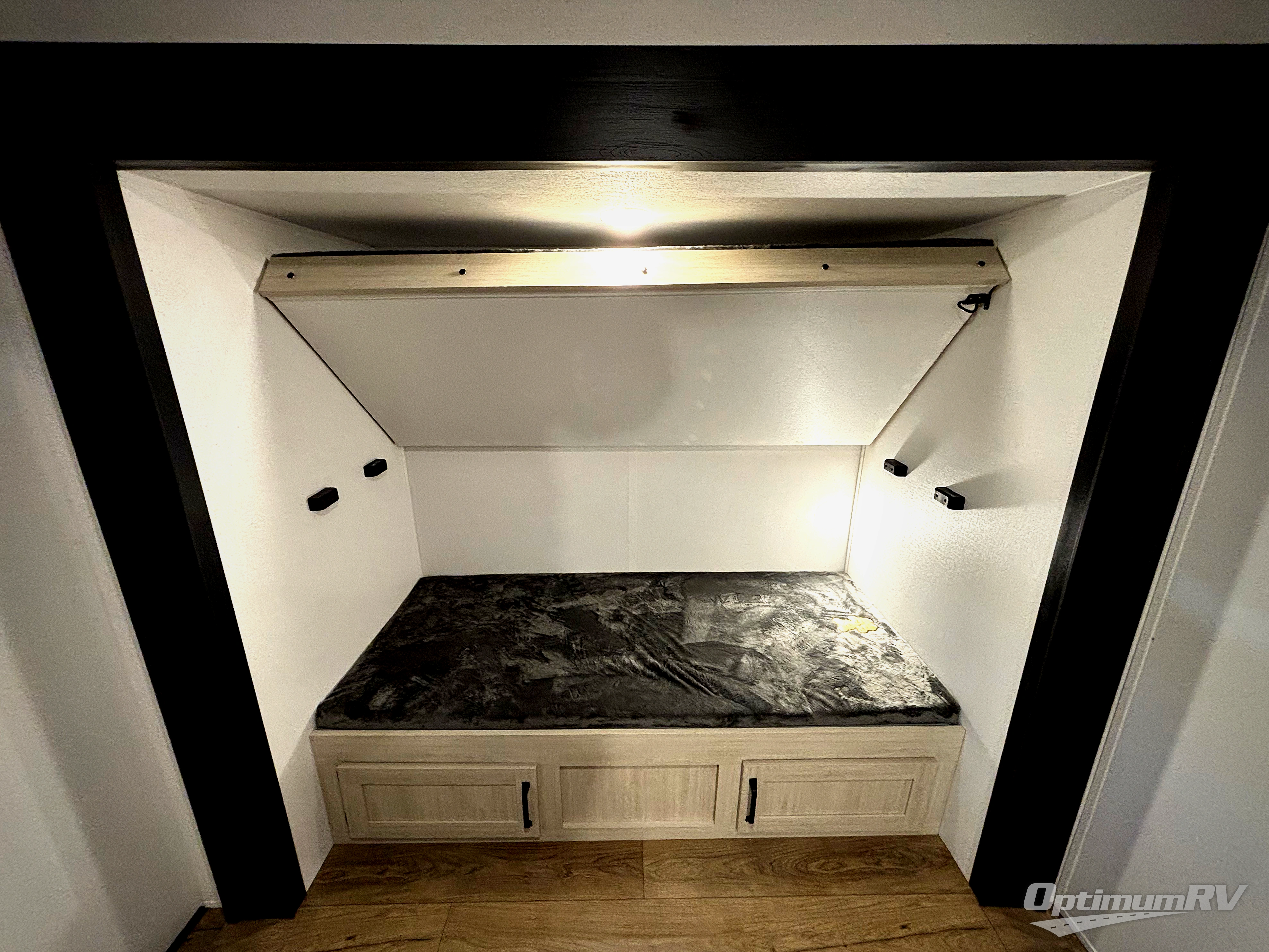 If you're looking for more space, this double axle, double slide out unit is perfect for your group of eight. Within the large slide in the living room, you'll find the booth dinette and sofa, which sit across from the optional TV if you want to enjoy movie nights. The full kitchen includes a stainless microwave and three burner cooktop to make meals, plus a pantry and 12V refrigerator for food storage. And an optional outside kitchen with a griddle can be added if you enjoy cooking outdoors! Your guests or littles are sure to enjoy the rear private bunkhouse that features a set of 38" x 76" bunks across from the third bunk and jiffy sofa within a slide out!