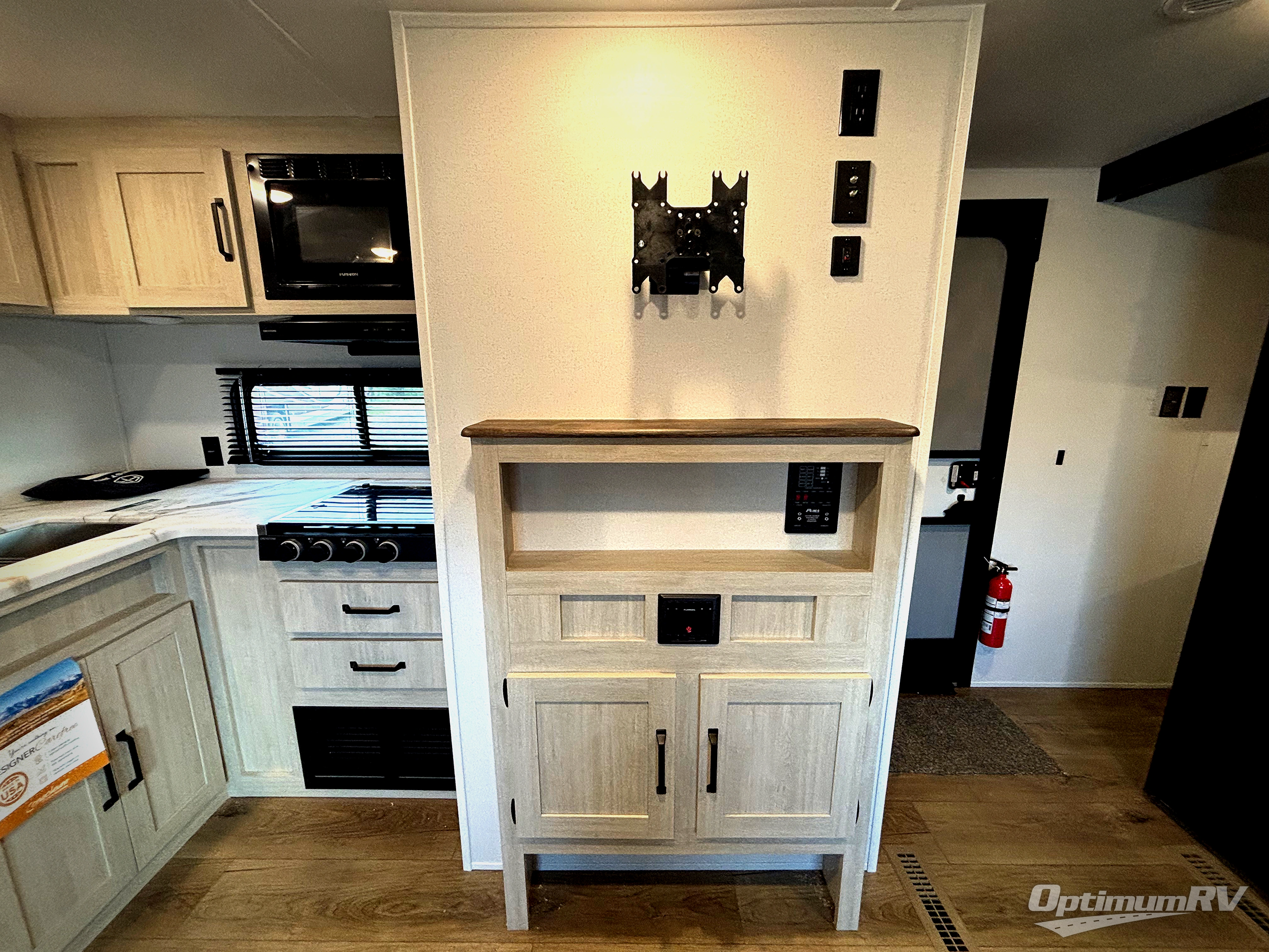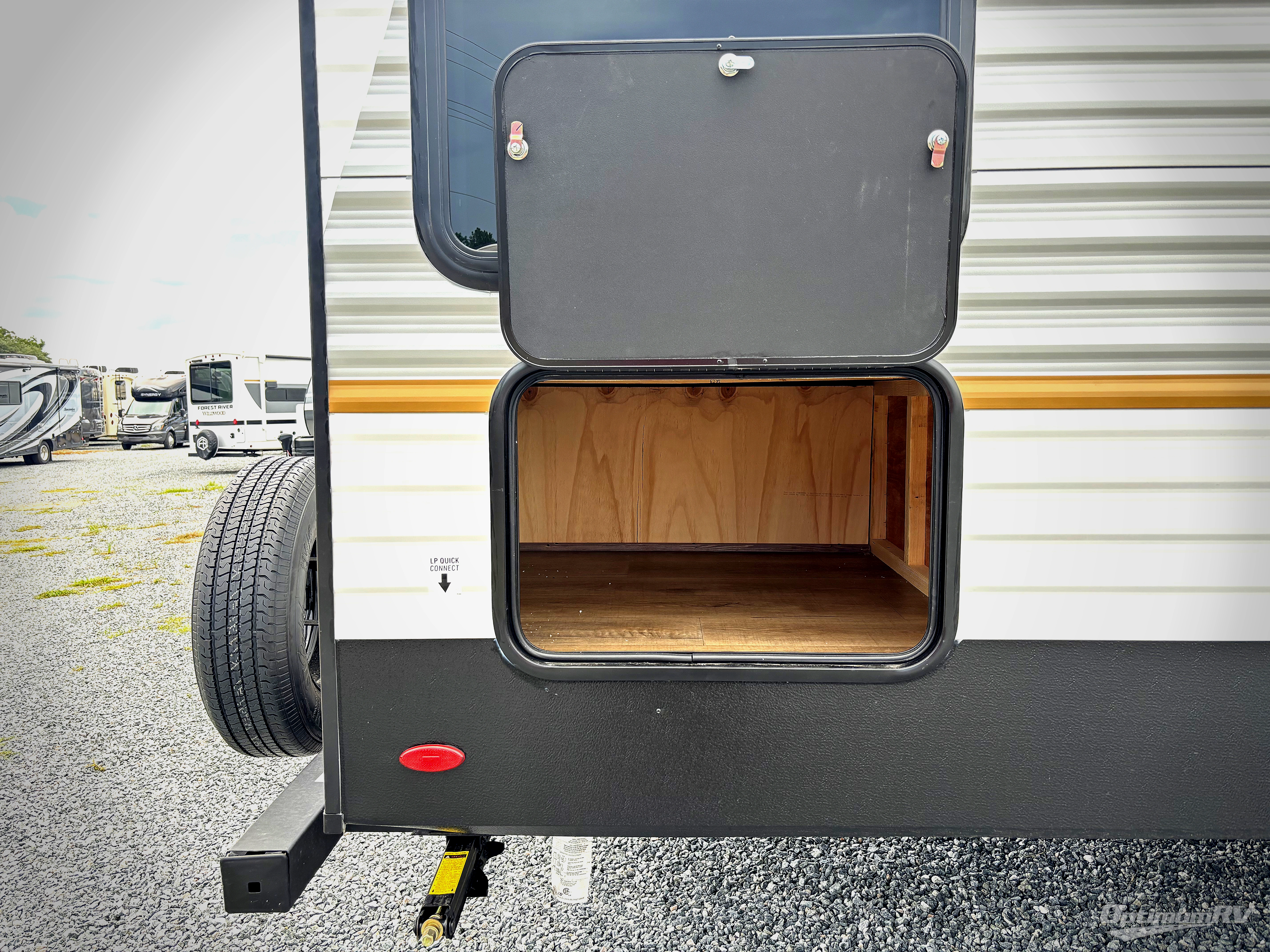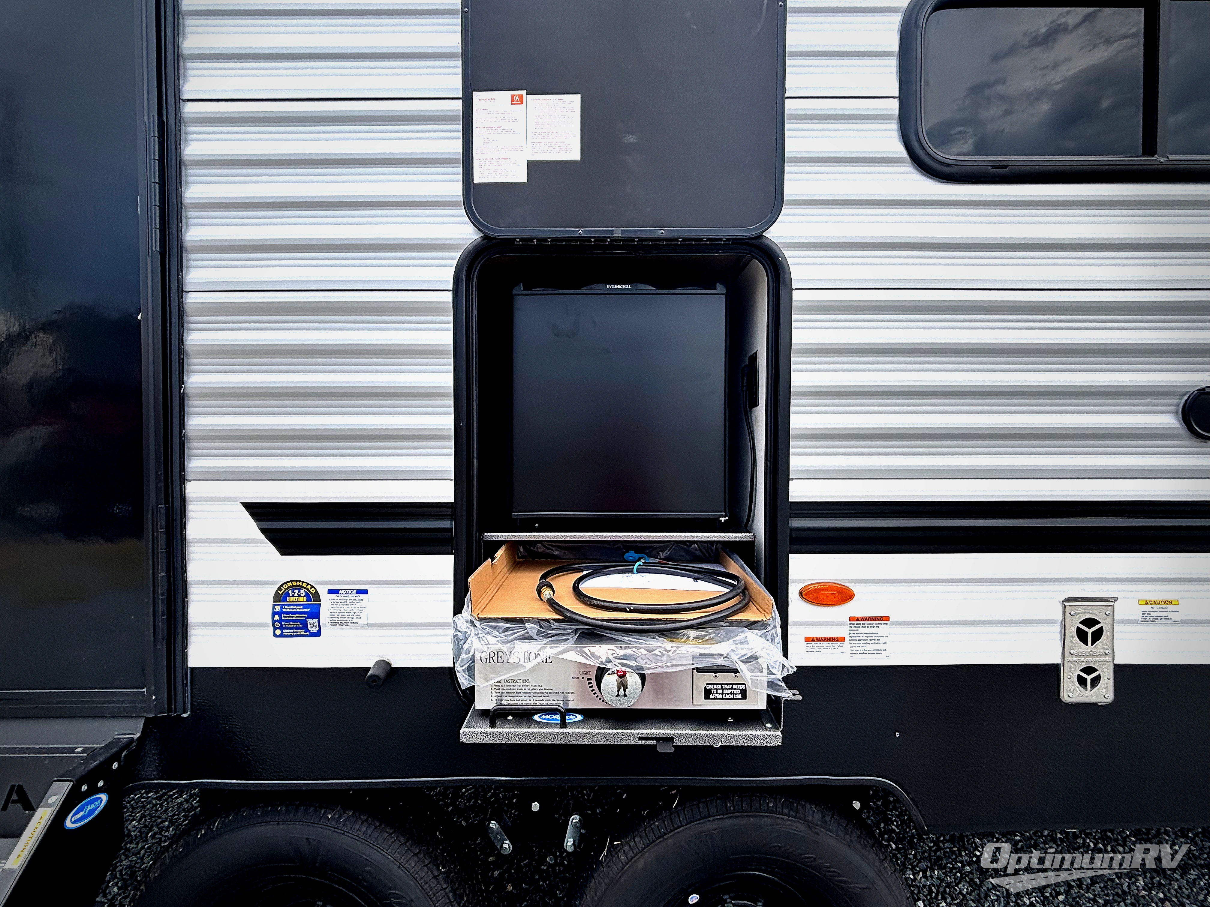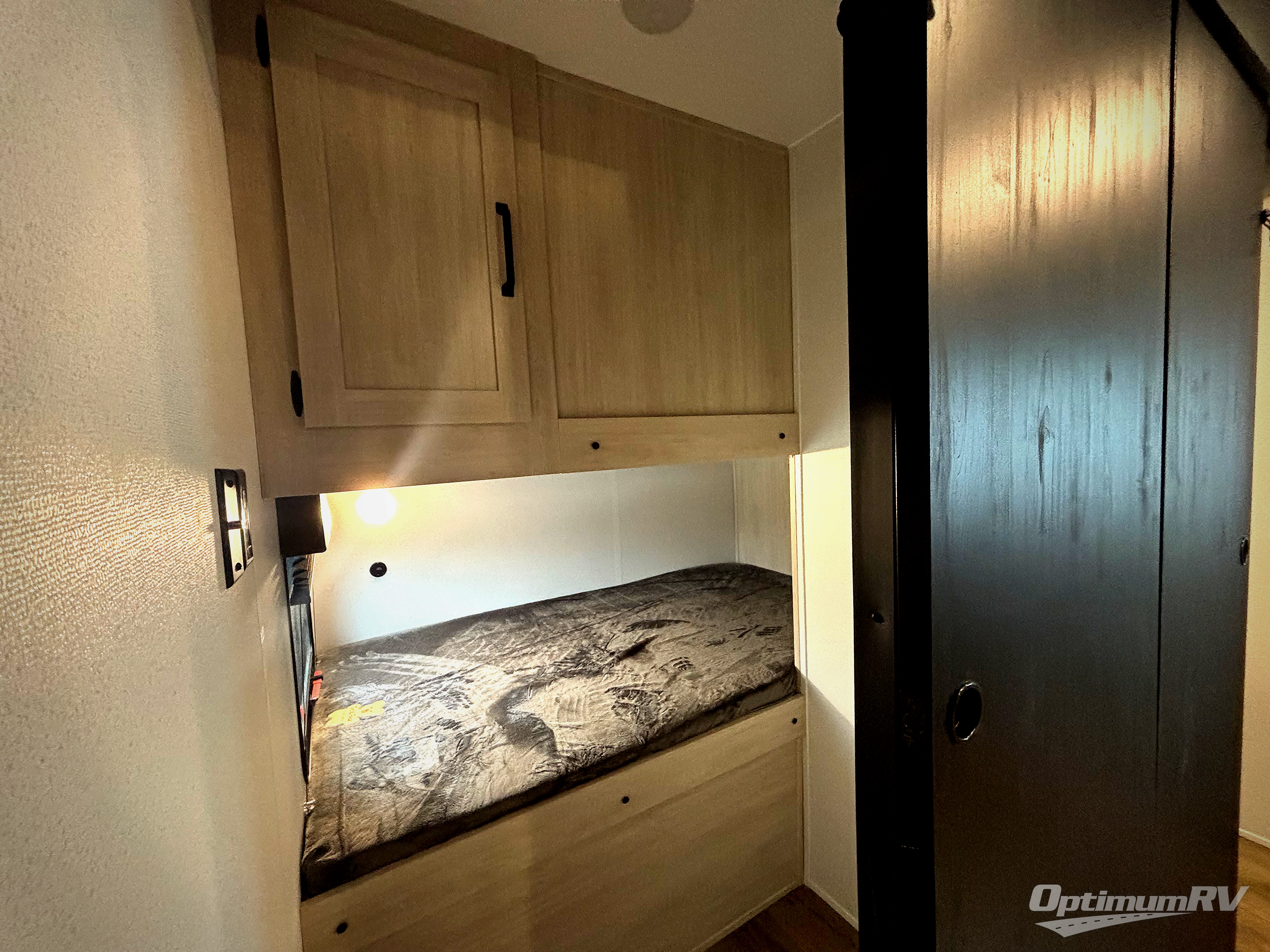 If you're looking for more space, this double axle, double slide out unit is perfect for your group of eight. Within the large slide in the living room, you'll find the booth dinette and sofa, which sit across from the optional TV if you want to enjoy movie nights. The full kitchen includes a stainless microwave and three burner cooktop to make meals, plus a pantry and 12V refrigerator for food storage. And an optional outside kitchen with a griddle can be added if you enjoy cooking outdoors! Your guests or littles are sure to enjoy the rear private bunkhouse that features a set of 38" x 76" bunks across from the third bunk and jiffy sofa within a slide out!