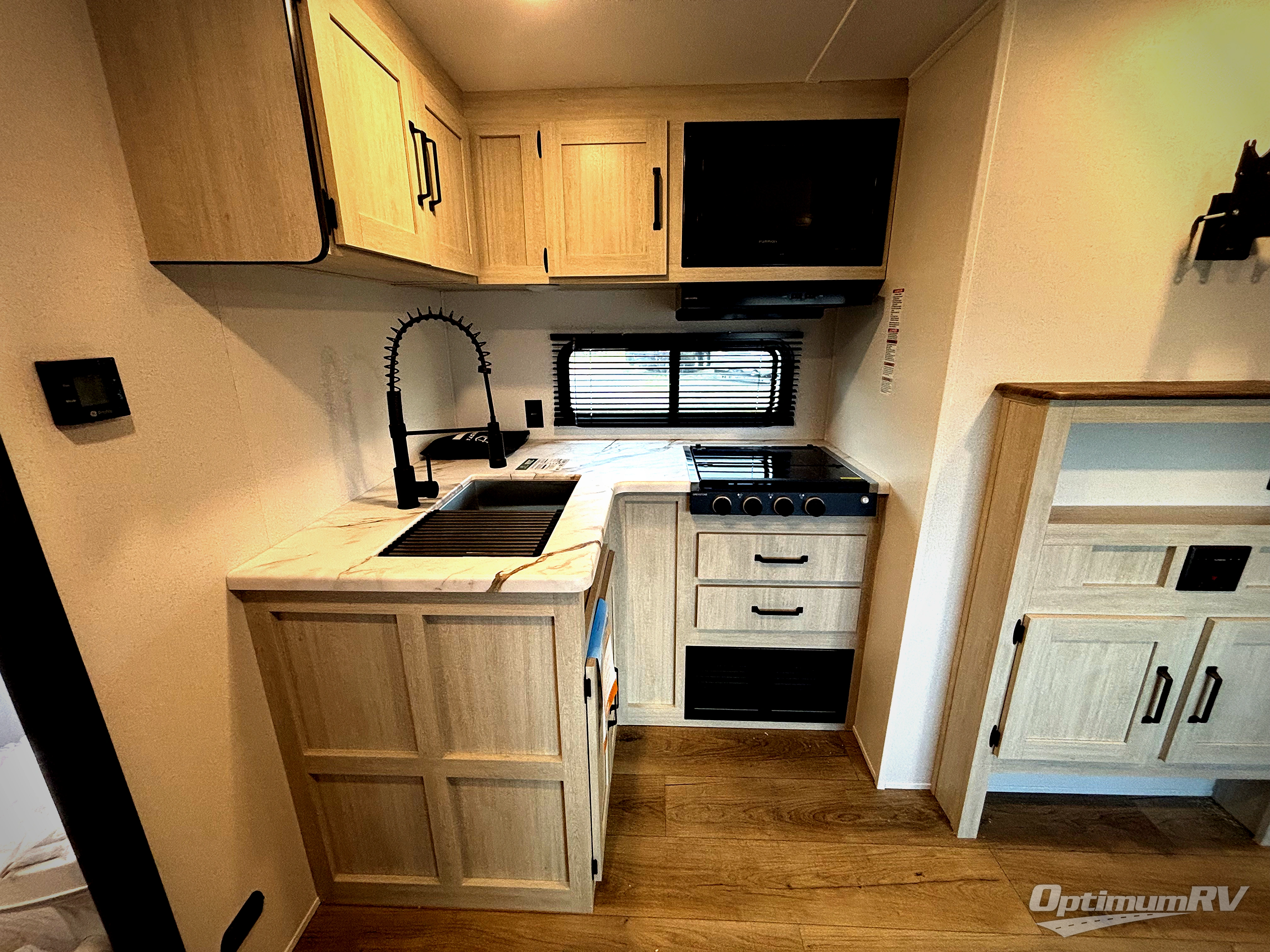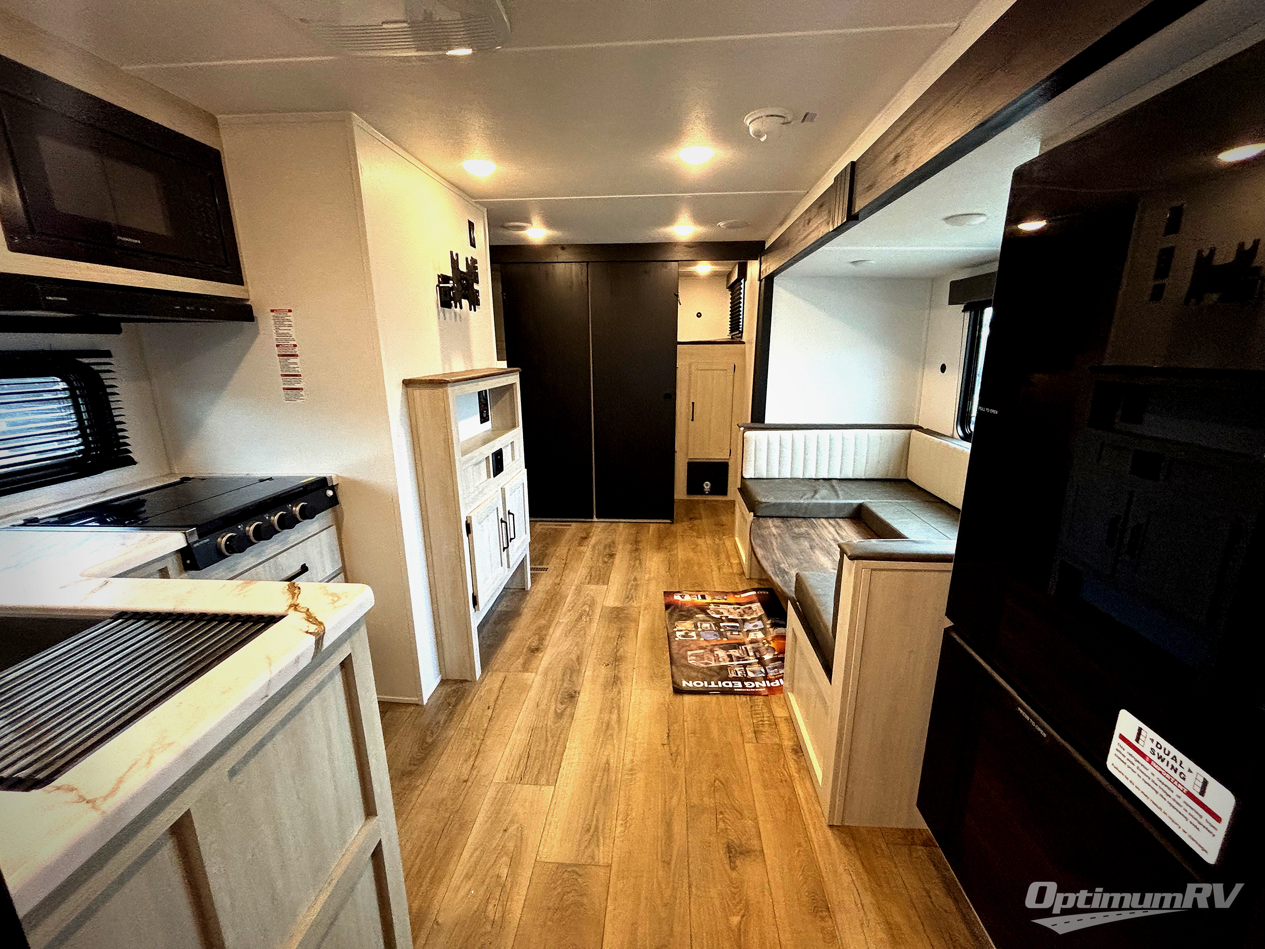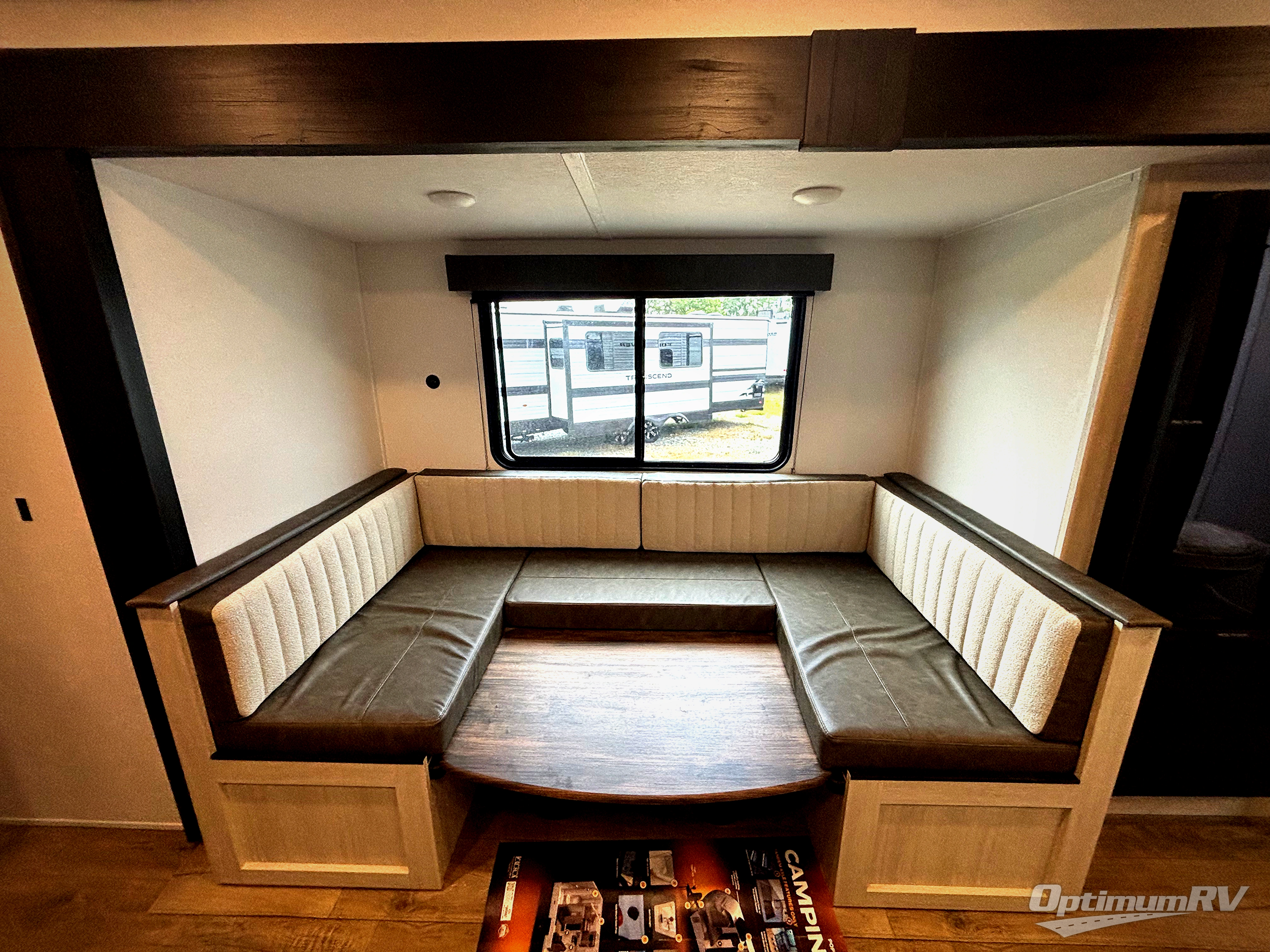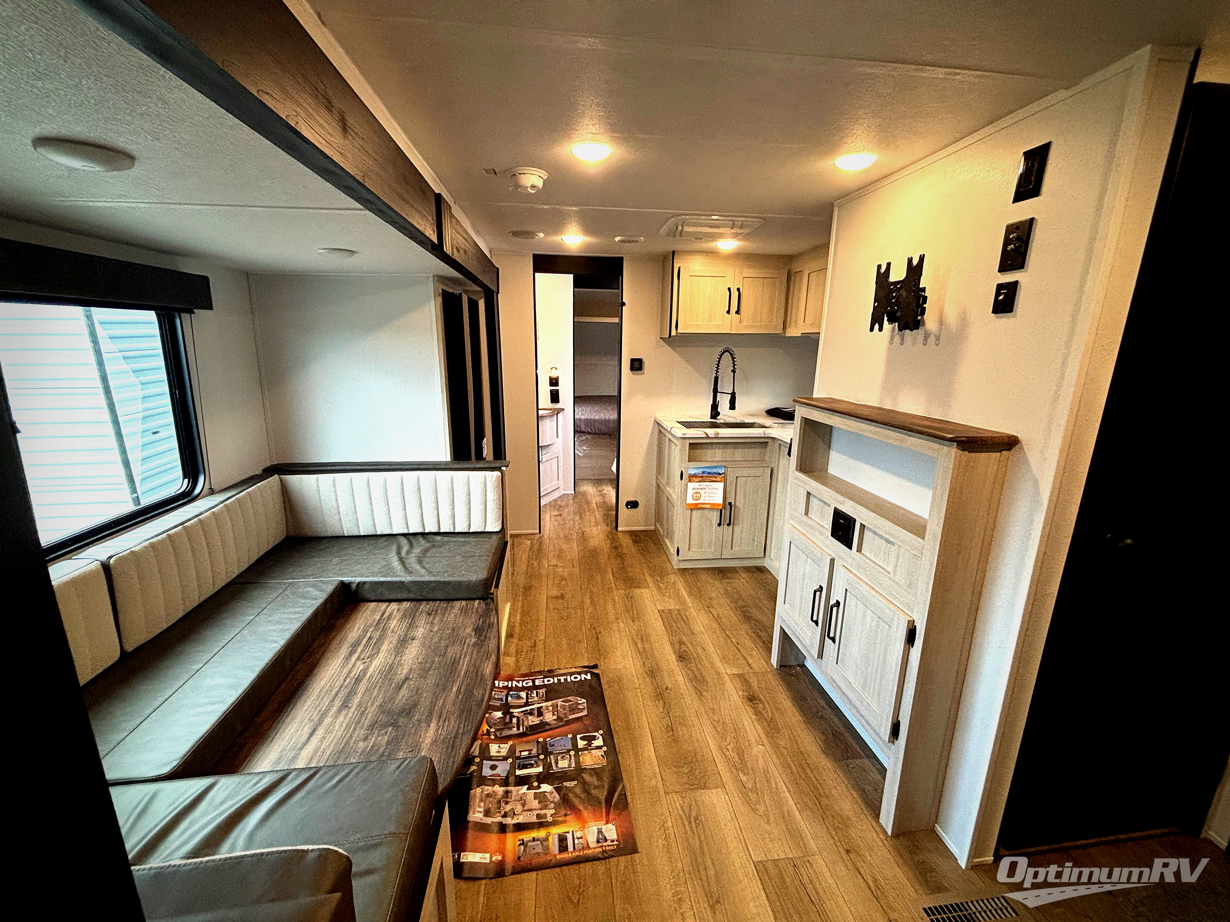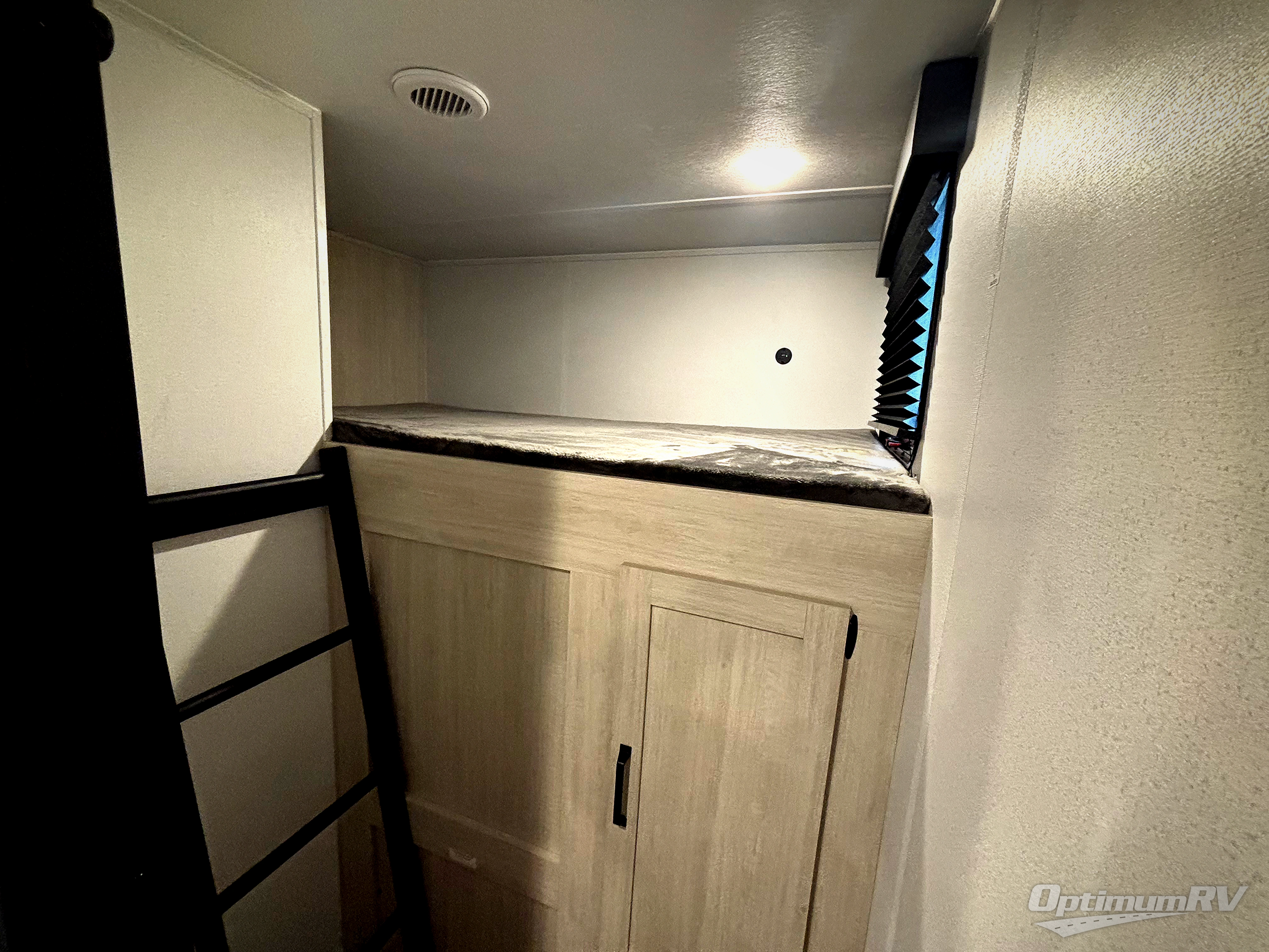 If you're looking for more space, this double axle, double slide out unit is perfect for your group of eight. Within the large slide in the living room, you'll find the booth dinette and sofa, which sit across from the optional TV if you want to enjoy movie nights. The full kitchen includes a stainless microwave and three burner cooktop to make meals, plus a pantry and 12V refrigerator for food storage. And an optional outside kitchen with a griddle can be added if you enjoy cooking outdoors! Your guests or littles are sure to enjoy the rear private bunkhouse that features a set of 38" x 76" bunks across from the third bunk and jiffy sofa within a slide out!