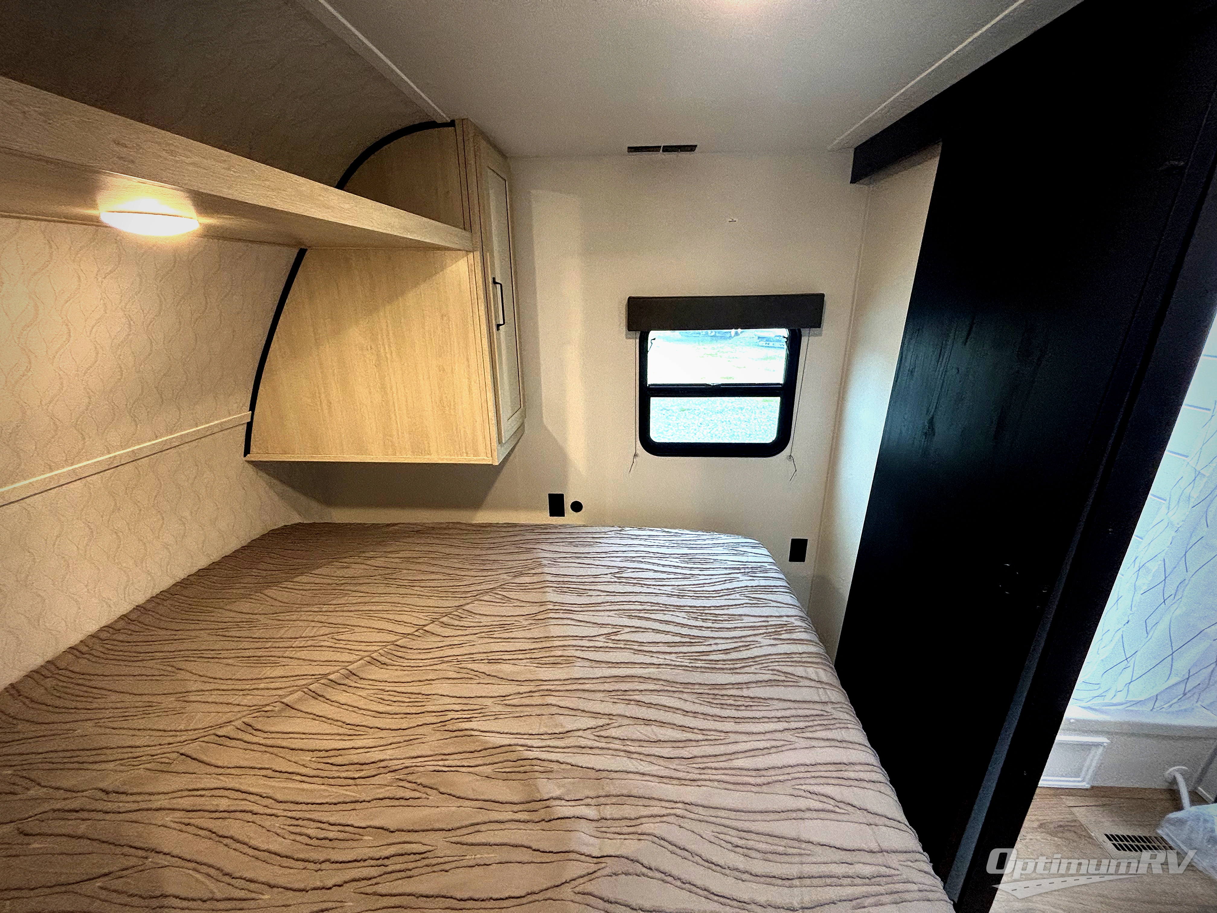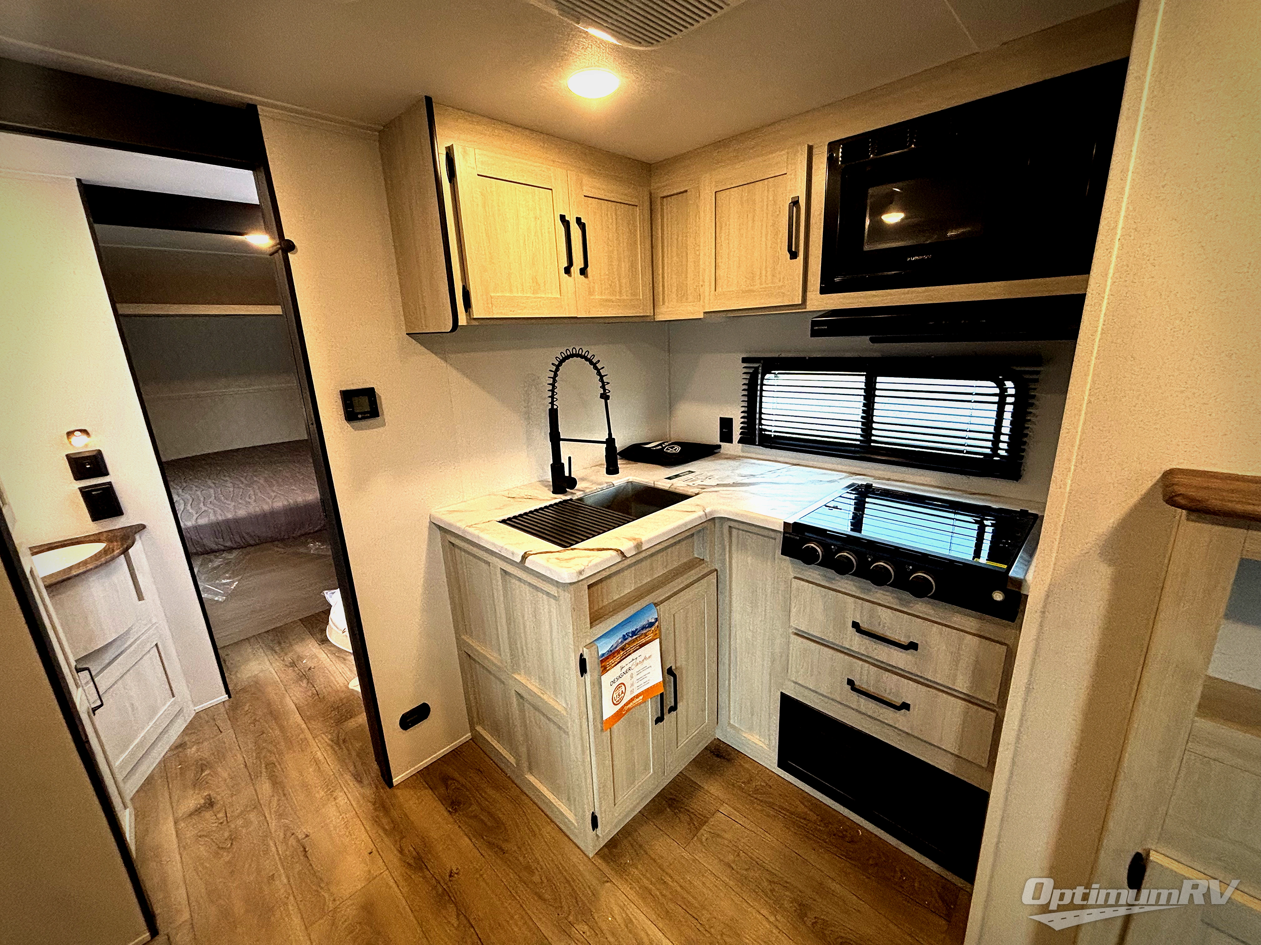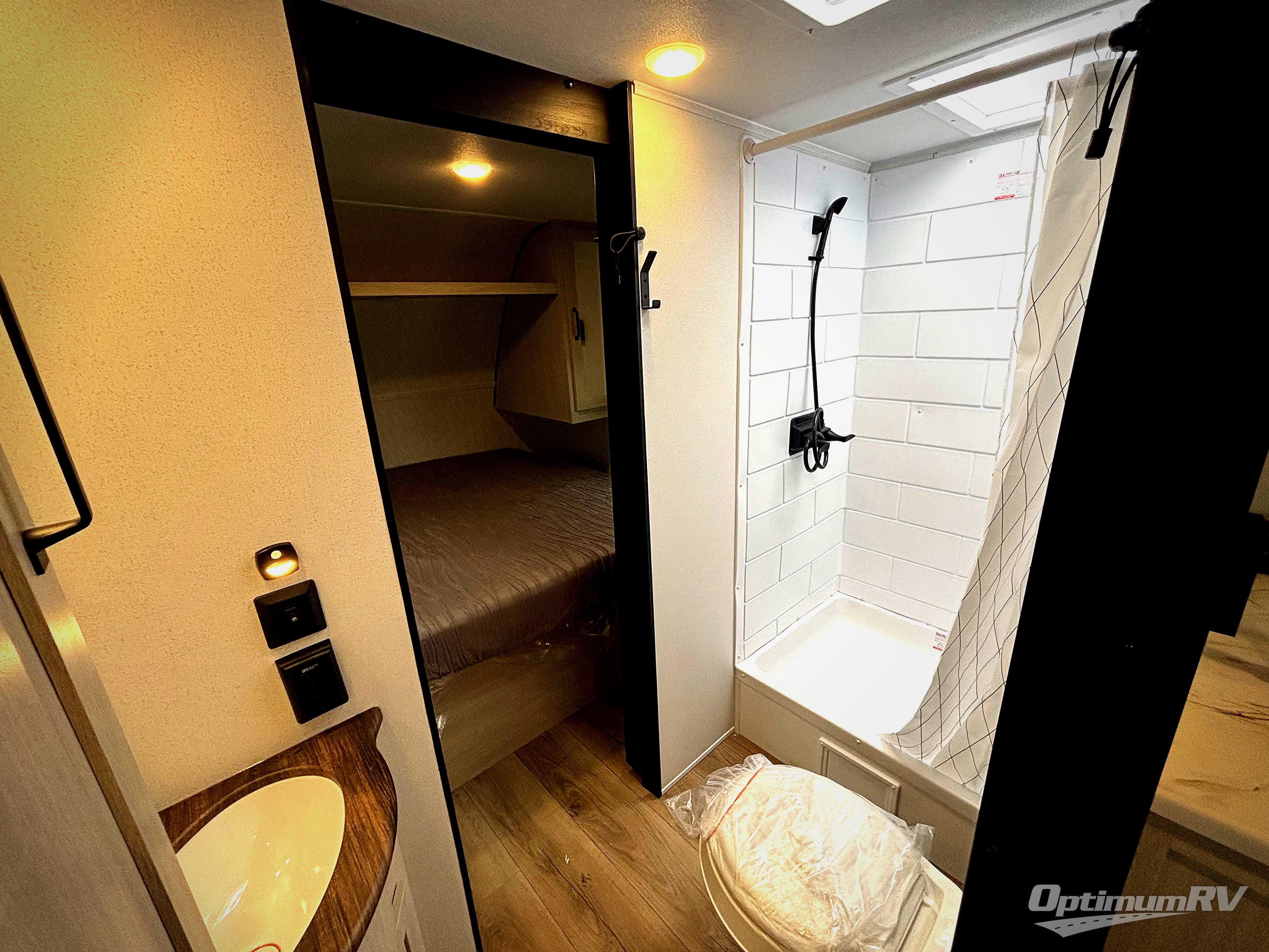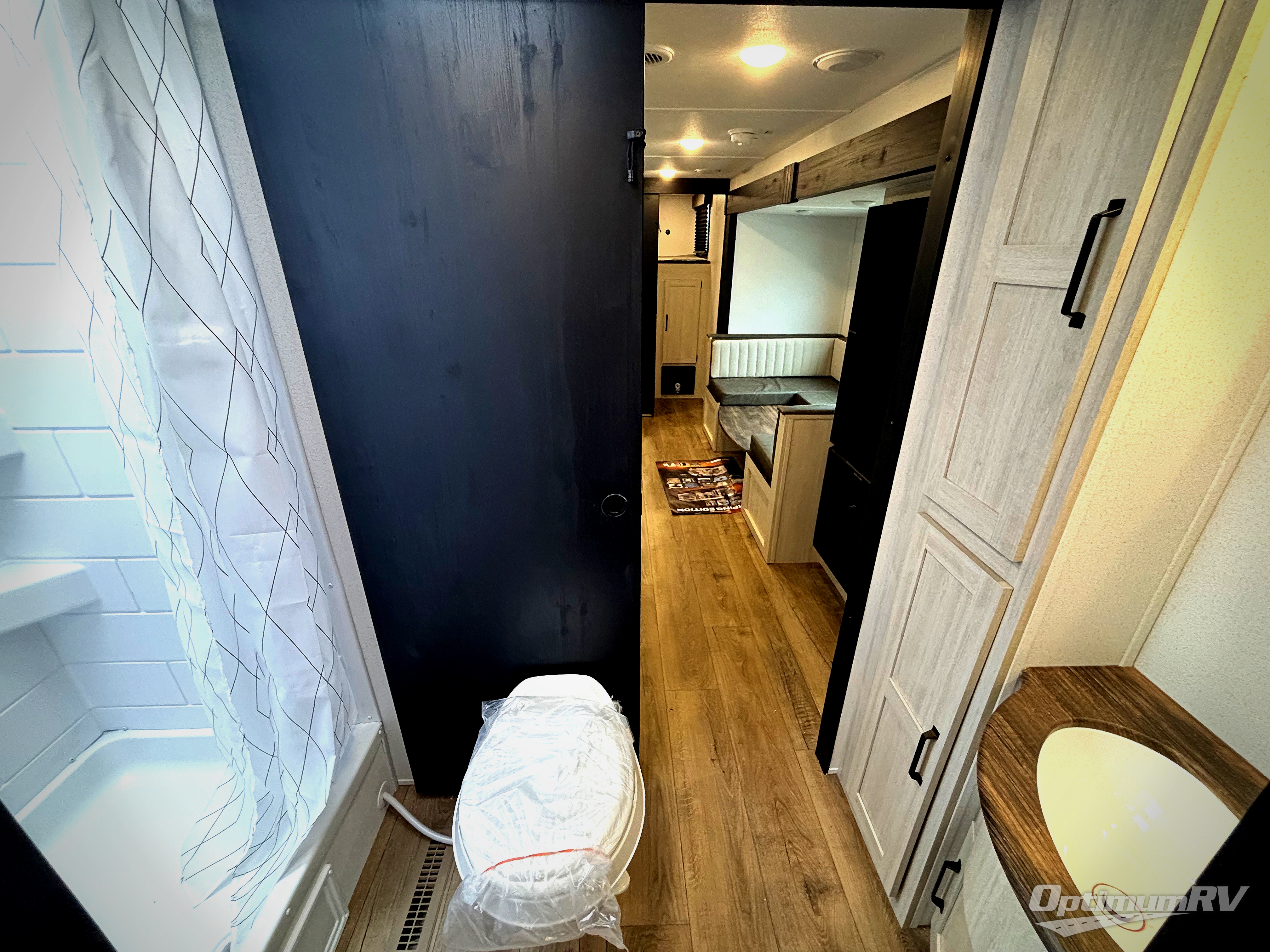 If you're looking for more space, this double axle, double slide out unit is perfect for your group of eight. Within the large slide in the living room, you'll find the booth dinette and sofa, which sit across from the optional TV if you want to enjoy movie nights. The full kitchen includes a stainless microwave and three burner cooktop to make meals, plus a pantry and 12V refrigerator for food storage. And an optional outside kitchen with a griddle can be added if you enjoy cooking outdoors! Your guests or littles are sure to enjoy the rear private bunkhouse that features a set of 38" x 76" bunks across from the third bunk and jiffy sofa within a slide out!