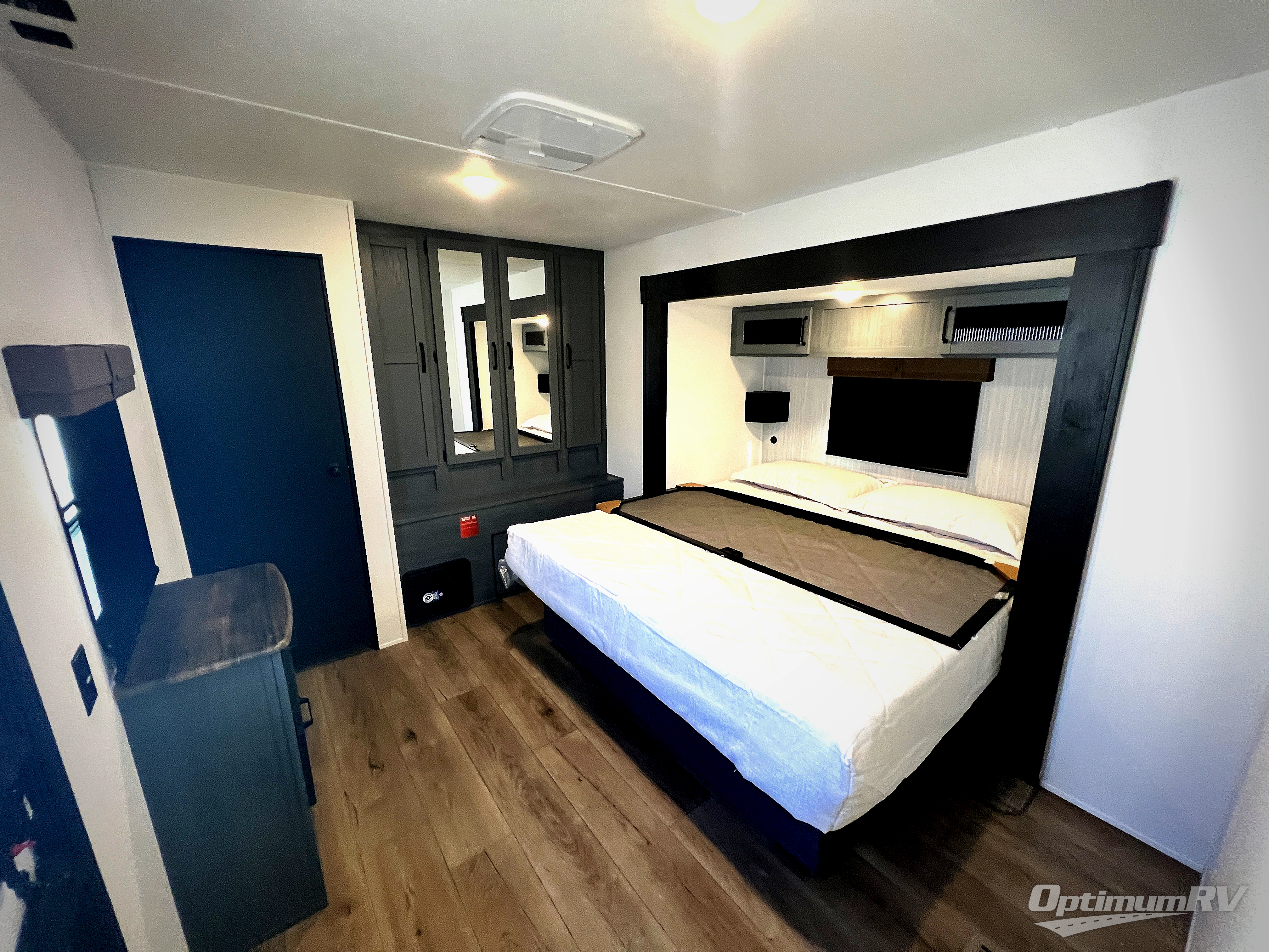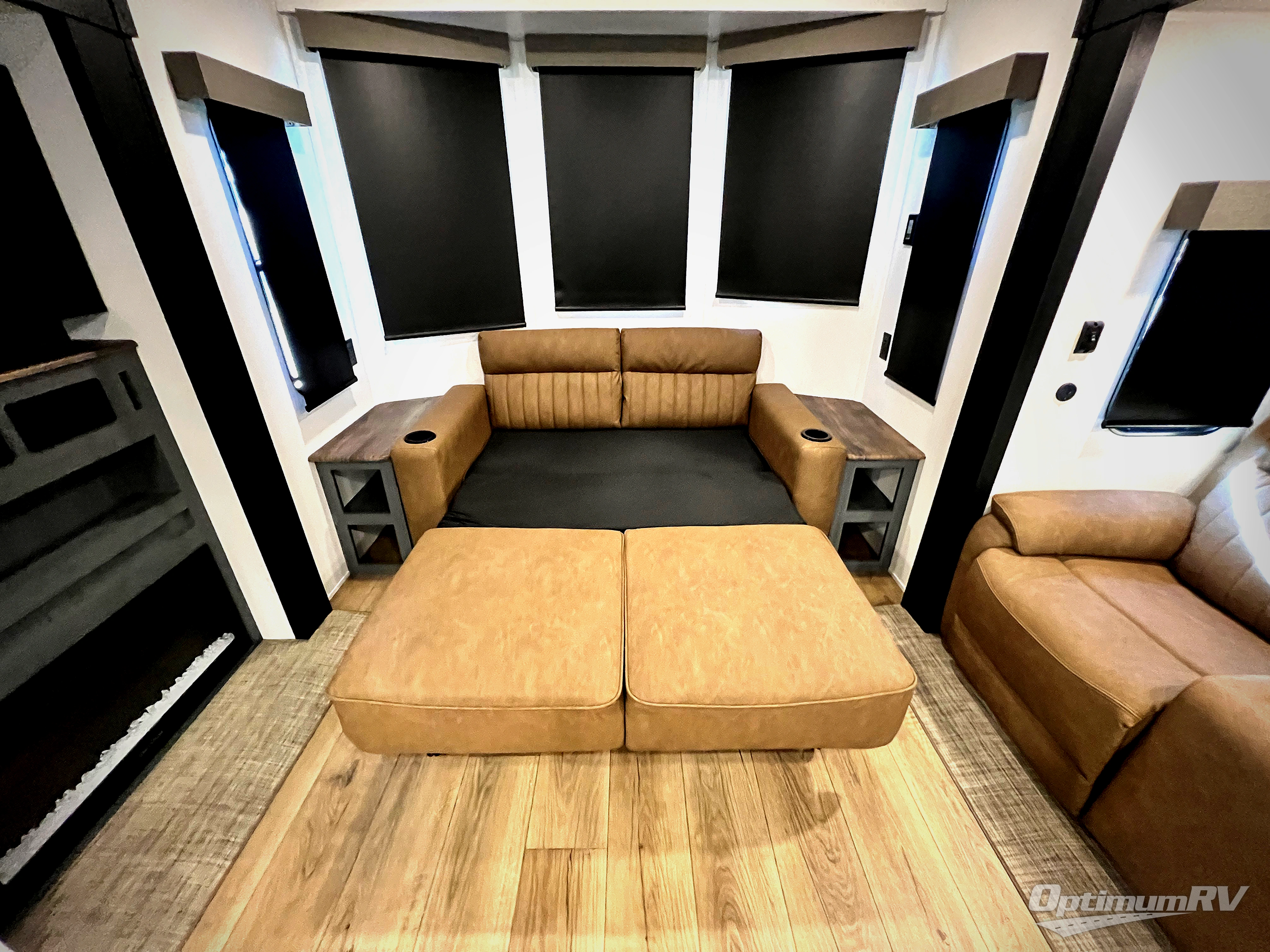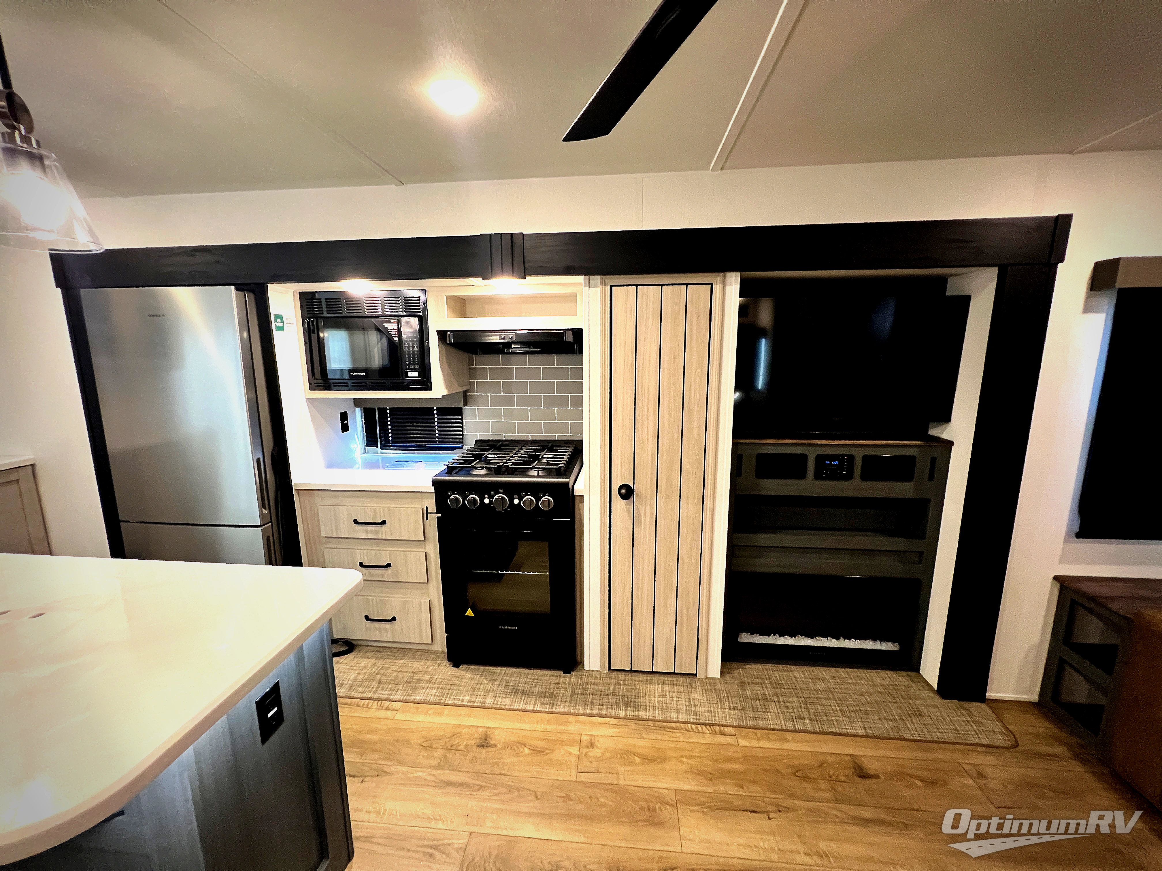 Get ready to enjoy your destination for a weekend or even longer in comfort with the front living and kitchen combined area. The sofa and booth dinette offer relaxing and dining space as well as sleeping space when needed. There are two recliners you are sure to love, as well as a fireplace to make it feel more like home. There is a kitchen island to prepare and serve meals from and wash the dishes. The kitchen offers full amenities including a stainless steel refrigerator and plenty of storage. You will surely enjoy the natural lighting from the patio door, and the second entry/exit is located in the rear private bedroom where you can sleep like a royalty on the king bed. There is also a closet with the option to add washer and dryer prep if you choose!