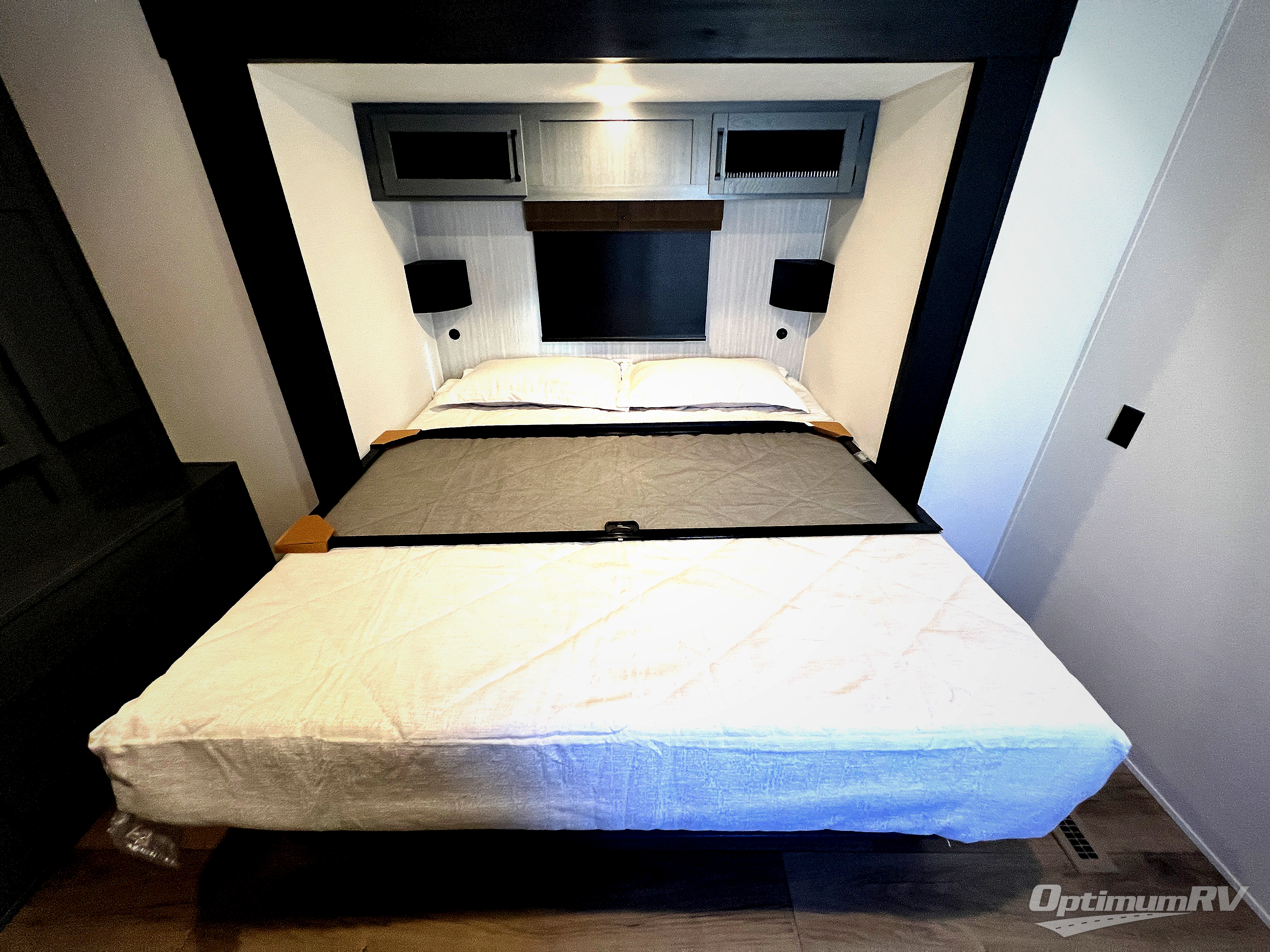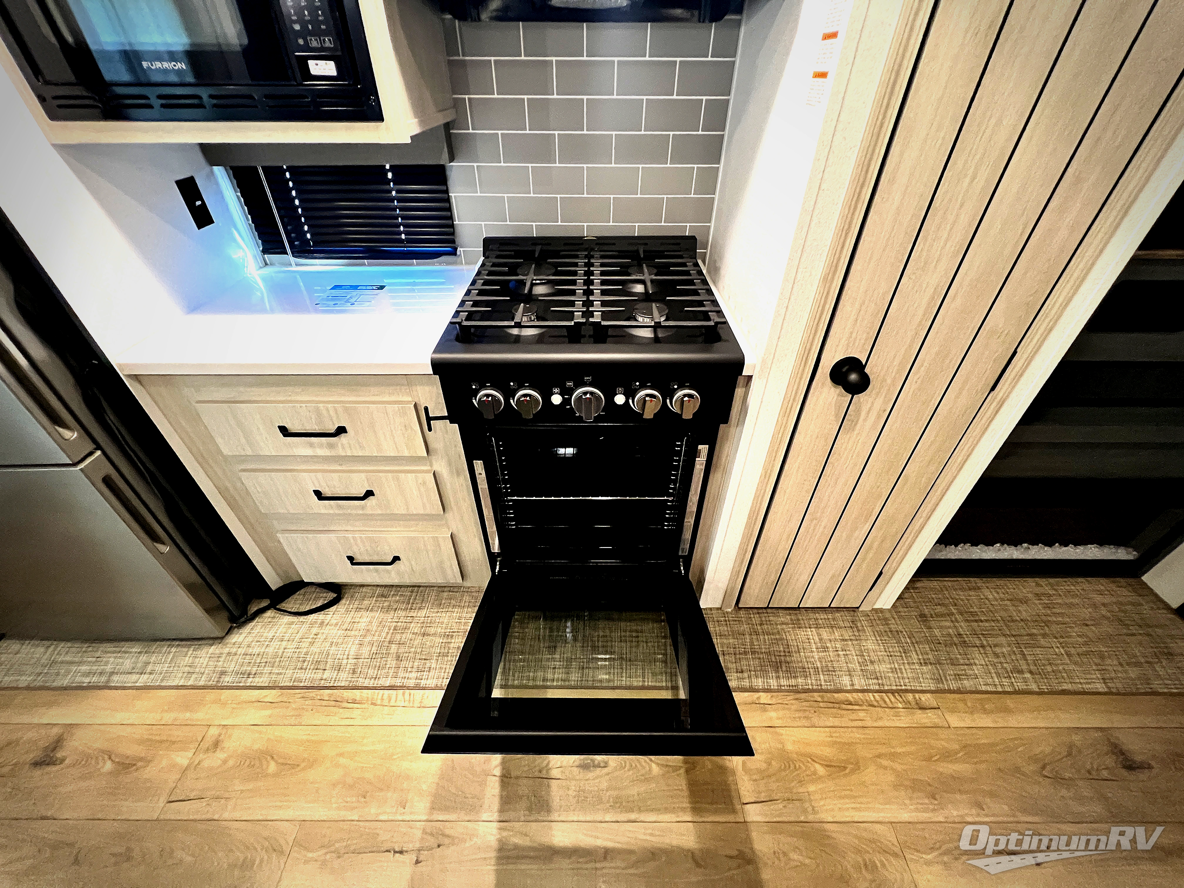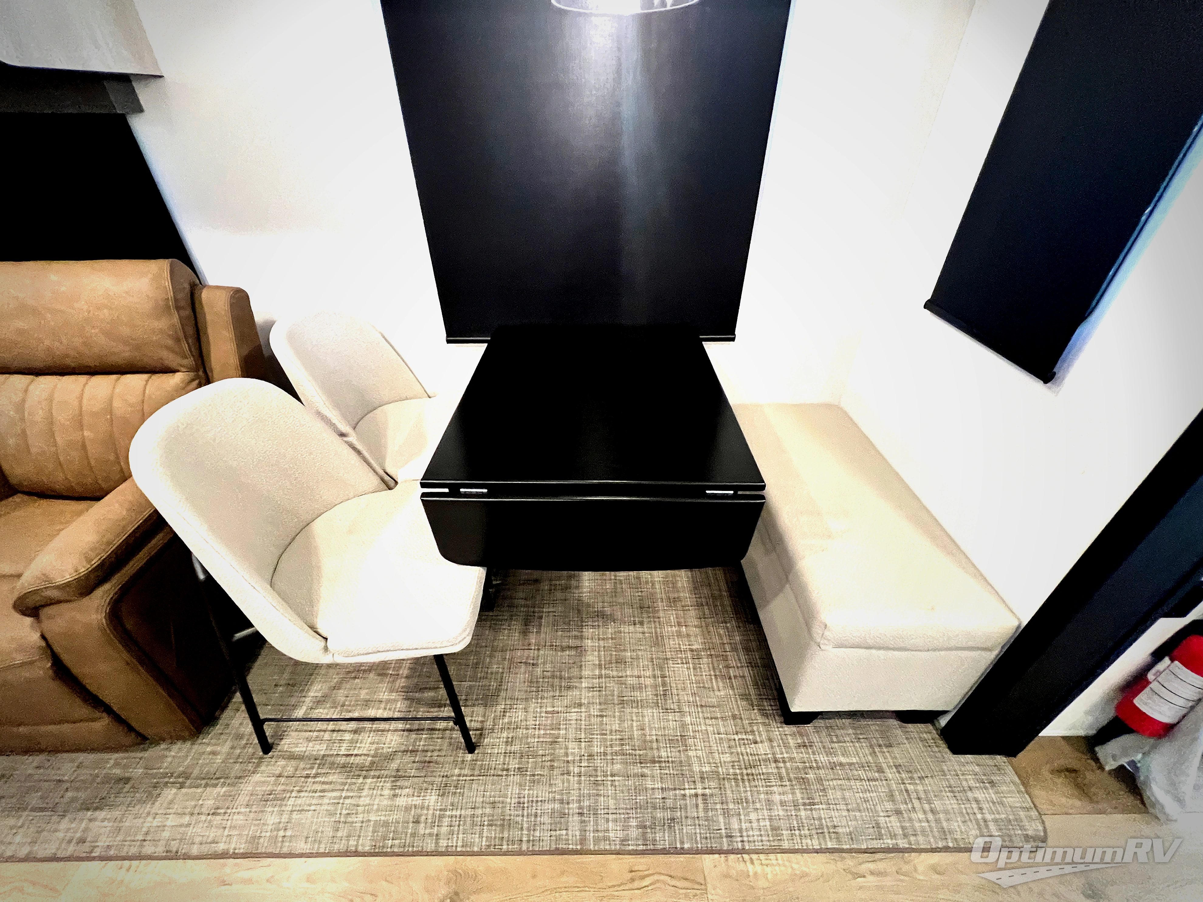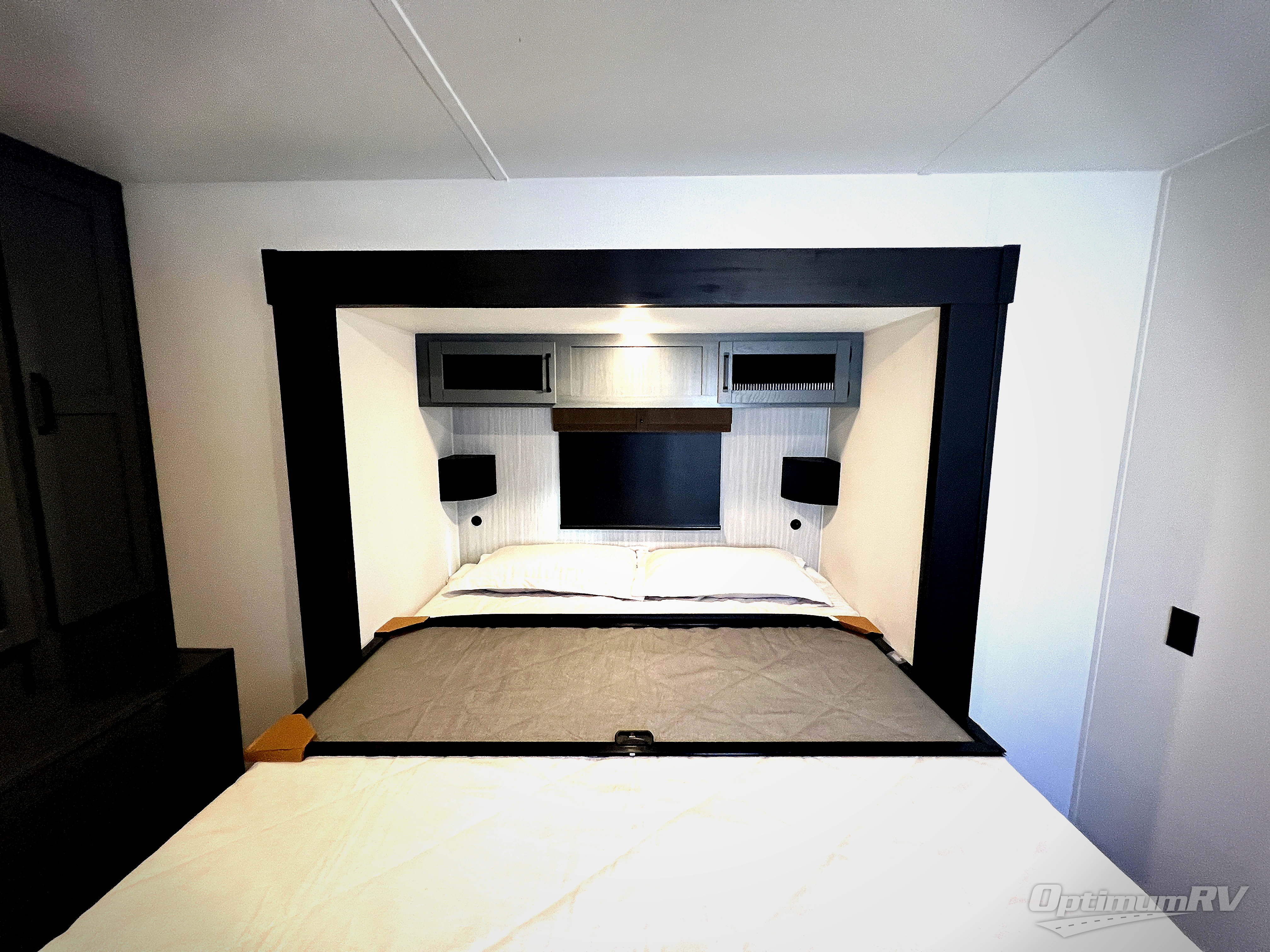 Get ready to enjoy your destination for a weekend or even longer in comfort with the front living and kitchen combined area. The sofa and booth dinette offer relaxing and dining space as well as sleeping space when needed. There are two recliners you are sure to love, as well as a fireplace to make it feel more like home. There is a kitchen island to prepare and serve meals from and wash the dishes. The kitchen offers full amenities including a stainless steel refrigerator and plenty of storage. You will surely enjoy the natural lighting from the patio door, and the second entry/exit is located in the rear private bedroom where you can sleep like a royalty on the king bed. There is also a closet with the option to add washer and dryer prep if you choose!