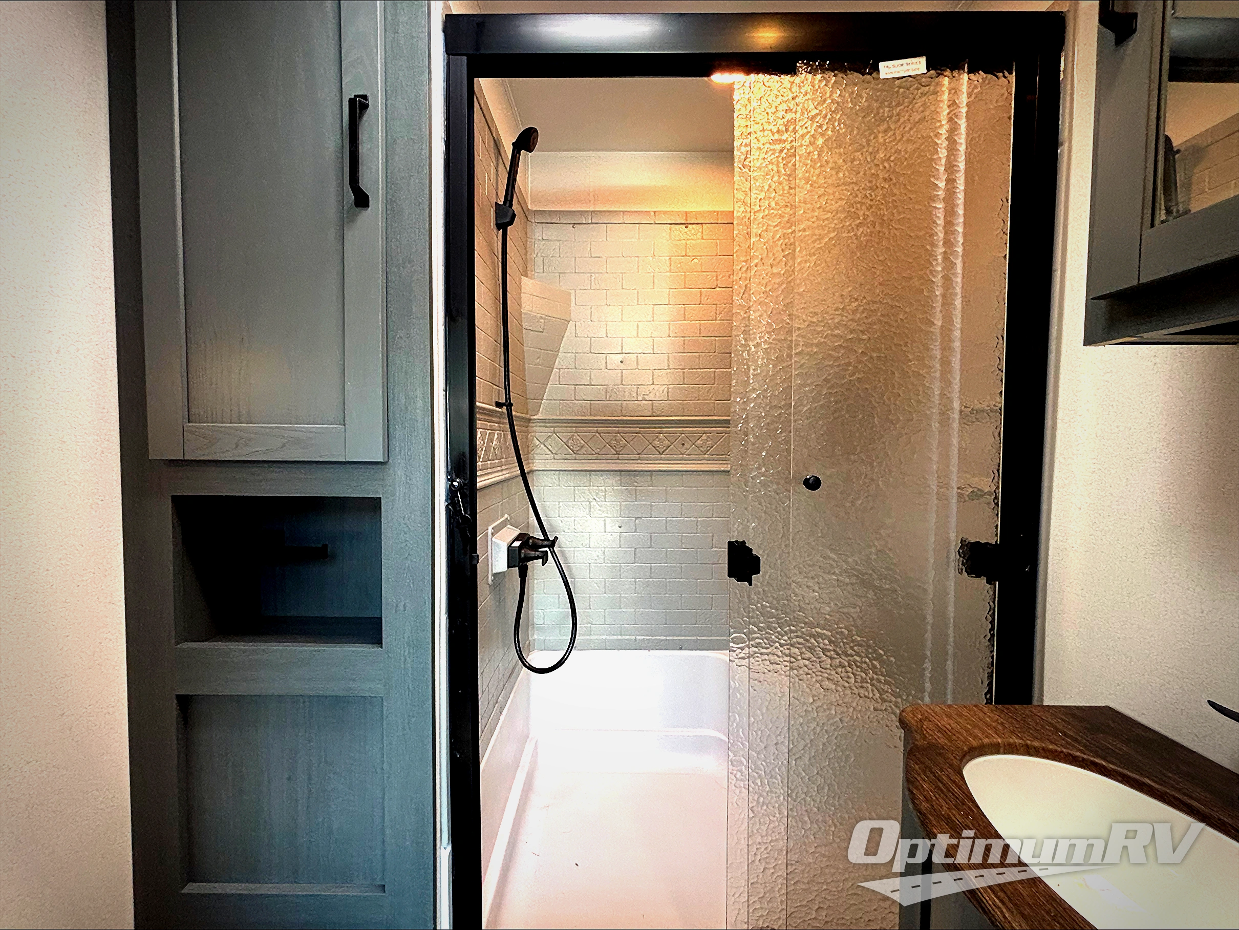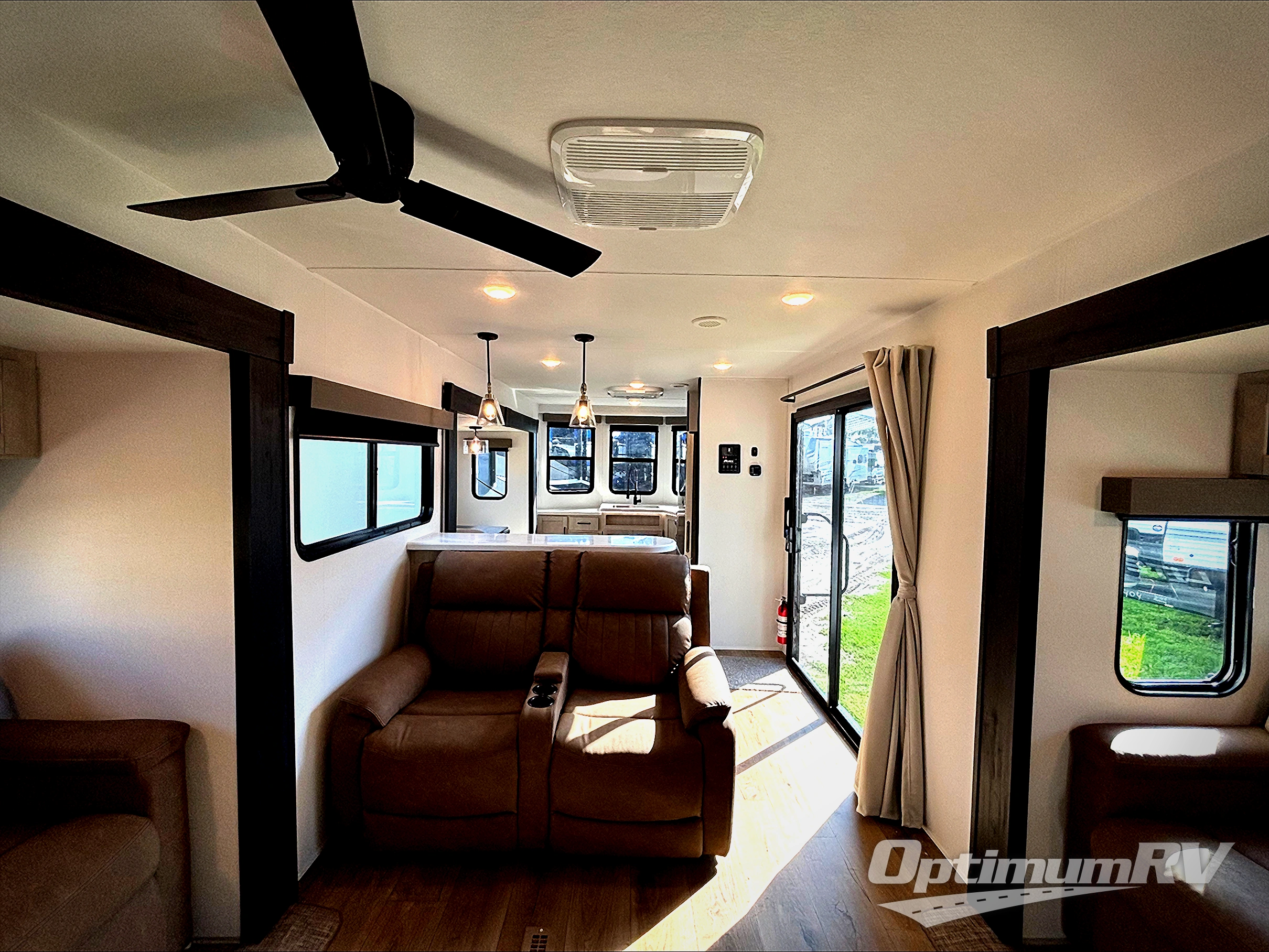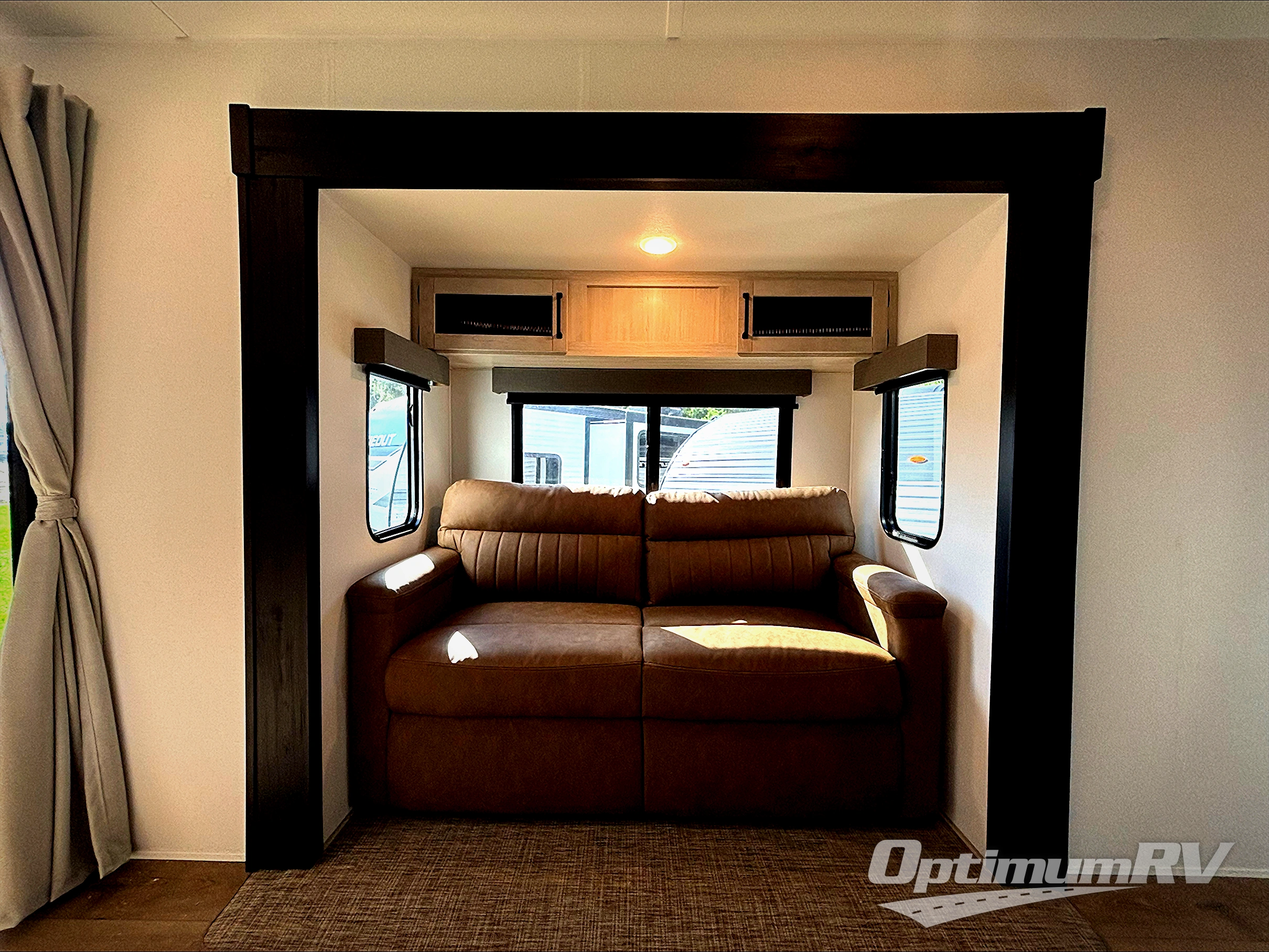 If you are looking for your own space in your next destination trailer, you have found it! With a front separate kitchen, a middle separate living area, a full bathroom and a rear bedroom, you can call one of these spaces your own. The cook will love the front counter space and appliances, and you can dine at the booth dinette or the breakfast nook. Someone can be visiting with friends and family while sitting on the two sofa slides or the two recliners, while another is getting ready in the full bathroom. You will sleep soundly on the king bed slide out, and the closet with washer and dryer prep option will make full-time RV living easier than ever.