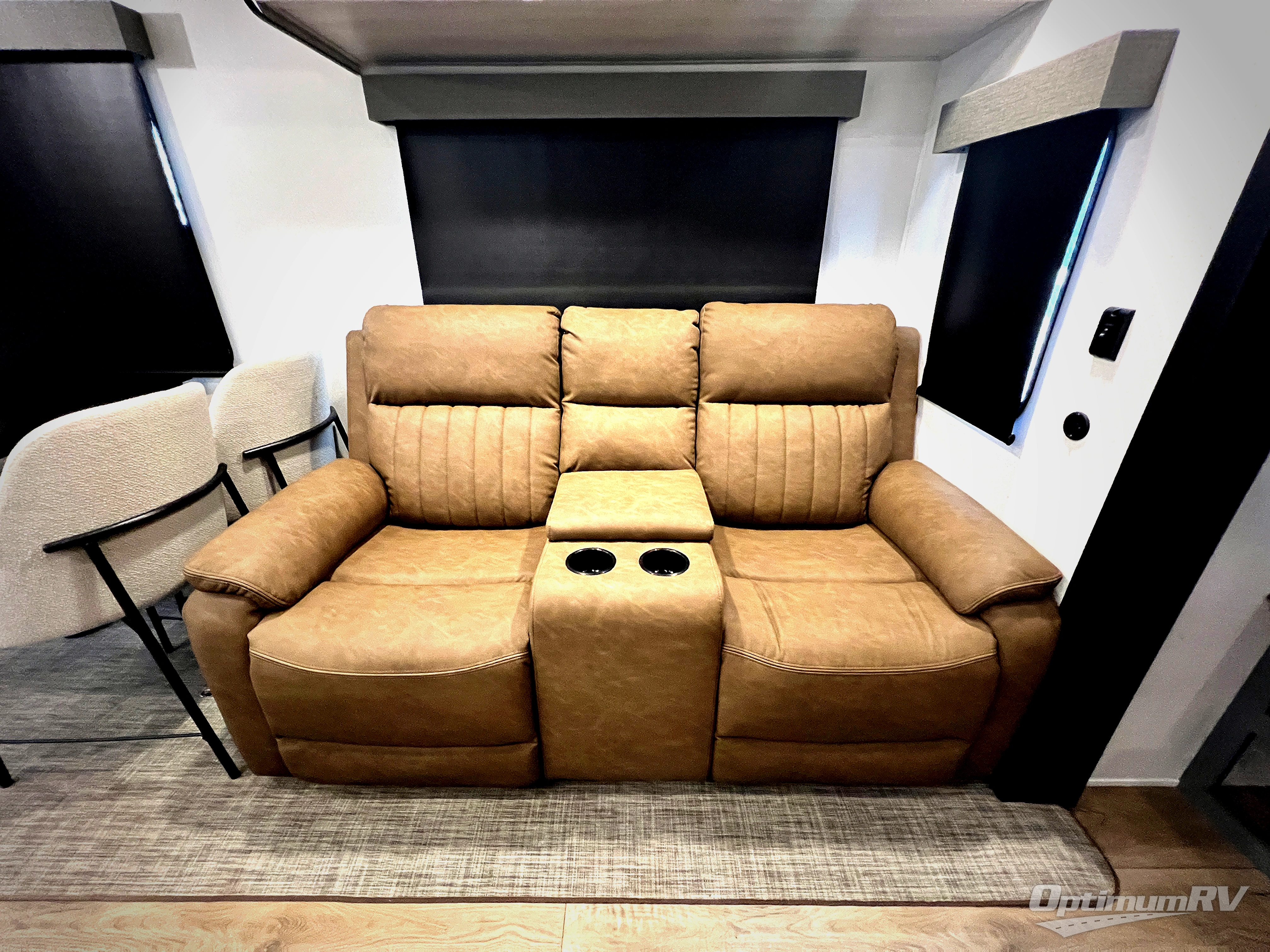 Wherever your destination may be, you can be sure to enjoy it to the fullest with this trailer in tow! With two entry doors, you can enter in through the front private bedroom or the main living area. The bedroom includes a king bed slide out, a desktop if you need to work from home, and a wardrobe/closet to keep your clothes organized. There is also a closet with the option to add washer and dryer prep. Just outside this room are steps that lead to the large loft area with a 58" x 58" bunk mat and a cabinet on one side, plus two 32" x 80" bunk mats on the other. There is also a front cabinet and a wardrobe/closet for plenty of storage space. Once you've headed back downstairs, you can relax on the dual recliners, rear sofa, or free-standing table with a bench and two seats. And the chef of your group will love the kitchen with its residential style refrigerator and pantry, kitchen island, and four burner cooktop!