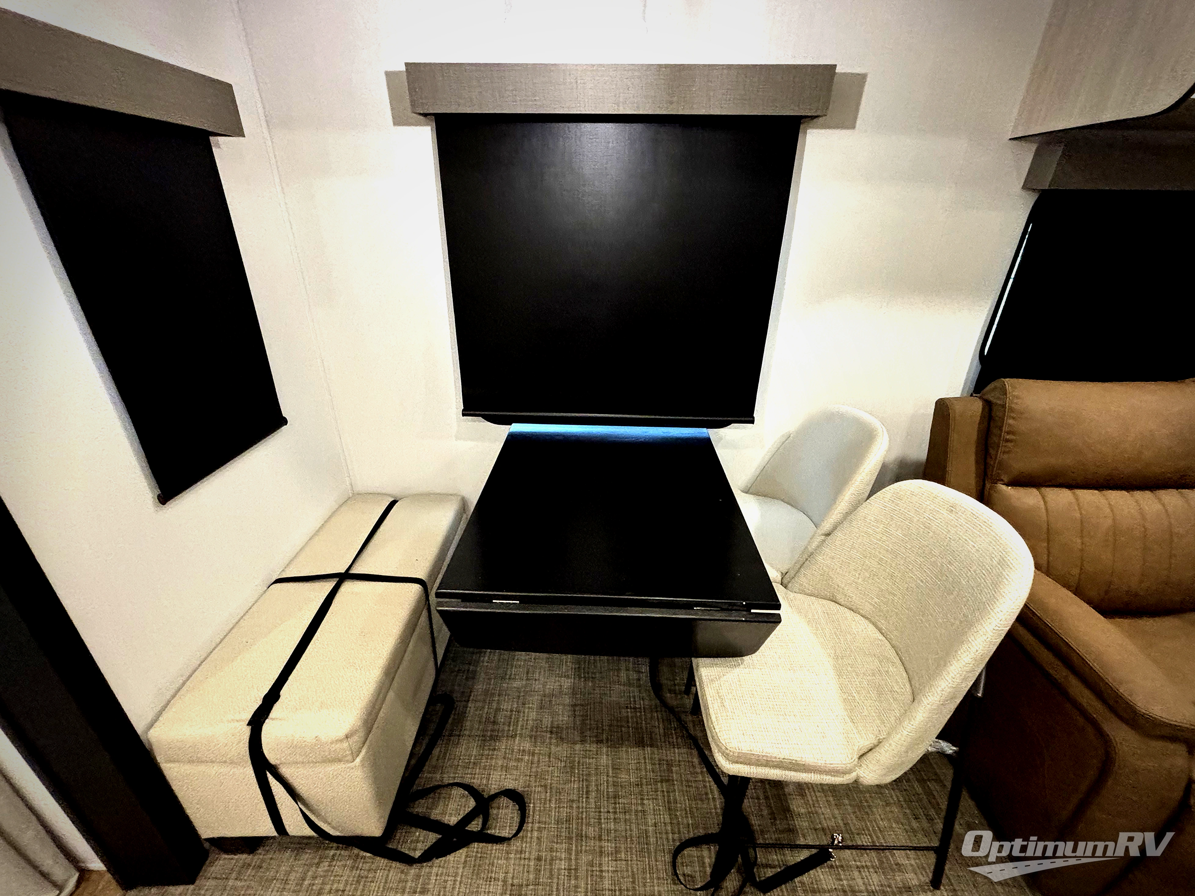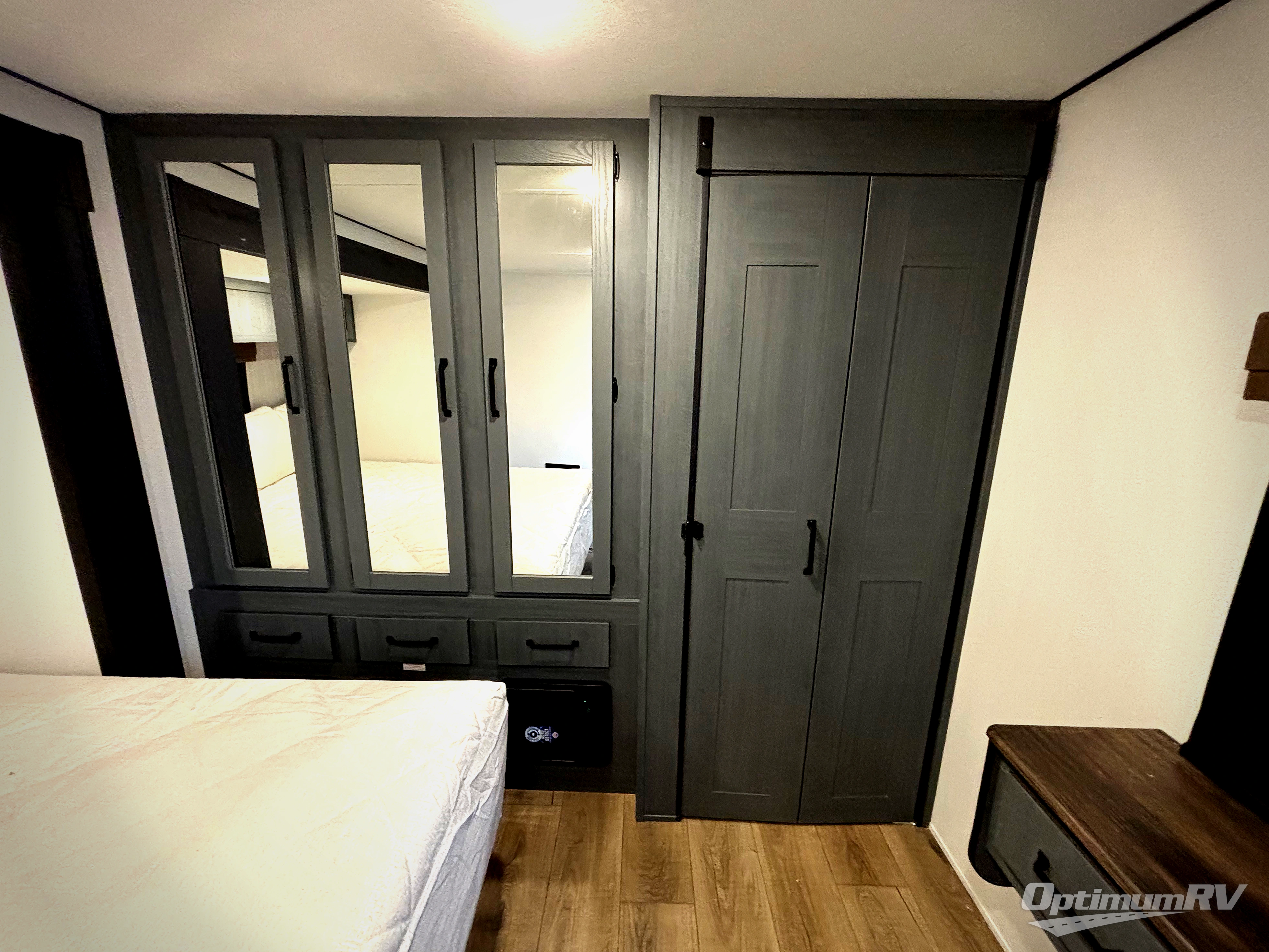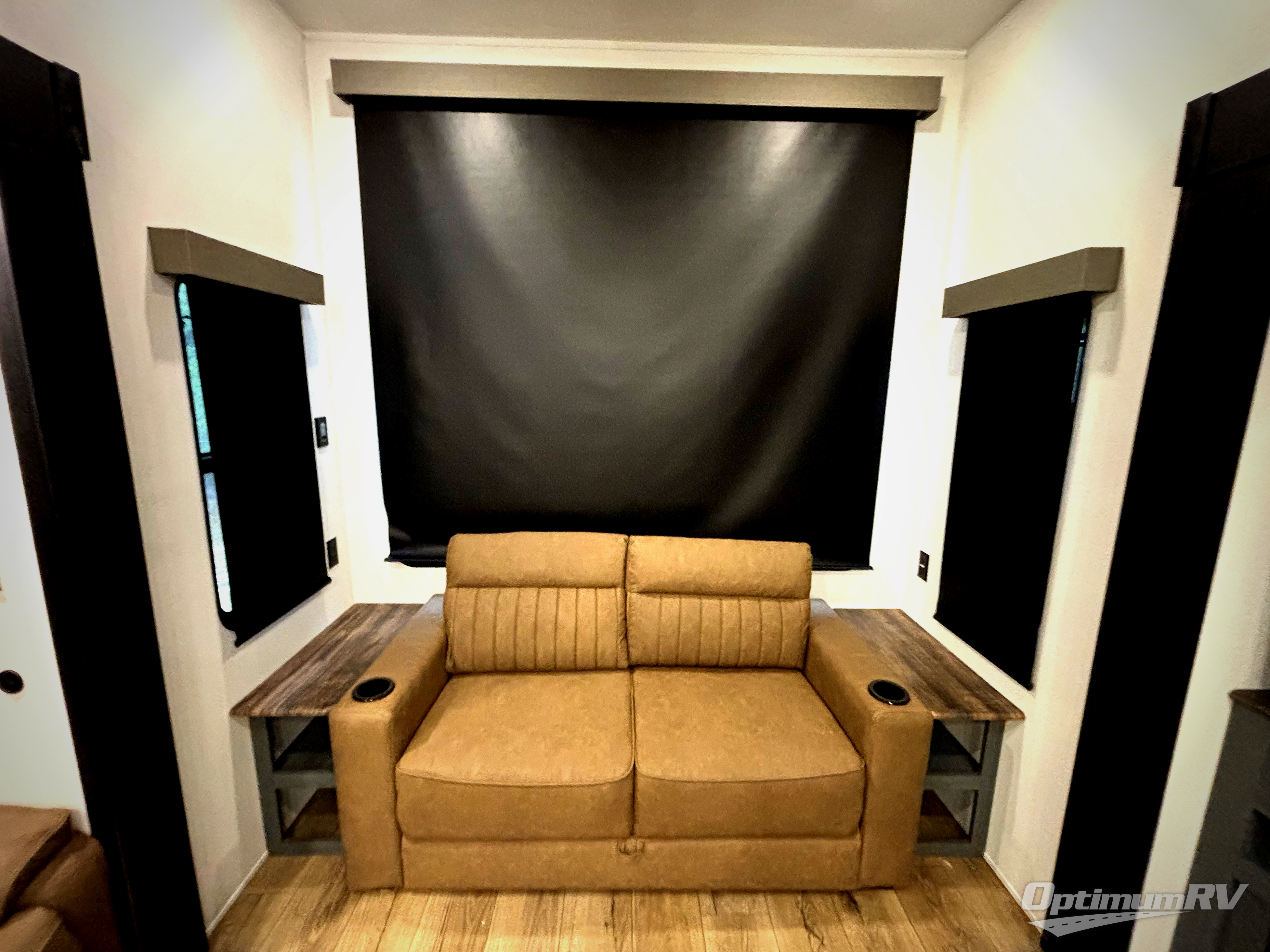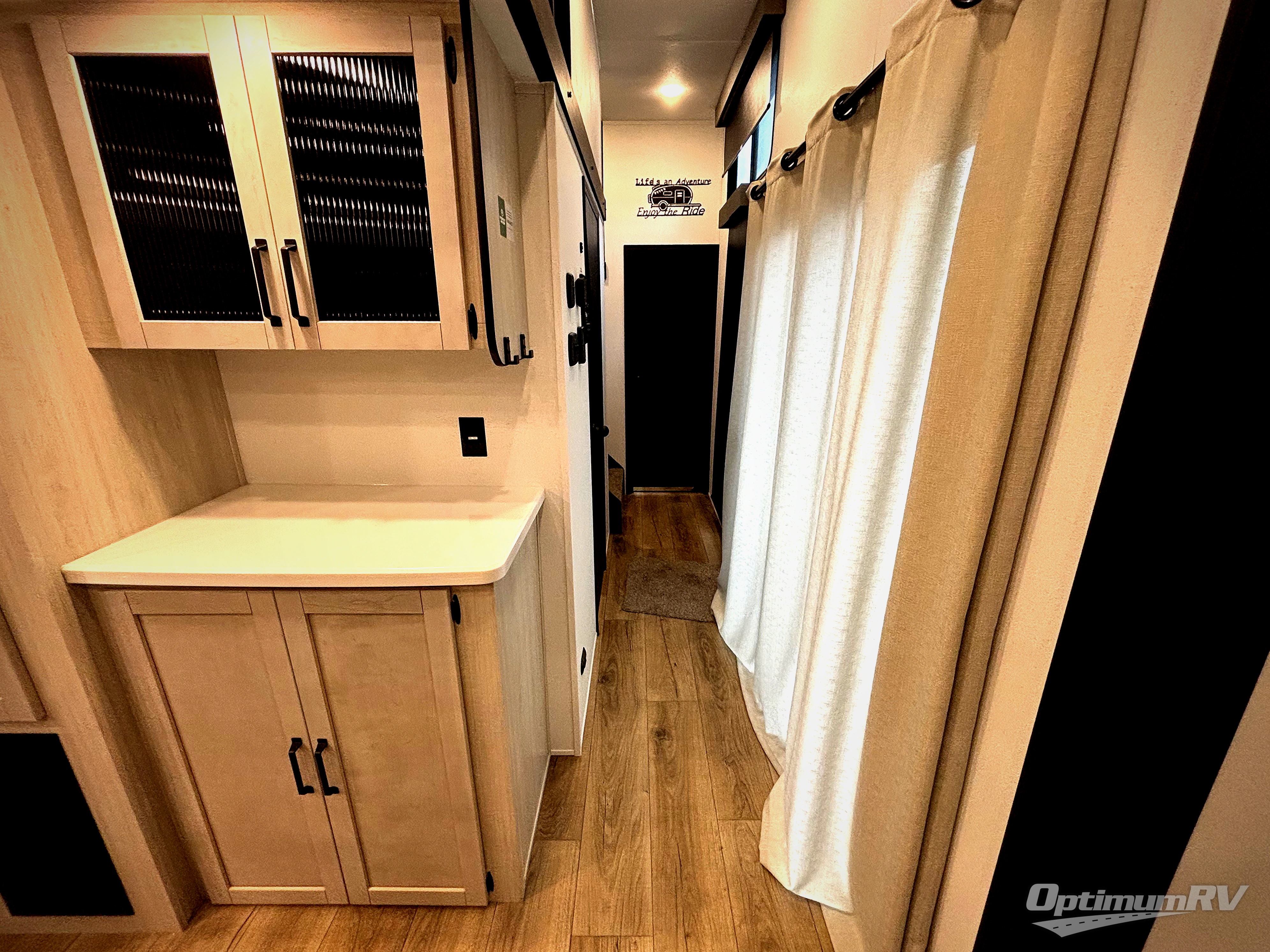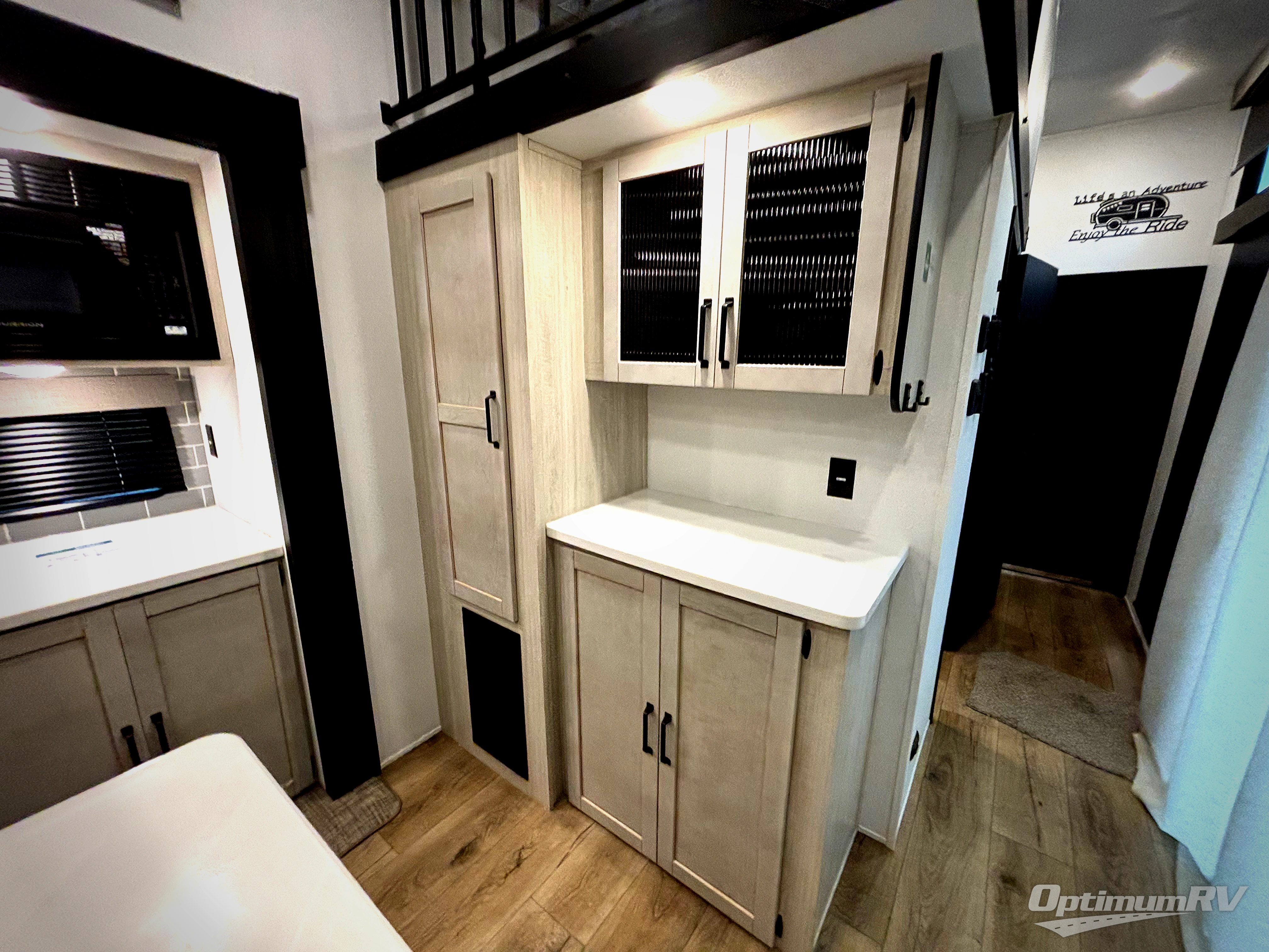 Wherever your destination may be, you can be sure to enjoy it to the fullest with this trailer in tow! With two entry doors, you can enter in through the front private bedroom or the main living area. The bedroom includes a king bed slide out, a desktop if you need to work from home, and a wardrobe/closet to keep your clothes organized. There is also a closet with the washer and dryer prep if you plan to add these appliances. Just outside this room are steps that lead to the large loft area with a 58" x 58" bunk mat and a cabinet on one side, plus two 32" x 80" bunk mats on the other. There is also a front cabinet and a wardrobe/closet for plenty of storage space. Once you've headed back downstairs, you can relax on the theater seating, rear sofa, or table and chairs with bench seating. And the chef of your group will love the kitchen with its residential style refrigerator and pantry, kitchen island, and four burner cooktop!