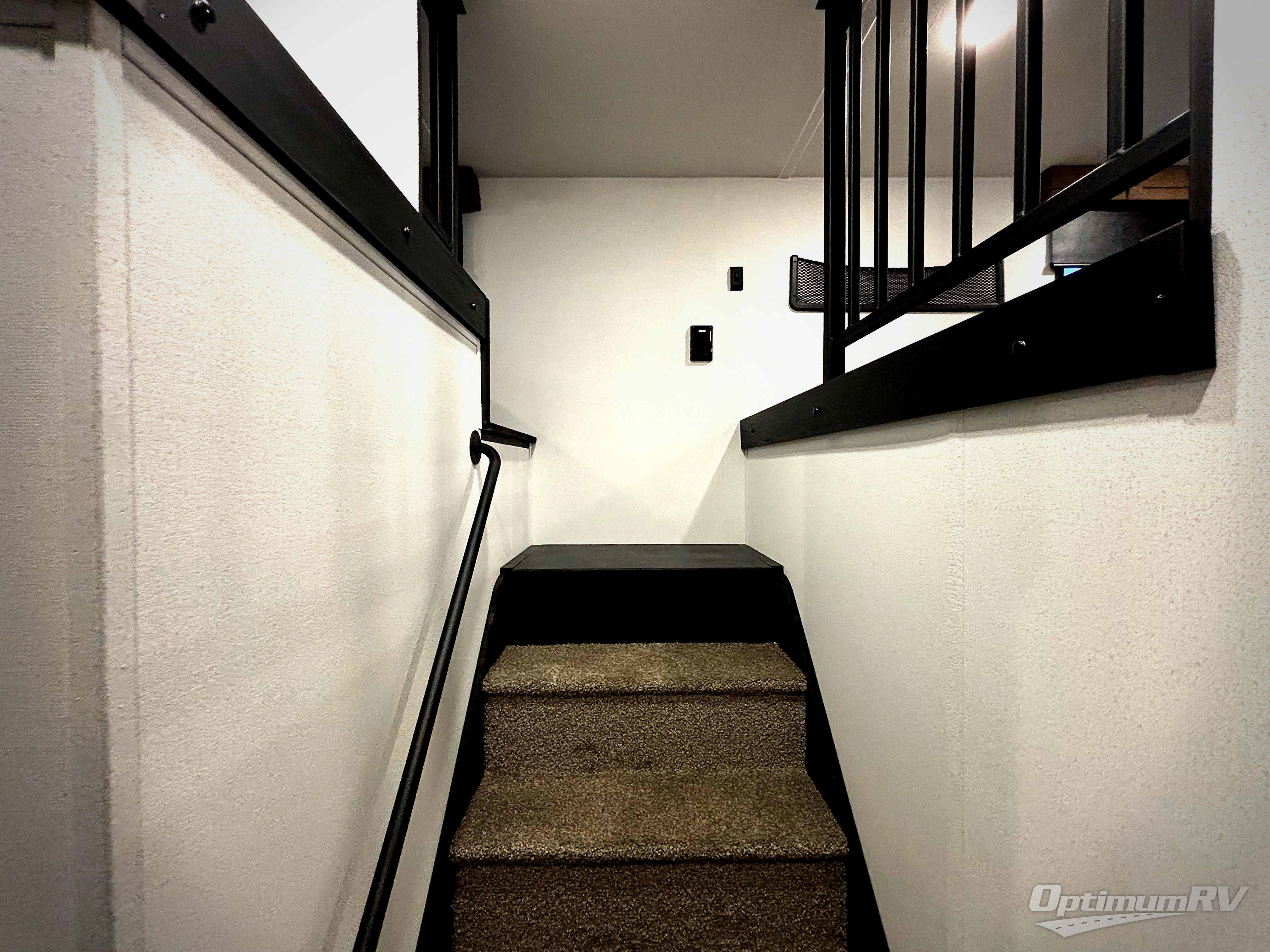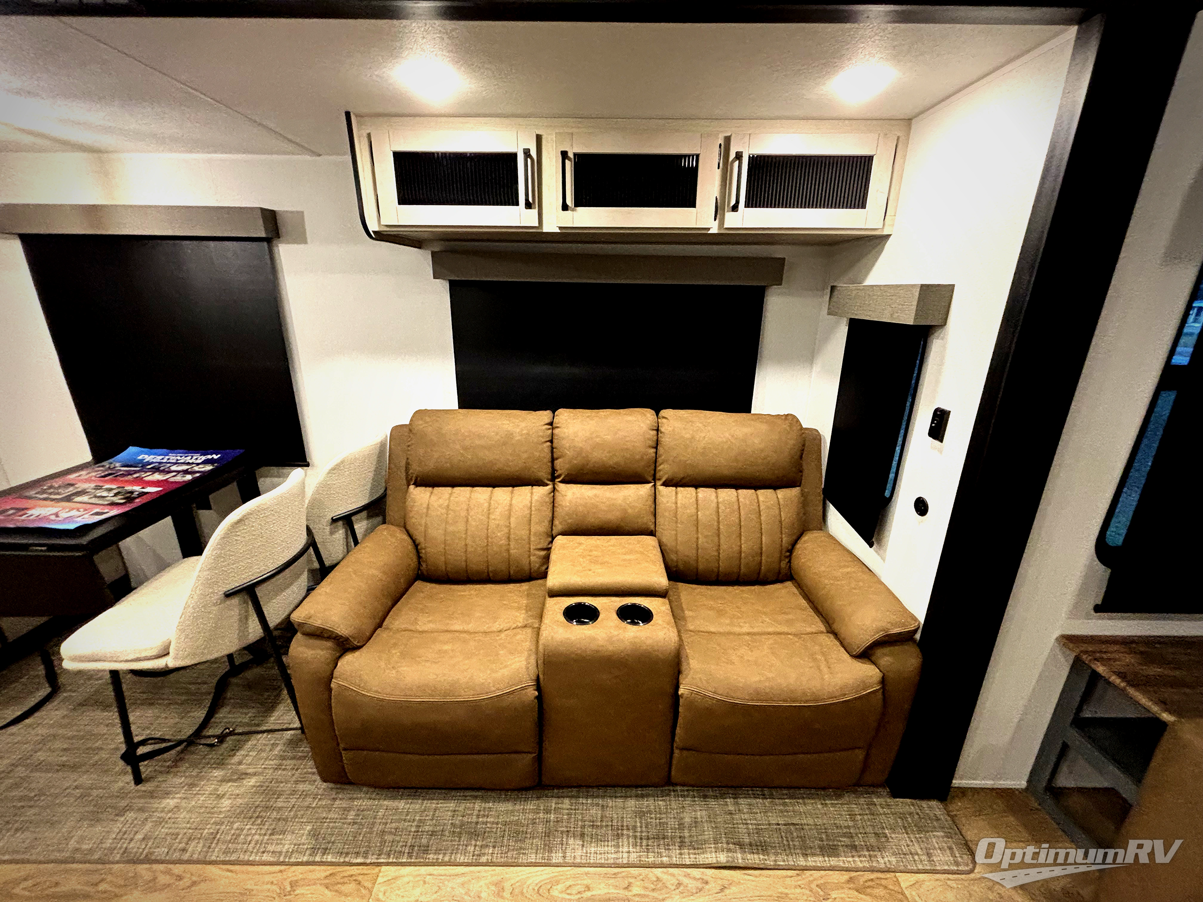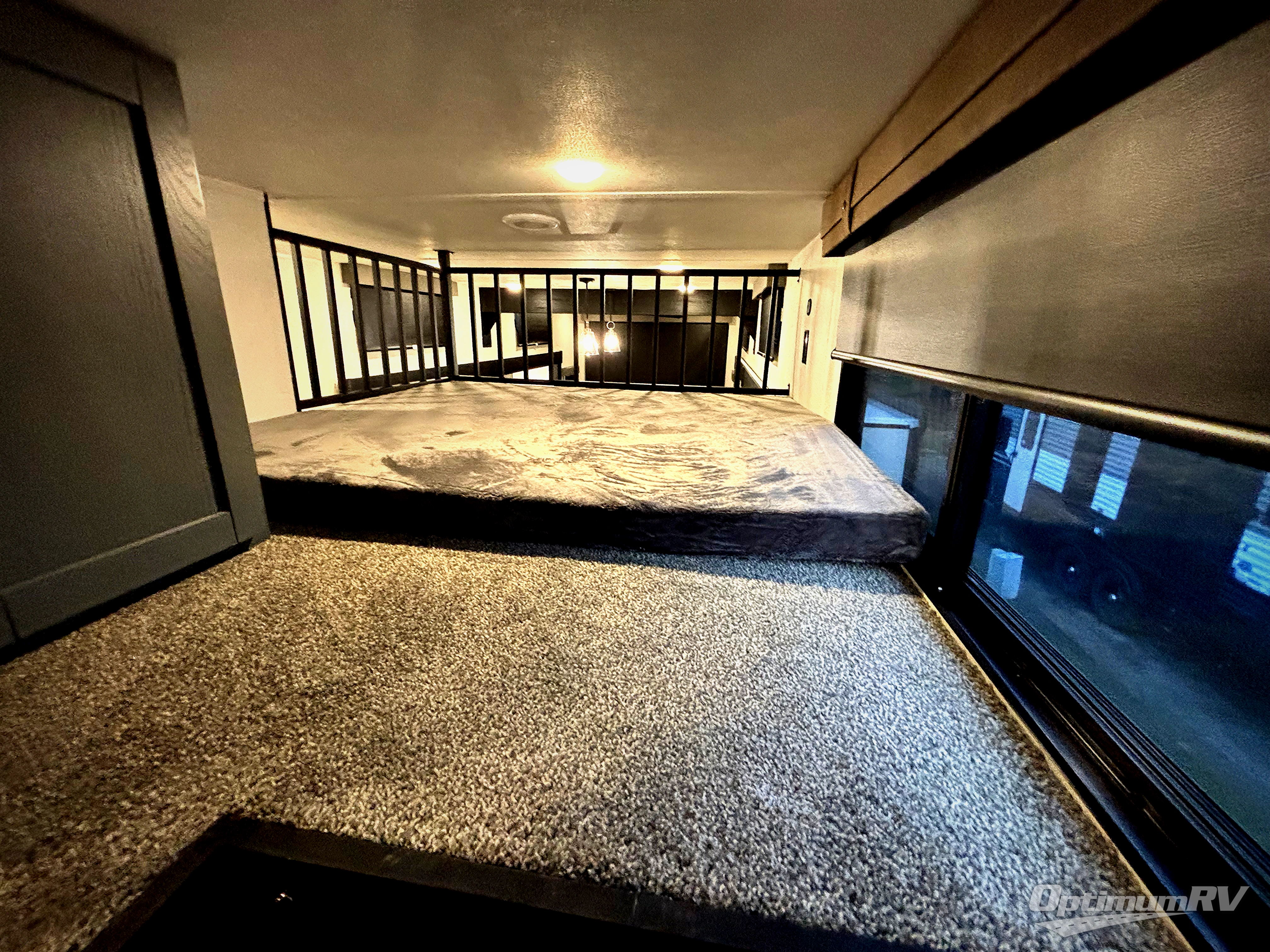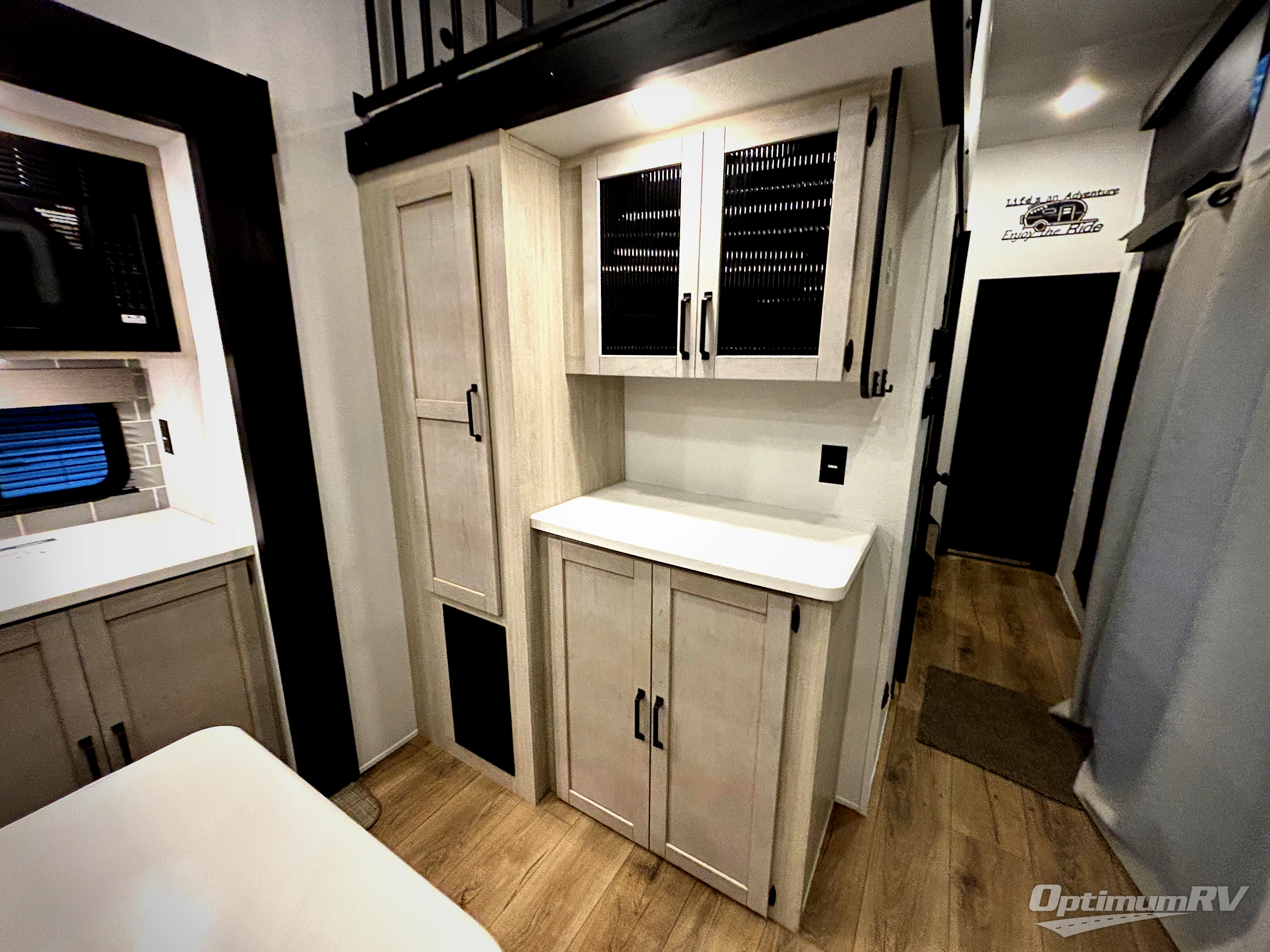 Wherever your destination may be, you can be sure to enjoy it to the fullest with this trailer in tow! With two entry doors, you can enter in through the front private bedroom or the main living area. The bedroom includes a king bed slide out, a desktop if you need to work from home, and a wardrobe/closet to keep your clothes organized. There is also a closet with the washer and dryer prep if you plan to add these appliances. Just outside this room are steps that lead to the large loft area with a 58" x 58" bunk mat and a cabinet on one side, plus two 32" x 80" bunk mats on the other. There is also a front cabinet and a wardrobe/closet for plenty of storage space. Once you've headed back downstairs, you can relax on the theater seating, rear sofa, or table and chairs with bench seating. And the chef of your group will love the kitchen with its residential style refrigerator and pantry, kitchen island, and four burner cooktop!