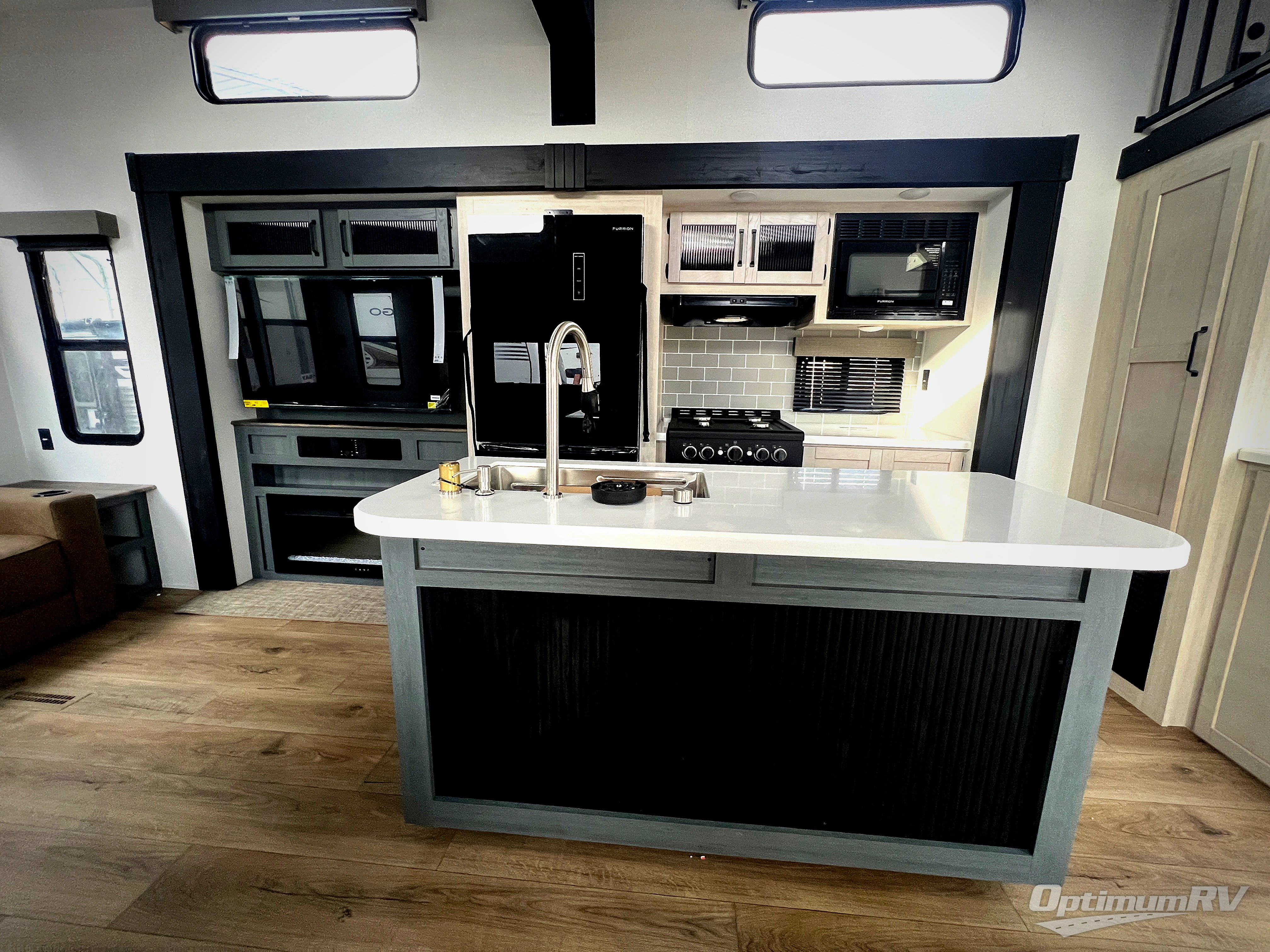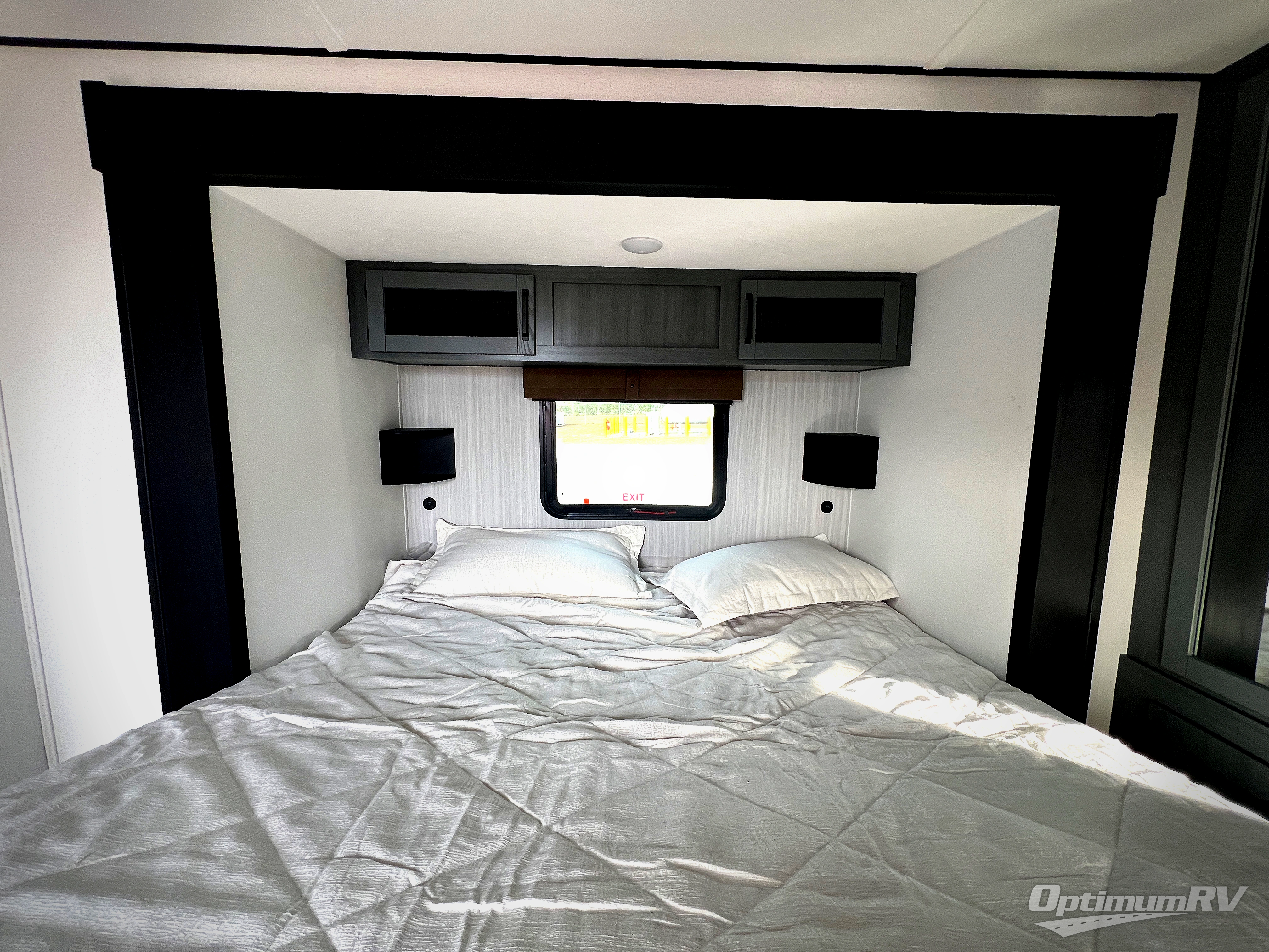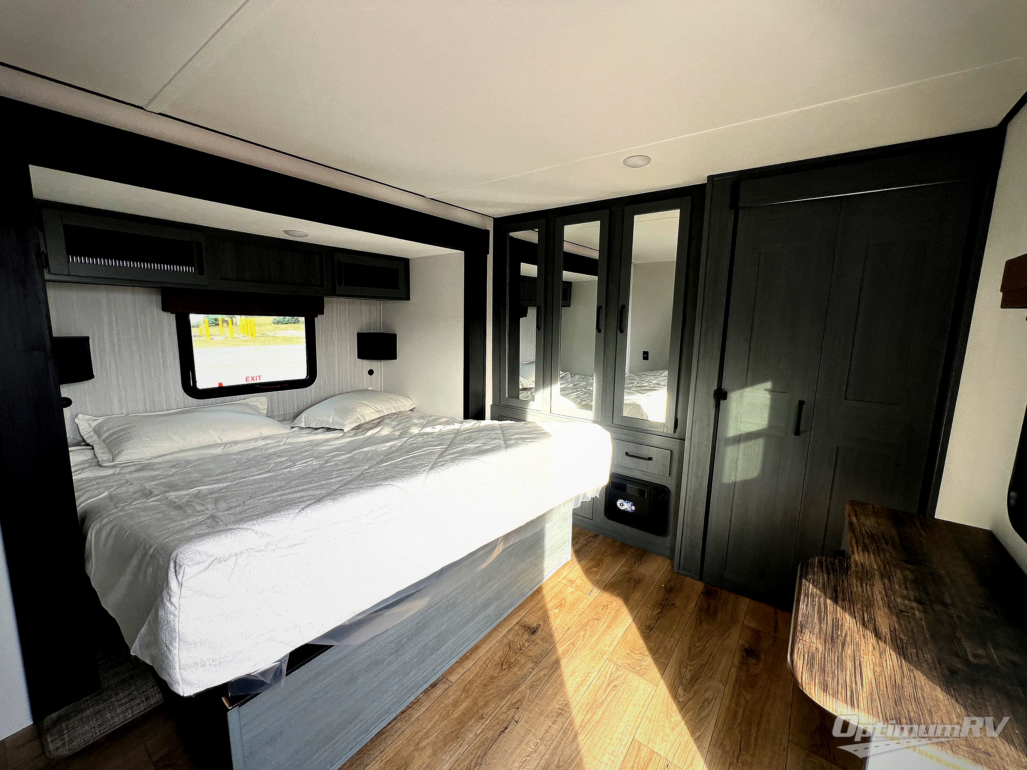 Wherever your destination may be, you can be sure to enjoy it to the fullest with this trailer in tow! With two entry doors, you can enter in through the front private bedroom or the main living area. The bedroom includes a king bed slide out, a desktop if you need to work from home, and a wardrobe/closet to keep your clothes organized. There is also a closet with the washer and dryer prep if you plan to add these appliances. Just outside this room are steps that lead to the large loft area with a 58" x 58" bunk mat and a cabinet on one side, plus two 32" x 80" bunk mats on the other. There is also a front cabinet and a wardrobe/closet for plenty of storage space. Once you've headed back downstairs, you can relax on the theater seating, rear sofa, or table and chairs with bench seating. And the chef of your group will love the kitchen with its residential style refrigerator and pantry, kitchen island, and four burner cooktop!