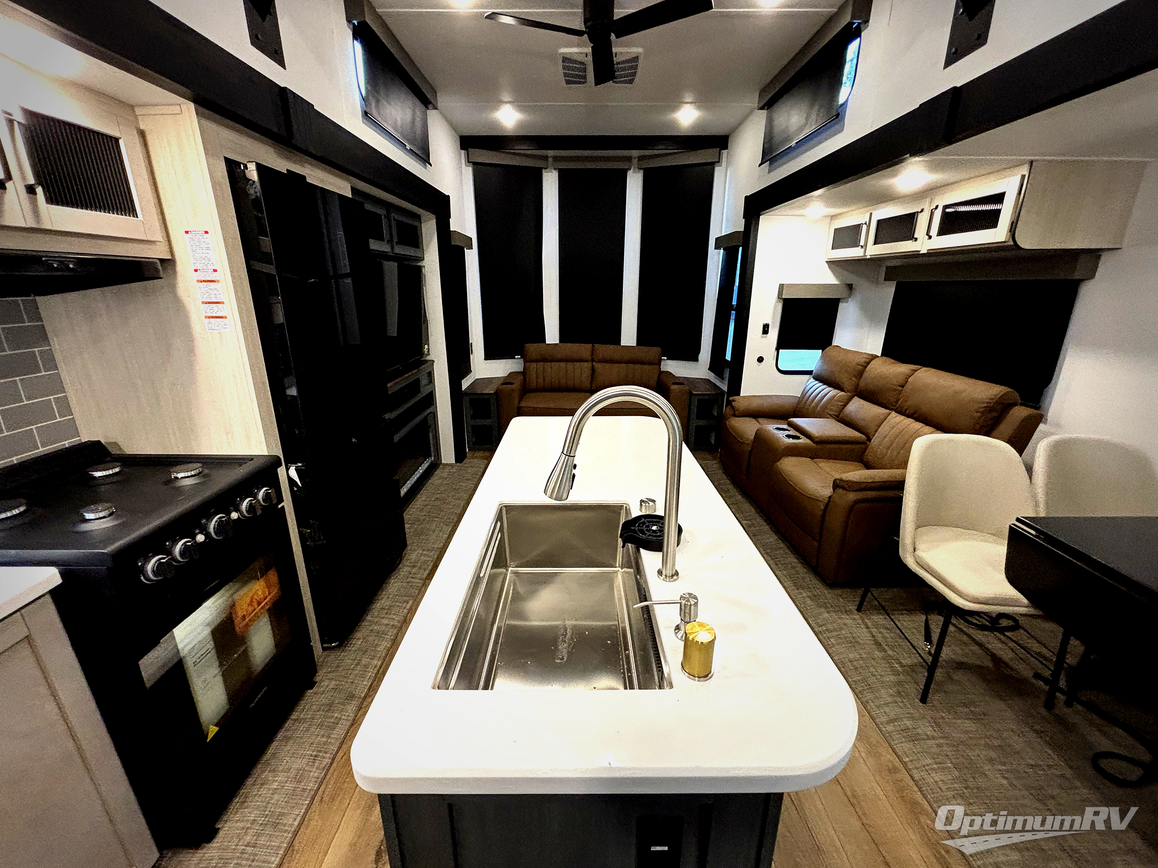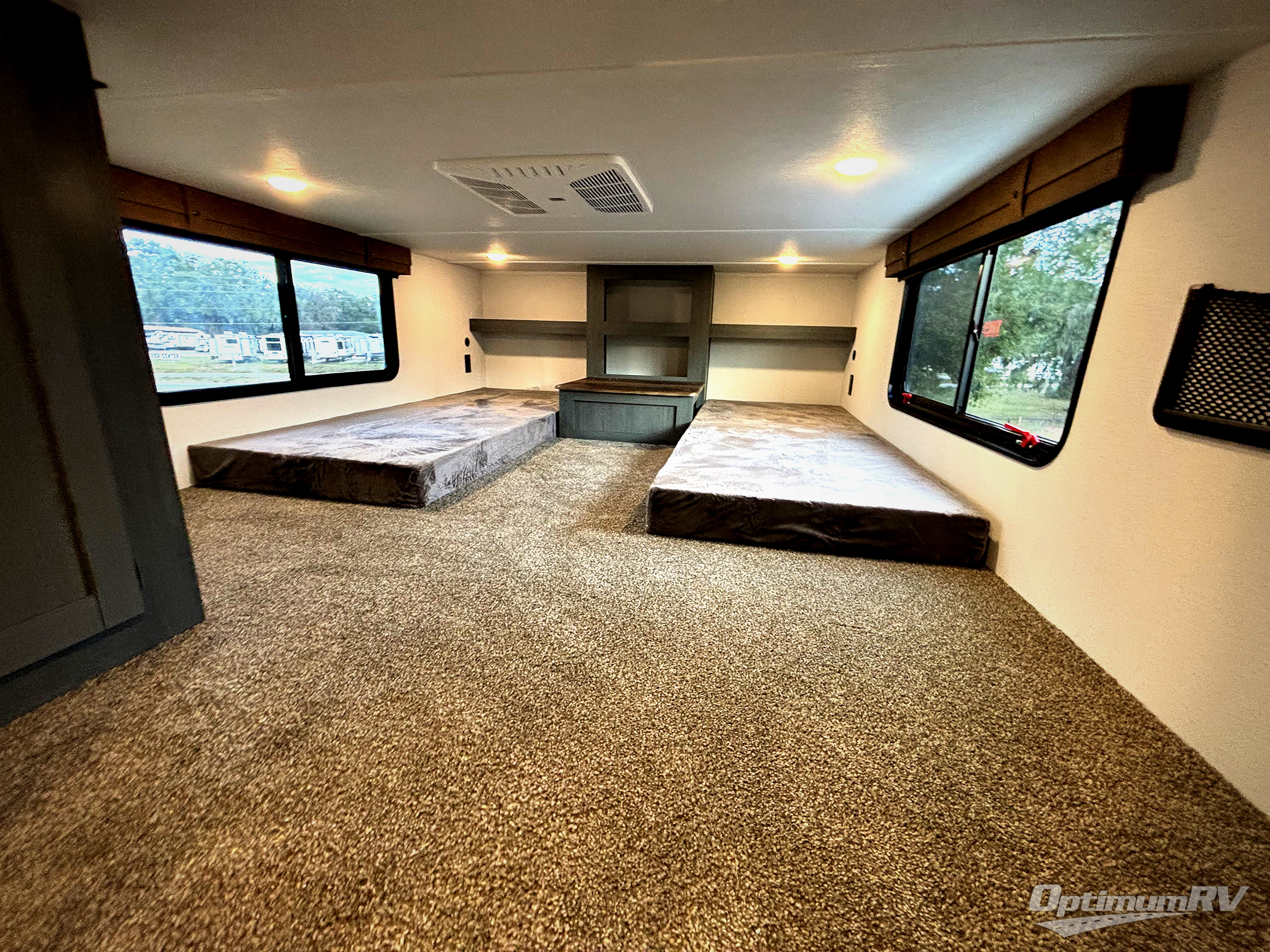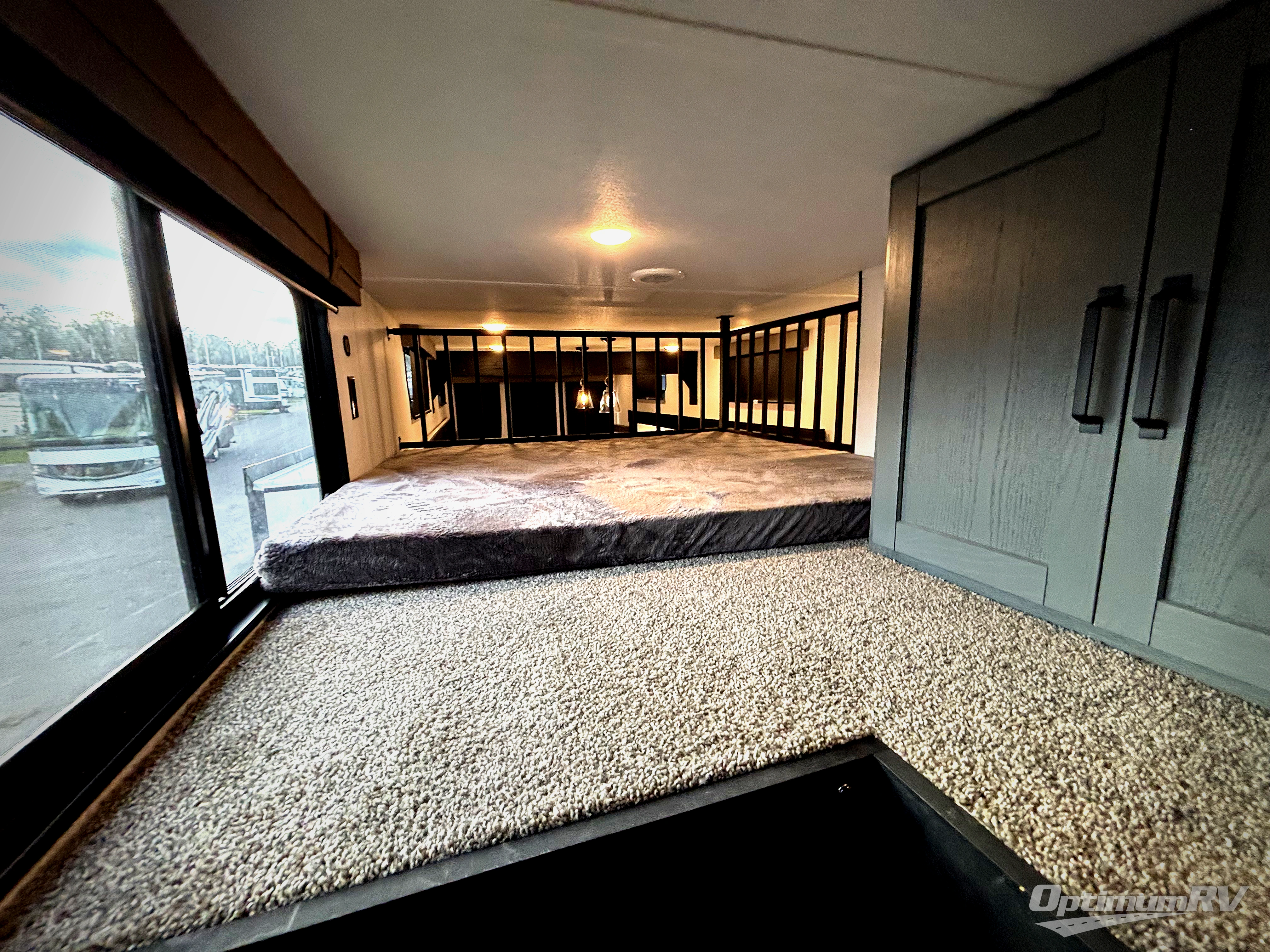 Wherever your destination may be, you can be sure to enjoy it to the fullest with this trailer in tow! With two entry doors, you can enter in through the rear private bedroom or the main living area. The bedroom includes a king bed slide out, a wardrobe/closet to keep your clothes organized, plus a closet with washer and dryer prep. Just outside this room are steps that lead to the large loft area with a 58" x 58" bunk mat and a cabinet on one side, plus two 32" x 69" bunk mats on the other. There is also a cabinet and a wardrobe/closet for plenty of storage space. Once you've headed back downstairs, you can relax on the theater seating, front sofa, or table and chairs with a bench seating. And the chef of your group will love the kitchen with its residential style refrigerator and pantry, kitchen island, and four burner cooktop!