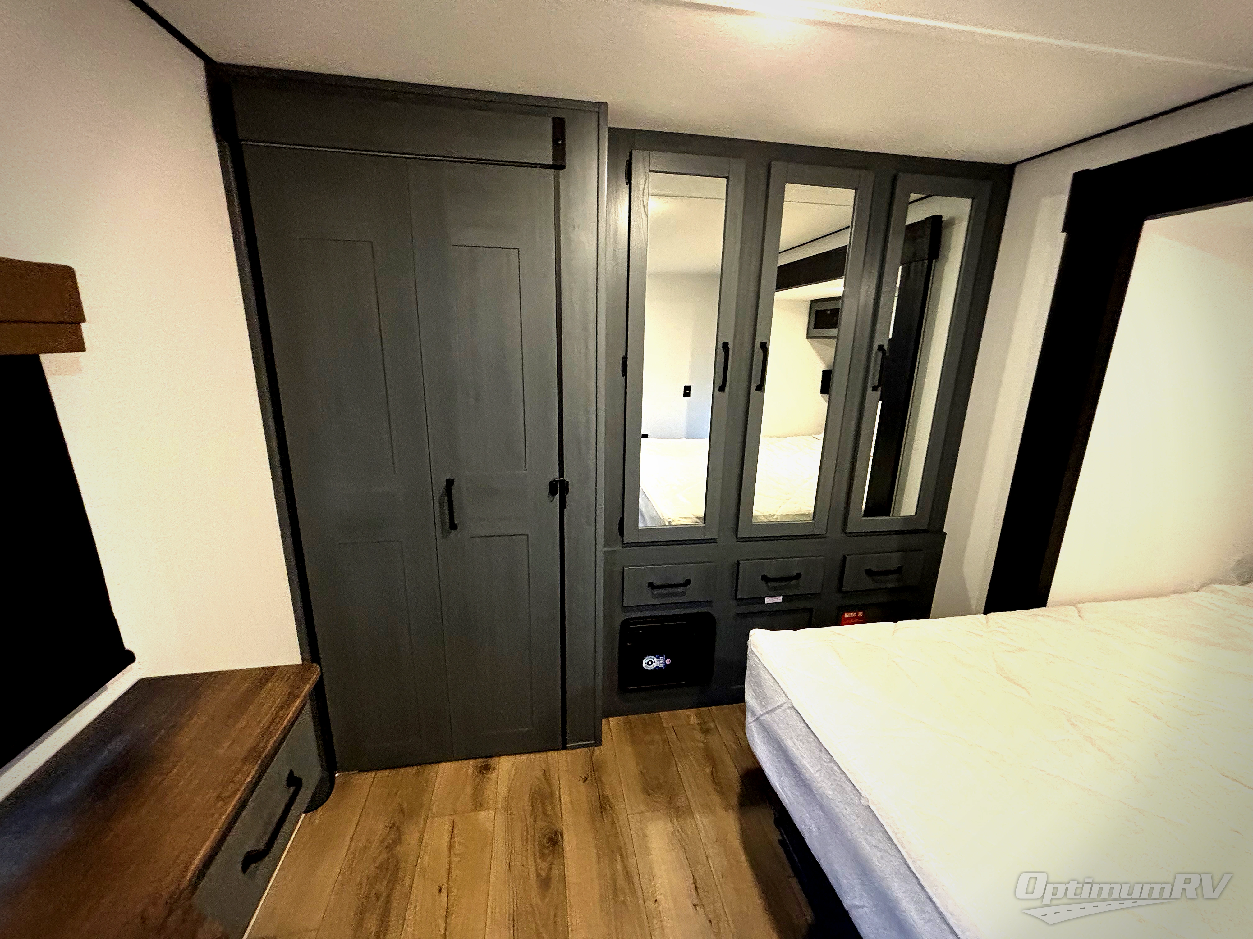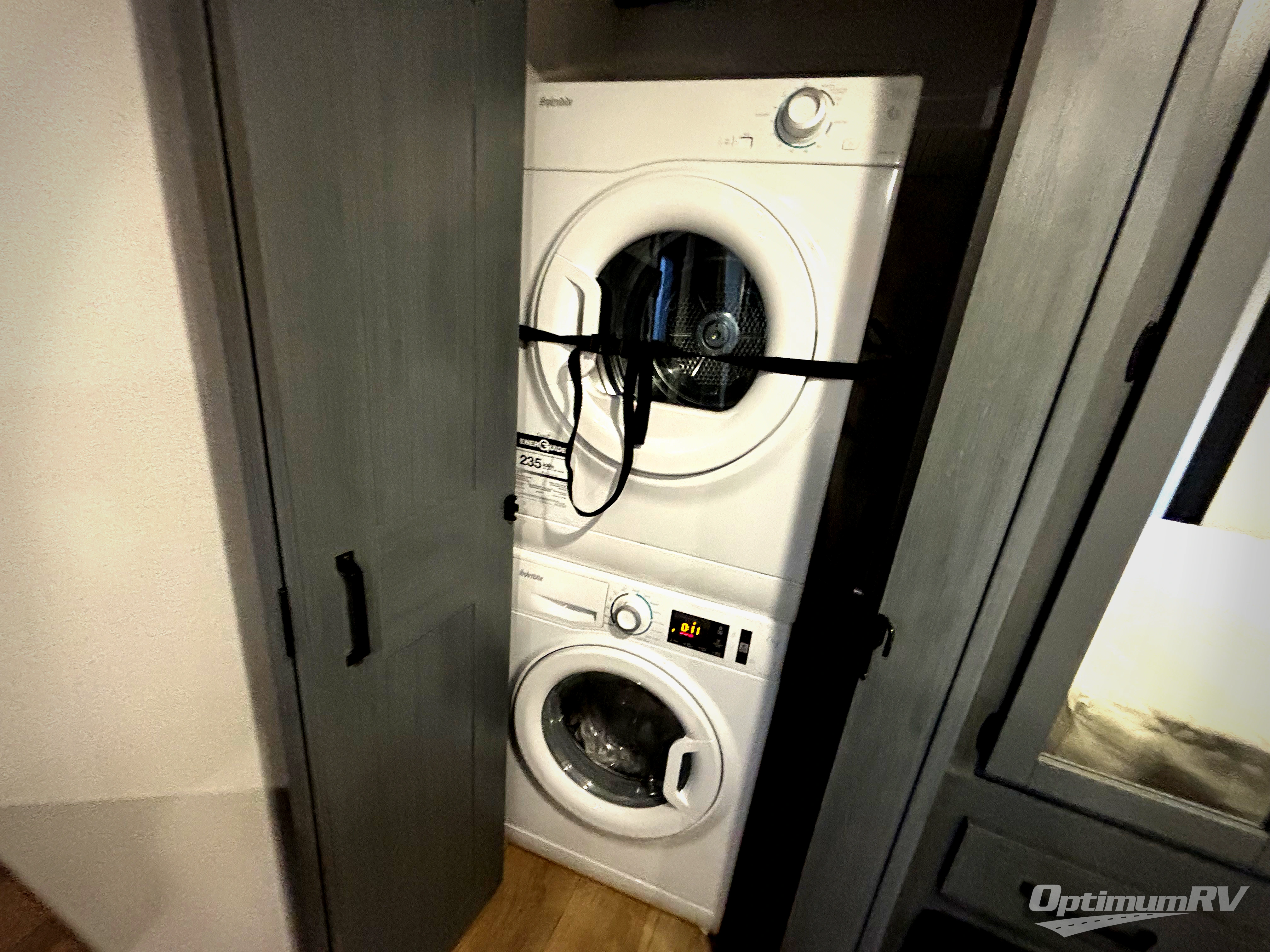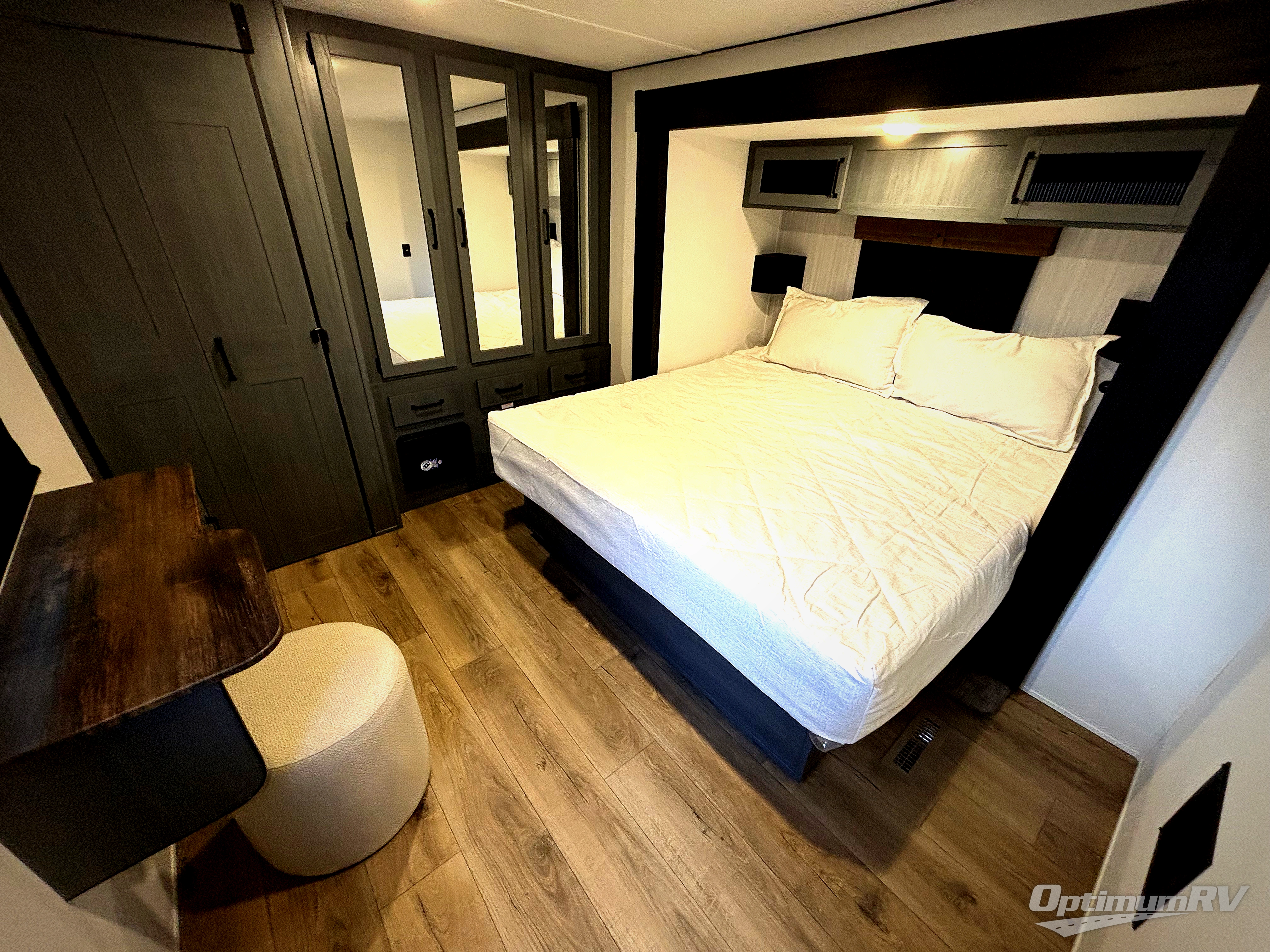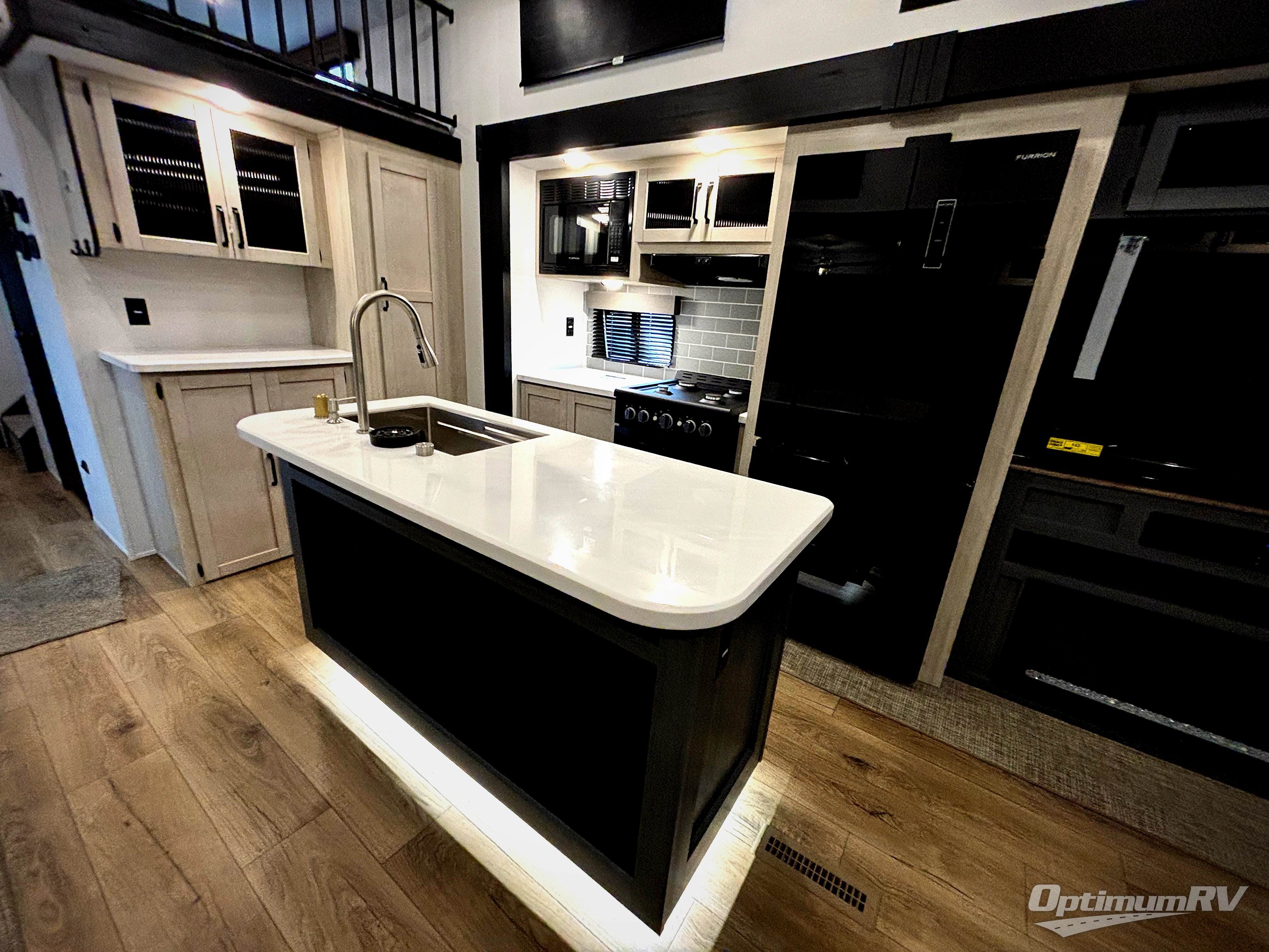 Wherever your destination may be, you can be sure to enjoy it to the fullest with this trailer in tow! With two entry doors, you can enter in through the rear private bedroom or the main living area. The bedroom includes a king bed slide out, a wardrobe/closet to keep your clothes organized, plus a closet with washer and dryer prep. Just outside this room are steps that lead to the large loft area with a 58" x 58" bunk mat and a cabinet on one side, plus two 32" x 69" bunk mats on the other. There is also a cabinet and a wardrobe/closet for plenty of storage space. Once you've headed back downstairs, you can relax on the theater seating, front sofa, or table and chairs with a bench seating. And the chef of your group will love the kitchen with its residential style refrigerator and pantry, kitchen island, and four burner cooktop!