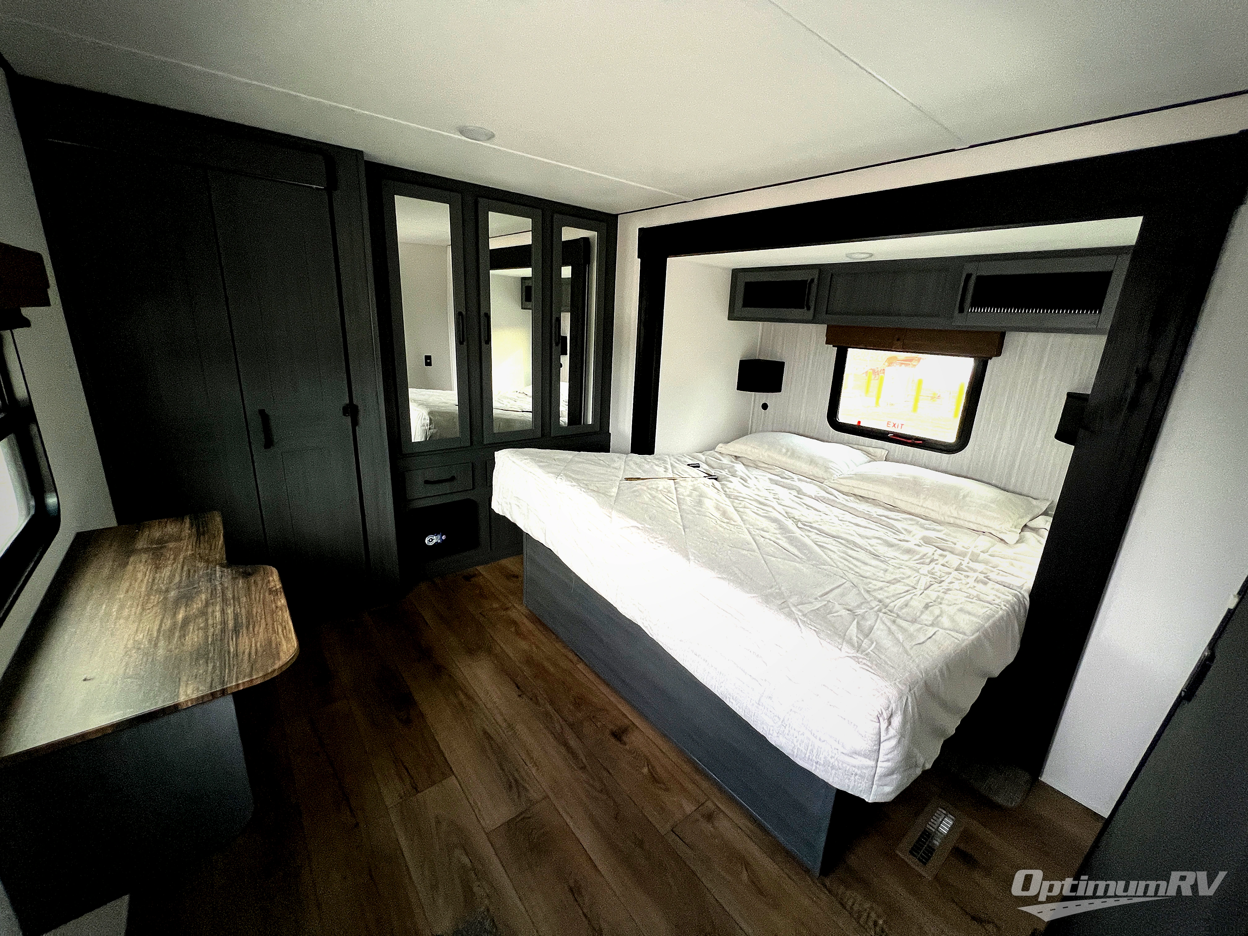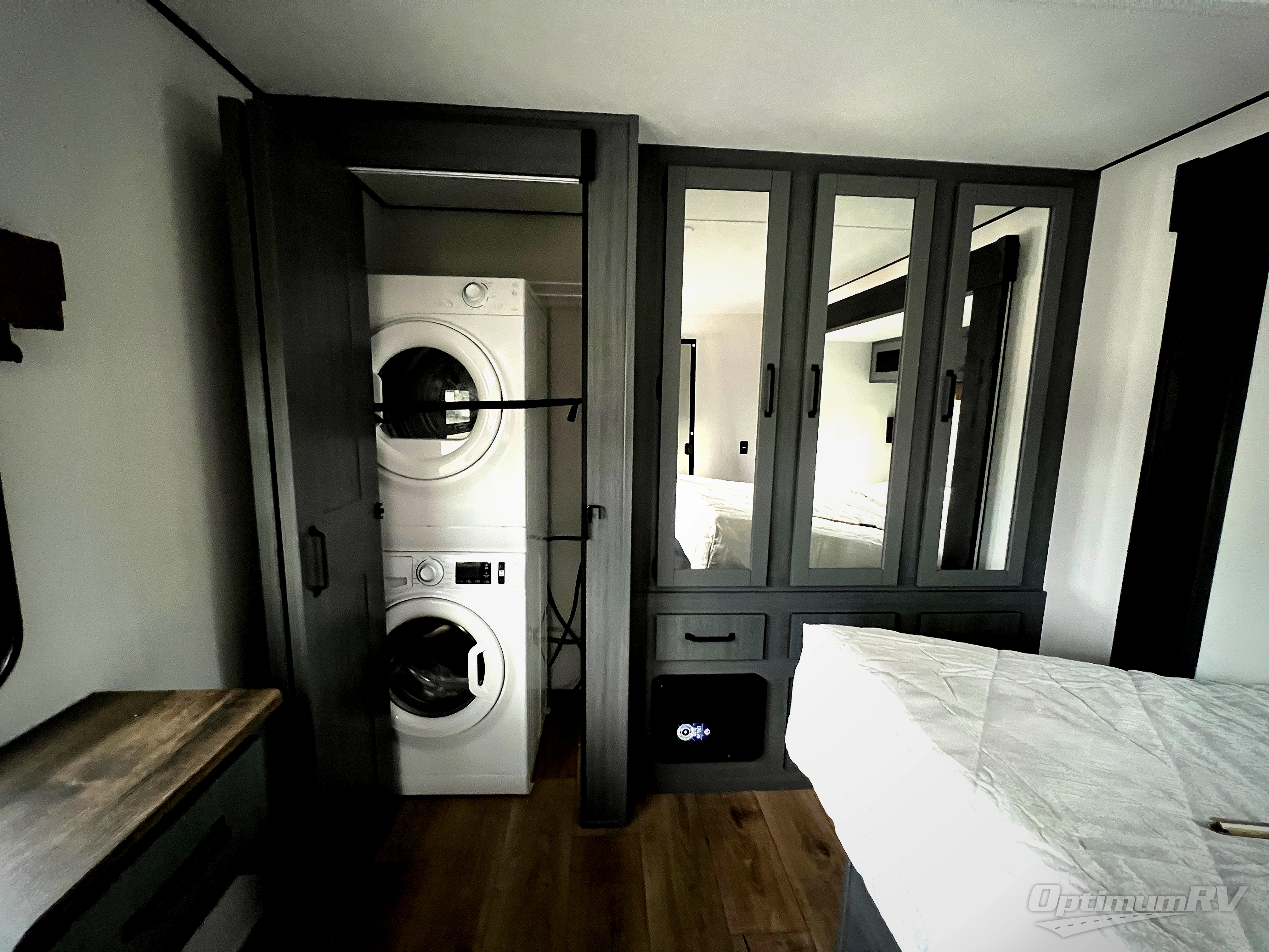 Wherever your destination may be, you can be sure to enjoy it to the fullest with this trailer in tow! With two entry doors, you can enter in through the rear private bedroom or the main living area. The bedroom includes a king bed slide out, a wardrobe/closet to keep your clothes organized, plus a closet with washer and dryer prep. Just outside this room are steps that lead to the large loft area with a 58" x 58" bunk mat and a cabinet on one side, plus two 32" x 69" bunk mats on the other. There is also a cabinet and a wardrobe/closet for plenty of storage space. Once you've headed back downstairs, you can relax on the theater seating, front sofa, or table and chairs with a bench seating. And the chef of your group will love the kitchen with its residential style refrigerator and pantry, kitchen island, and four burner cooktop!