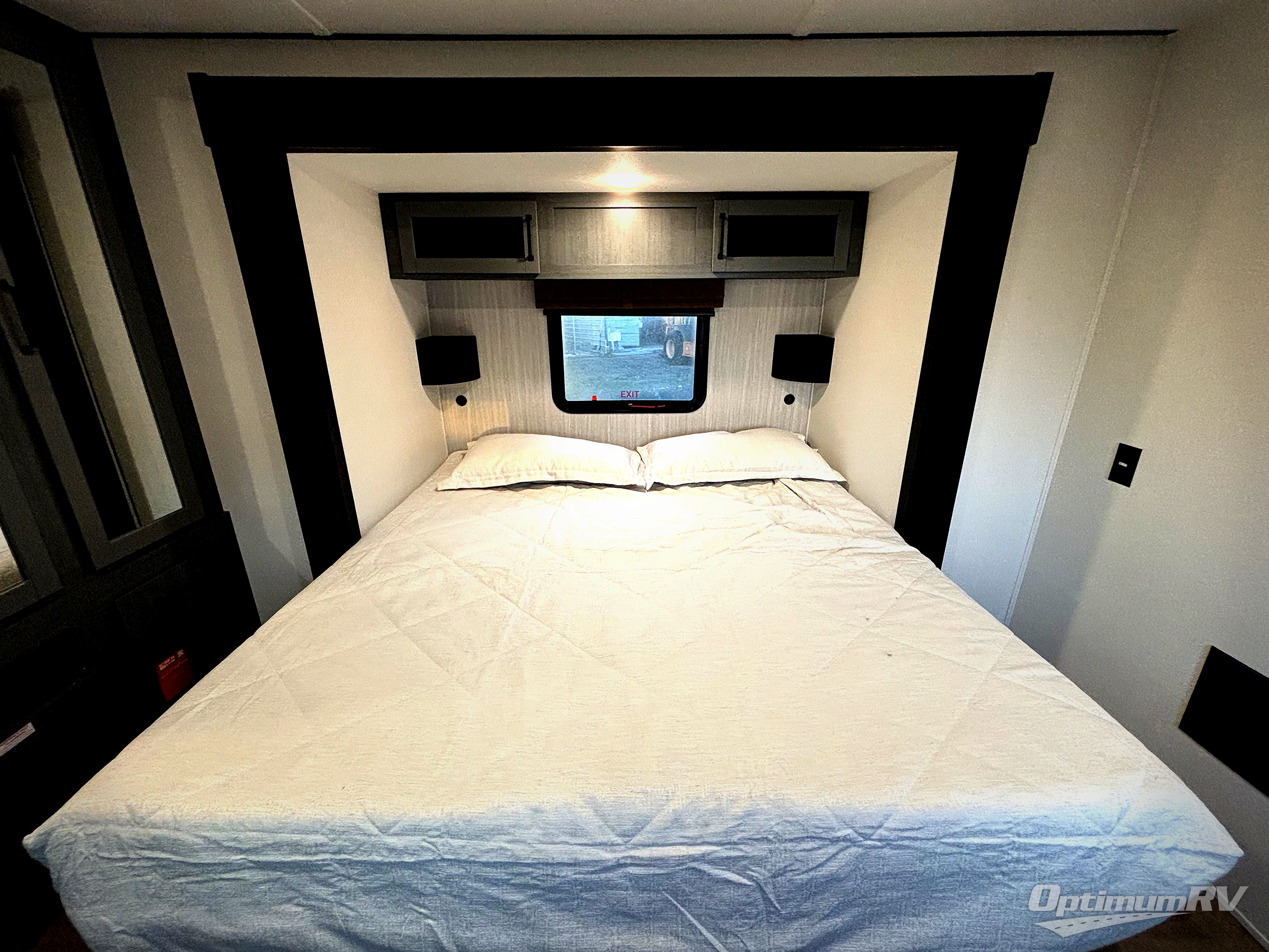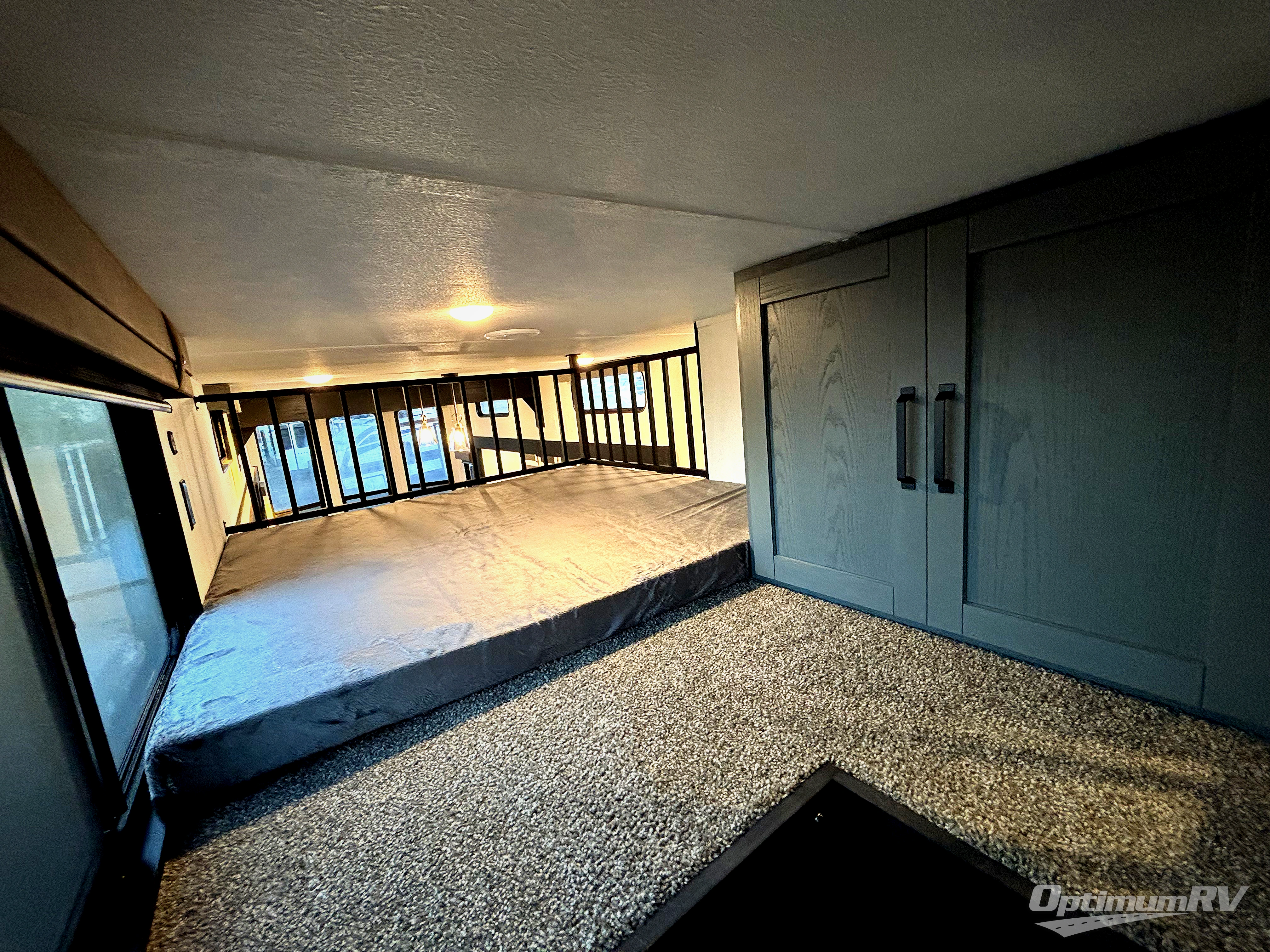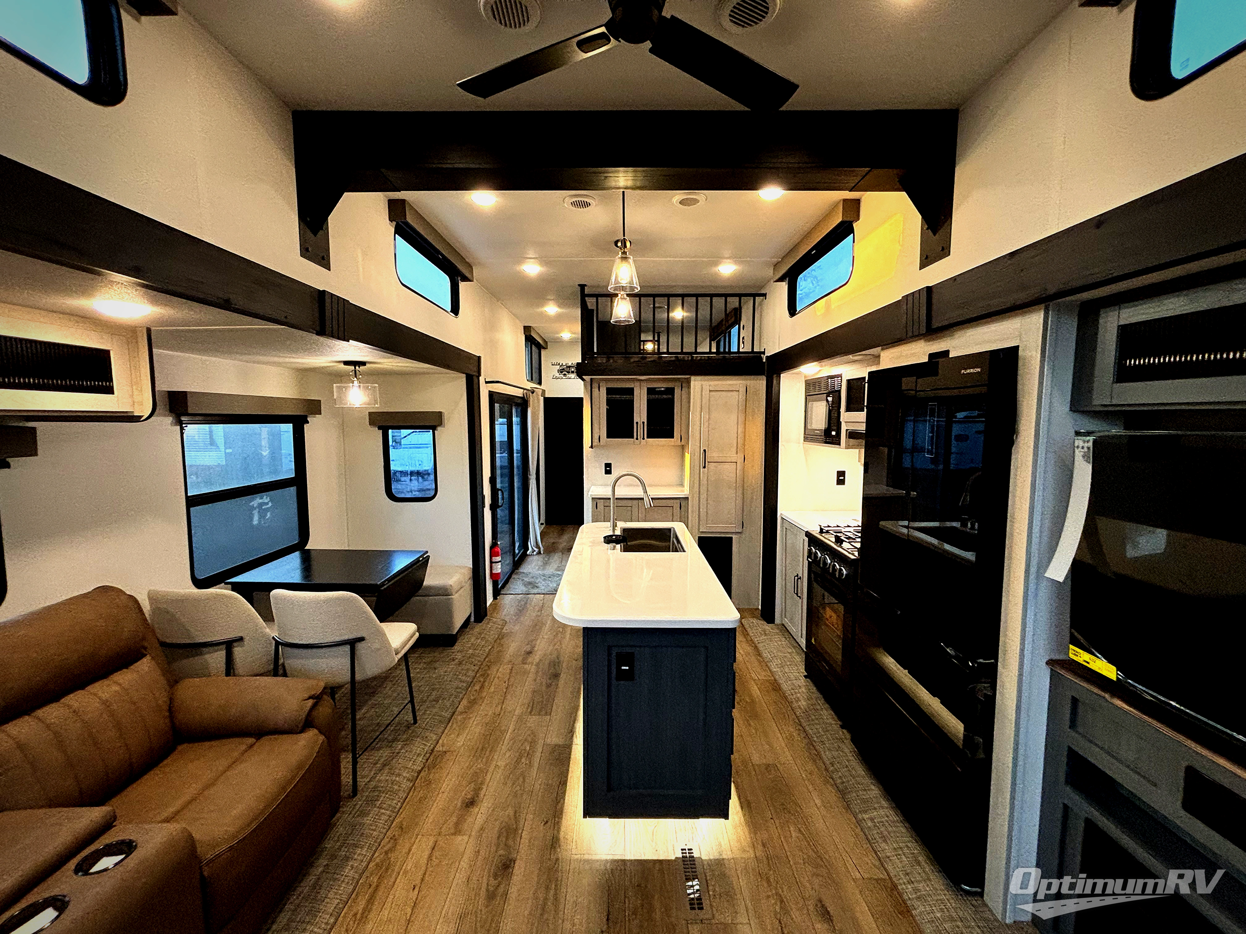 Wherever your destination may be, you can be sure to enjoy it to the fullest with this trailer in tow! With two entry doors, you can enter in through the rear private bedroom or the main living area. The bedroom includes a king bed slide out, a wardrobe/closet to keep your clothes organized, plus a closet with washer and dryer prep. Just outside this room are steps that lead to the large loft area with a 58" x 58" bunk mat and a cabinet on one side, plus two 32" x 69" bunk mats on the other. There is also a cabinet and a wardrobe/closet for plenty of storage space. Once you've headed back downstairs, you can relax on the theater seating, front sofa, or table and chairs with a bench seating. And the chef of your group will love the kitchen with its residential style refrigerator and pantry, kitchen island, and four burner cooktop!