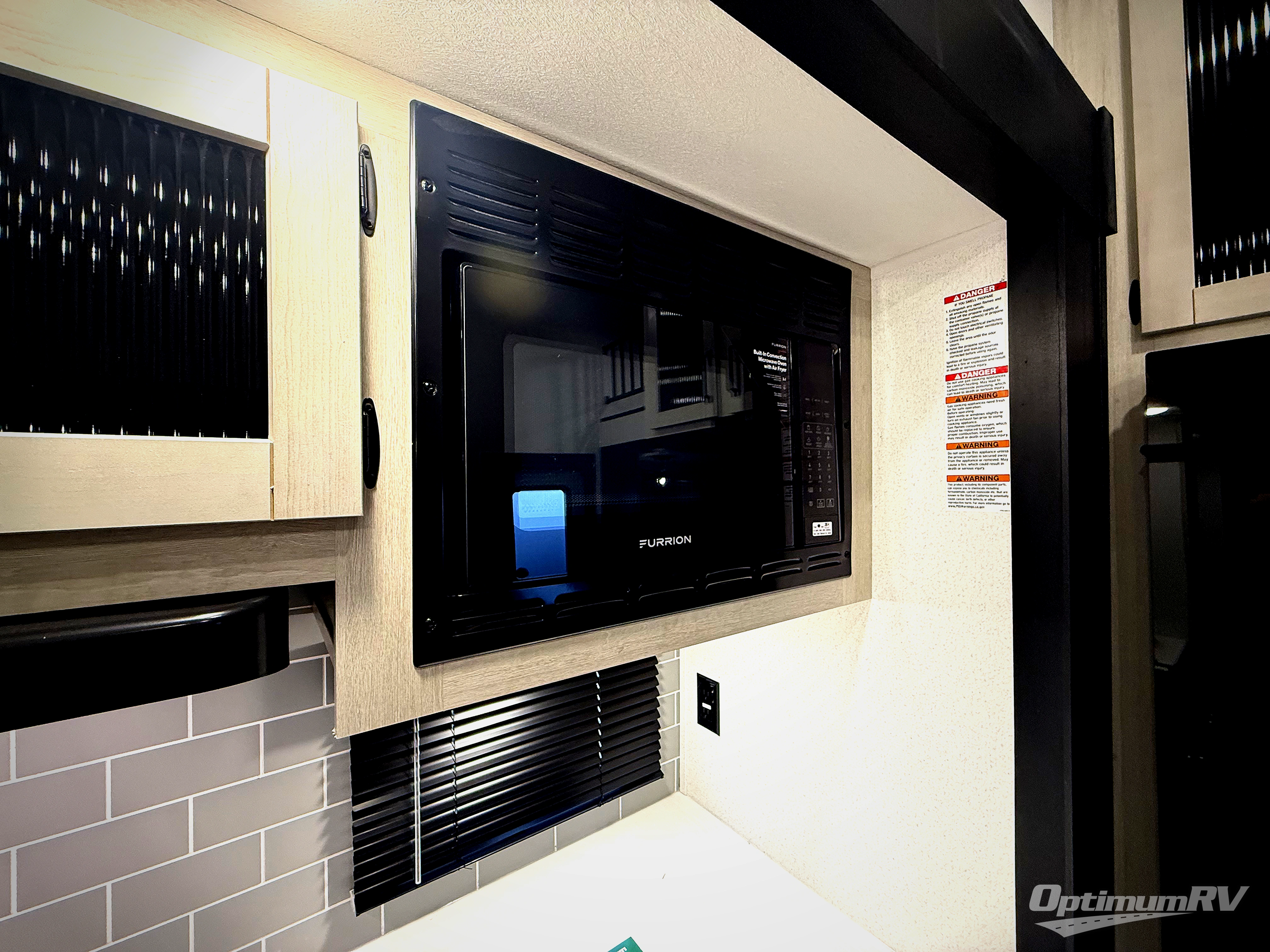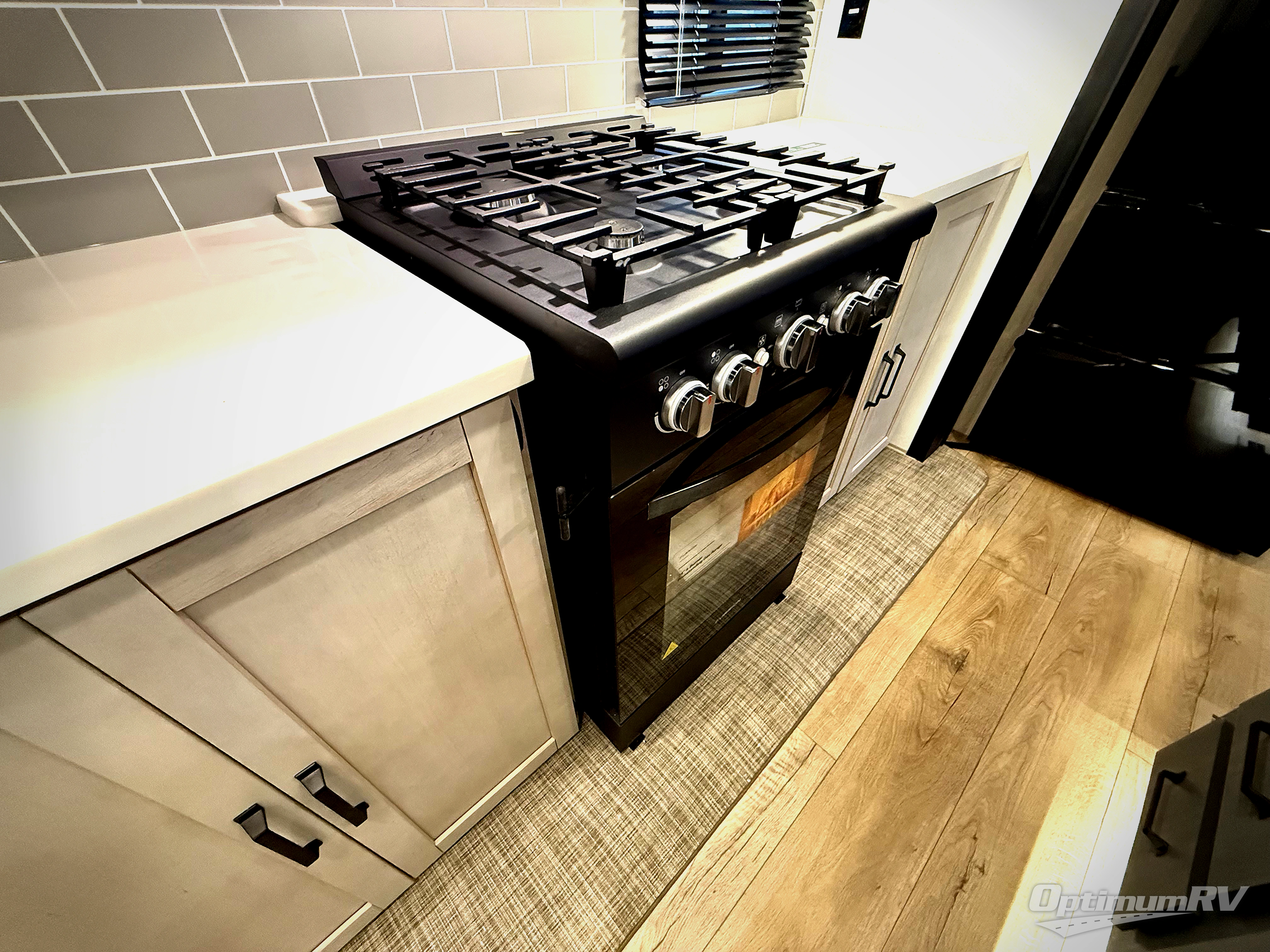 Head to your favorite spots with this destination trailer! With two entry doors, you can easily enter or exit the unit. The front private bedroom includes a king bed slide out, a wardrobe and dresser to keep your clothes organized, plus a countertop for your books or jewelry. Just outside this room is the ladder that leads to the large loft area with two 32" x 80" bunk mats, a cubby, a counter, a nightstand, and cabinets. Once you've headed back downstairs, you can relax on the L-shaped sofa across from the entertainment center with a fireplace and slide-out cabinet or the table and chairs with bench seating. And the chef of your group will love the kitchen with its residential style refrigerator and pantry, kitchen island, and four burner cooktop. The full rear bathroom not only has a 32" x 40" shower with a seat to freshen up in, and a closet with washer/dryer prep, but is also below the second loft with a 32" x 80" bunk mat and closet for storage!