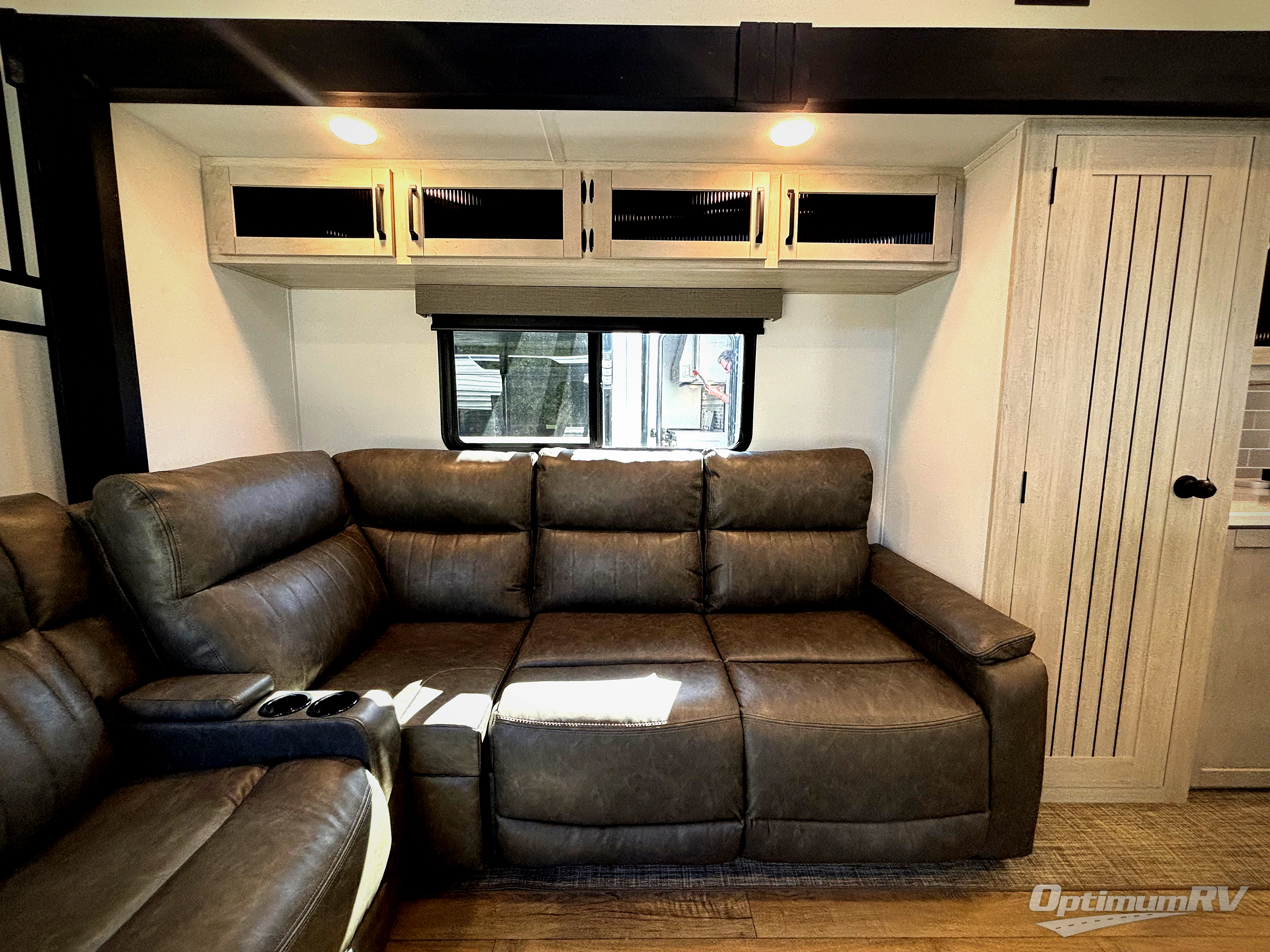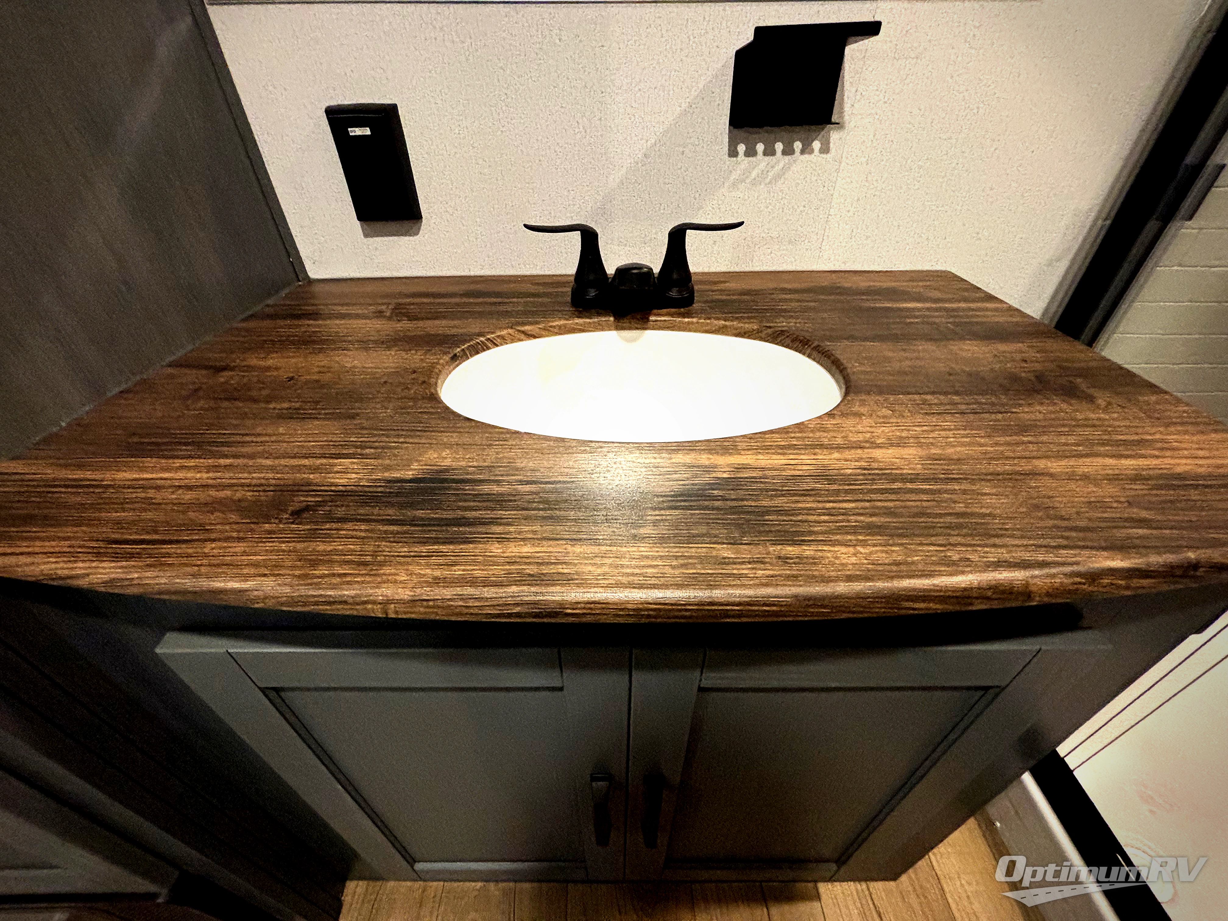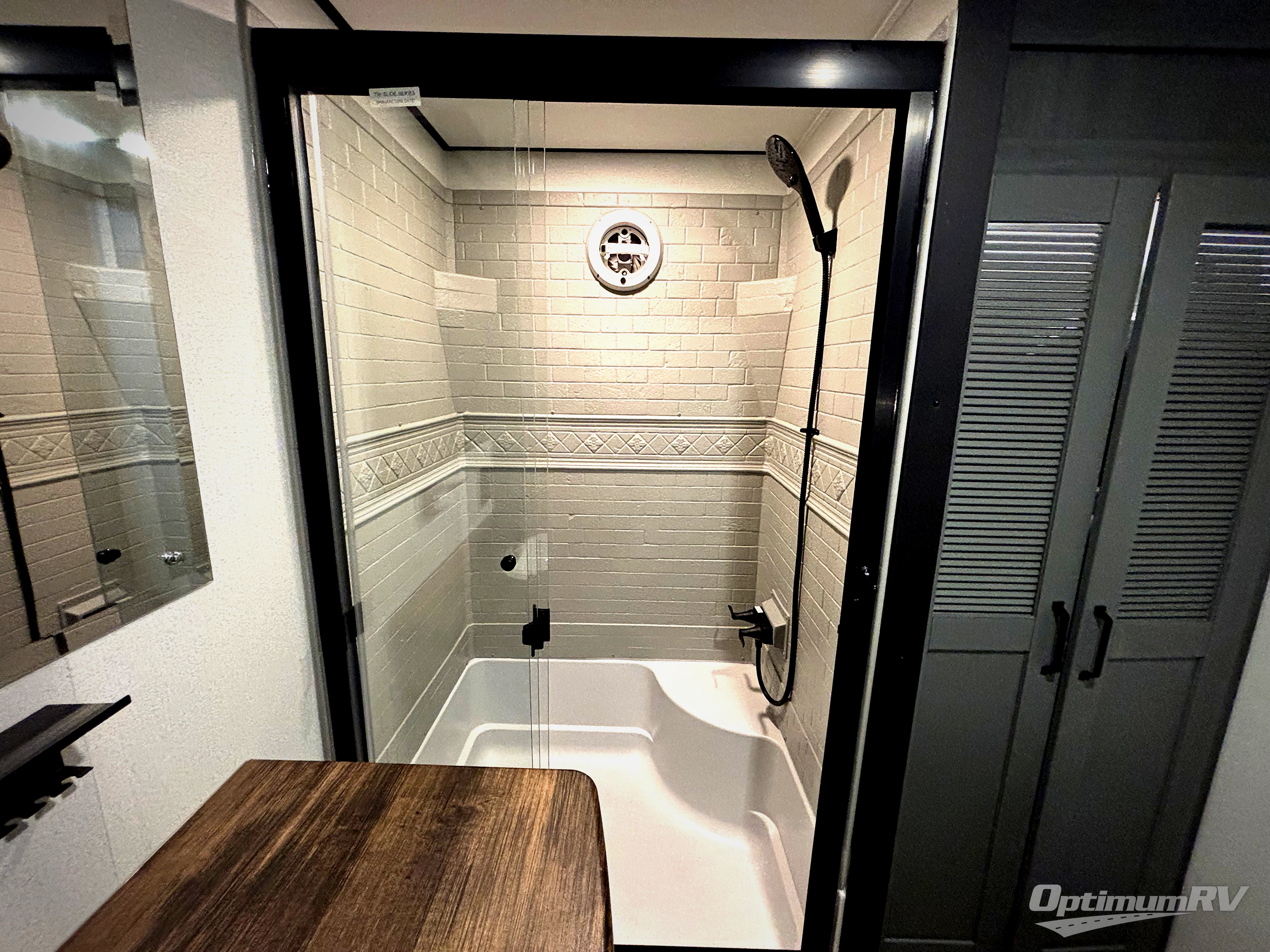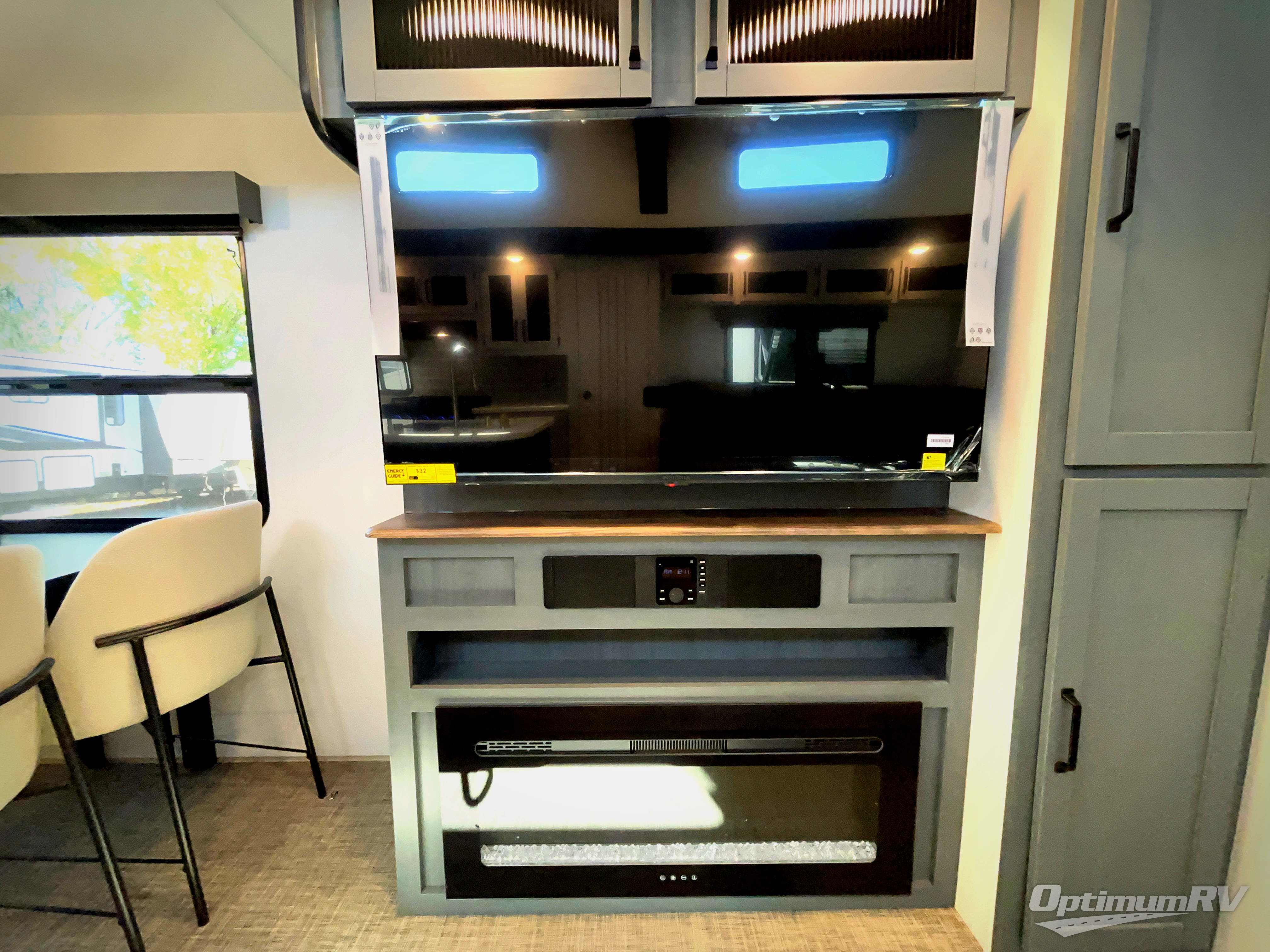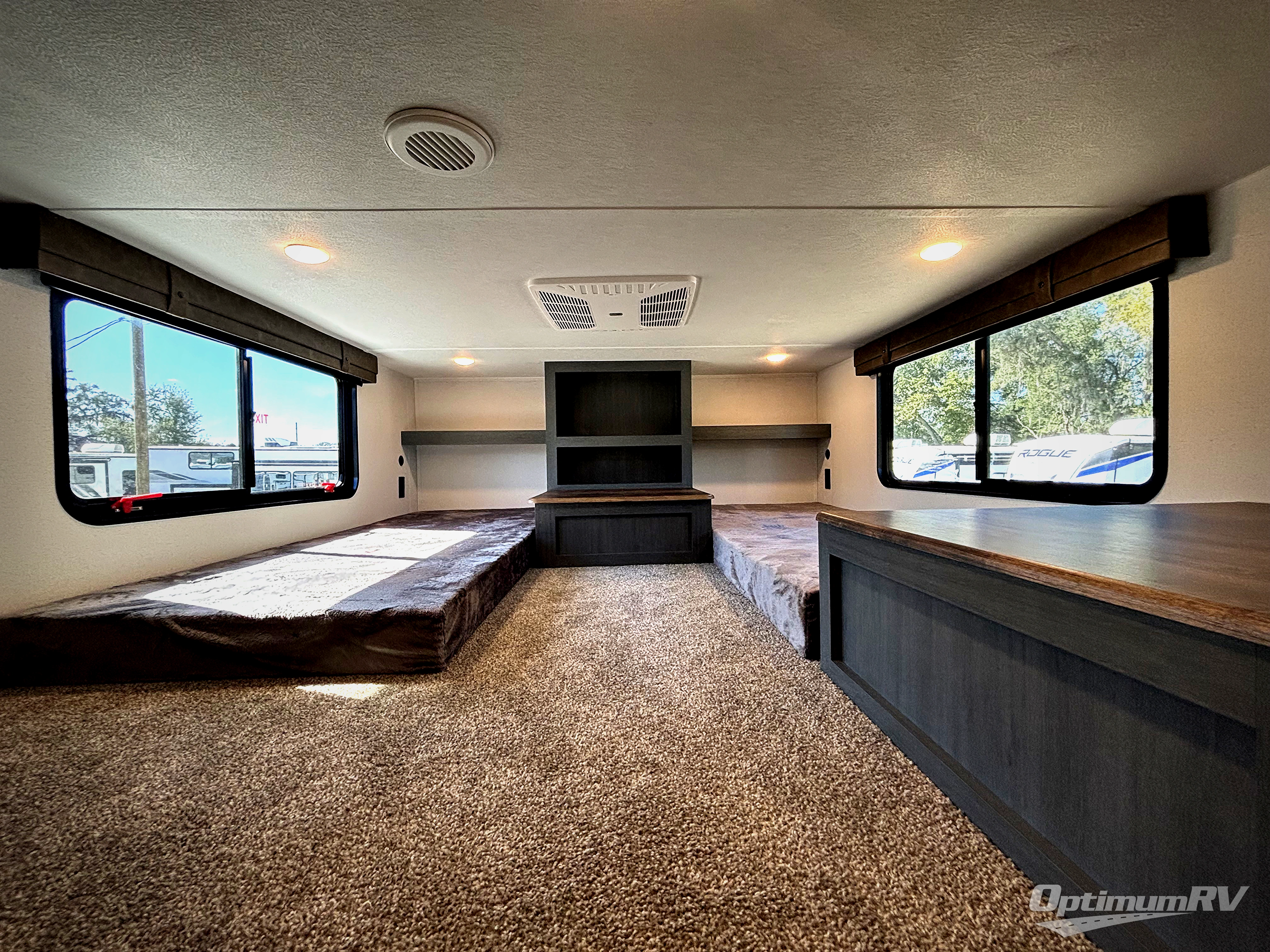 Head to your favorite spots with this destination trailer! With two entry doors, you can easily enter or exit the unit. The front private bedroom includes a king bed slide out, a wardrobe and dresser to keep your clothes organized, plus a countertop for your books or jewelry. Just outside this room is the ladder that leads to the large loft area with two 32" x 80" bunk mats, a cubby, a counter, a nightstand, and cabinets. Once you've headed back downstairs, you can relax on the L-shaped sofa across from the entertainment center with a fireplace and slide-out cabinet or the table and chairs with bench seating. And the chef of your group will love the kitchen with its residential style refrigerator and pantry, kitchen island, and four burner cooktop. The full rear bathroom not only has a 32" x 40" shower with a seat to freshen up in, and a closet with washer/dryer prep, but is also below the second loft with a 32" x 80" bunk mat and closet for storage!