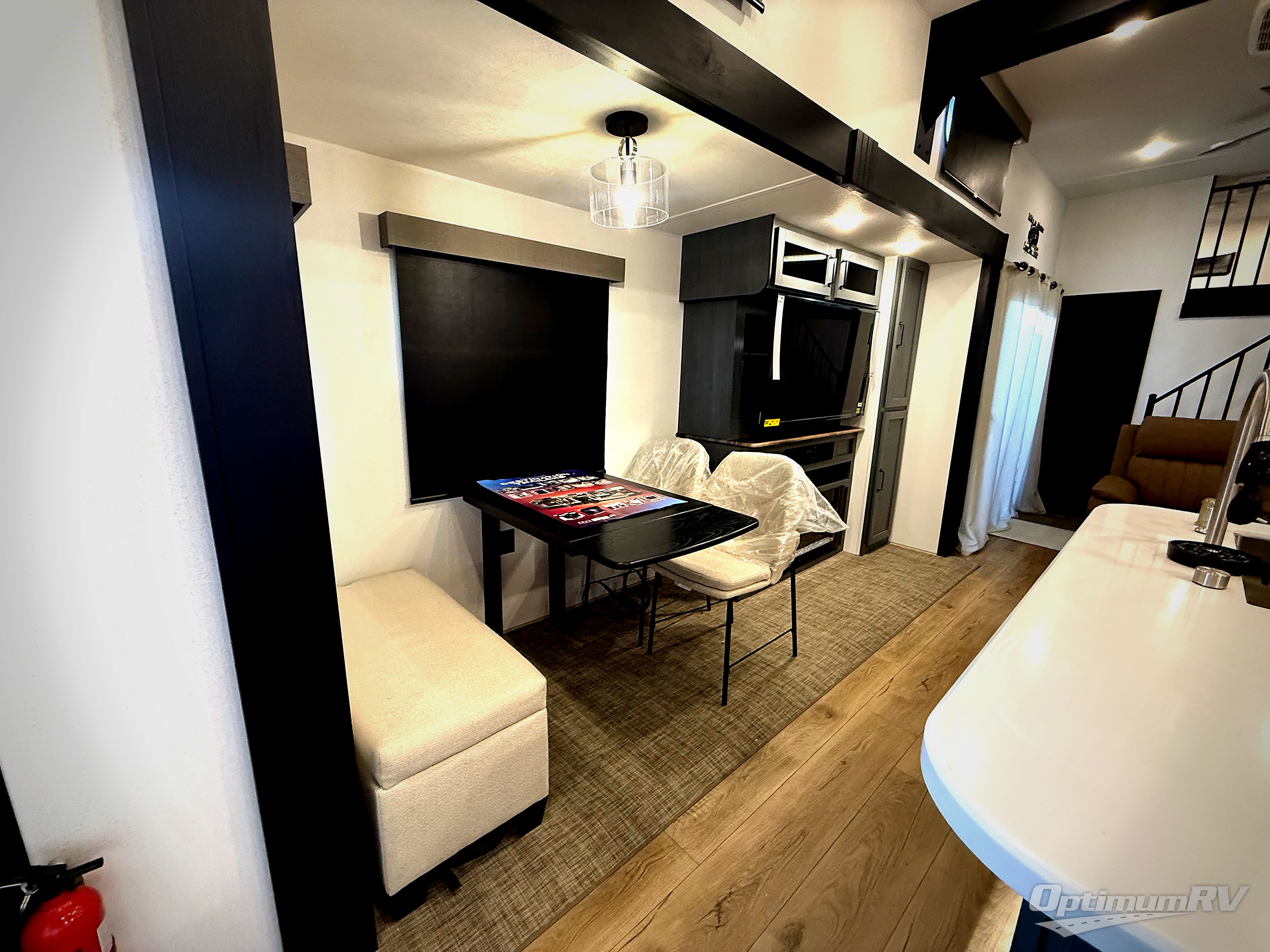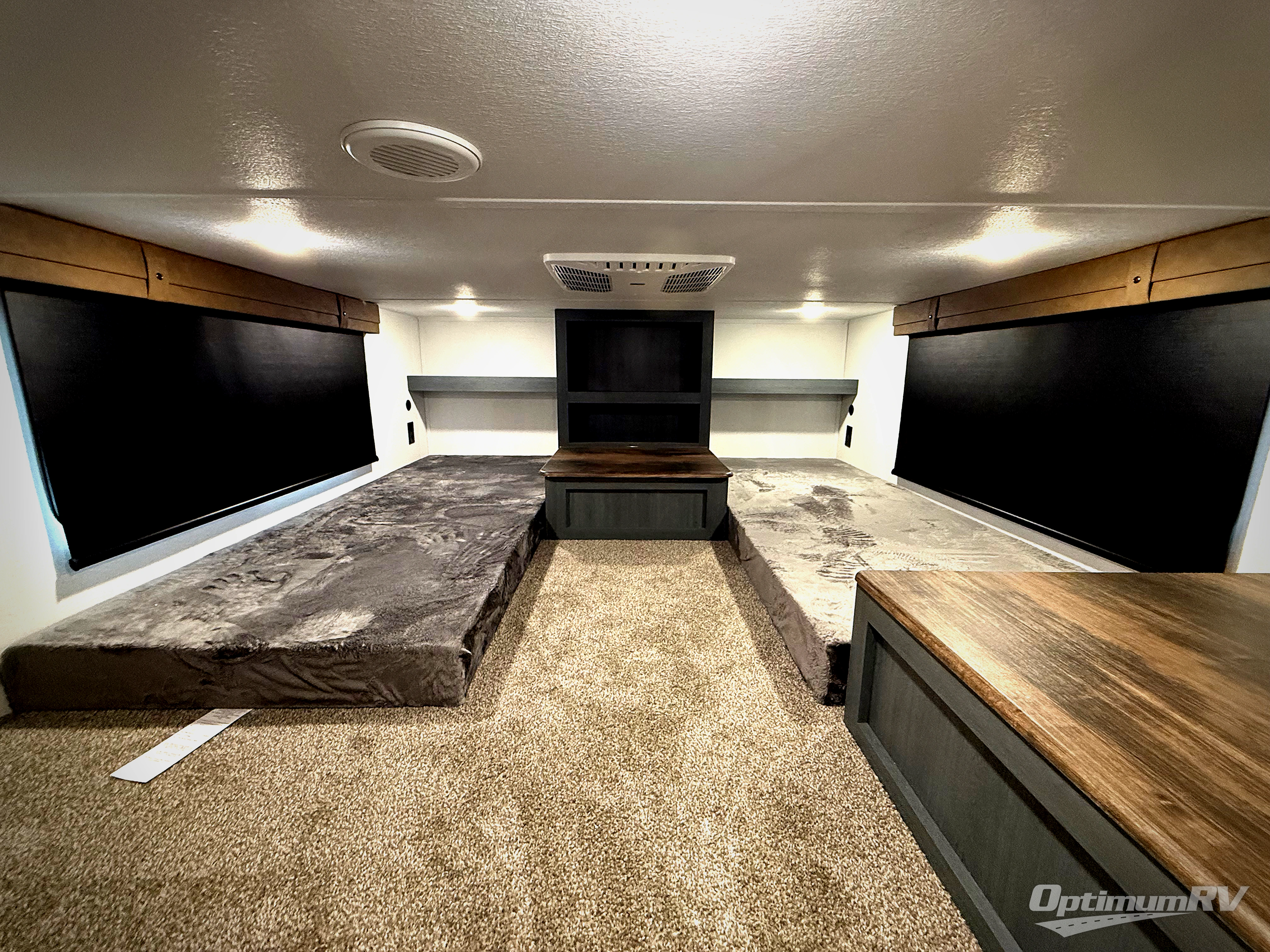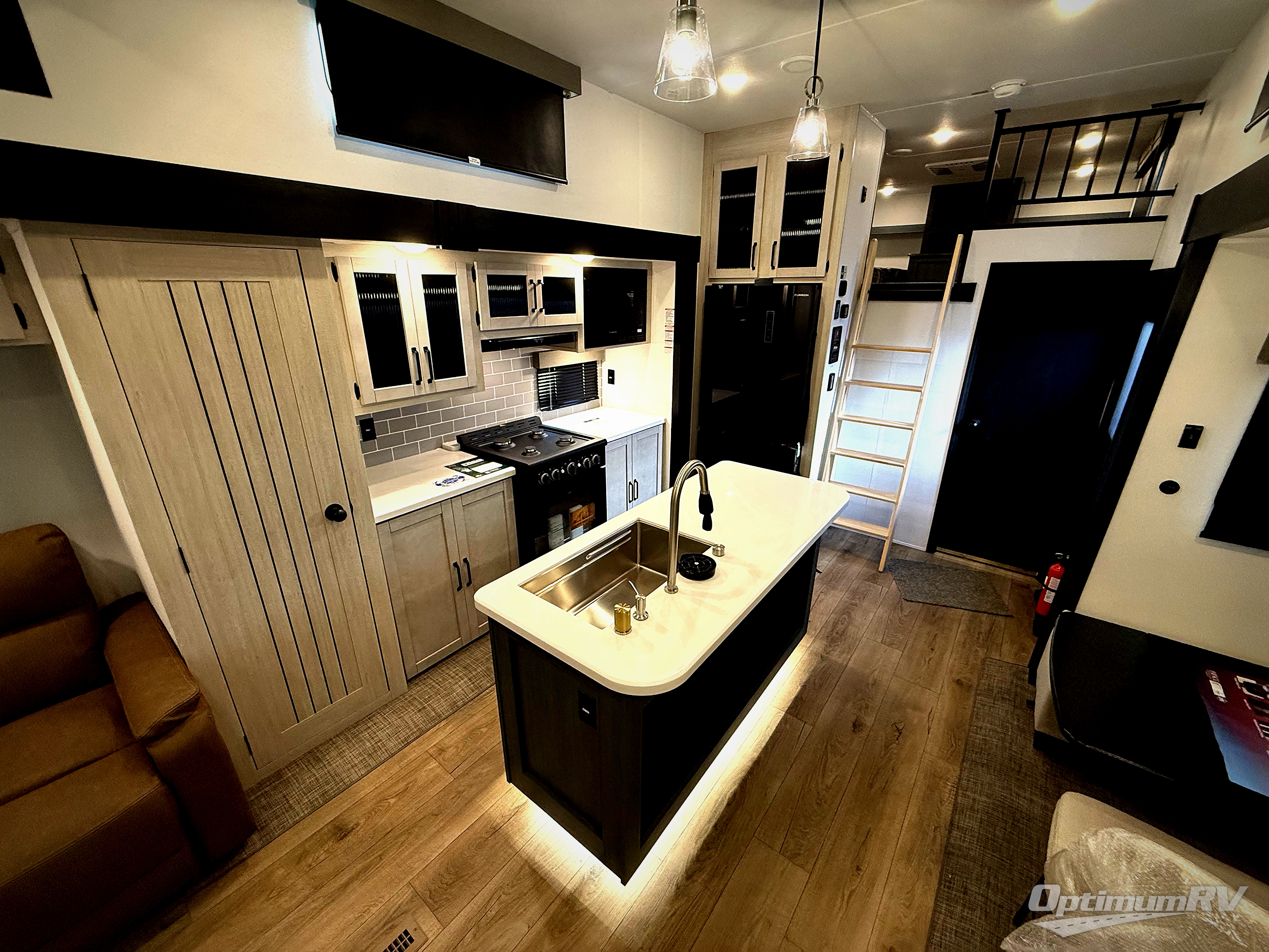 Head to your favorite spots with this destination trailer! With two entry doors, you can easily enter or exit the unit. The front private bedroom includes a king bed slide out, a wardrobe and dresser to keep your clothes organized, plus a countertop for your books or jewelry. Just outside this room is the ladder that leads to the large loft area with two 32" x 80" bunk mats, a cubby, a counter, a nightstand, and cabinets. Once you've headed back downstairs, you can relax on the L-shaped sofa across from the entertainment center with a fireplace and slide-out cabinet or the table and chairs with bench seating. And the chef of your group will love the kitchen with its residential style refrigerator and pantry, kitchen island, and four burner cooktop. The full rear bathroom not only has a 32" x 40" shower with a seat to freshen up in, and a closet with washer/dryer prep, but is also below the second loft with a 32" x 80" bunk mat and closet for storage!