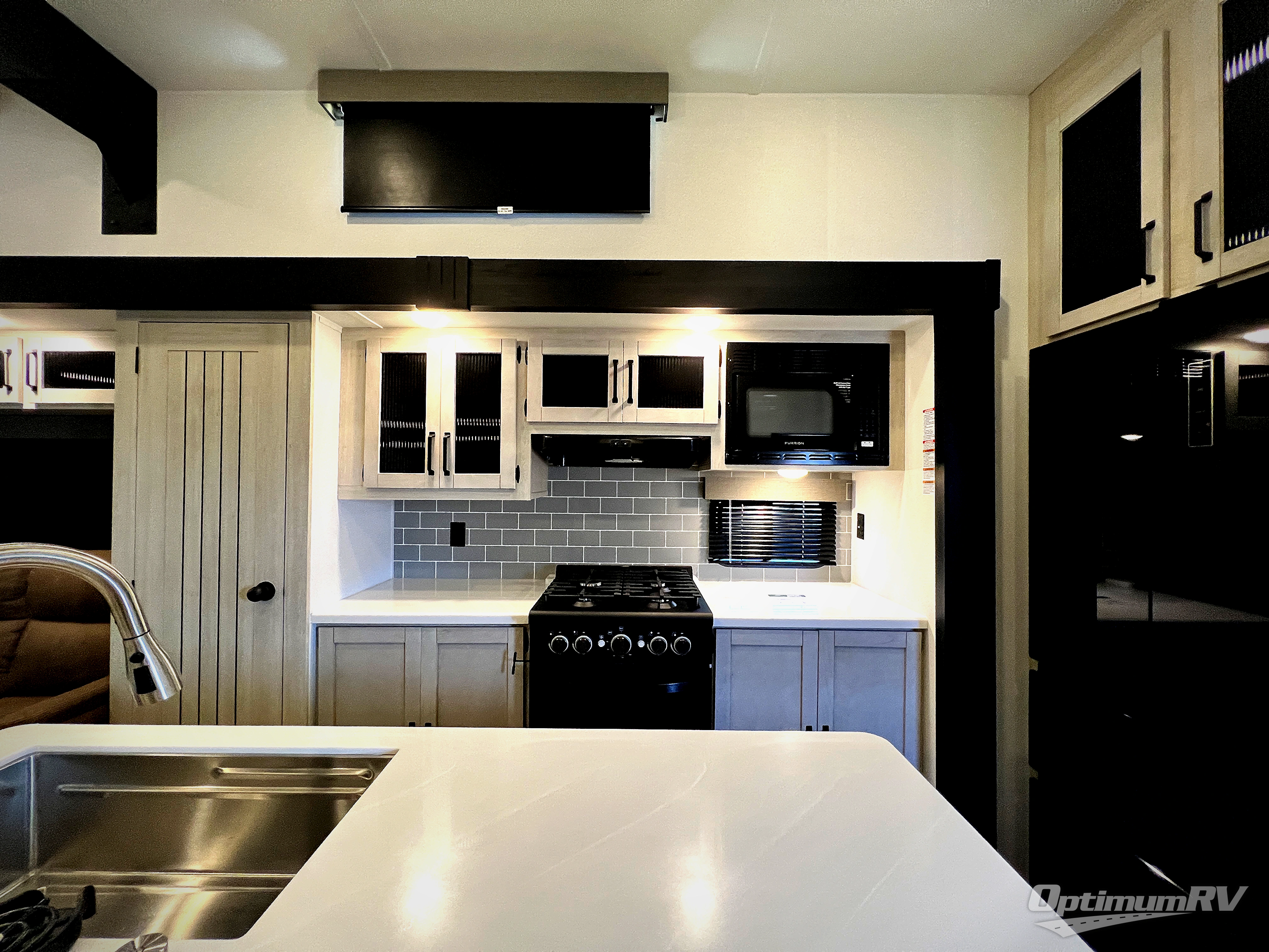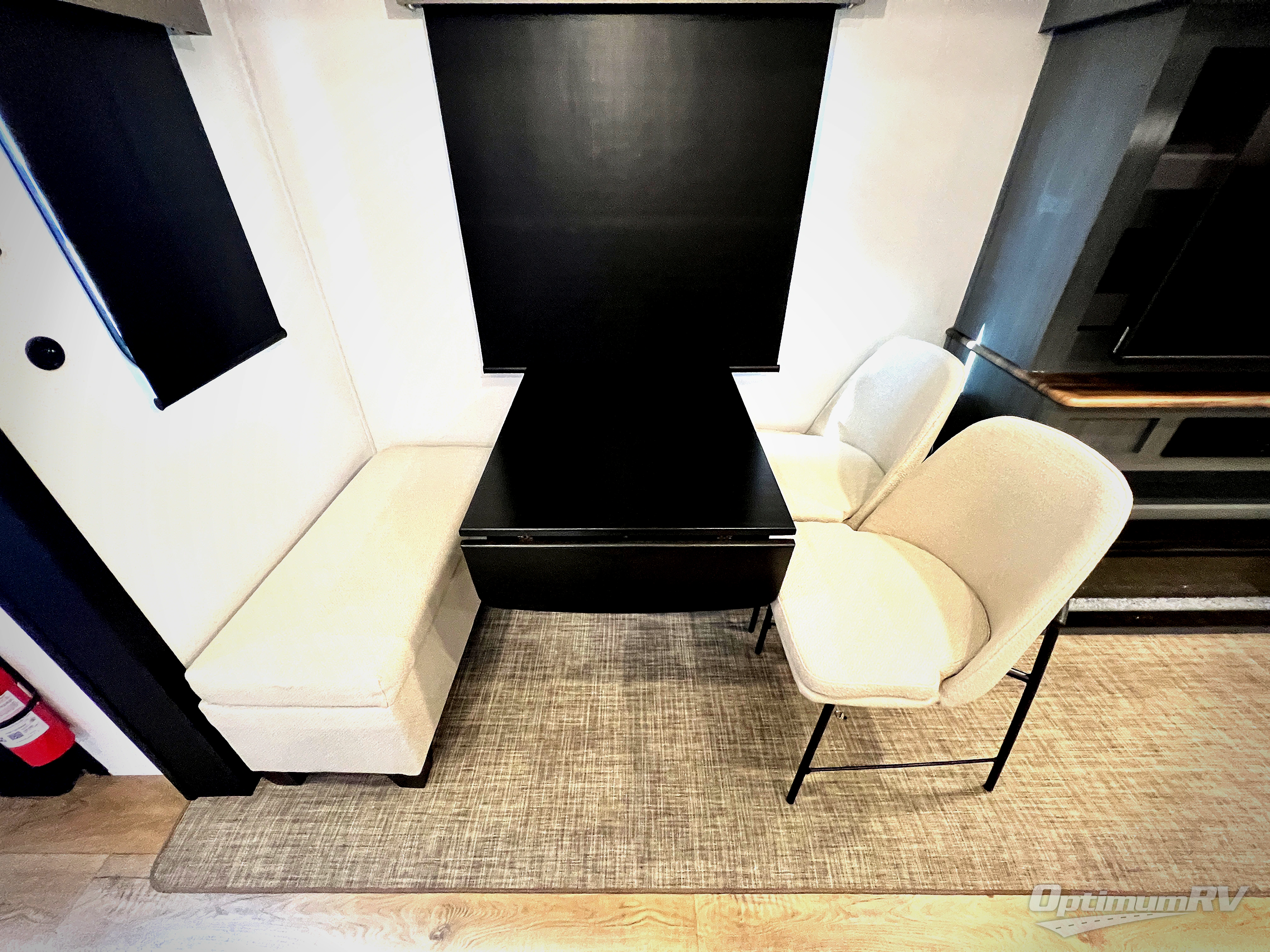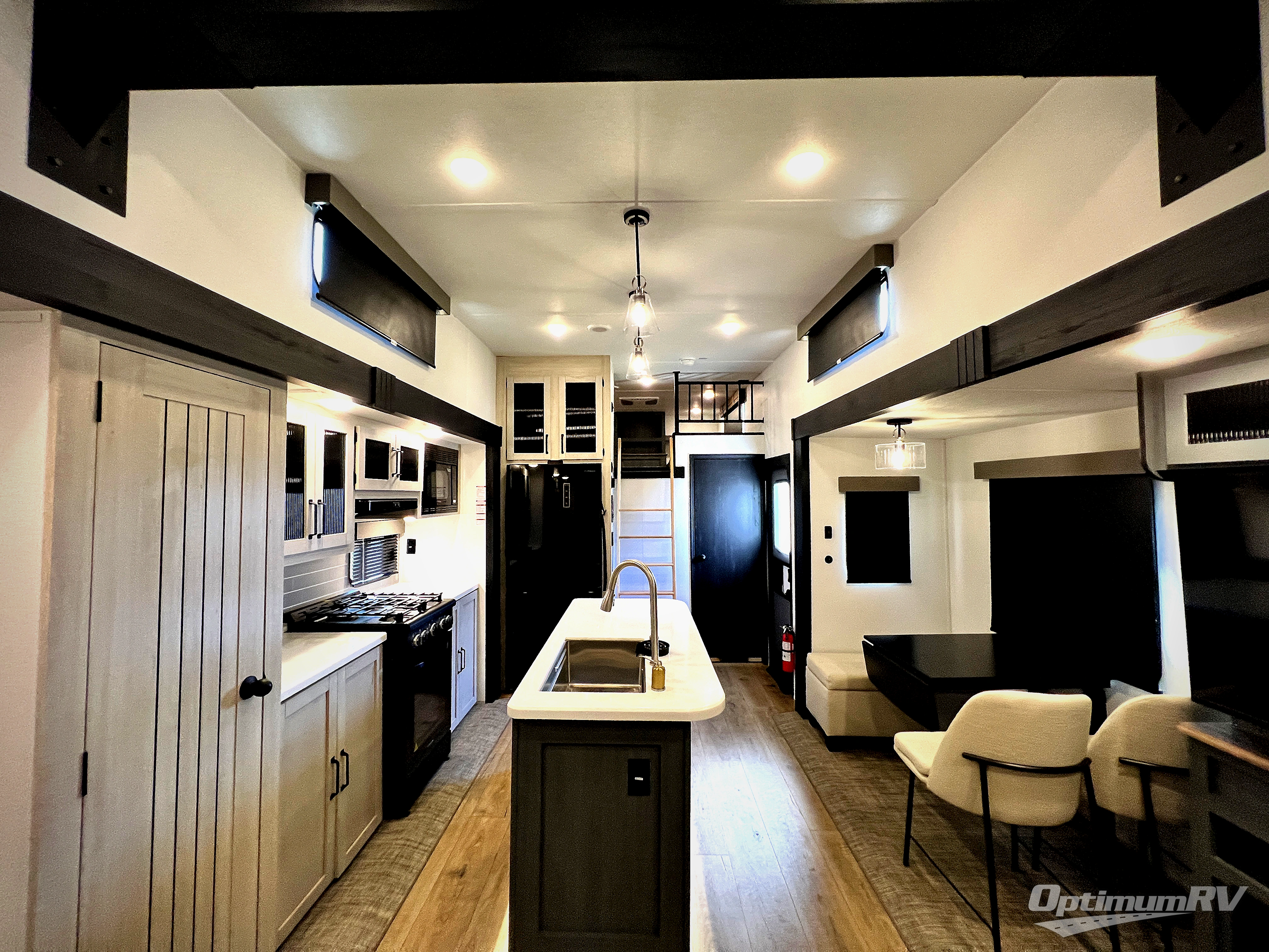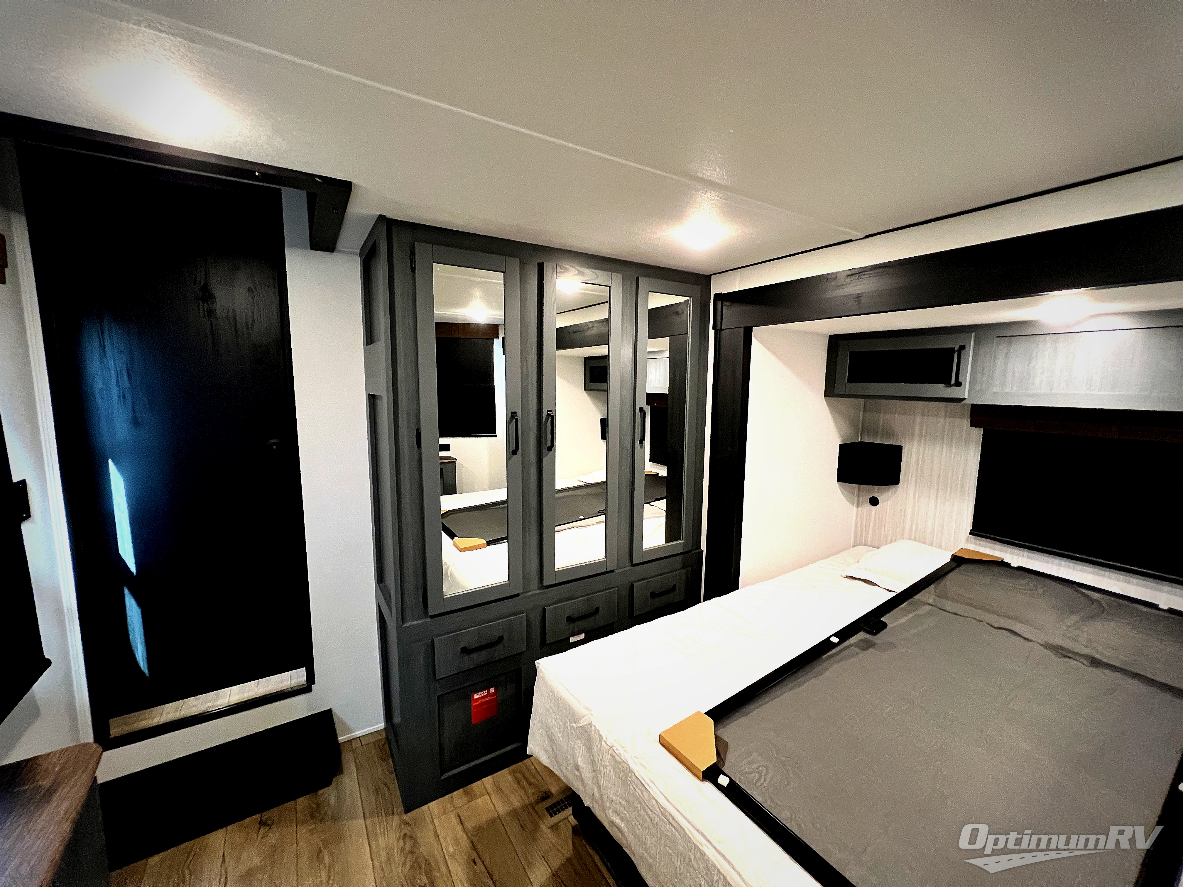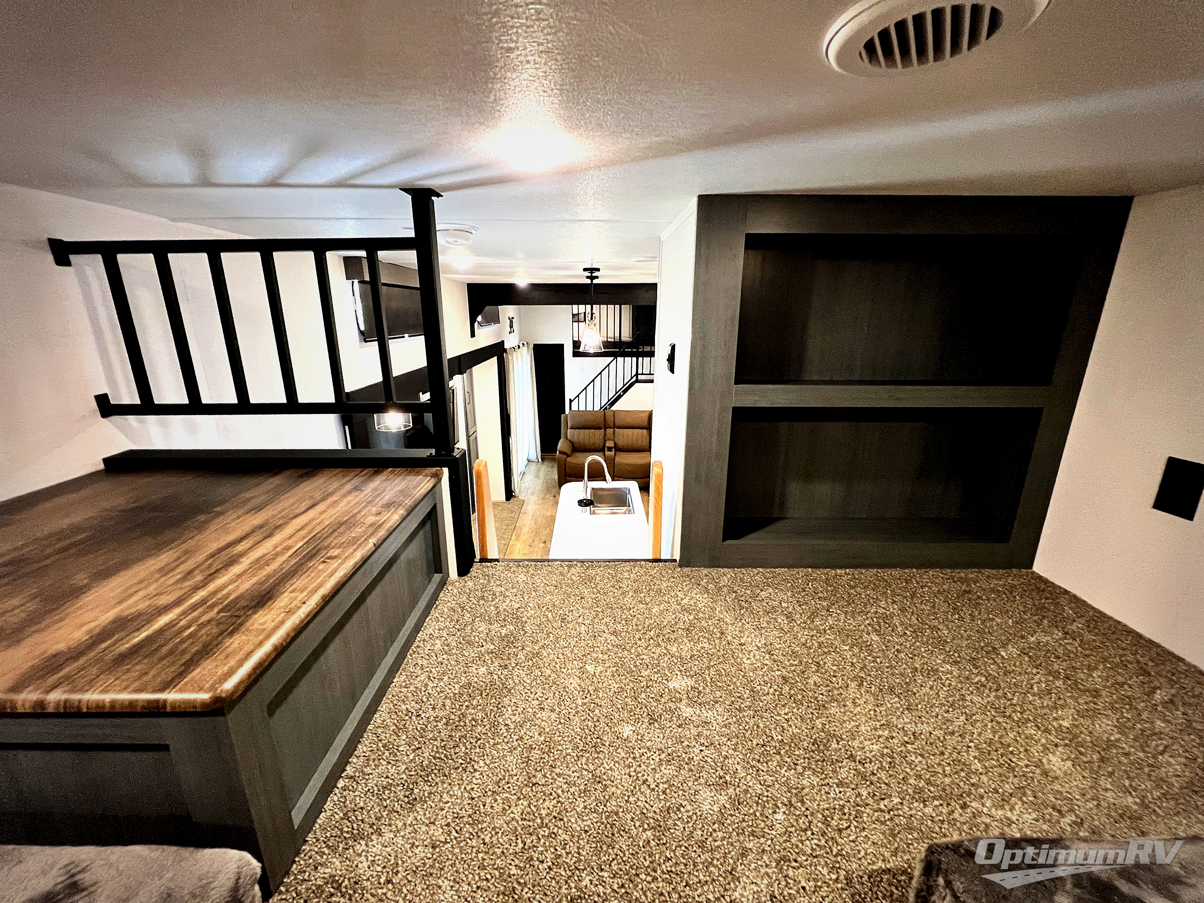 Head to your favorite spots with this destination trailer! With two entry doors, you can easily enter or exit the unit. The front private bedroom includes a king bed slide out, a wardrobe and dresser to keep your clothes organized, plus a countertop for your books or jewelry. Just outside this room is the ladder that leads to the large loft area with two 32" x 80" bunk mats, a cubby, a counter, a nightstand, and cabinets. Once you've headed back downstairs, you can relax on the L-shaped sofa across from the entertainment center with a fireplace and slide-out cabinet or the table and chairs with bench seating. And the chef of your group will love the kitchen with its residential style refrigerator and pantry, kitchen island, and four burner cooktop. The full rear bathroom not only has a 32" x 40" shower with a seat to freshen up in, and a closet with washer/dryer prep, but is also below the second loft with a 32" x 80" bunk mat and closet for storage!