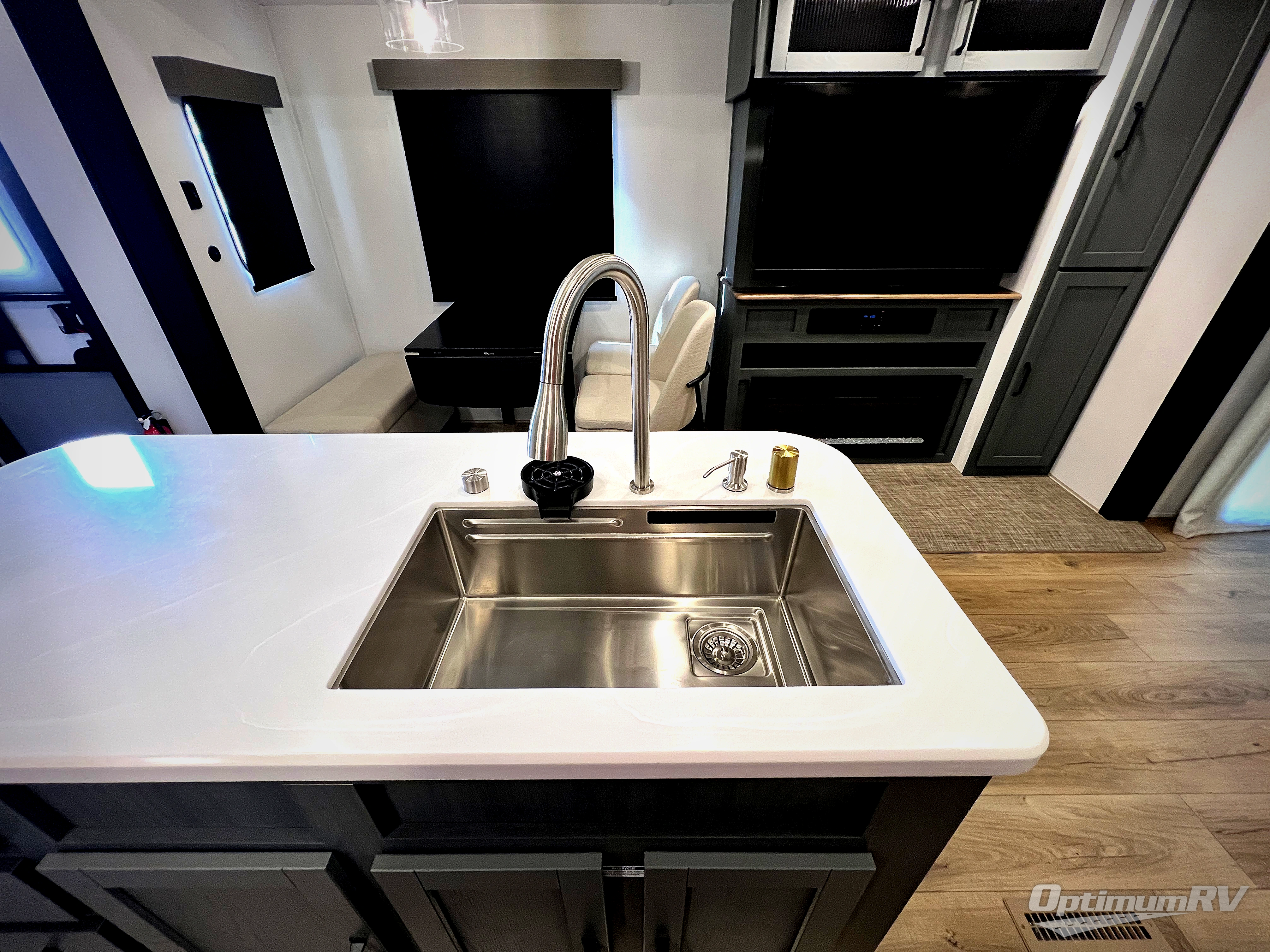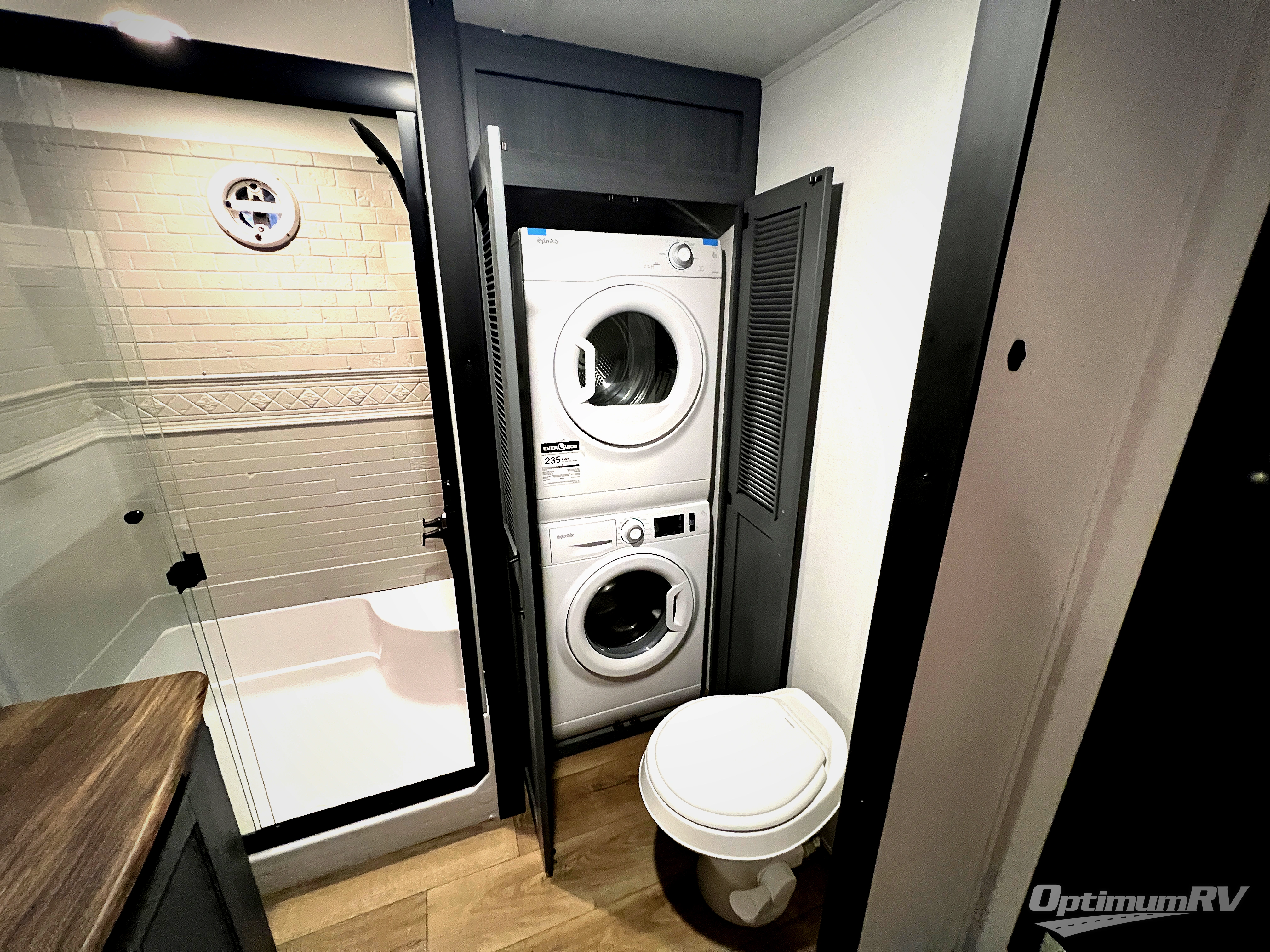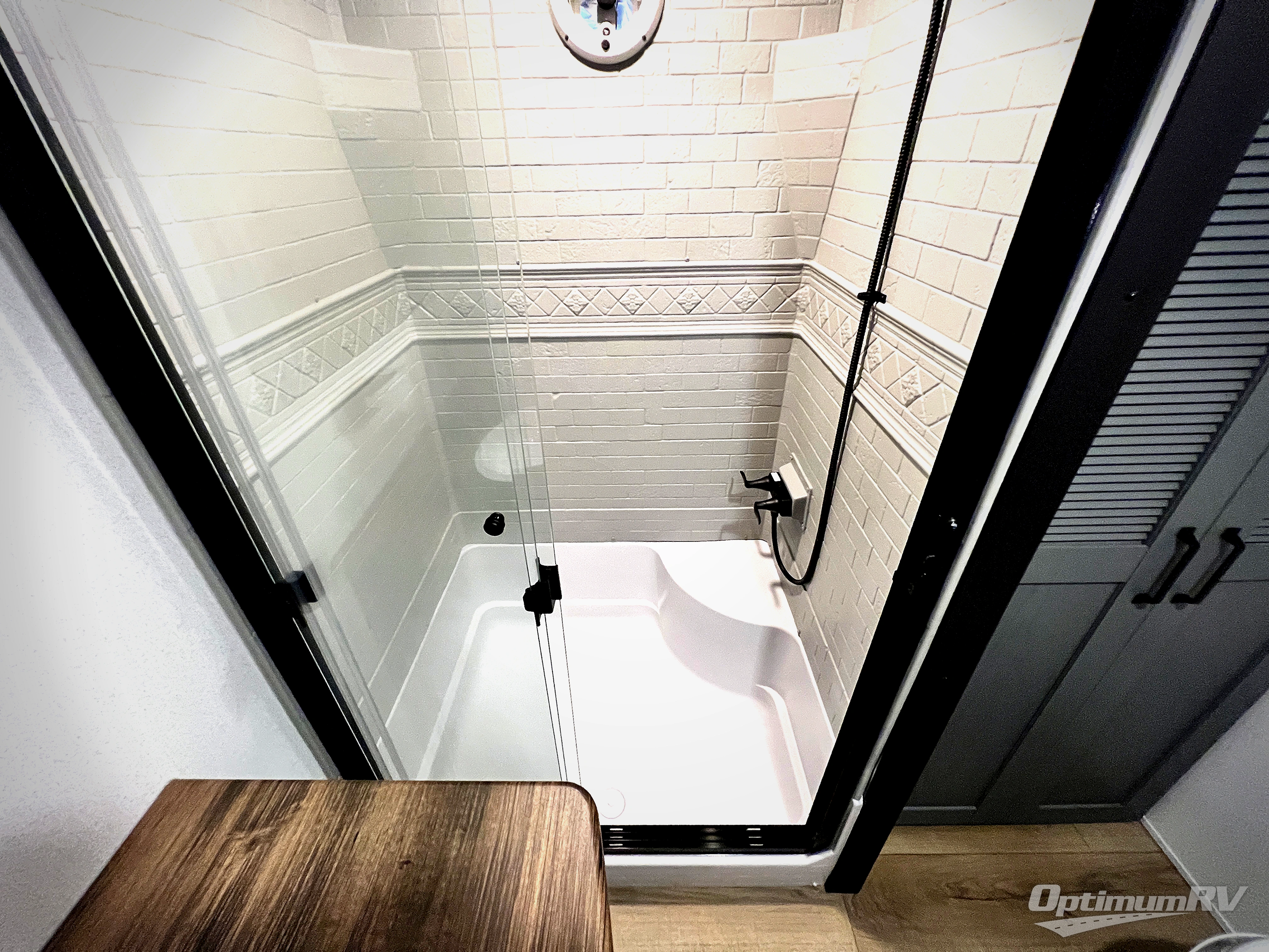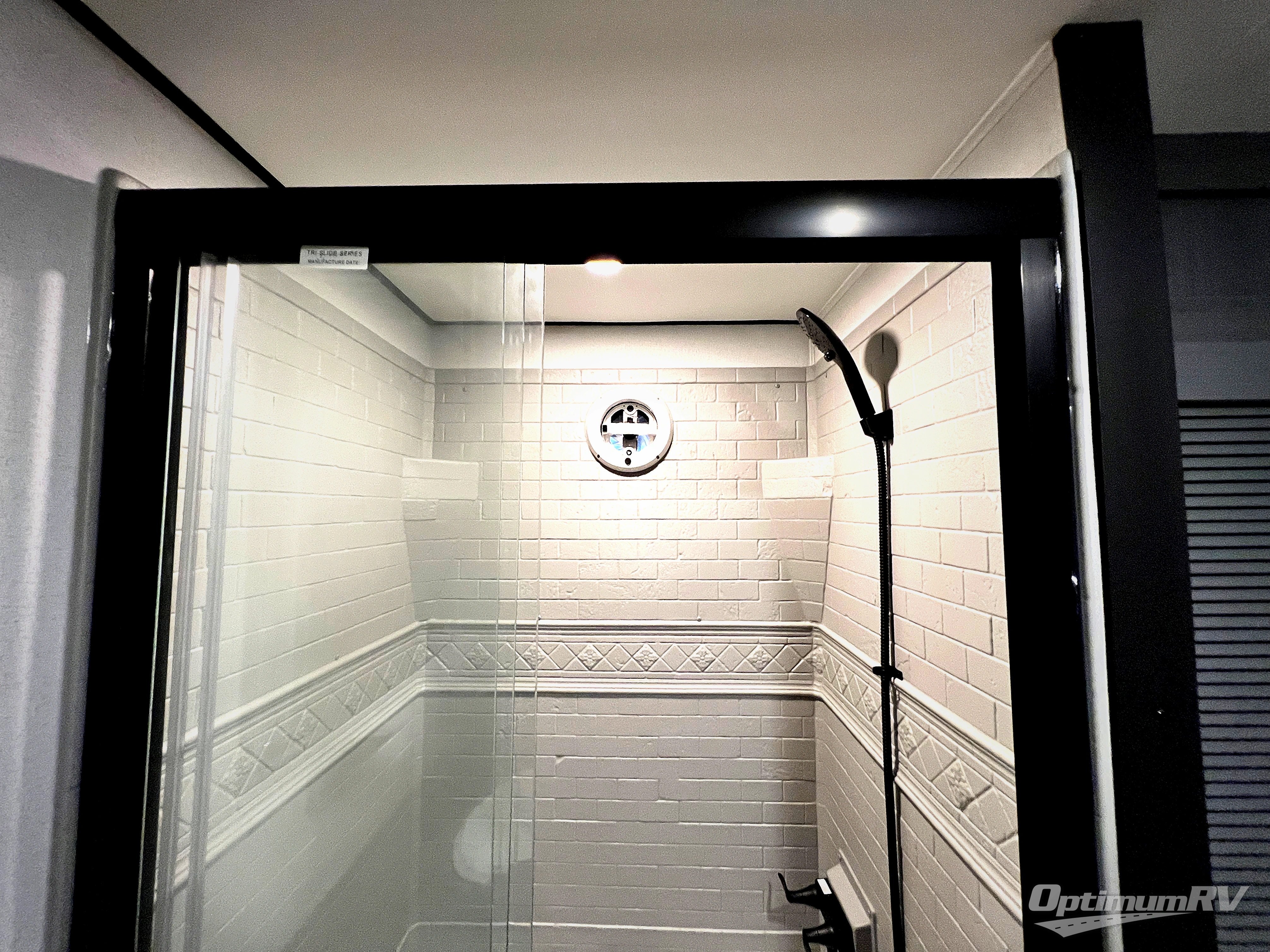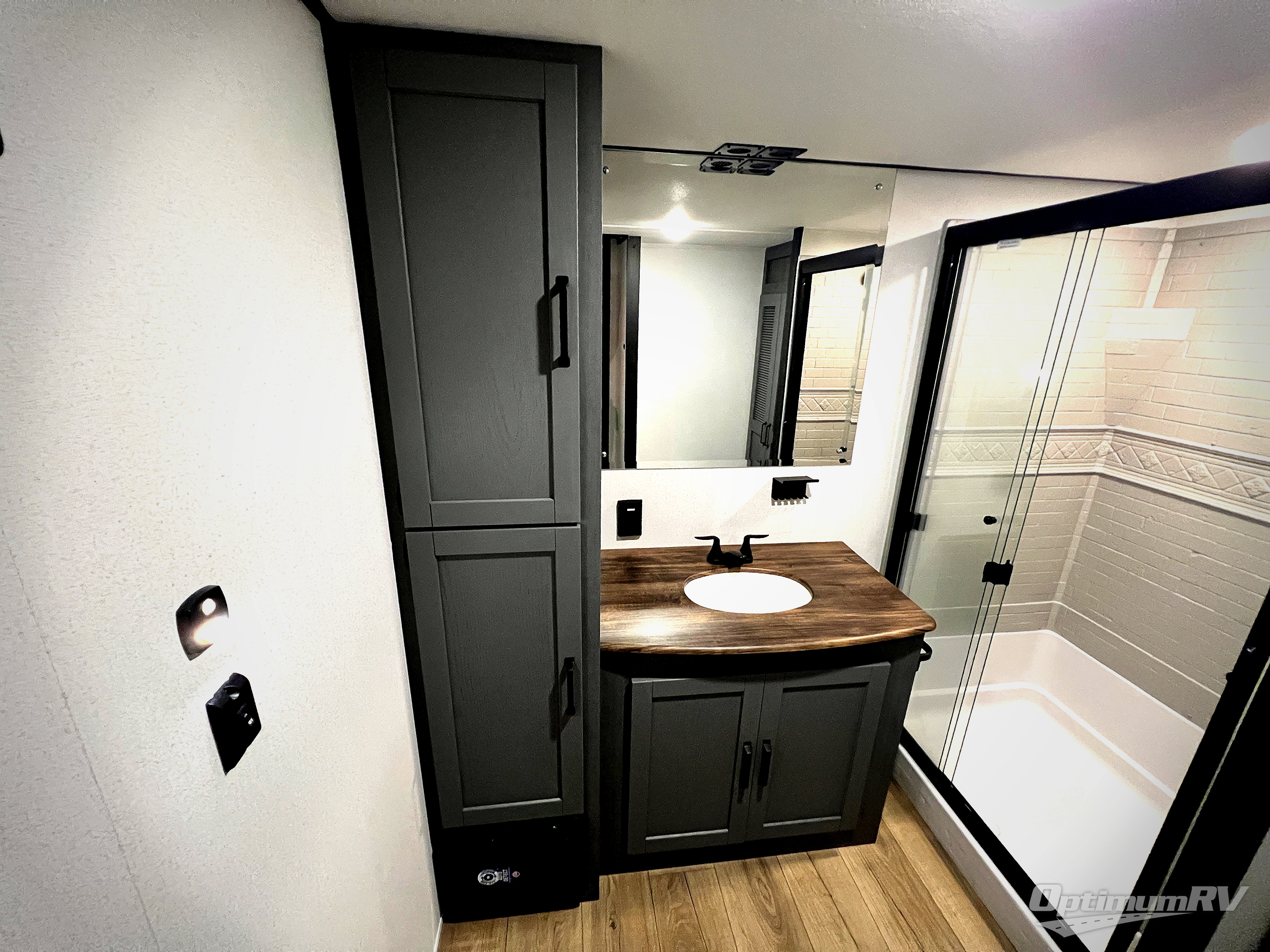 Head to your favorite spots with this destination trailer! With two entry doors, you can easily enter or exit the unit. The front private bedroom includes a king bed slide out, a wardrobe and dresser to keep your clothes organized, plus a countertop for your books or jewelry. Just outside this room is the ladder that leads to the large loft area with two 32" x 80" bunk mats, a cubby, a counter, a nightstand, and cabinets. Once you've headed back downstairs, you can relax on the L-shaped sofa across from the entertainment center with a fireplace and slide-out cabinet or the table and chairs with bench seating. And the chef of your group will love the kitchen with its residential style refrigerator and pantry, kitchen island, and four burner cooktop. The full rear bathroom not only has a 32" x 40" shower with a seat to freshen up in, and a closet with washer/dryer prep, but is also below the second loft with a 32" x 80" bunk mat and closet for storage!