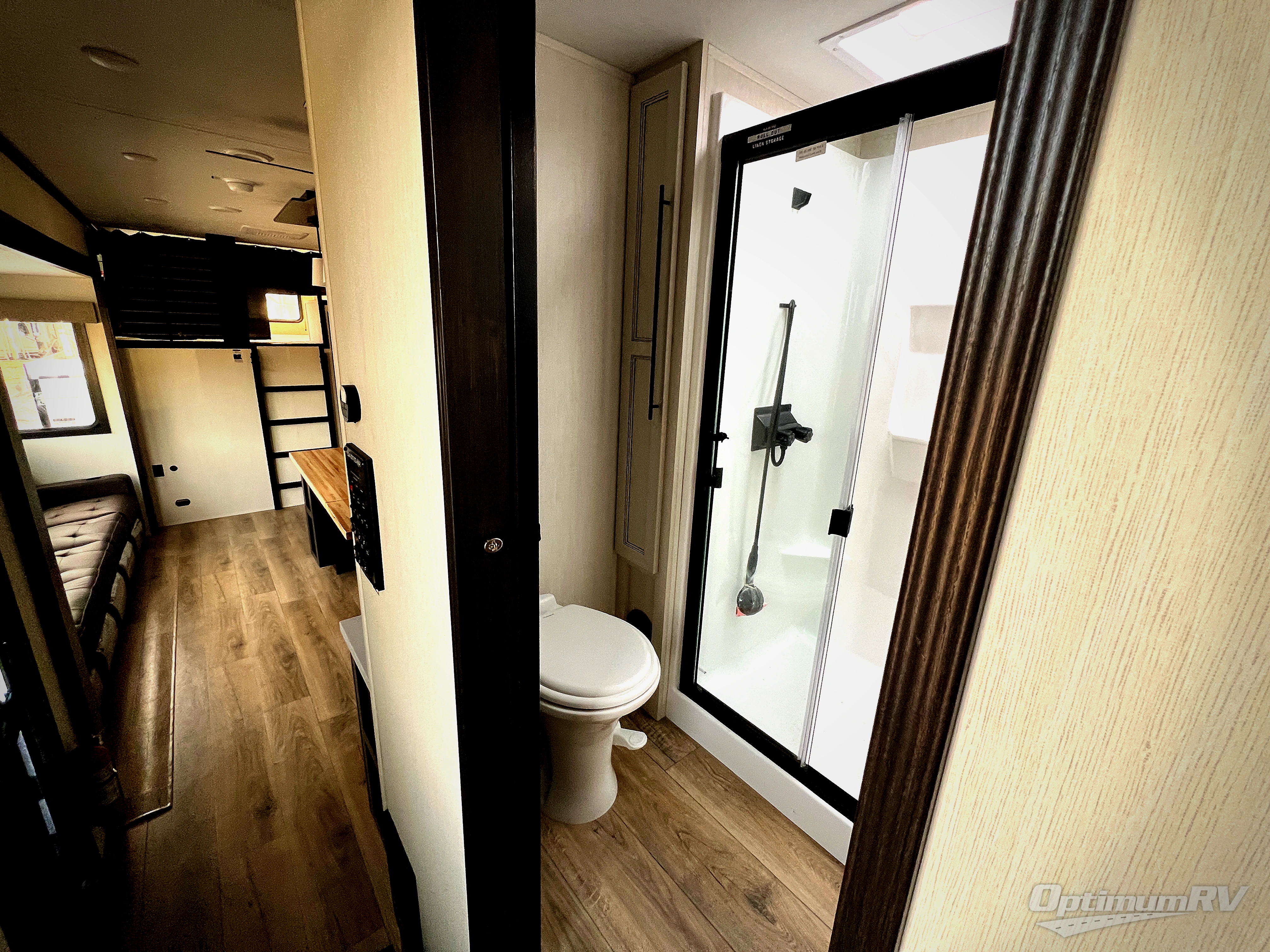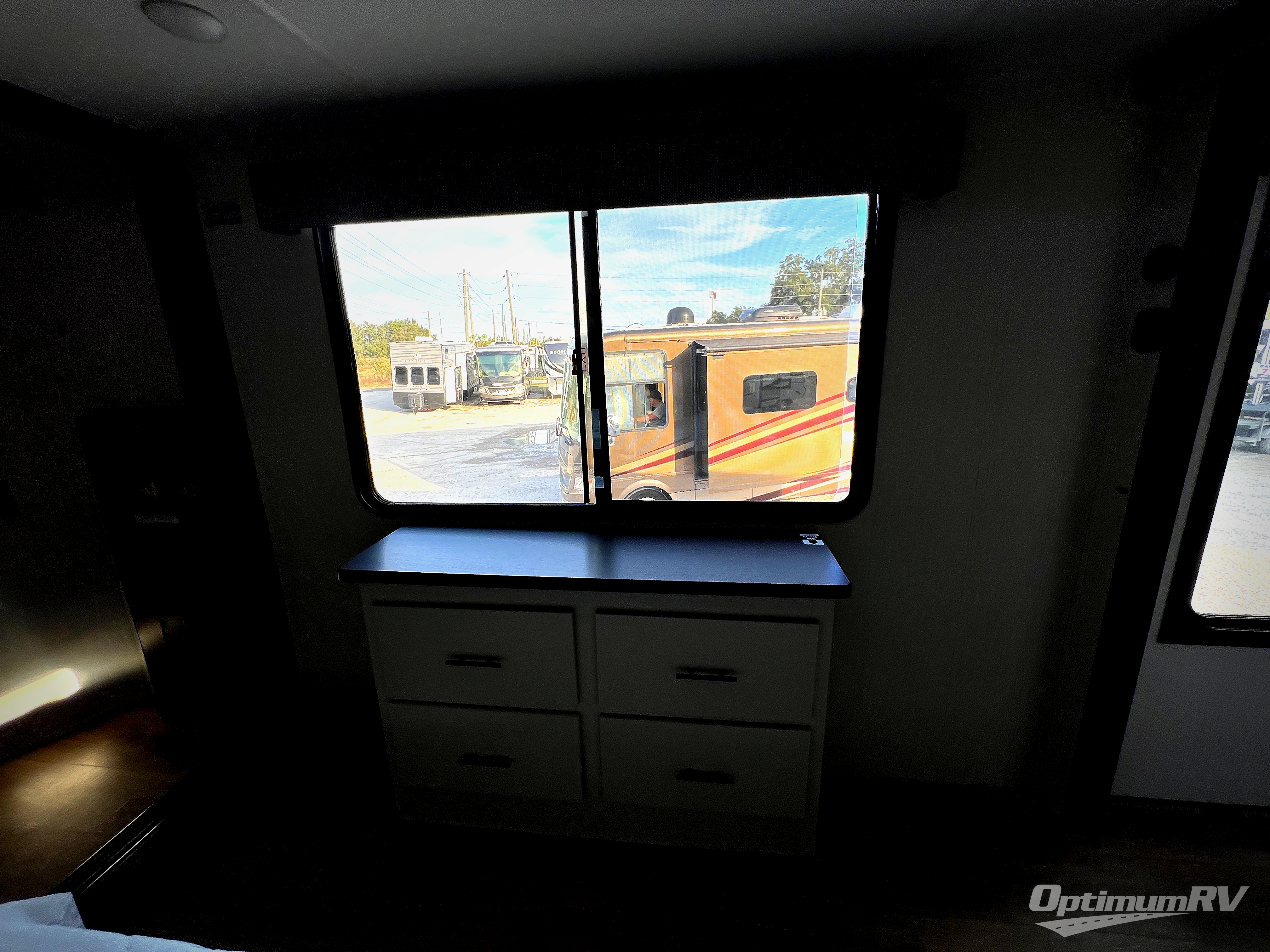 Are you looking for a fifth wheel where you can bring along your neighbor friends? You can do just that since there are two bedrooms in this unit, one of which includes a master bath with its own exterior entry door! The front bedroom is right next to the second full bath for convenience, and includes a camper king bed slide, a dresser, and front wardrobe. The rear master bedroom has a queen bed slide out across from a second slide for more floor space, and there is a loft above this room for more sleeping or storage space. Everyone can meet in the middle kitchen and living room since there are recliners, a ceiling fan, and kitchen island with four chairs. There is also storage below the island for kitchen necessities, and the hidden pantry behind the TV will be perfect for snacks, board games and more!