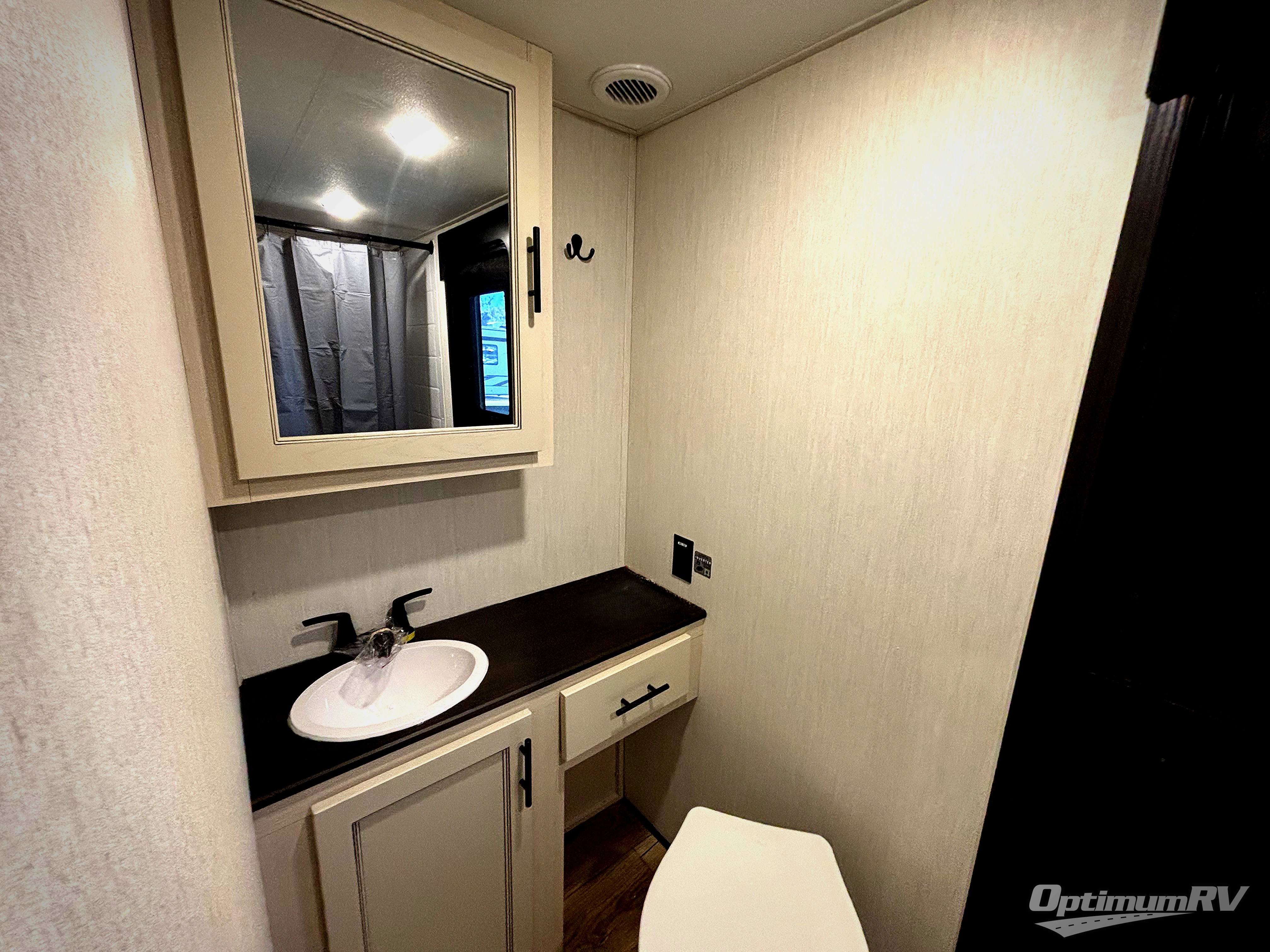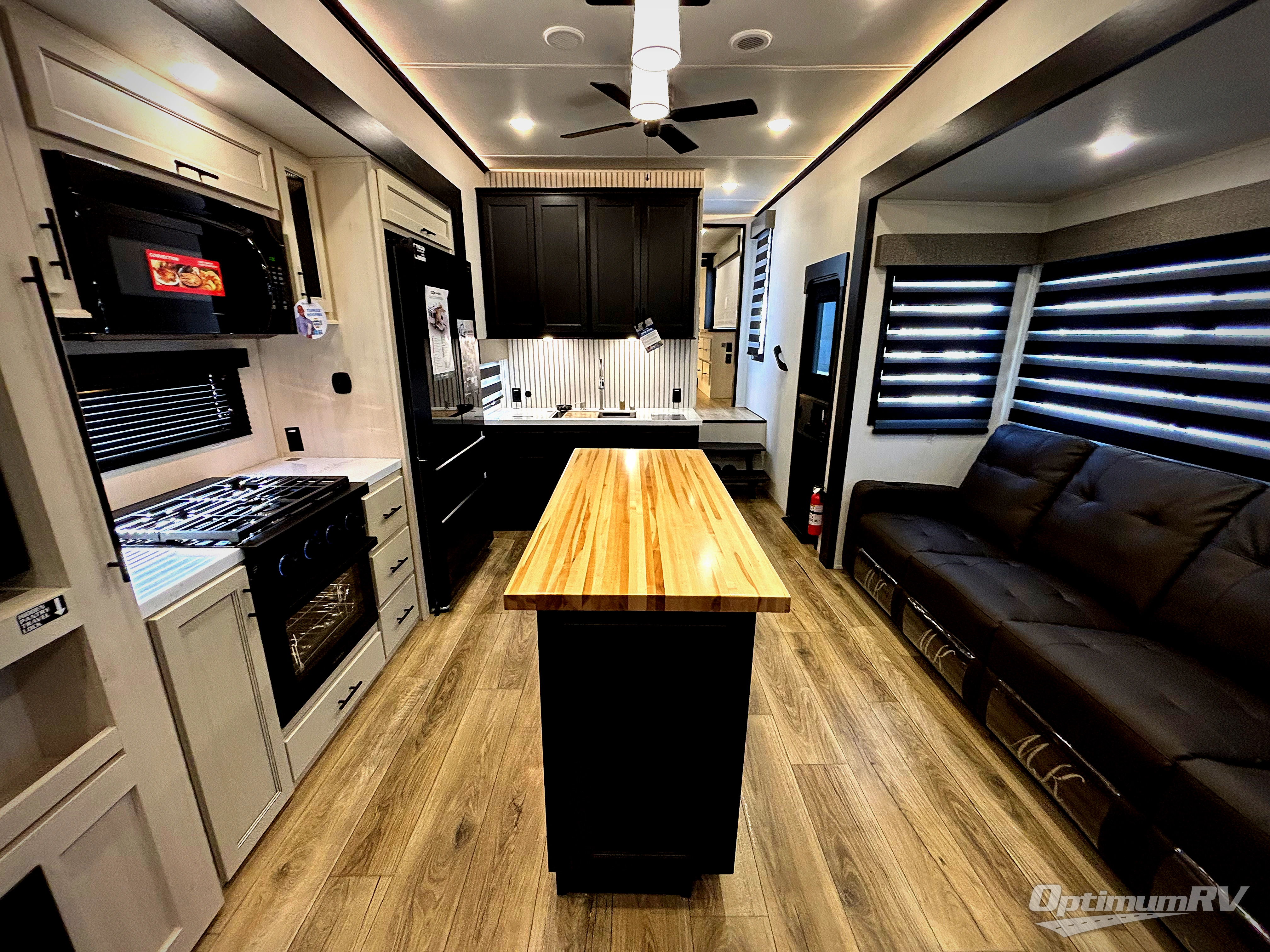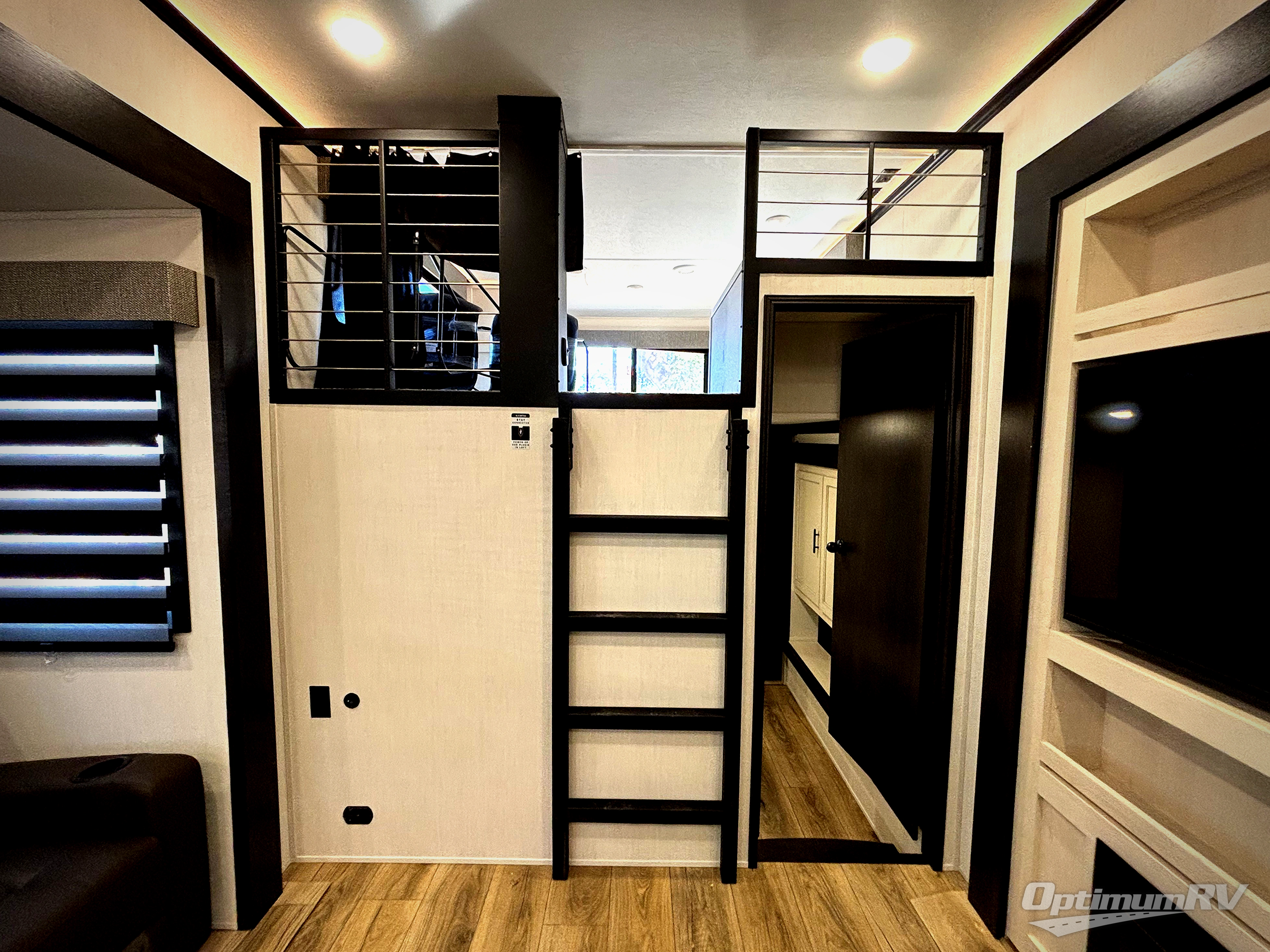 Are you looking for a fifth wheel where you can bring along your neighbor friends? You can do just that since there are two bedrooms in this unit, one of which includes a master bath with its own exterior entry door! The front bedroom is right next to the second full bath for convenience, and includes a camper king bed slide, a dresser, and front wardrobe. The rear master bedroom has a queen bed slide out across from a second slide for more floor space, and there is a loft above this room for more sleeping or storage space. Everyone can meet in the middle kitchen and living room since there are recliners, a ceiling fan, and kitchen island with four chairs. There is also storage below the island for kitchen necessities, and the hidden pantry behind the TV will be perfect for snacks, board games and more!