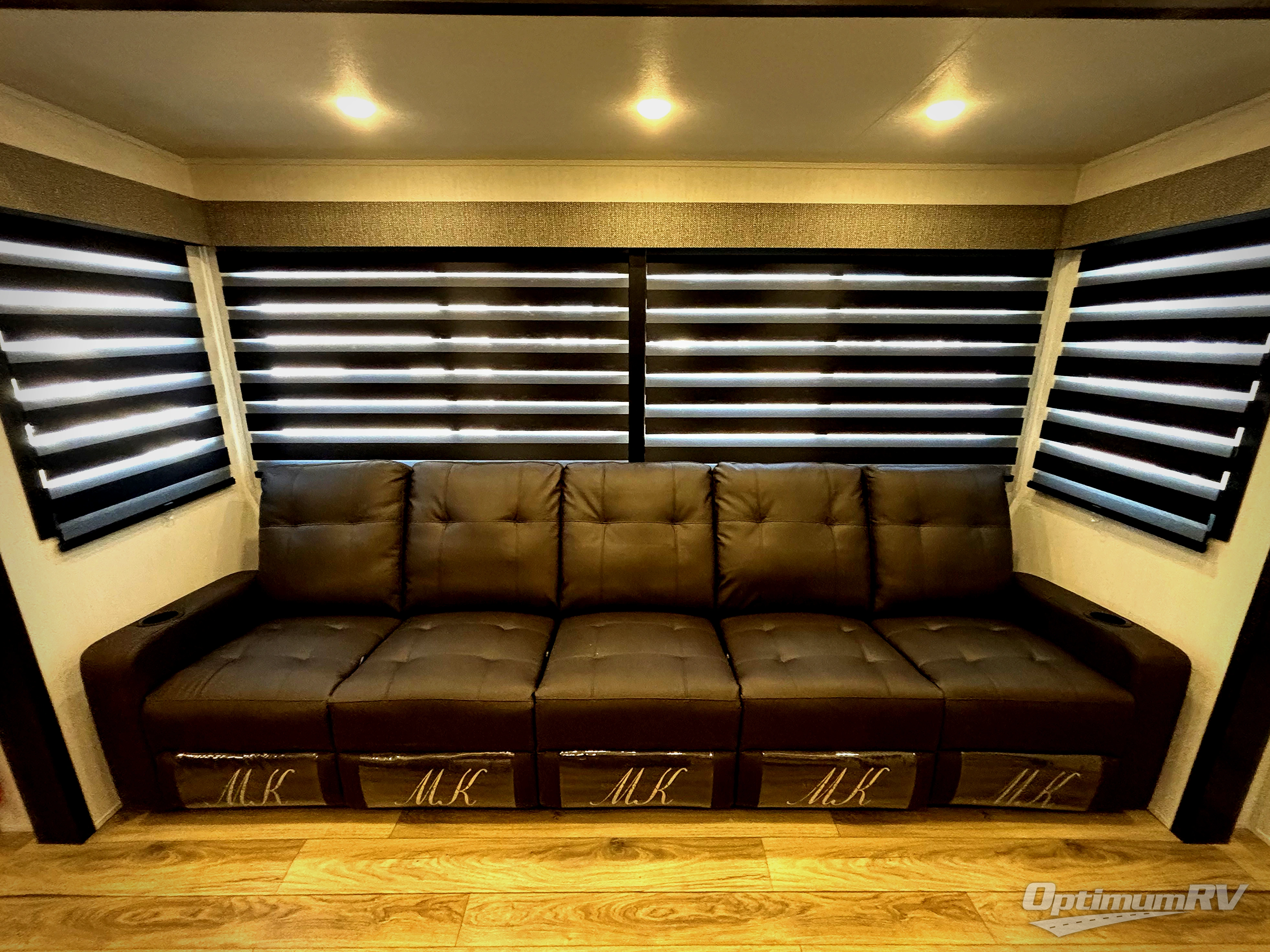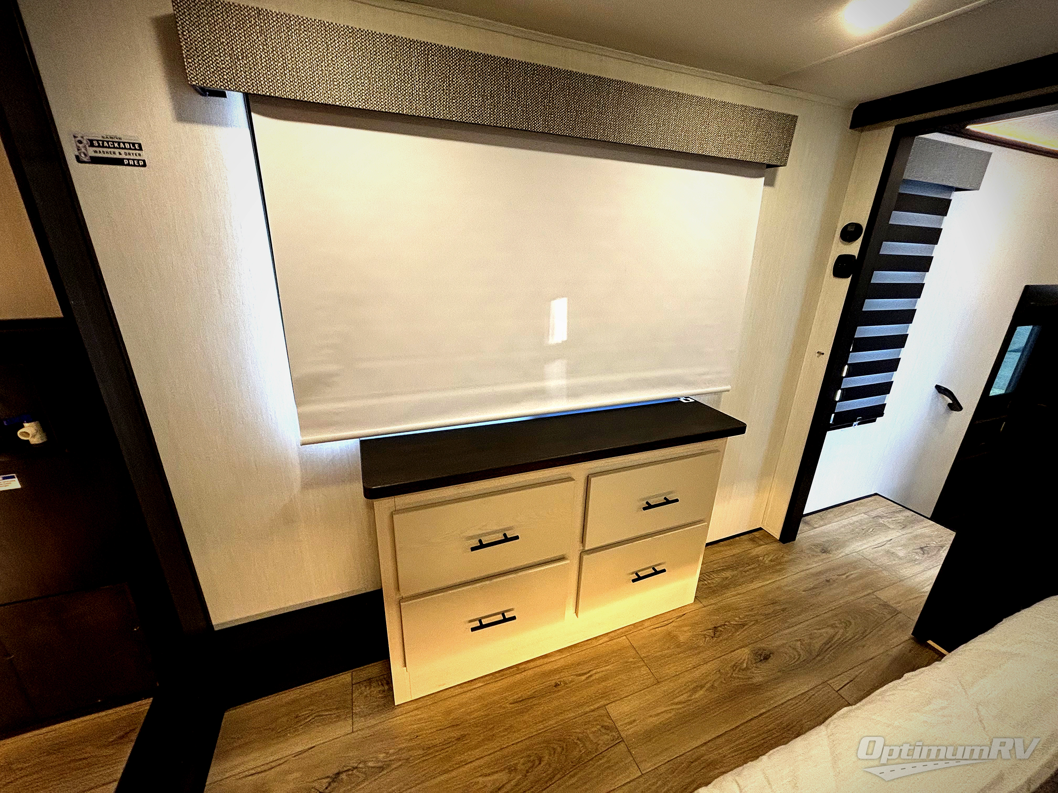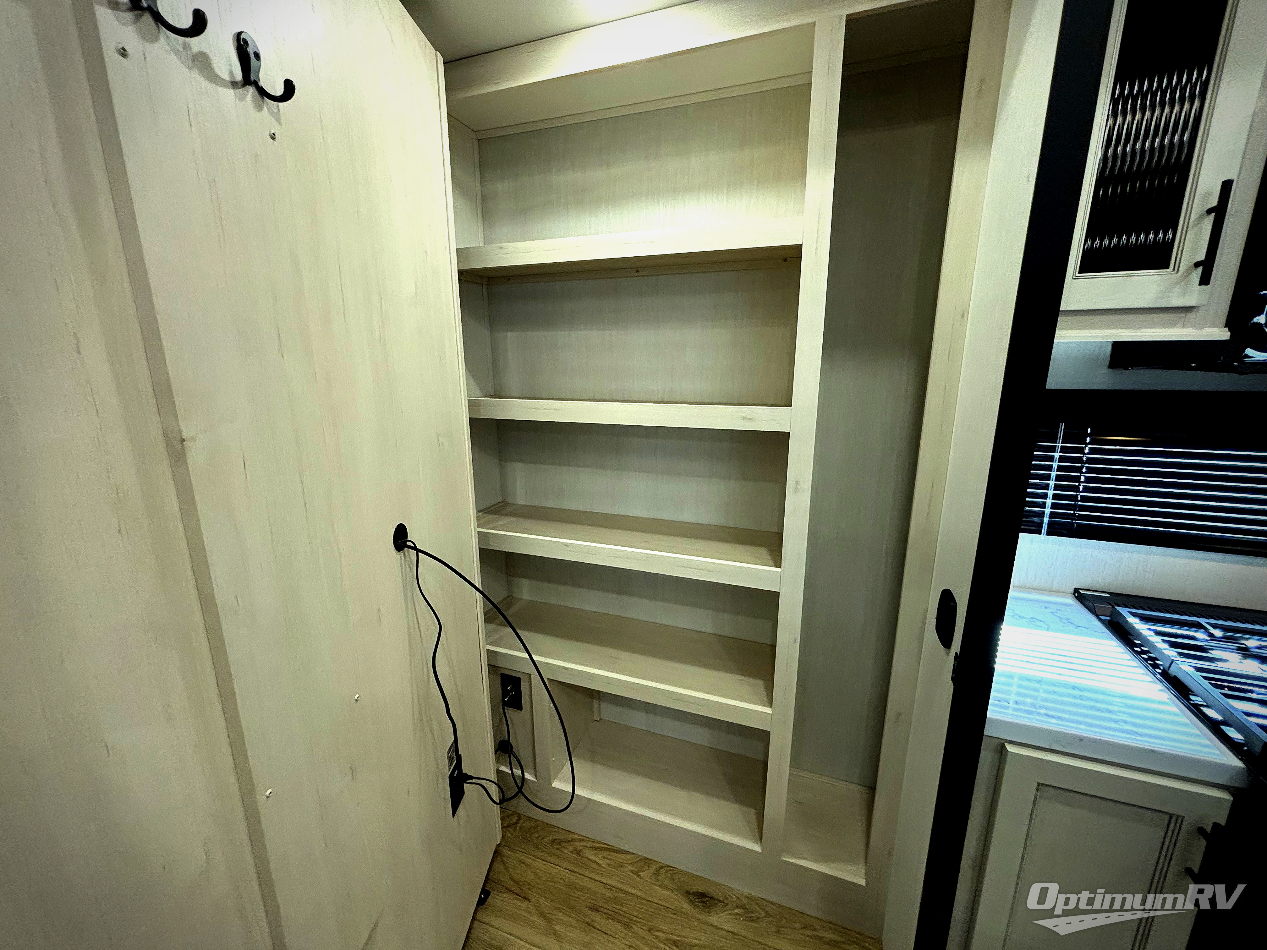 Are you looking for a fifth wheel where you can bring along your neighbor friends? You can do just that since there are two bedrooms in this unit, one of which includes a master bath with its own exterior entry door! The front bedroom is right next to the second full bath for convenience, and includes a camper king bed slide, a dresser, and front wardrobe. The rear master bedroom has a queen bed slide out across from a second slide for more floor space, and there is a loft above this room for more sleeping or storage space. Everyone can meet in the middle kitchen and living room since there are recliners, a ceiling fan, and kitchen island with four chairs. There is also storage below the island for kitchen necessities, and the hidden pantry behind the TV will be perfect for snacks, board games and more!