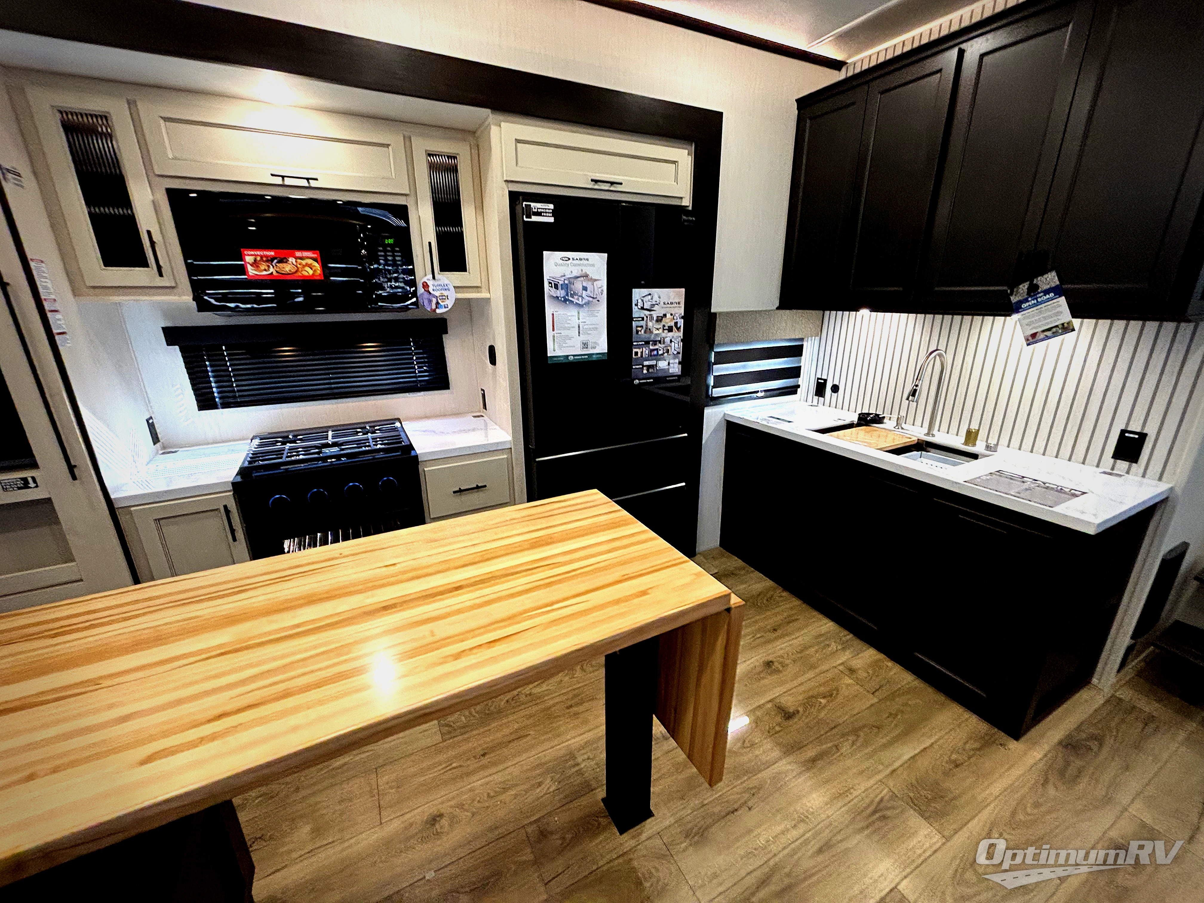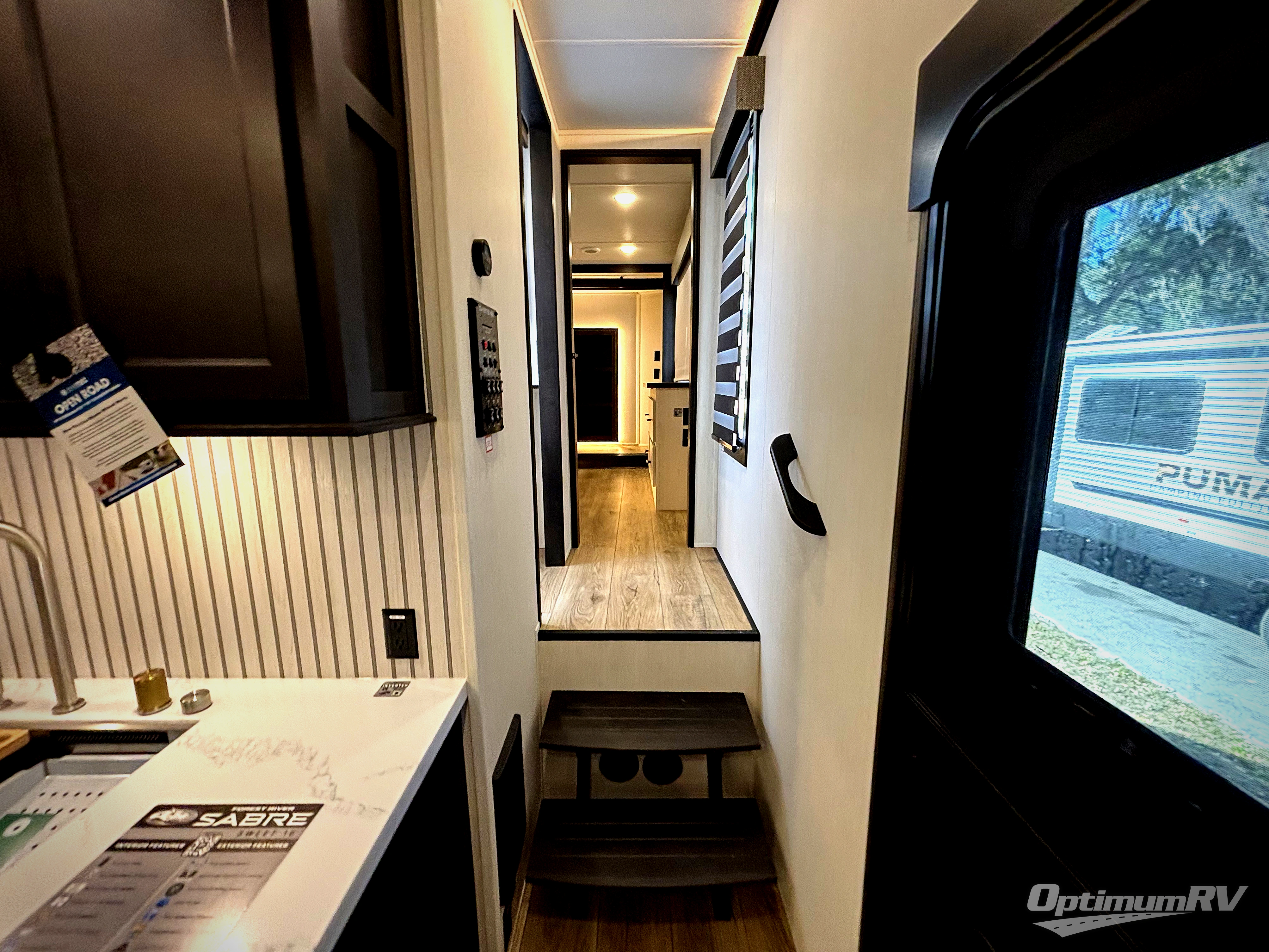 You will experience luxurious camping trips at an affordable price with any one of these Forest River Sabre fifth wheels! These models are durable and ready to travel anytime of the year thanks to features like the high-gloss gel-coat front cap with LED lighting, the PVC roof membrane, and the forced air underbelly with enclosed gate valves. The electric auto-leveling system makes setting up easy and safe, and the adjustable power awning with LED lighting will create an inviting outdoor living space. Each model includes a universal docking station which includes a black tank flush and an outside shower, and detachable and adjustable stable steps for you to enter and exit the unit safely. Inside, you will love the design of the ambient accent lighting in the living area, the real wood lumbercore cabinetry, and the linoleum flooring!