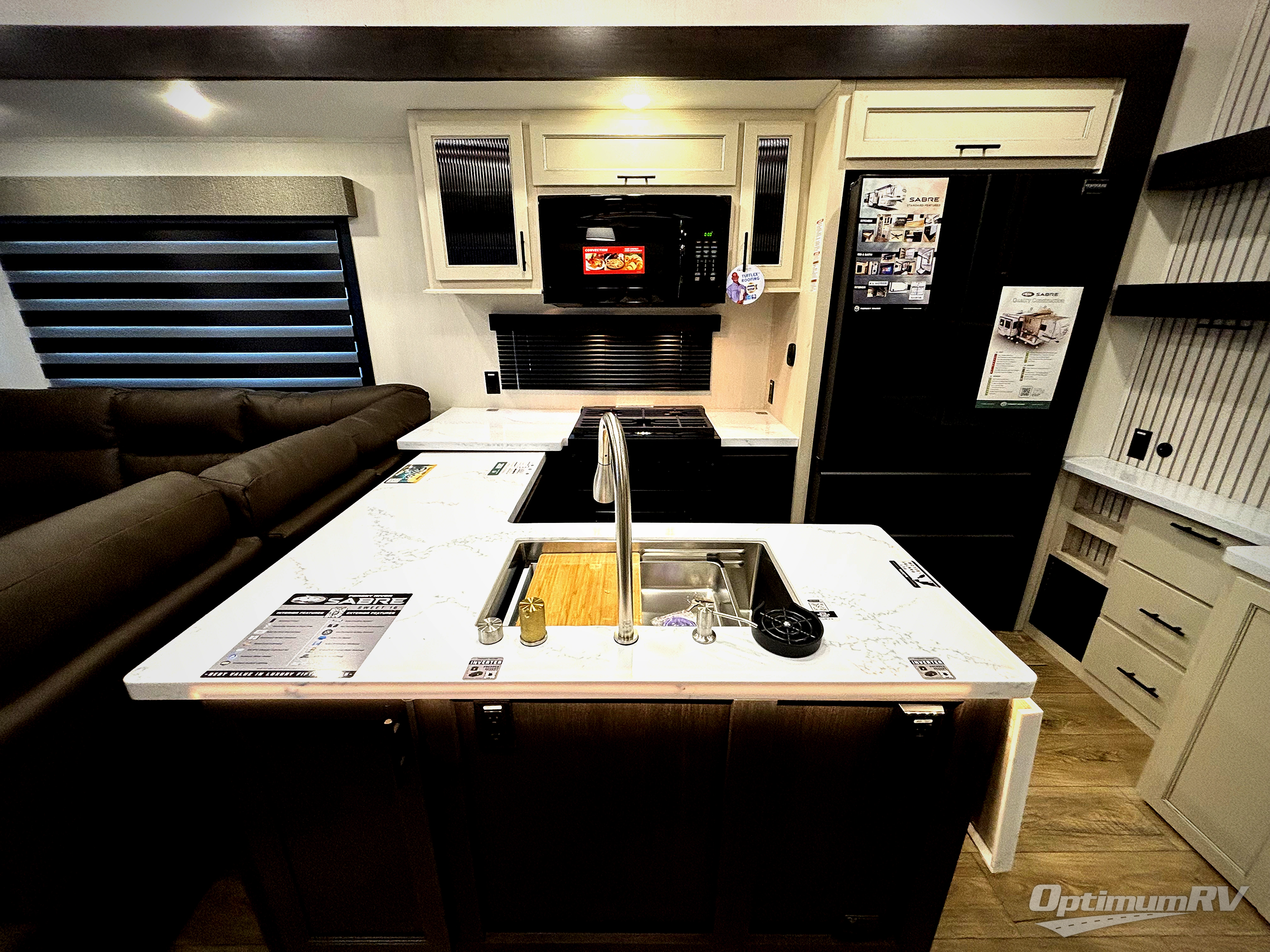 You will experience luxurious camping trips at an affordable price with any one of these Forest River Sabre fifth wheels! These models are durable and ready to travel anytime of the year thanks to features like the high-gloss gel-coat front cap with LED lighting, the PVC roof membrane, and the forced air underbelly with enclosed gate valves. The electric auto-leveling system makes setting up easy and safe, and the adjustable power awning with LED lighting will create an inviting outdoor living space. Each model includes a universal docking station which includes a black tank flush and an outside shower, and adjustable stable steps for you to enter and exit the unit safely. Inside, you will love the design of the ambient accent lighting in the living area, the real wood lumbercore cabinetry, and the linoleum flooring!