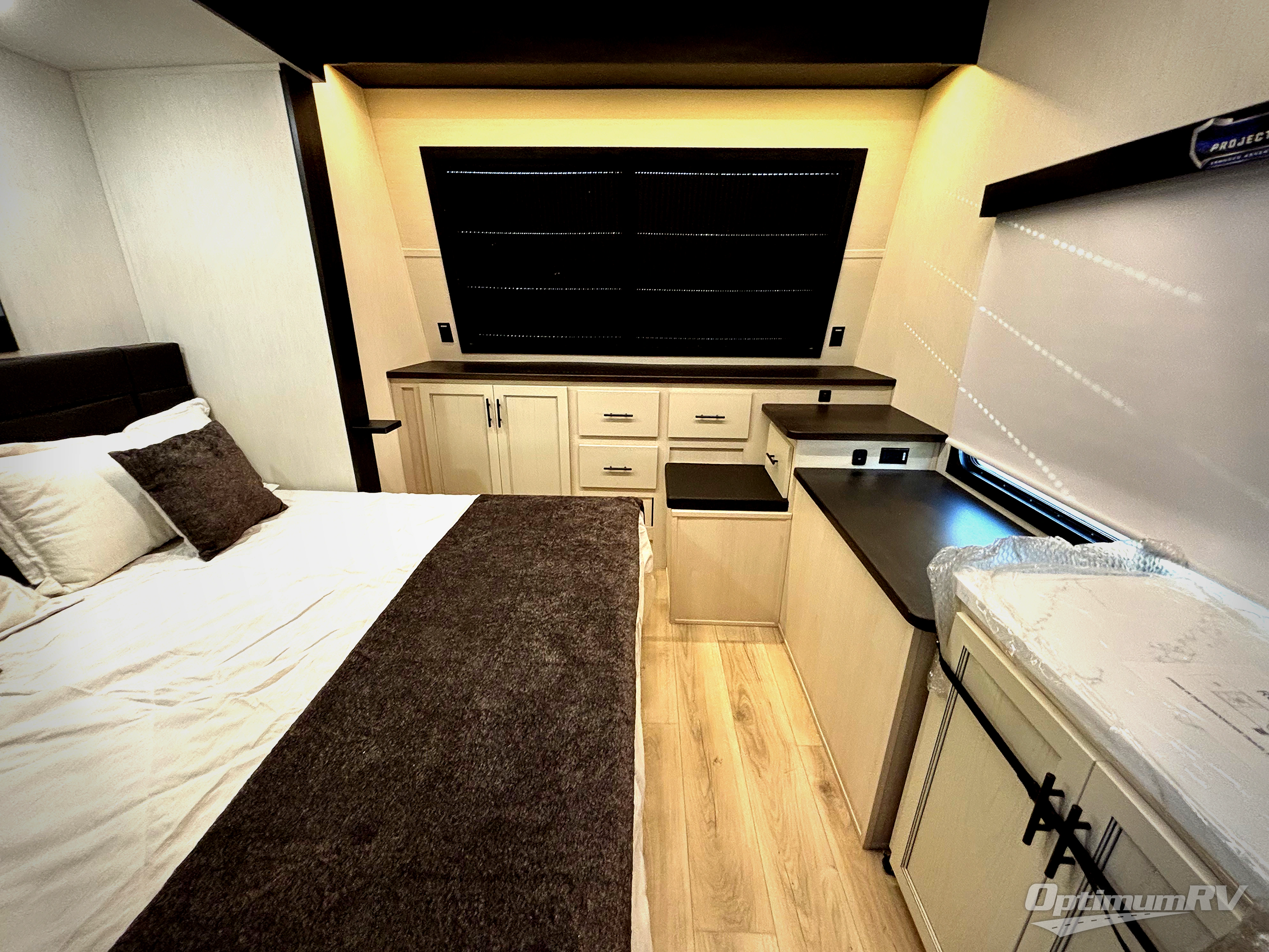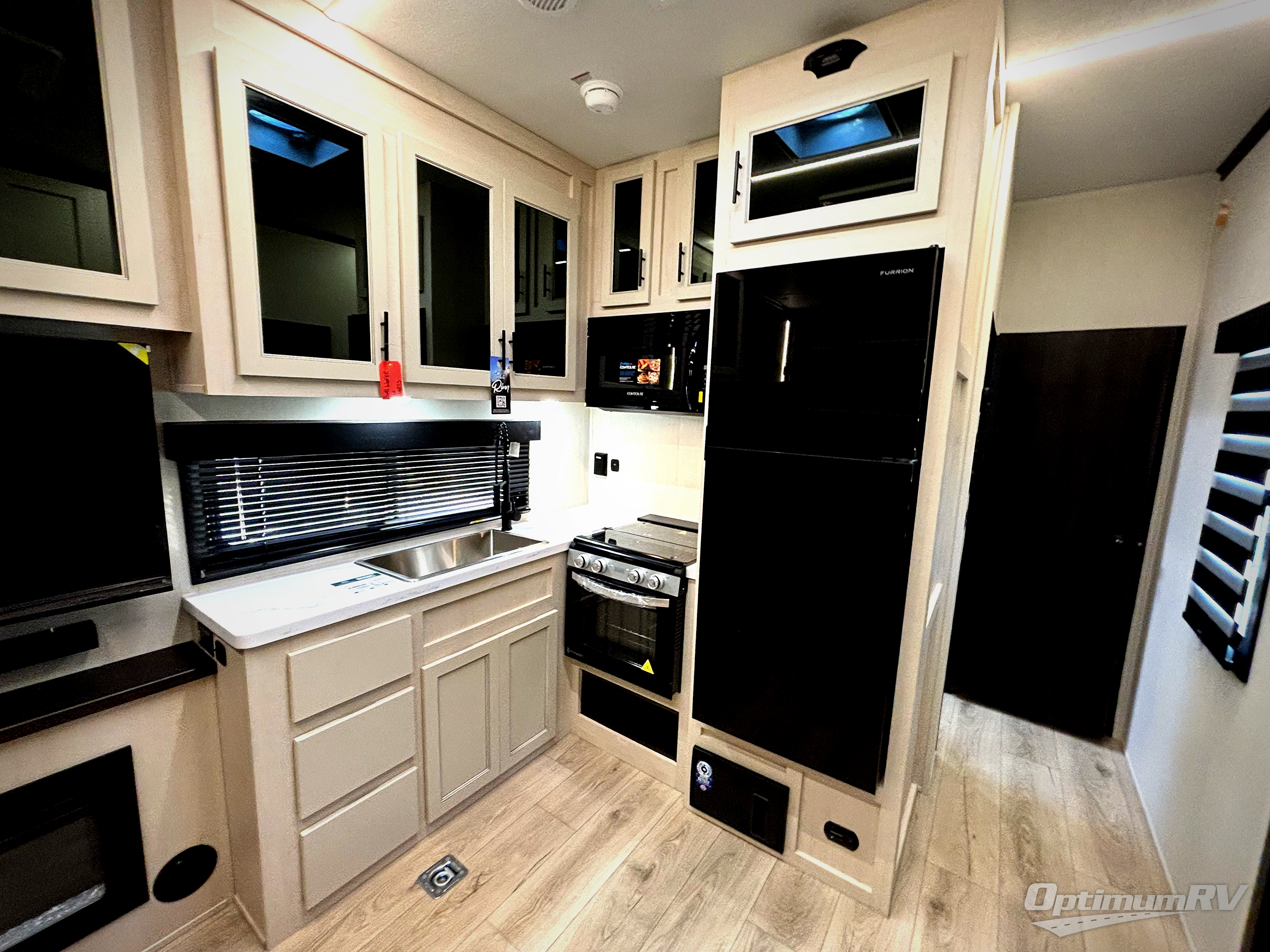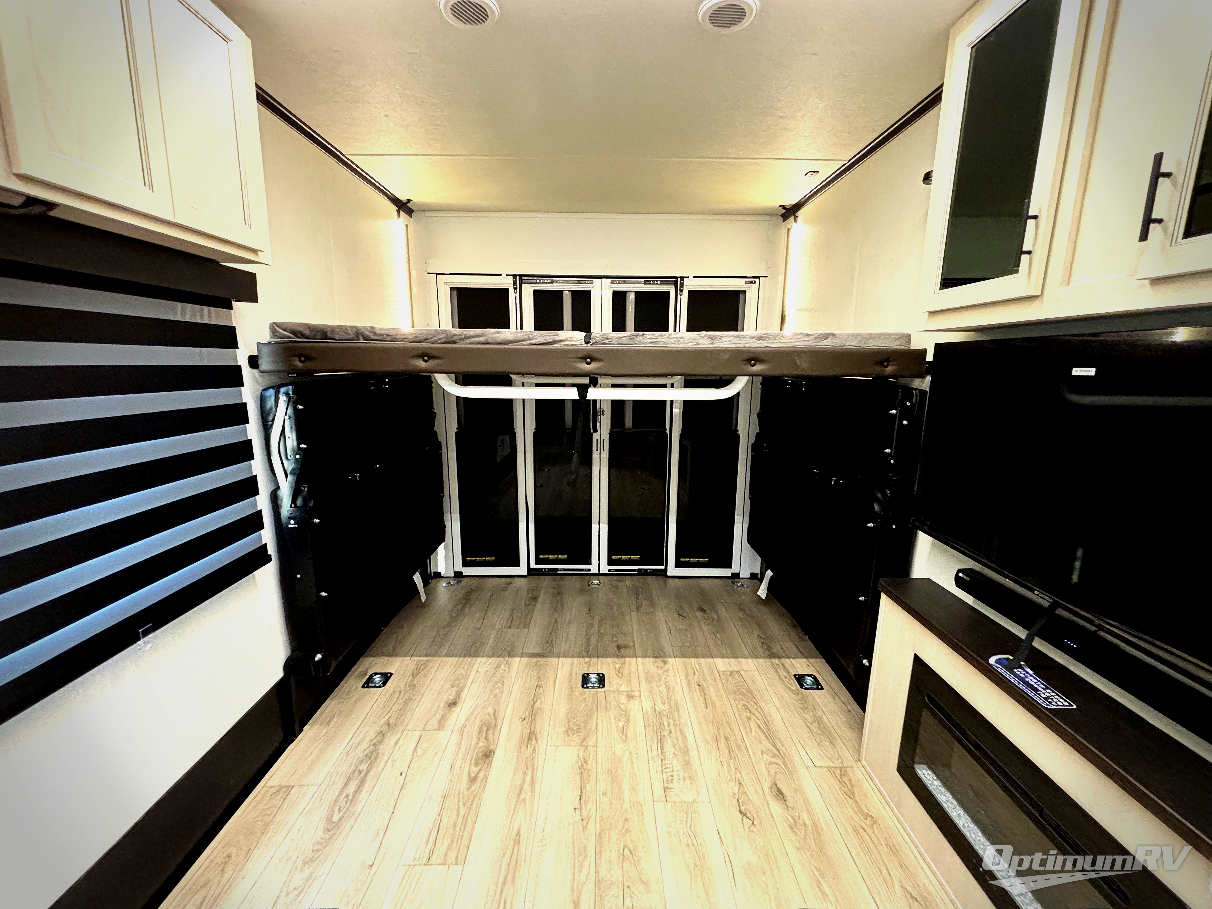 Head for the trails with this toy hauler in tow! Once your toys are unloaded from the 14' 1" garage, you can relax on the dual flip-up sofas with a queen bed above. There are also optional dual lounge chairs across from the entertainment center with a cozy fireplace! The chef of your crew can make meals inside on the three-burner cooktop, or head outdoors to utilize the outside kitchen. When you're ready to call it a night, retreat to the front private bedroom for a great night's rest on the trailer king bed slide out. There is also a large dresser here to keep your things organized.