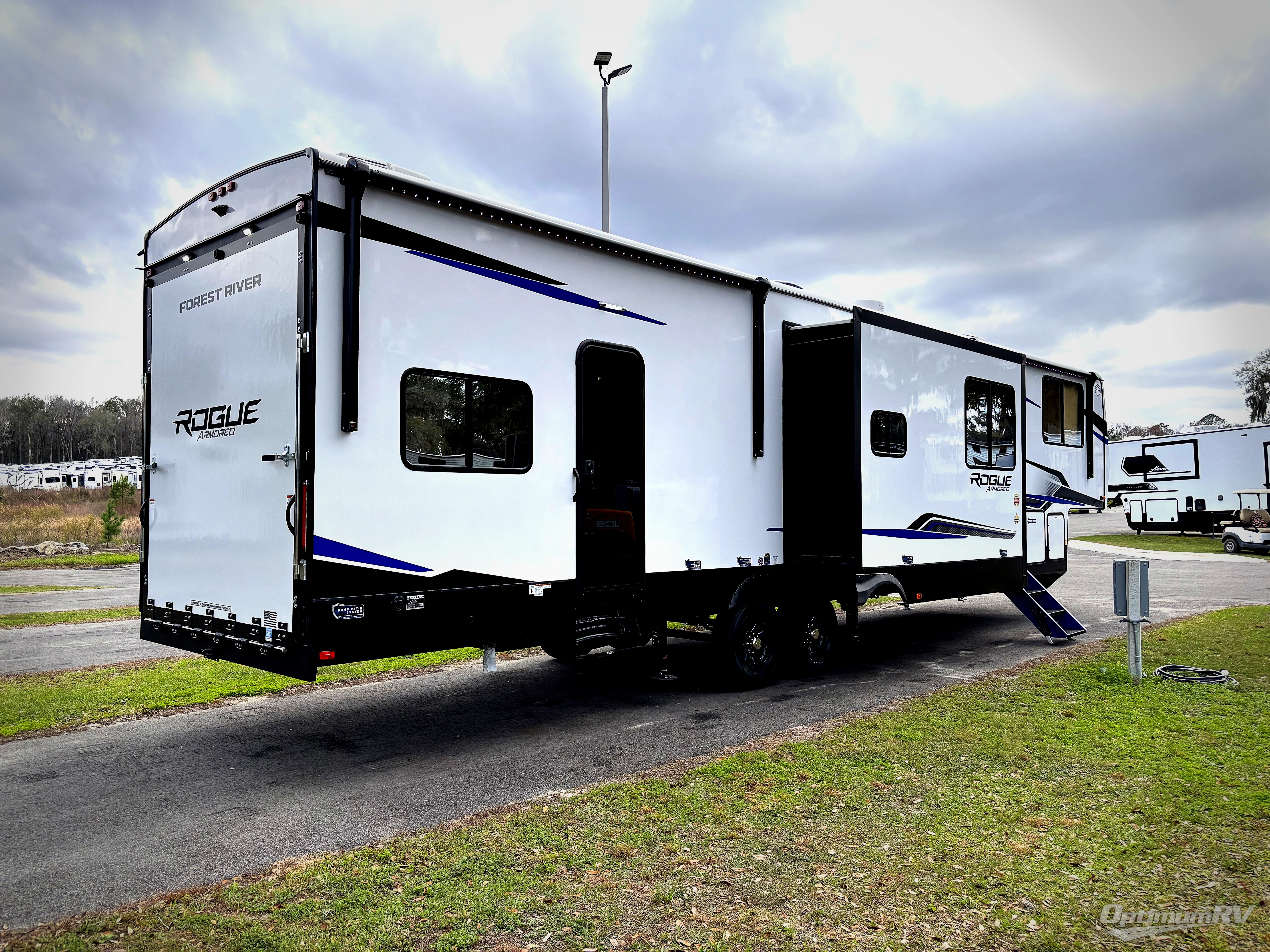 Every one of these Forest River Vengeance Rogue Armored fifth wheel toy haulers come with the features you want most at an affordable price tag! The DuraPoxy gas/oil resistant floor has 5,000 lb. tie downs to ensure your toys will arrive safely without damaging the flooring, plus the 3,000 lb. rated ramp door makes it easy to load them. Two 15,000 BTU A/Cs are "Super H Ducted" to keep you cool even on the hottest summer days, and the heated enclosed holding tanks help protect against the elements. Each model also includes a 6-point leveling system, dual LED cargo lights, solar reflective windows, and a tire pressure monitoring system. Inside, you'll enjoy the solid surface countertops, glass shower door, zebra shades in the living room, and stainless-steel multi-purpose sink to name a few comforts!