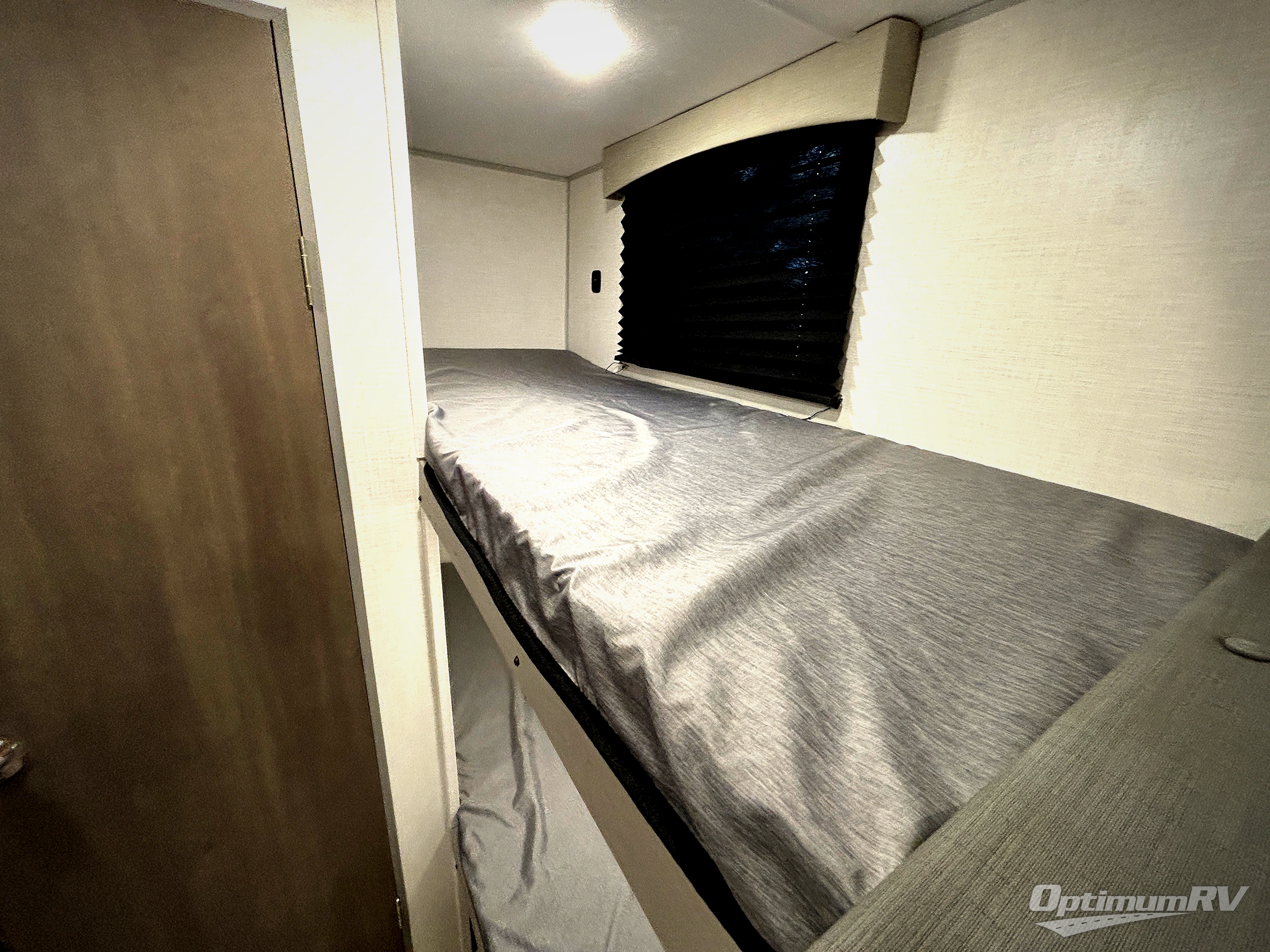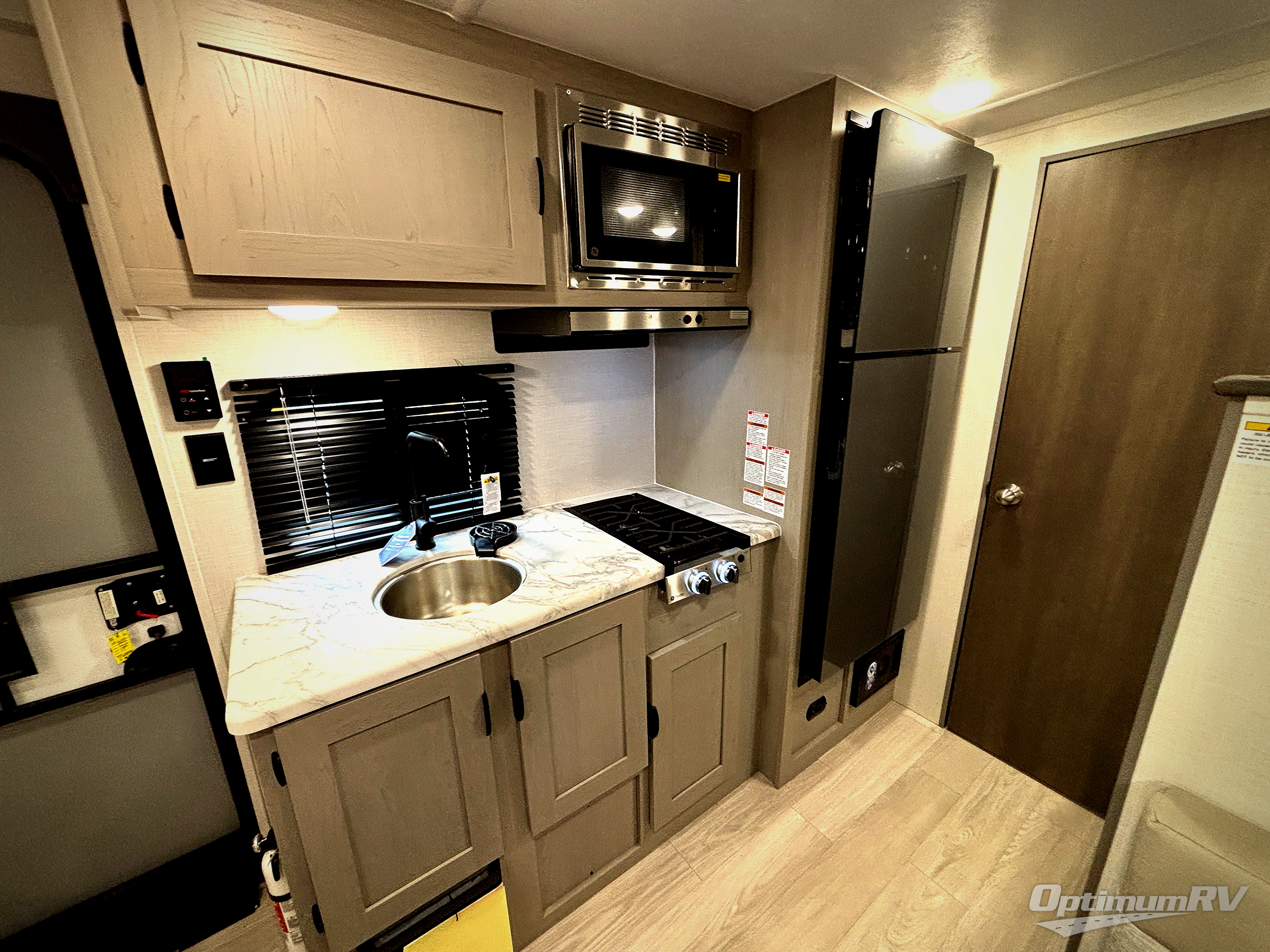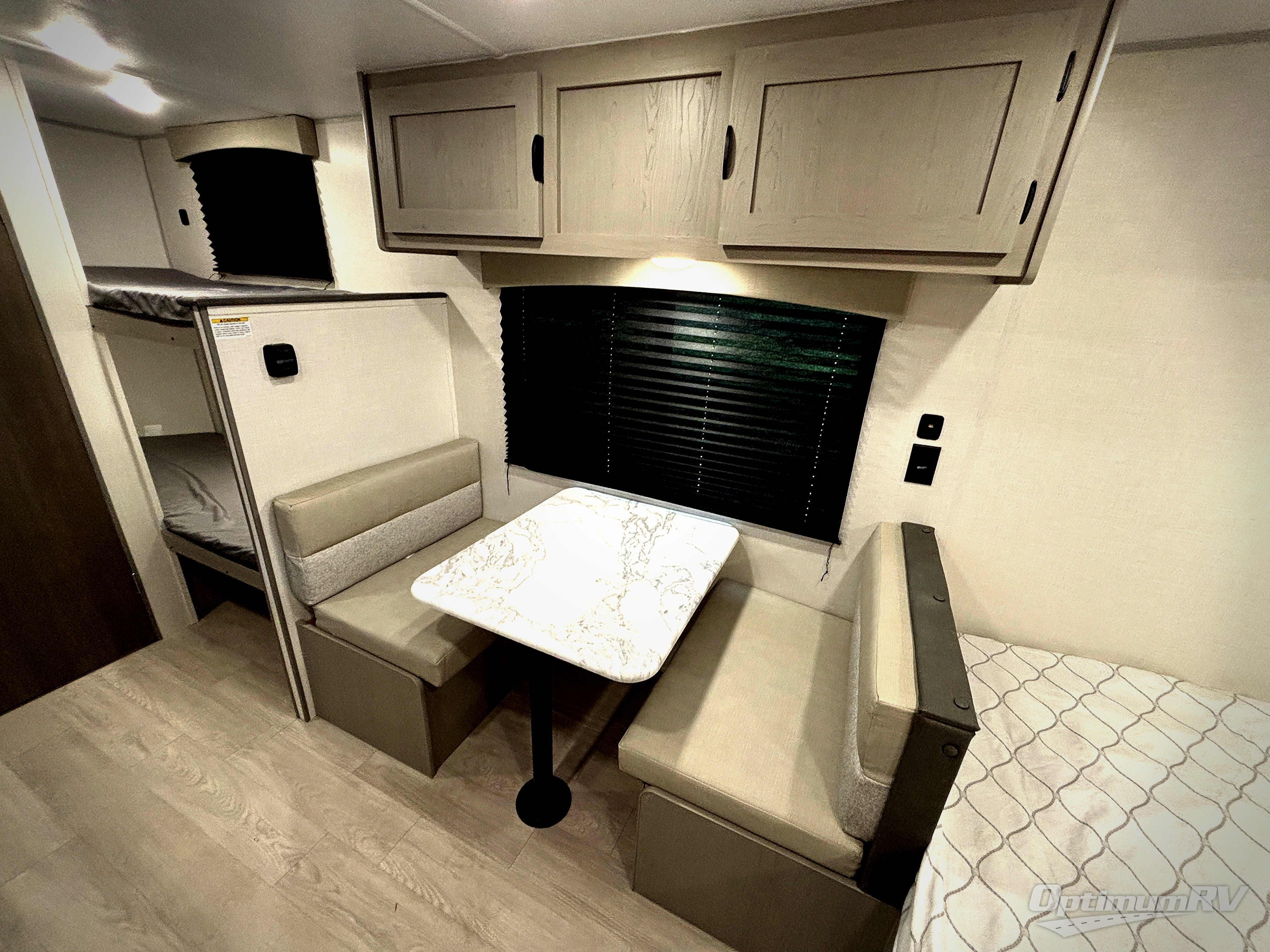 This is the perfect travel trailer for a family of four or five since it includes bunk beds for the kids, and a queen bed up front as well as a booth dinette that can be converted to sleep one more. There is an induction cooktop to cook meals on, and a sink to easily clean up each day. You can dine at the booth dinette or take your plate outdoors to sit under the 10' power awning with LED lighting. This model also includes a 24" x 36" shower to get cleaned up each day. Get an early start on family vacations with this travel trailer in tow!