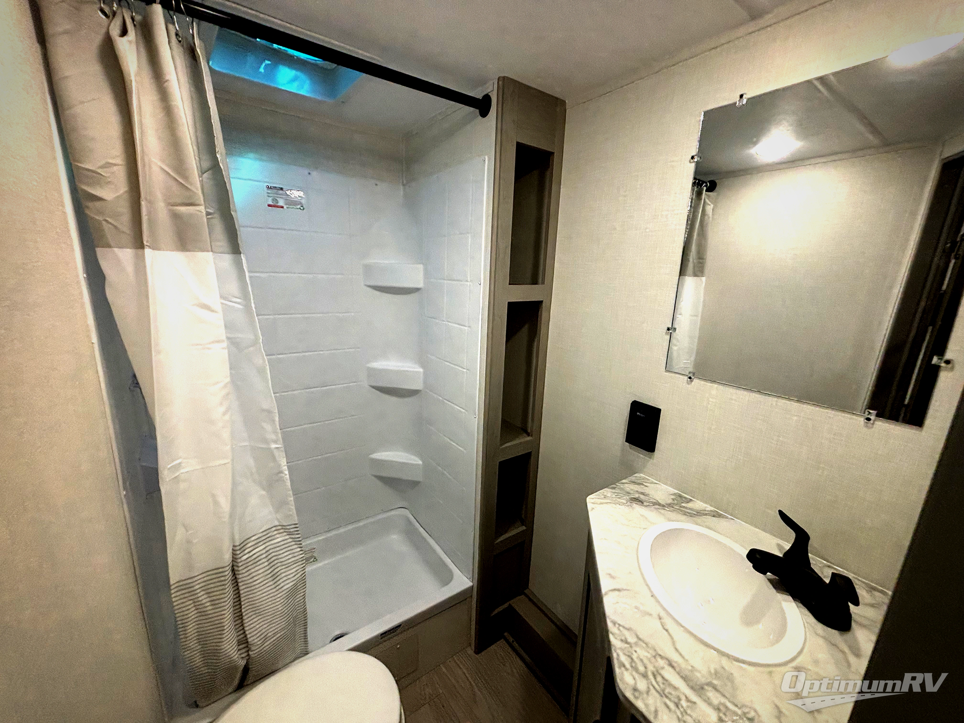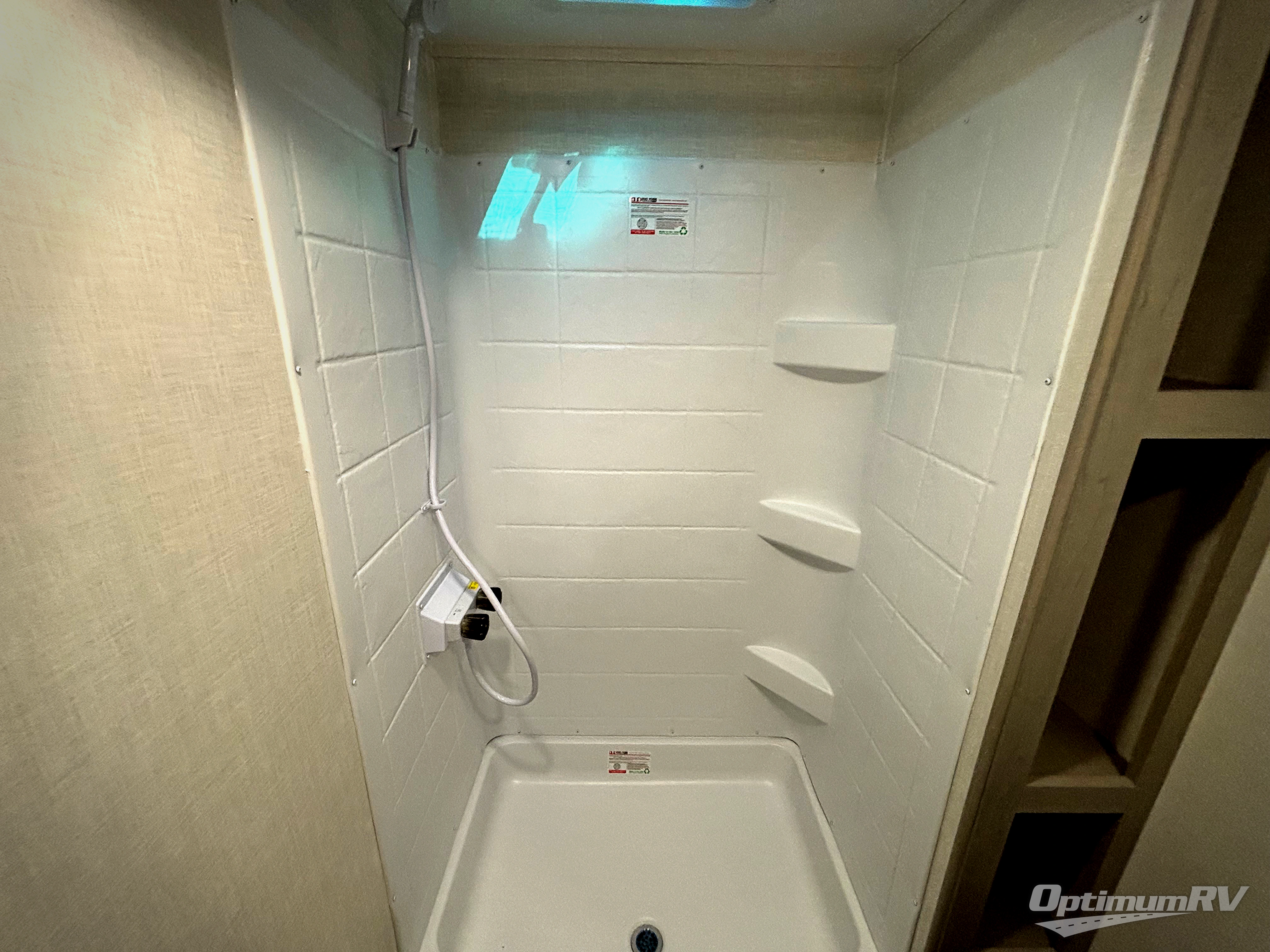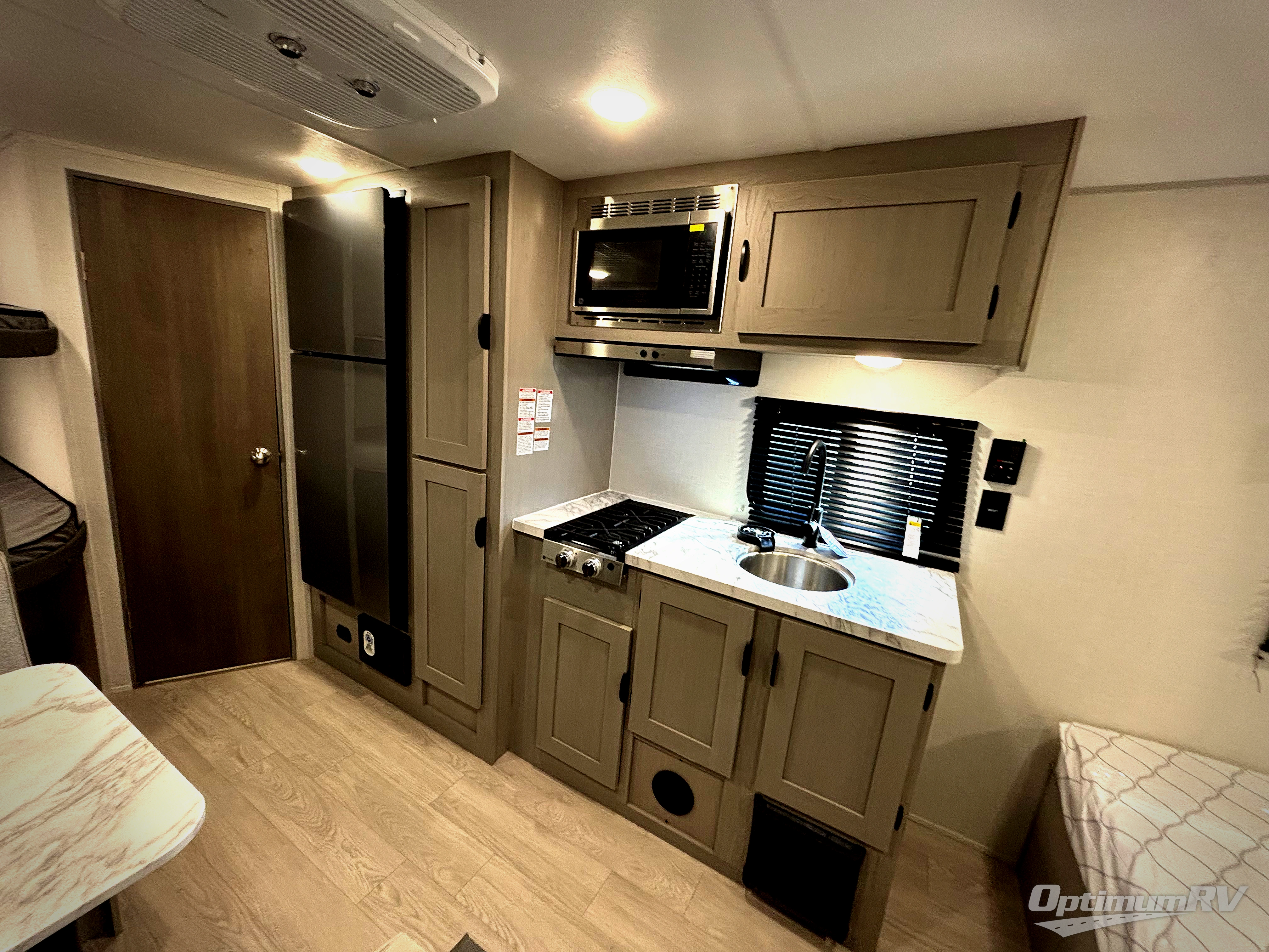This travel trailer is perfect for a small family who wants to escape the hustle and bustle of everyday life! The front 60" x 74" bed offers a comfortable place to lay your head at night, and there is a wardrobe and overhead shelf to store your items. Prepare a delicious home cooked meal with the two burner cooktop, 10 cu. ft. refrigerator and a sink with cup rinser. You can dine at the booth dinette with overhead cabinets for more storage space. The kiddos can sleep on the set of 42" x 72" bunk beds and will enjoy how easy it is to access the rear corner bathroom right next to them!