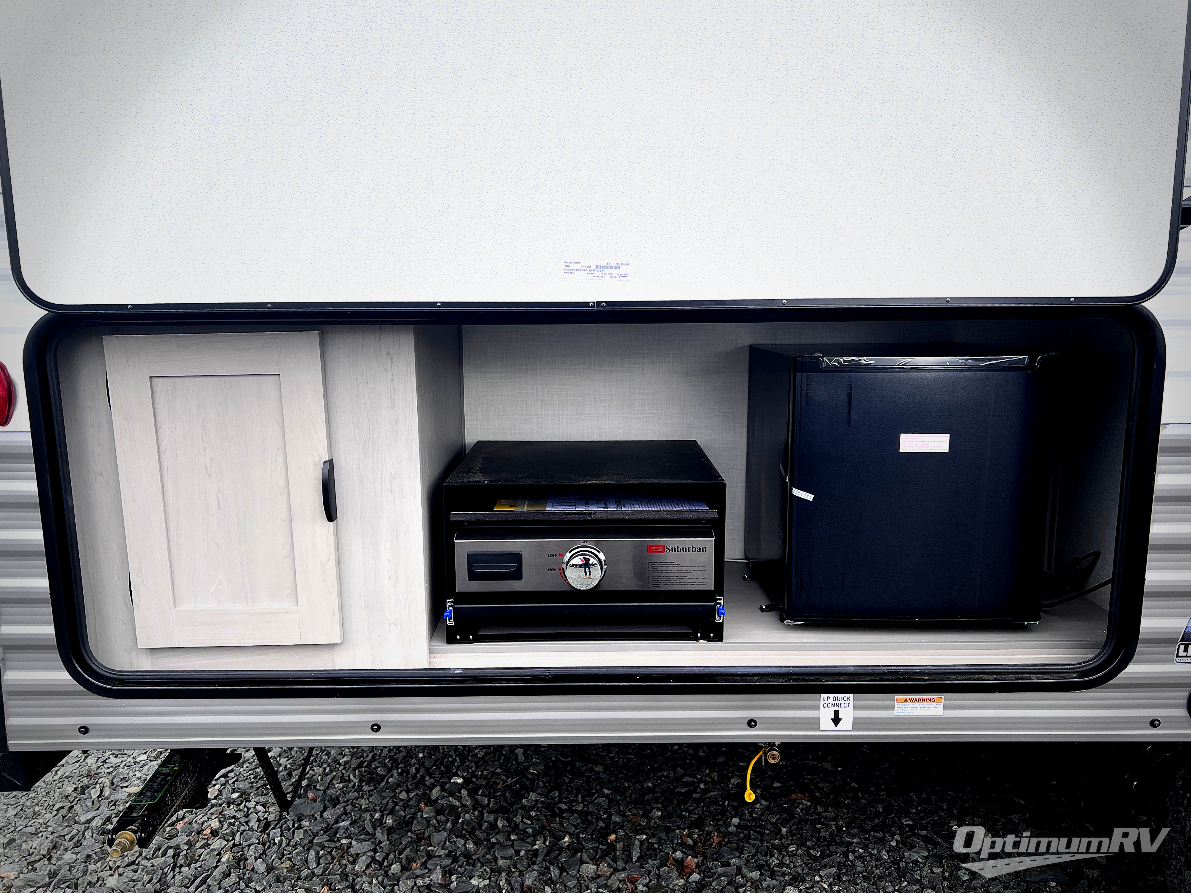 This travel trailer is perfect for a small family who wants to escape the hustle and bustle of everyday life! The front 60" x 74" bed offers a comfortable place to lay your head at night, and there is a wardrobe and overhead shelf to store your items. Prepare a delicious home cooked meal with the two burner cooktop, 10 cu. ft. refrigerator and a sink with cup rinser. You can dine at the booth dinette with overhead cabinets for more storage space. The kiddos can sleep on the set of 42" x 72" bunk beds and will enjoy how easy it is to access the rear corner bathroom right next to them!