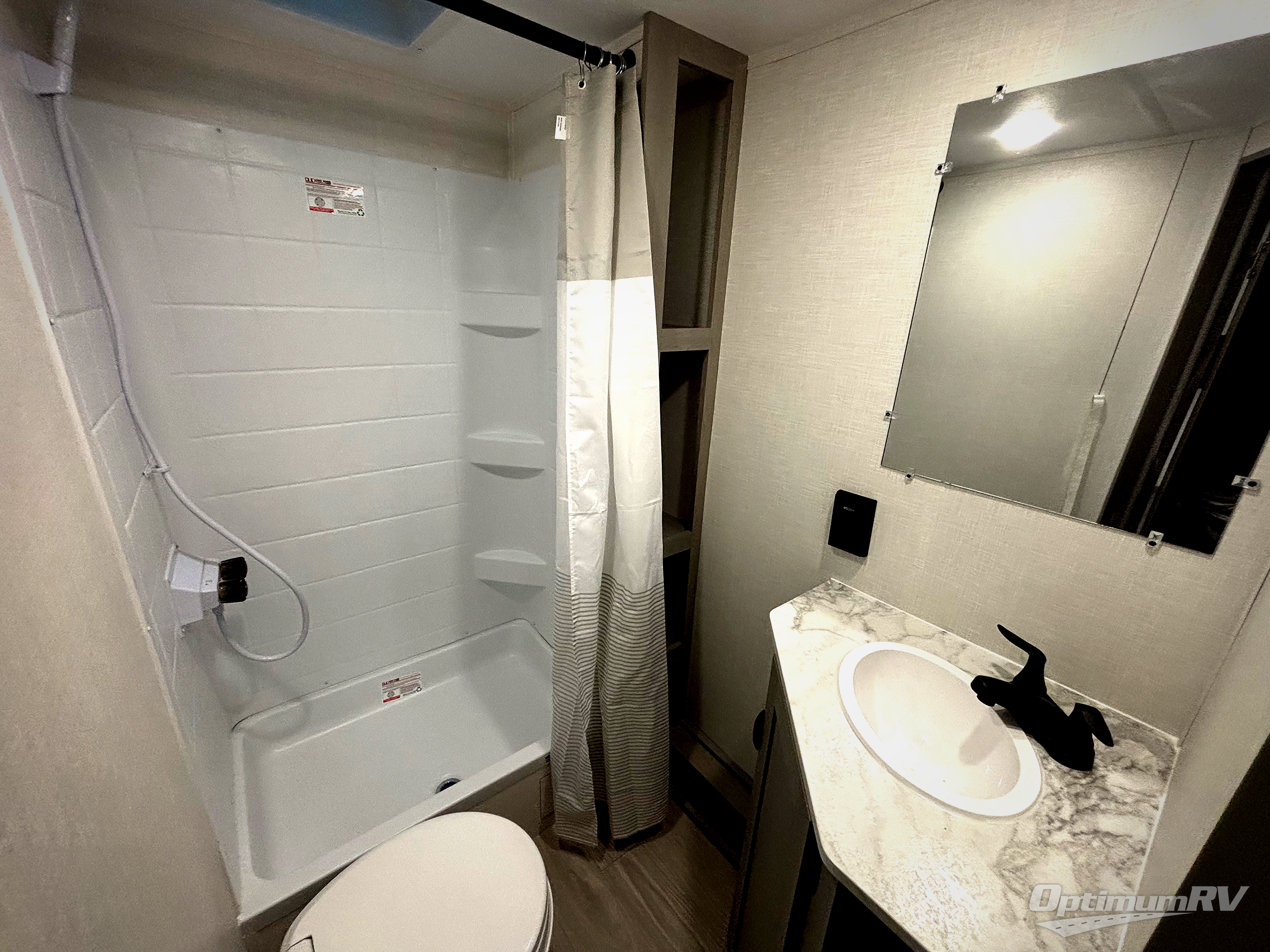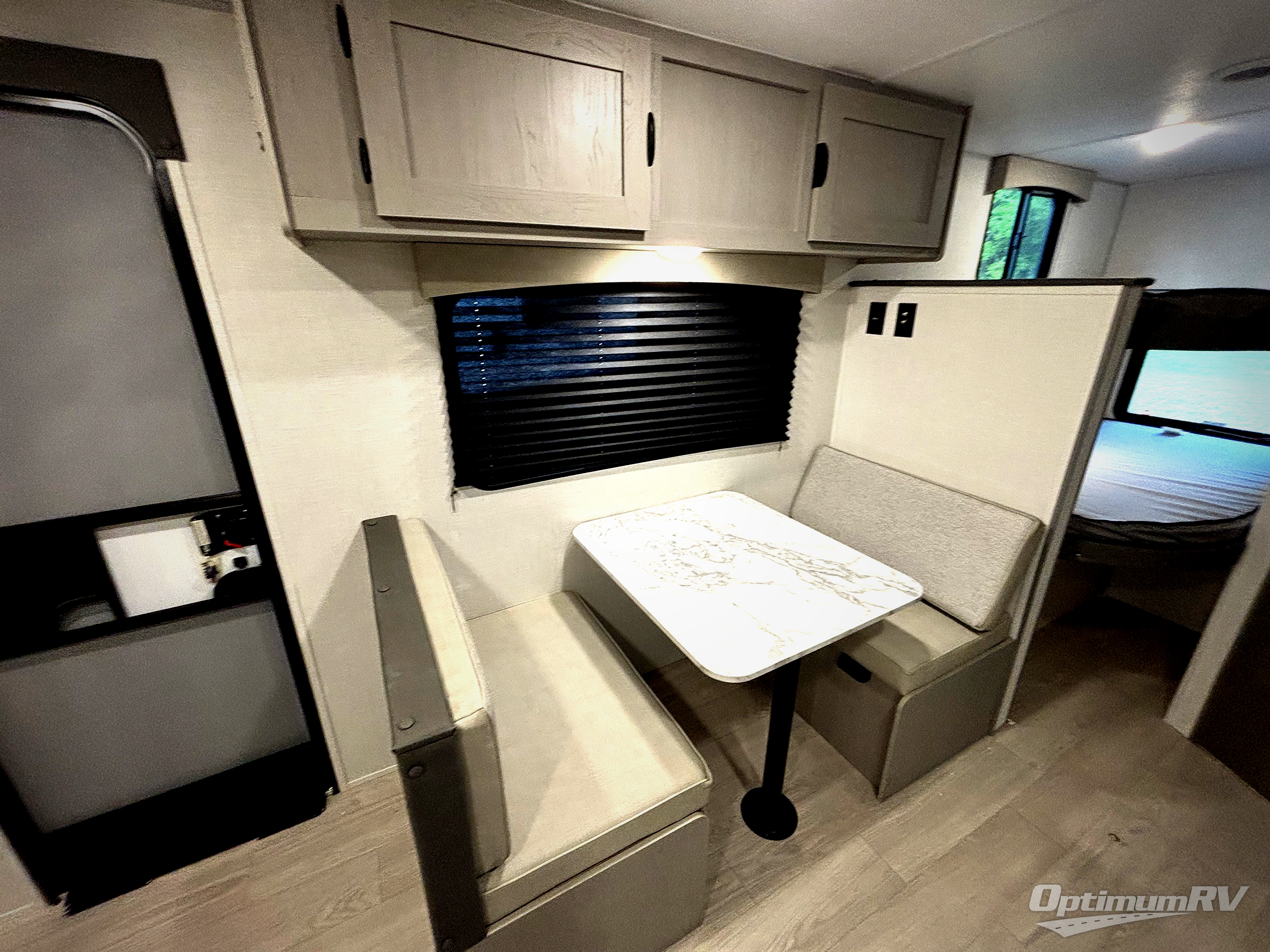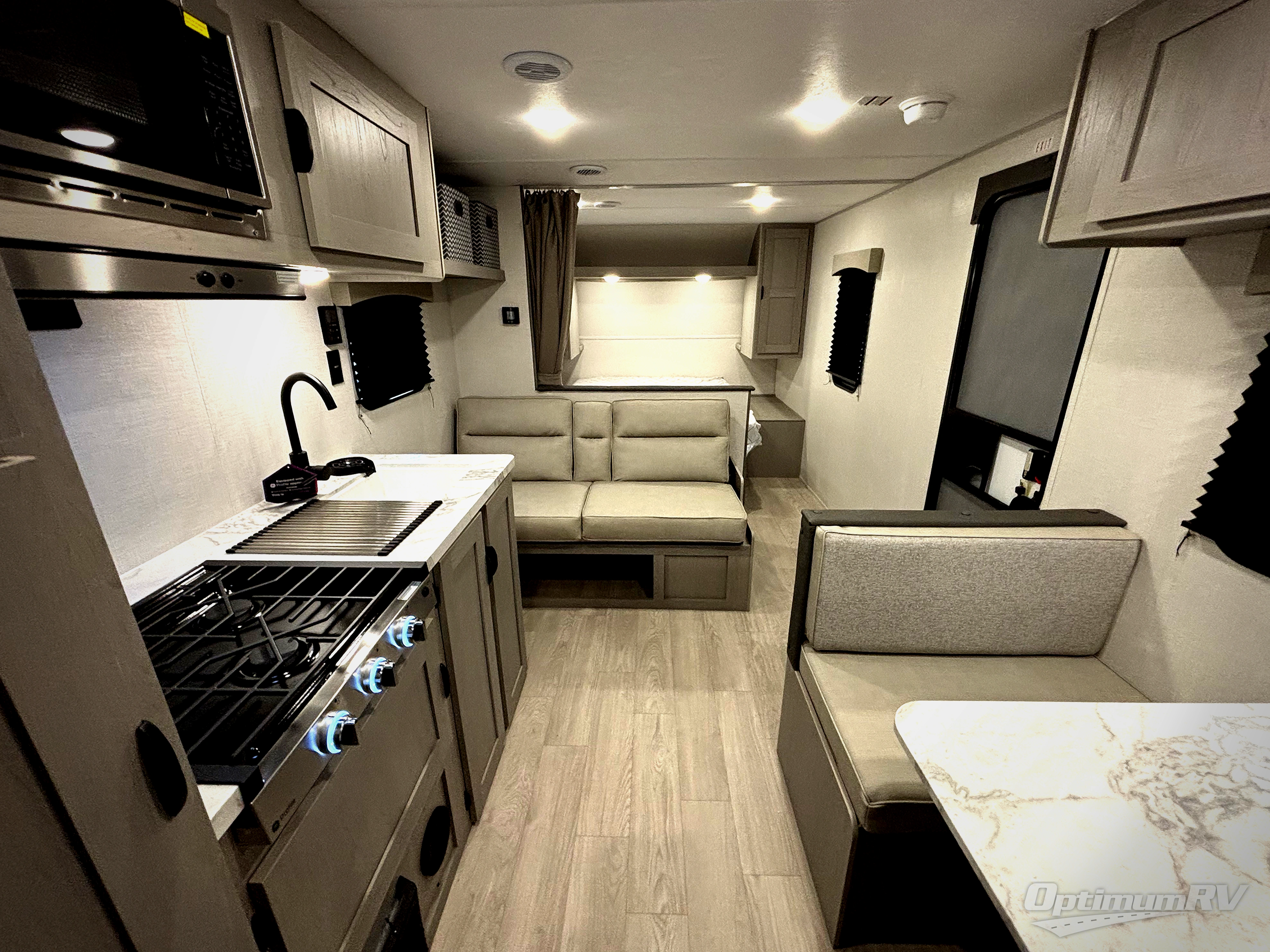 Bring the whole family with you in this travel trailer! The kiddos can sleep on the rear corner set of double-size bunks. The opposite rear corner features a full bath including a 24" x 36" shower, linen cabinet, toilet, and vanity. In the main living space, you will find plenty of seating with a booth dinette and jackknife sofa which can also transform into an extra sleeping space if needed. Everyone's bellies will stay full with the induction cooktop, 10 cu. ft. 12-volt refrigerator, and microwave which you can use to pop a bag of popcorn for movie night. You will enjoy the front bedroom for a bit of privacy including a queen bed and large overhead shelf for your things. On the outside, a large front pass-through for lawn chairs and camp gear. There is more storage beneath the bunks in back and a nice 15' awning to provide protection from the elements when outdoors.
