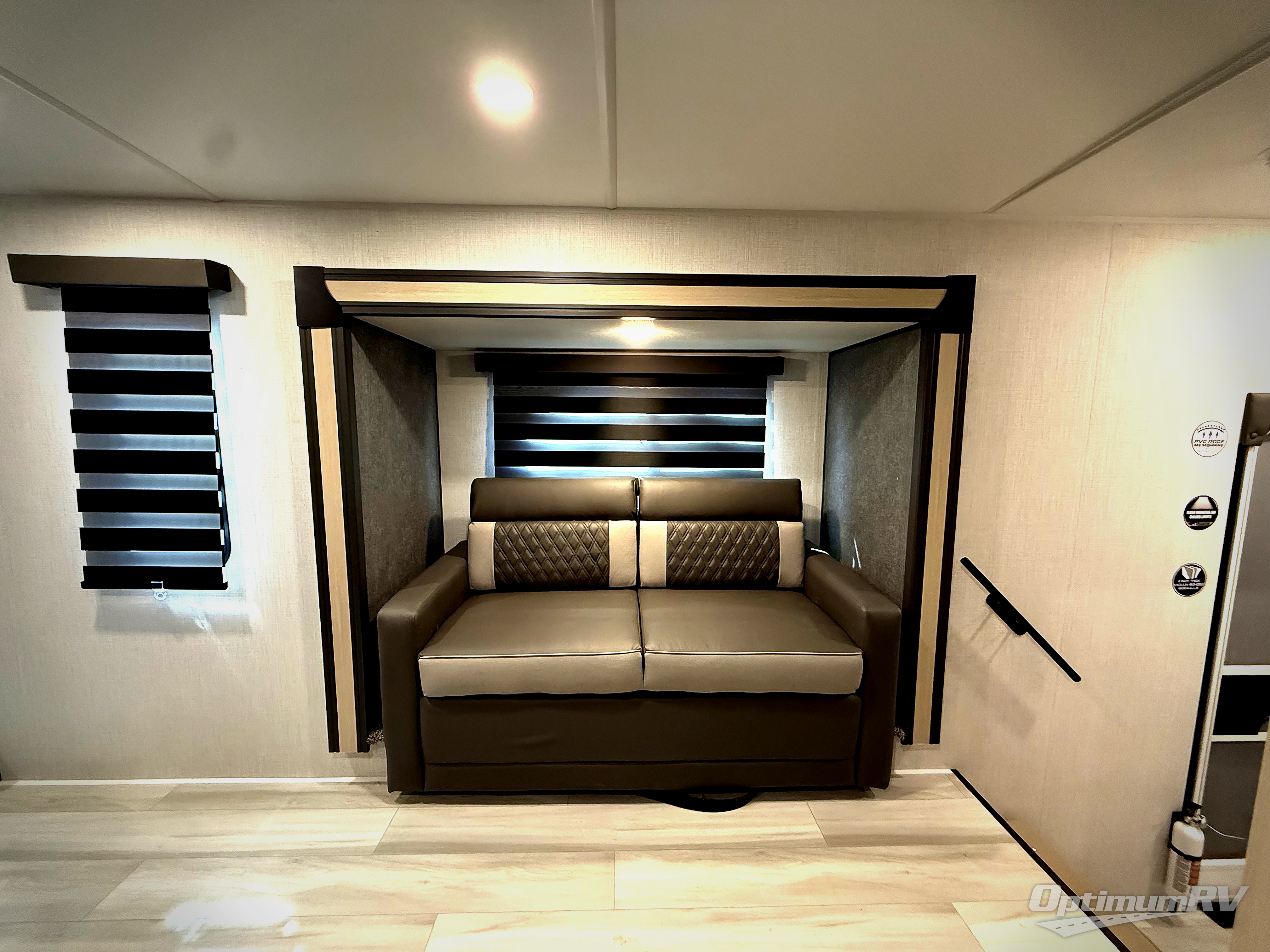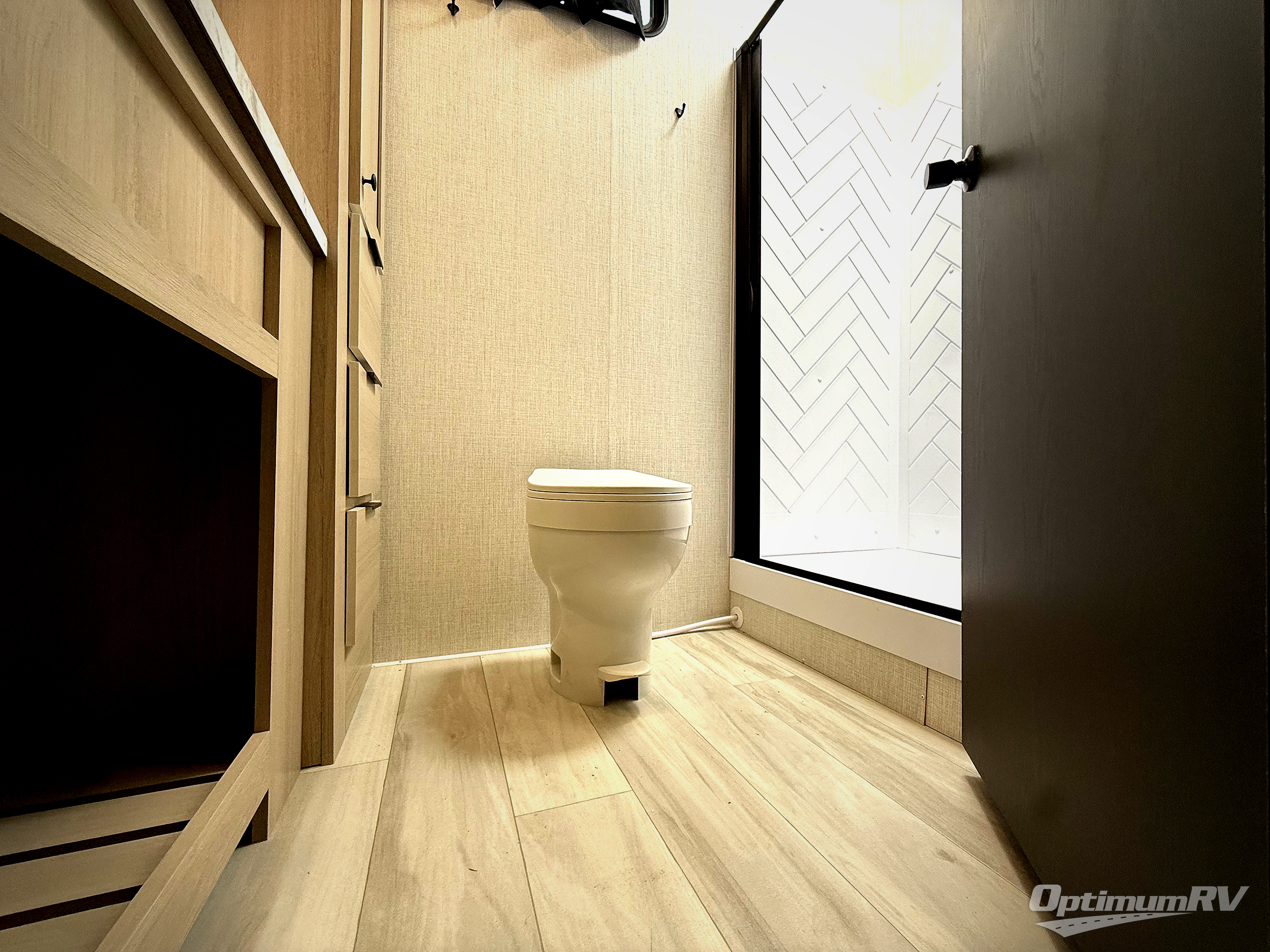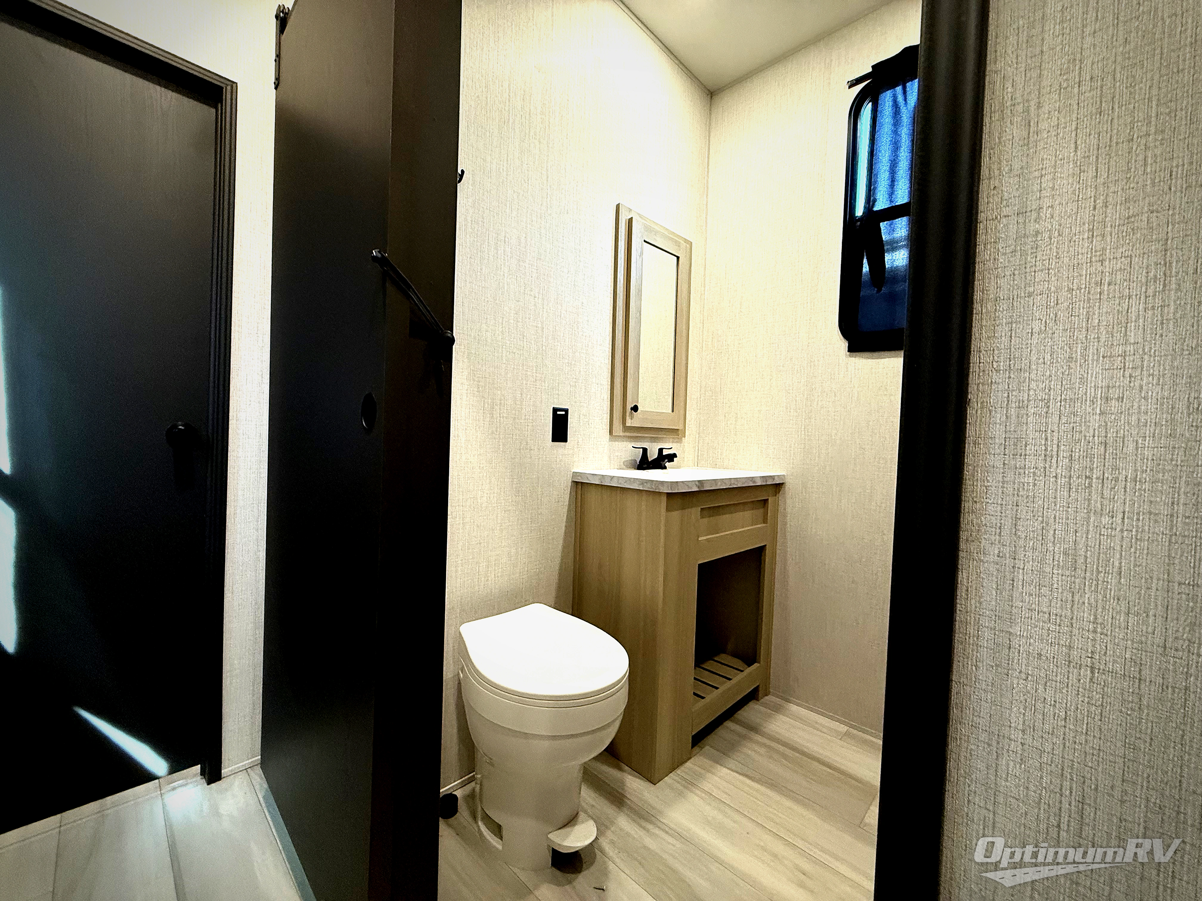 At the front, you’ll find a fully equipped kitchen designed for comfort and convenience, offering ample overhead cabinetry, a spacious 16 cu. ft. refrigerator, a 30" microwave, and a 21" 2-in-1 oven range to handle everything from quick snacks to full meals. Enjoy dining or game nights at the Hi-Top table and chairs before moving into the inviting living room, which provides generous seating for movie nights with loved ones, including theater seating and two tri-fold hide-a-bed sofas that easily convert into additional sleeping space when needed. Adjacent to the living area is a convenient half bath featuring a folding table for laundry. Toward the front, the private bedroom offers a relaxing retreat with a 66" x 80" king bed in a slide-out for added floor space, a wardrobe for clothing and essentials, and a desk/vanity across from the bed for work or getting ready for the day. Completing the layout at the rear is a full bathroom equipped with a foot-flush toilet, a walk-in shower, and a linen closet to keep toiletries neatly organized.