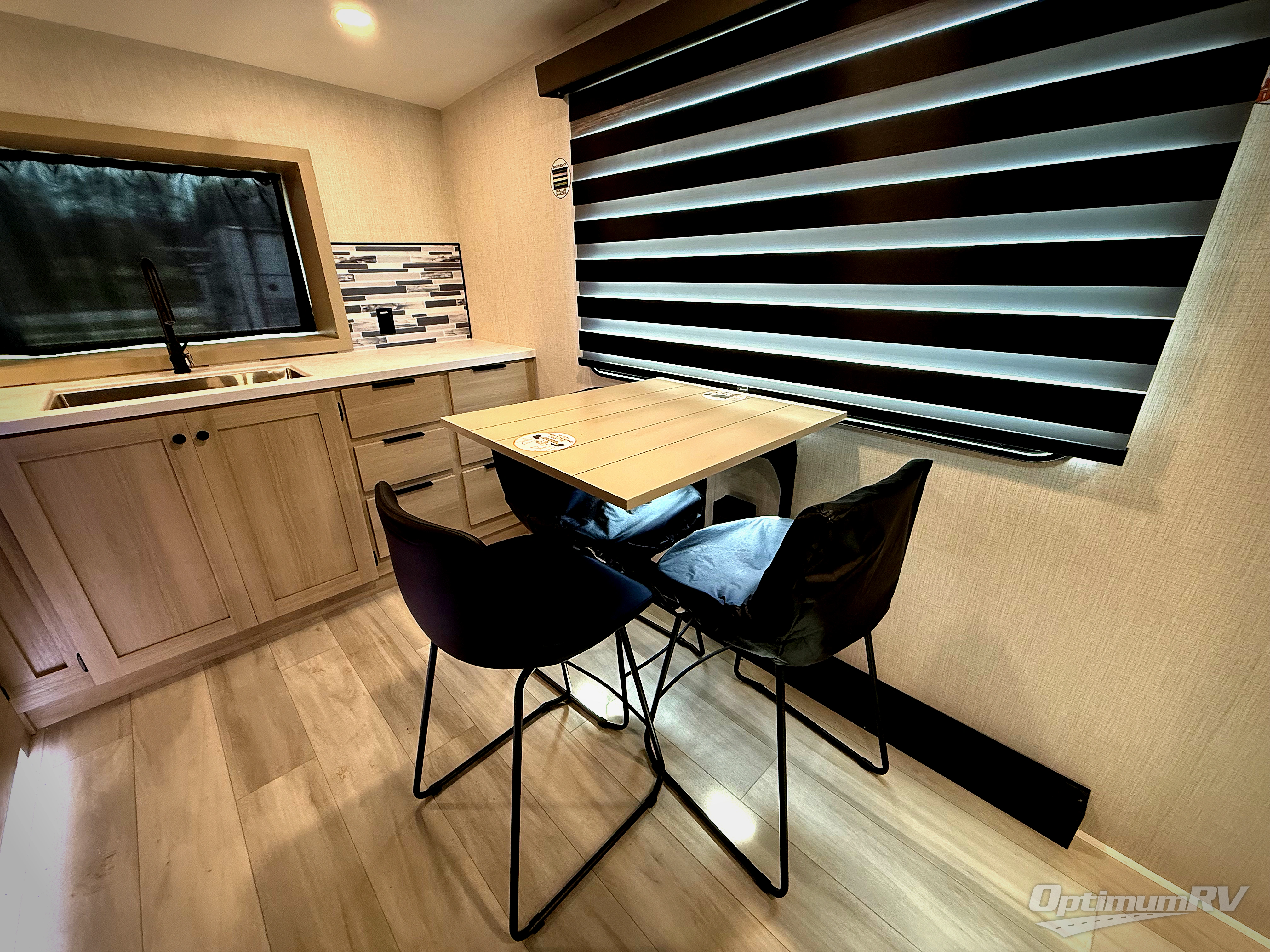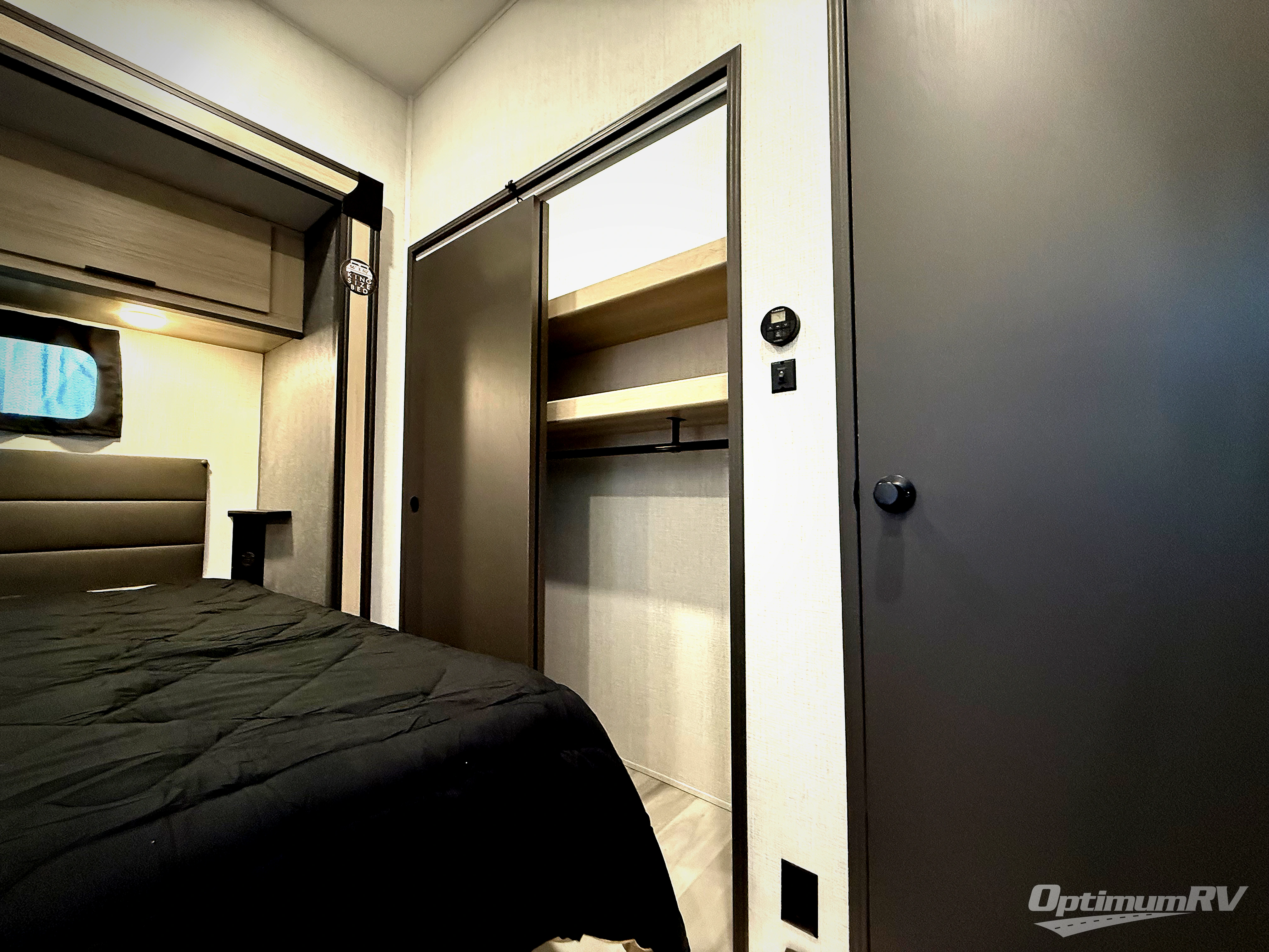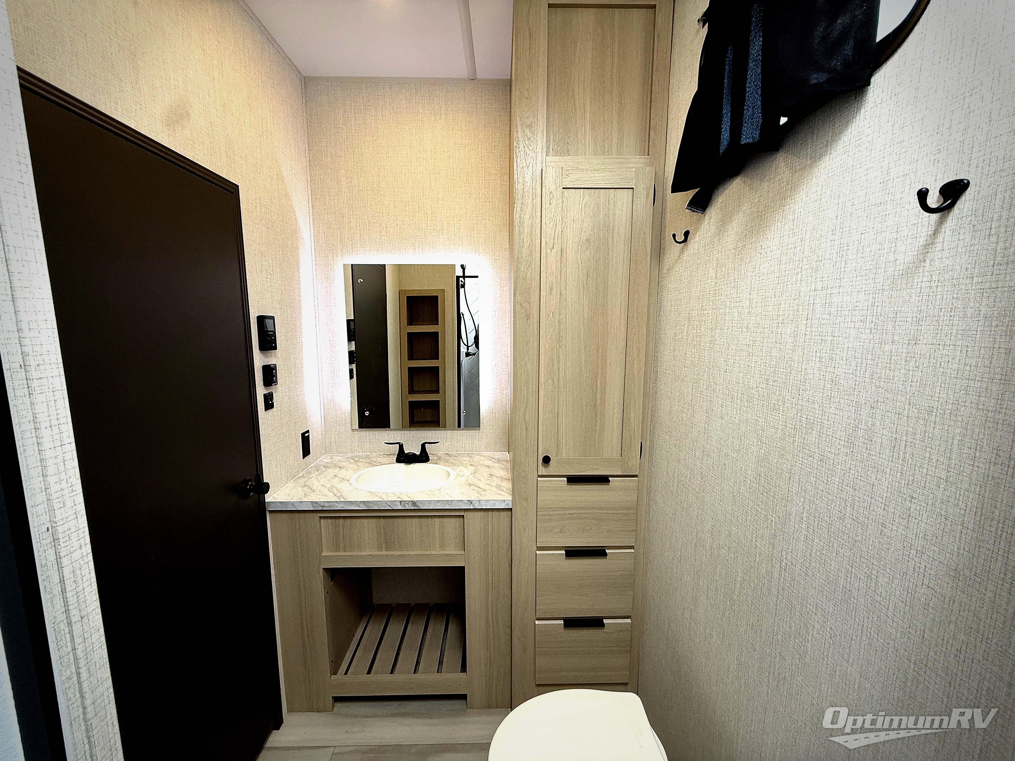 At the front, you’ll find a fully equipped kitchen designed for comfort and convenience, offering ample overhead cabinetry, a spacious 16 cu. ft. refrigerator, a 30" microwave, and a 21" 2-in-1 oven range to handle everything from quick snacks to full meals. Enjoy dining or game nights at the Hi-Top table and chairs before moving into the inviting living room, which provides generous seating for movie nights with loved ones, including theater seating and two tri-fold hide-a-bed sofas that easily convert into additional sleeping space when needed. Adjacent to the living area is a convenient half bath featuring a folding table for laundry. Toward the front, the private bedroom offers a relaxing retreat with a 66" x 80" king bed in a slide-out for added floor space, a wardrobe for clothing and essentials, and a desk/vanity across from the bed for work or getting ready for the day. Completing the layout at the rear is a full bathroom equipped with a foot-flush toilet, a walk-in shower, and a linen closet to keep toiletries neatly organized.
