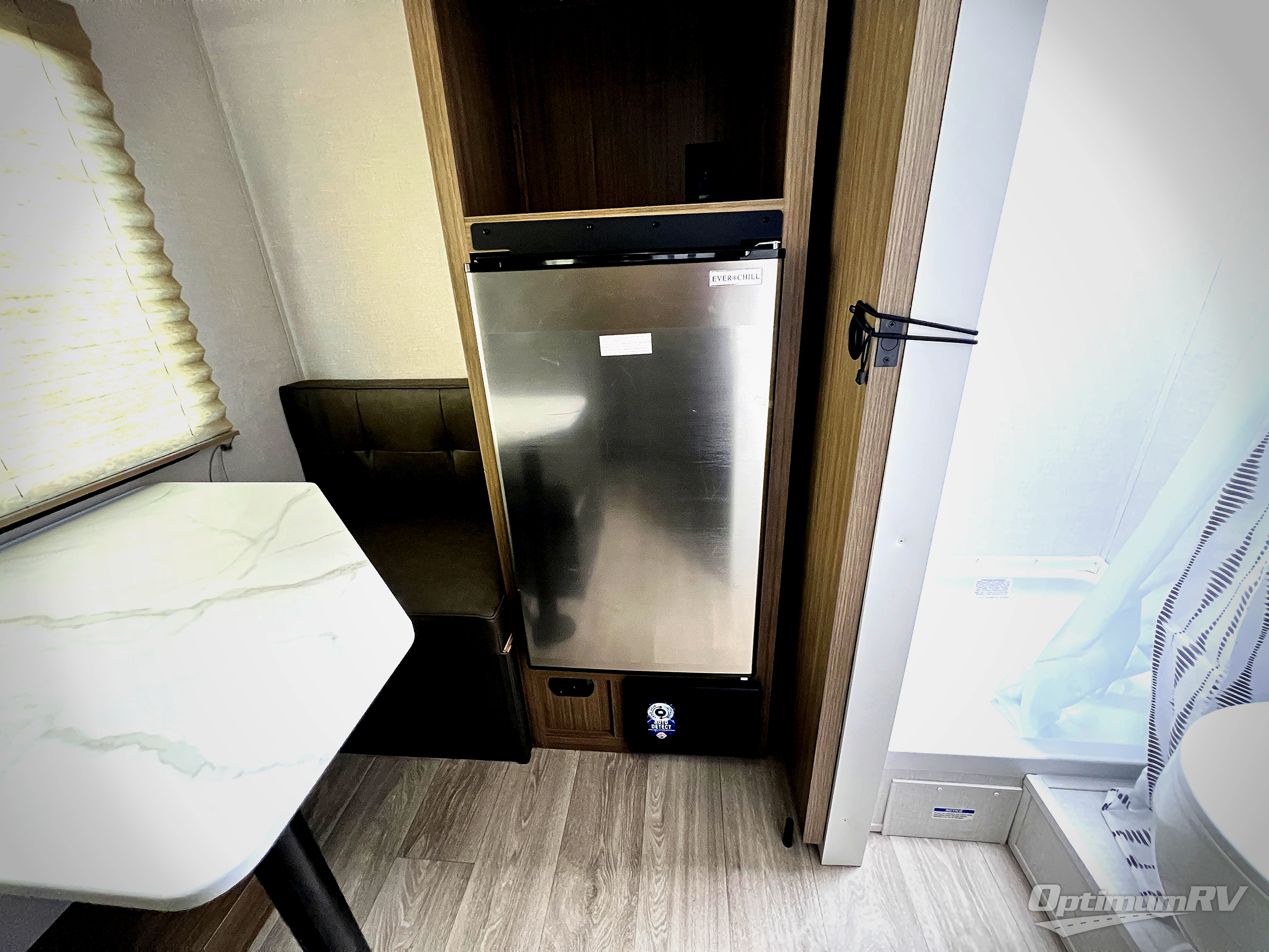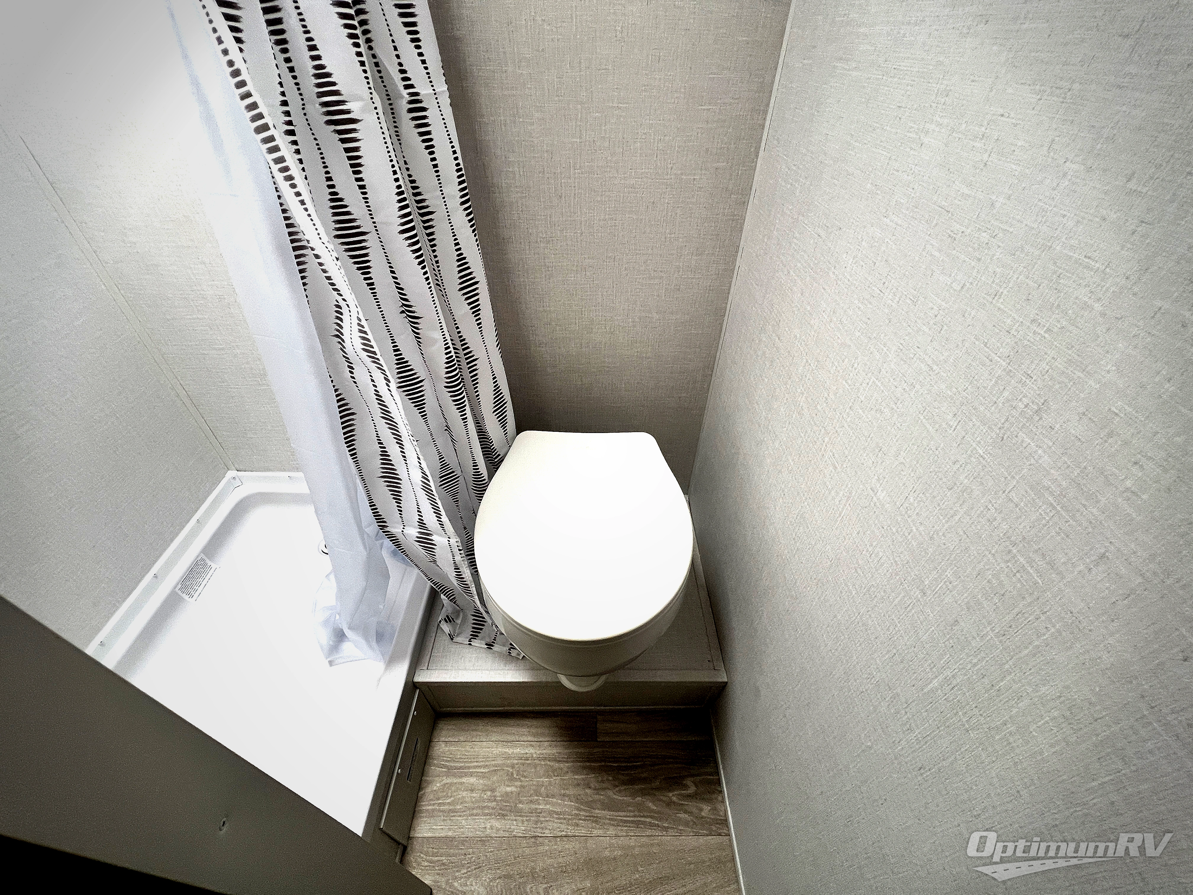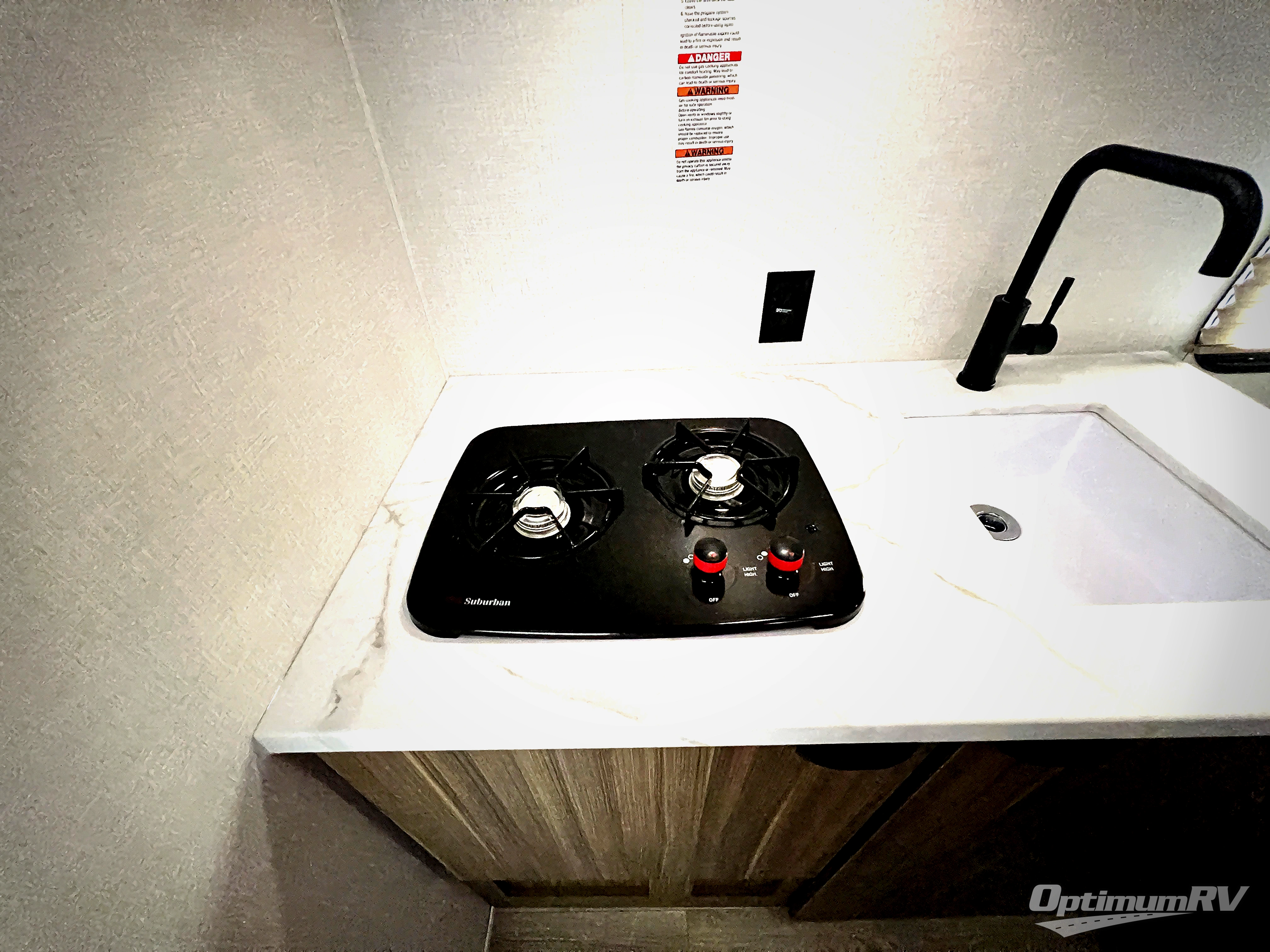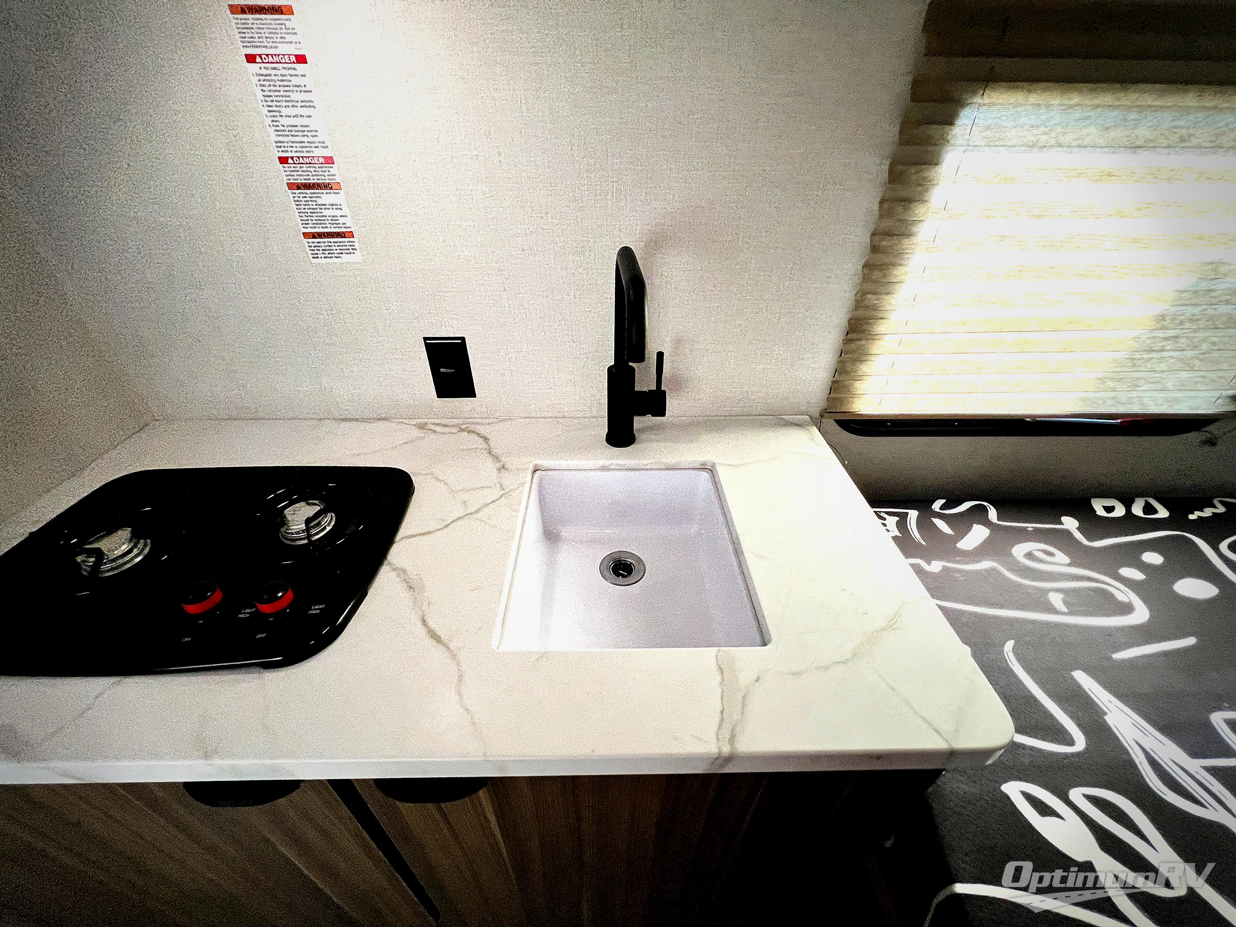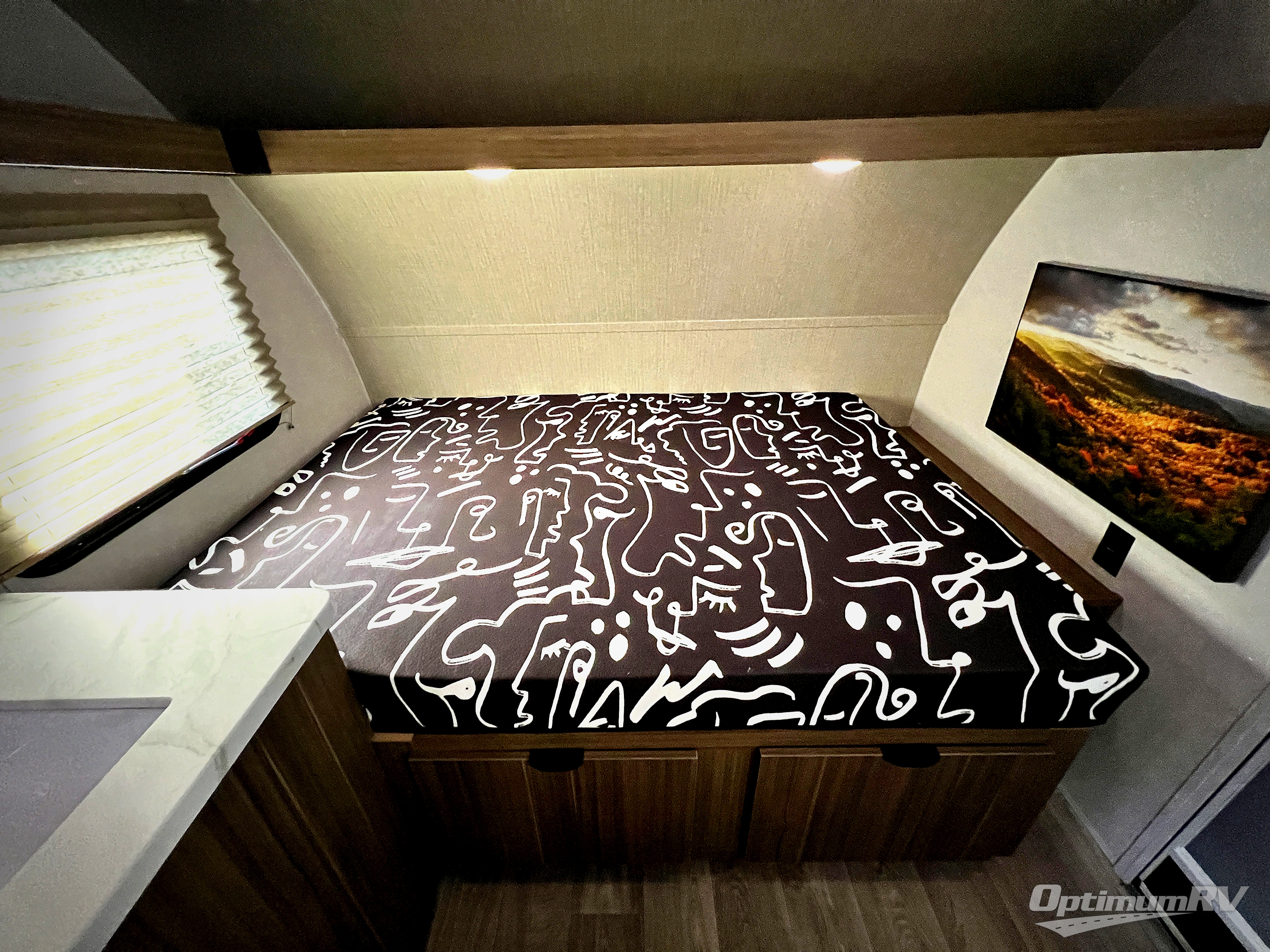 This lightweight travel trailer has everything you need to enjoy camping trips! There is a front east to west custom king bed with storage at the foot of the bed and overhead for your valuables. A private bath includes a toilet and walk-in shower so you can easily get ready each day, and you can prepare your meals on the two-burner cooktop when you get hungry. The booth dinette will provide dining space, along with sleeping space for one to two little ones. Don't let this trailer get away!