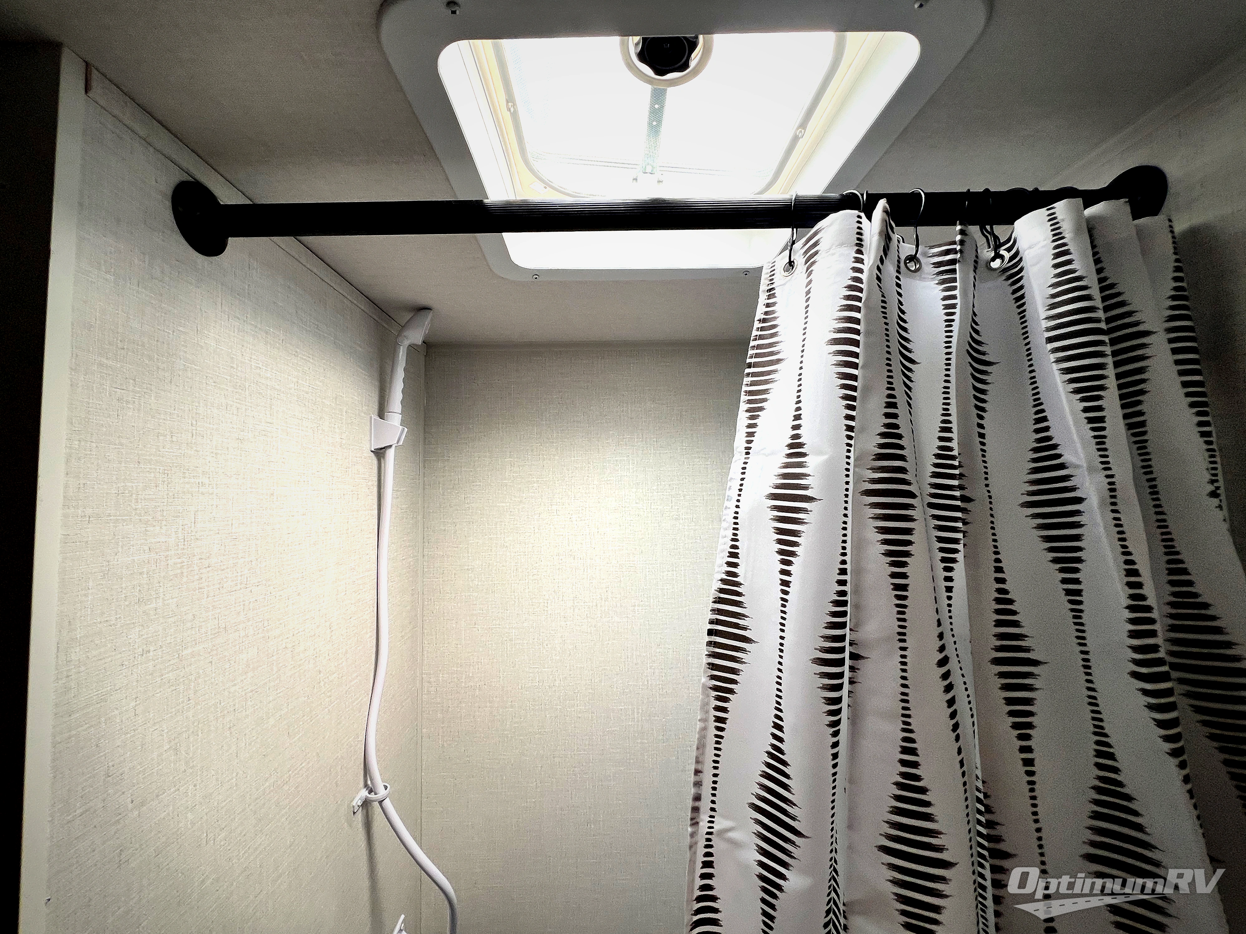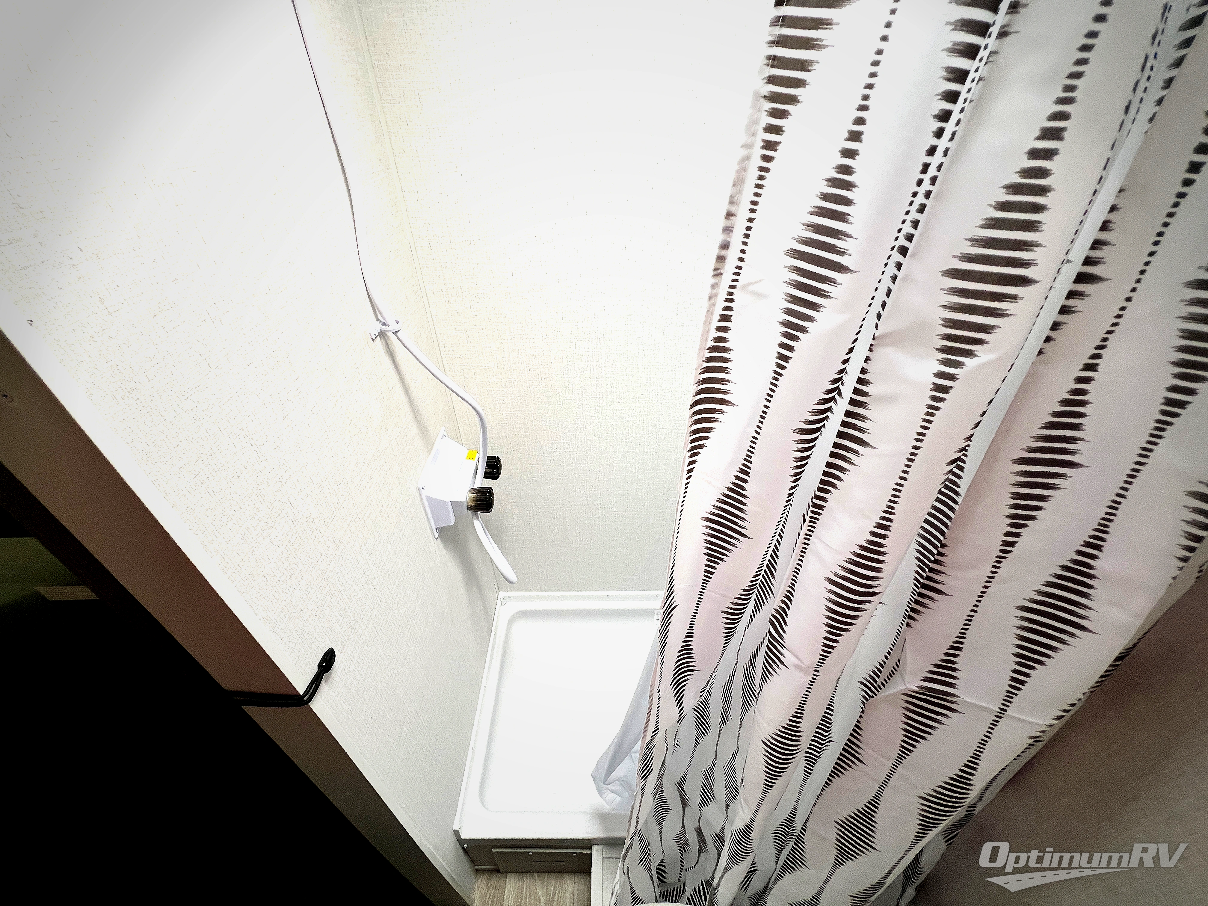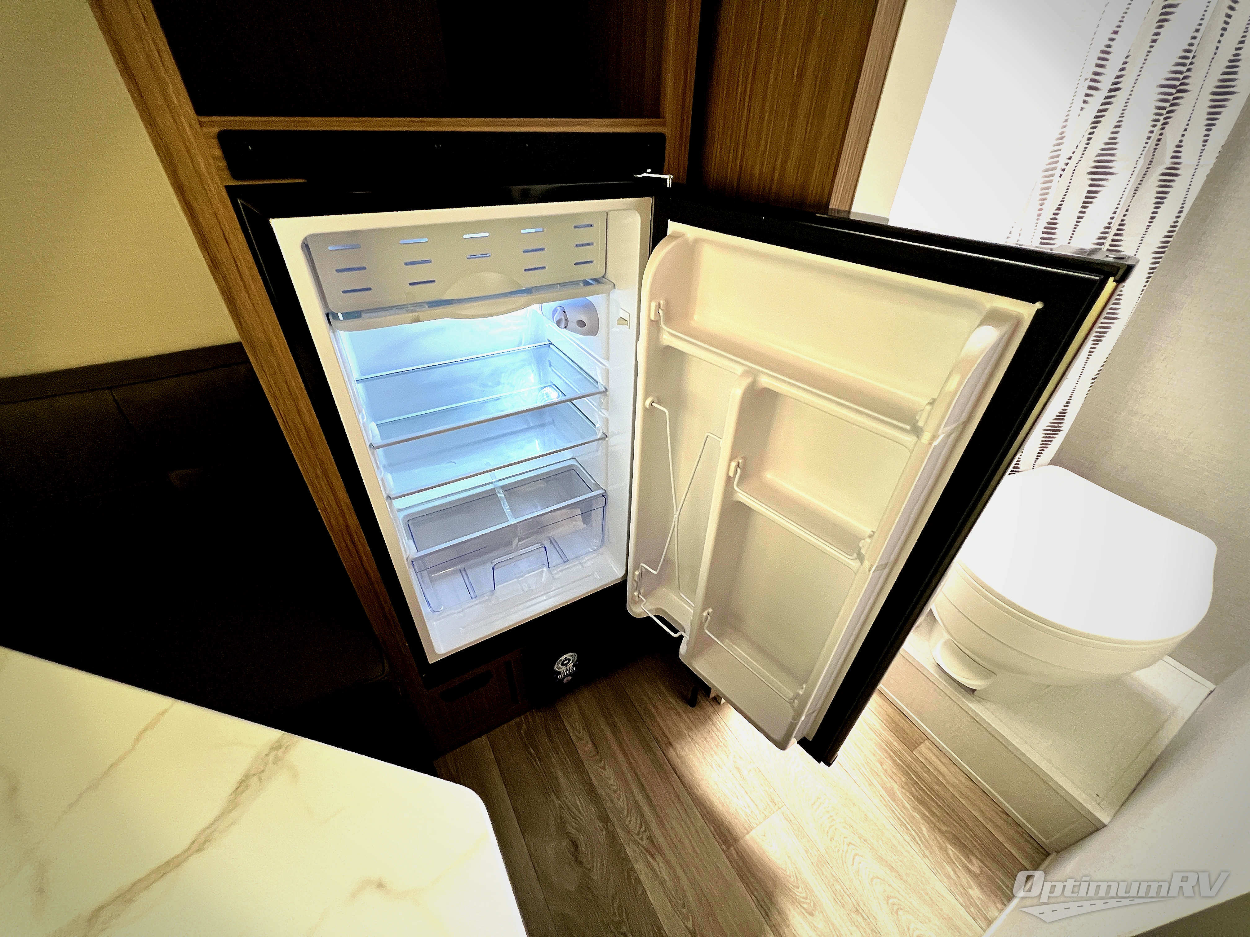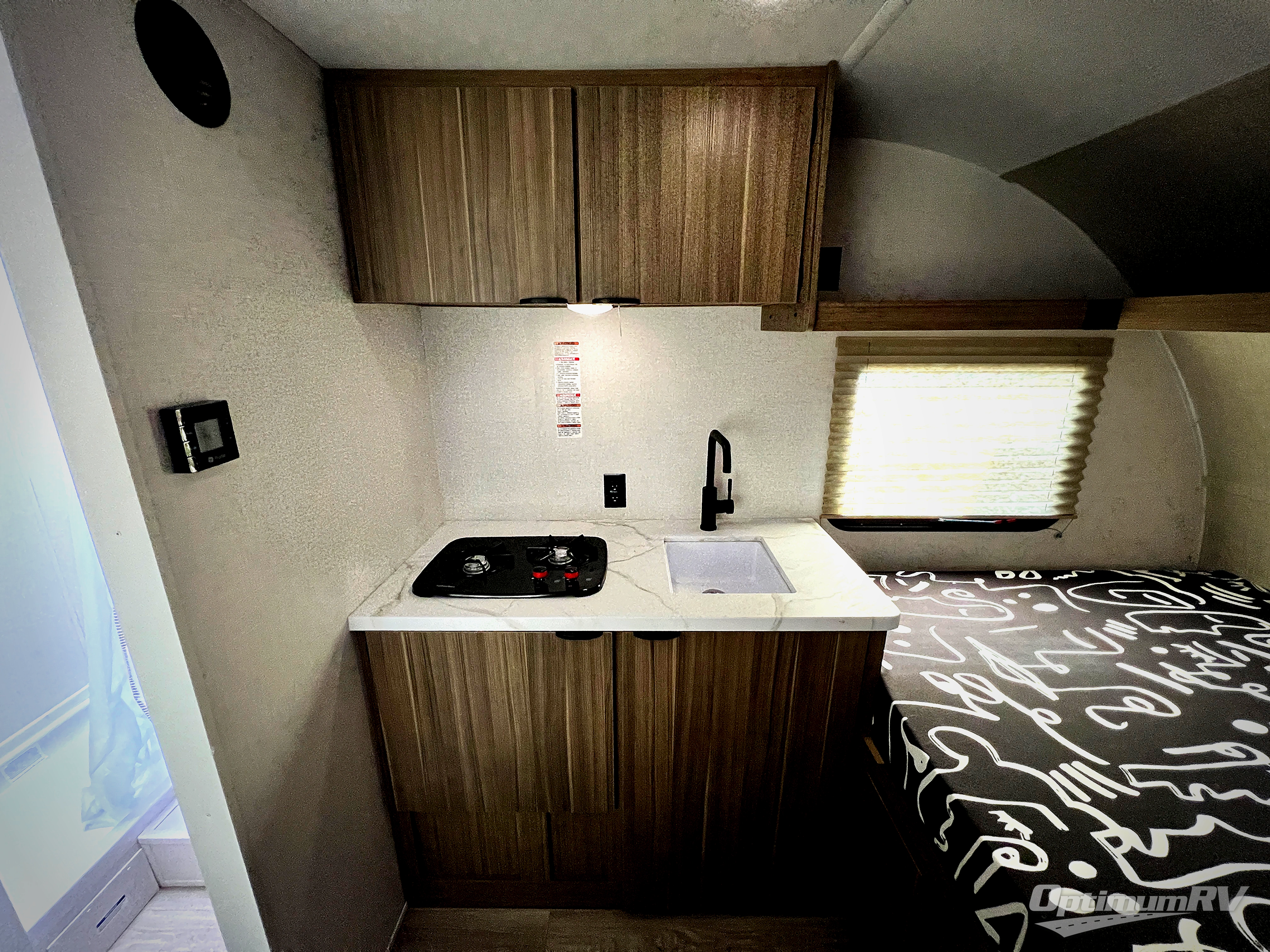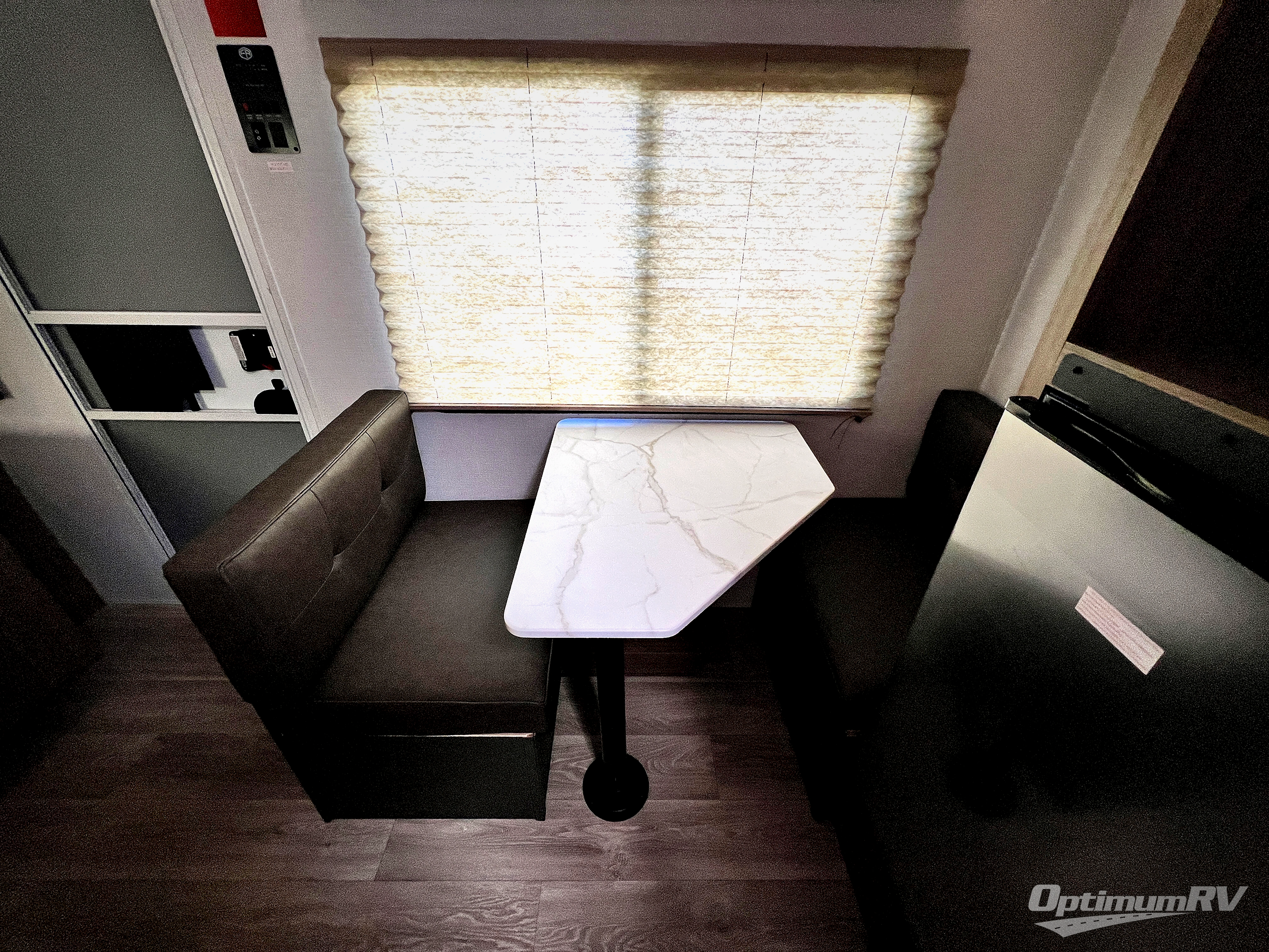This lightweight travel trailer has everything you need to enjoy camping trips! There is a front east to west custom king bed with storage at the foot of the bed and overhead for your valuables. A private bath includes a toilet and walk-in shower so you can easily get ready each day, and you can prepare your meals on the two-burner cooktop when you get hungry. The booth dinette will provide dining space, along with sleeping space for one to two little ones. Don't let this trailer get away!