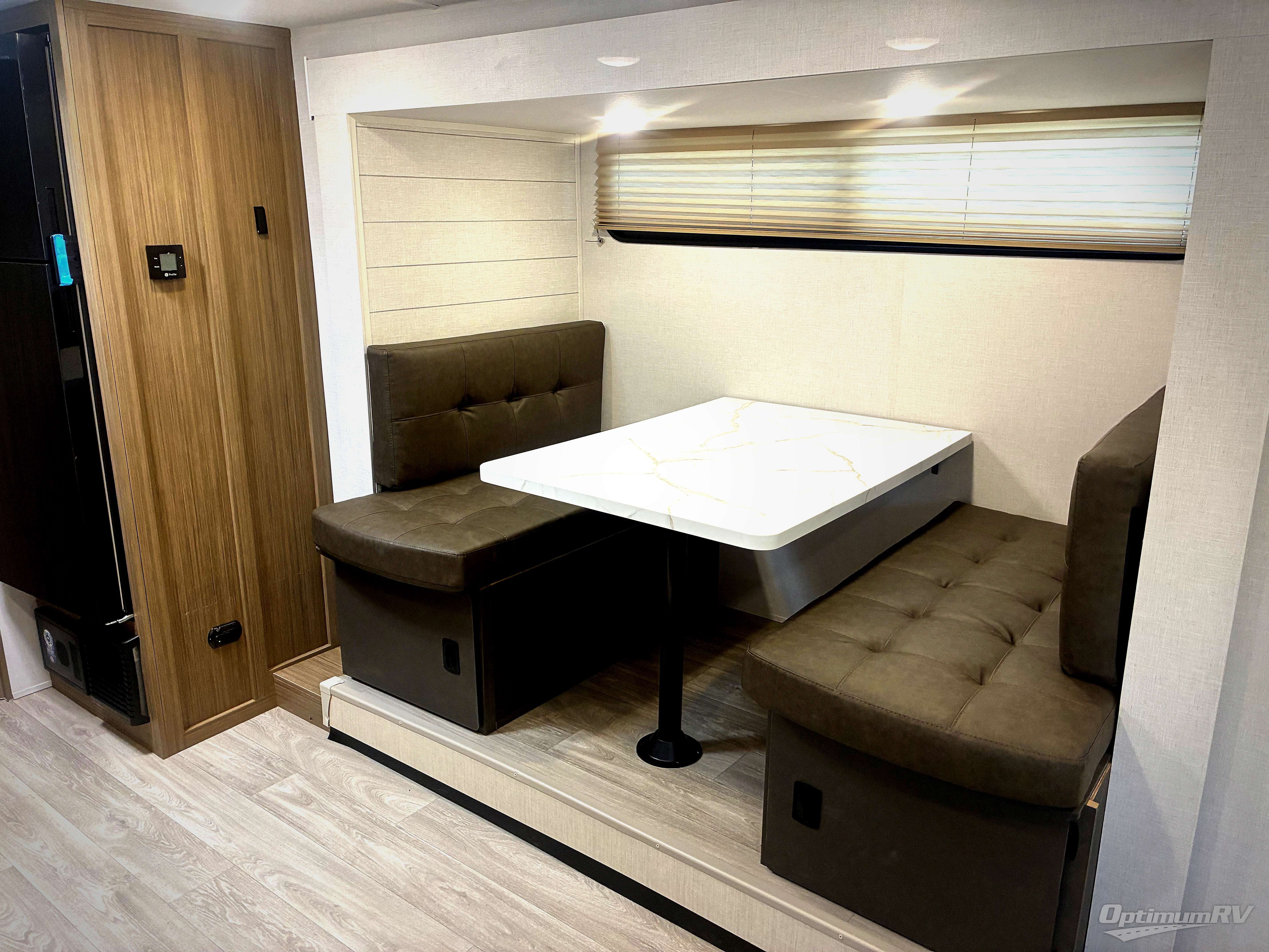 It will be so easy to enjoy time spent in this travel trailer for three. The front queen bed provides a great night's rest, and there is an overhead cabinet to keep your things organized. A two-burner cooktop in the kitchen will let you make meals for your crew, and a refrigerator keeps leftovers fresh. You can dine at the booth dinette within the slide out or take your plate outdoors to sit under the 12' power awning. And a full rear bath with a shower, toilet, and large vanity counter lets you stay clean each day!