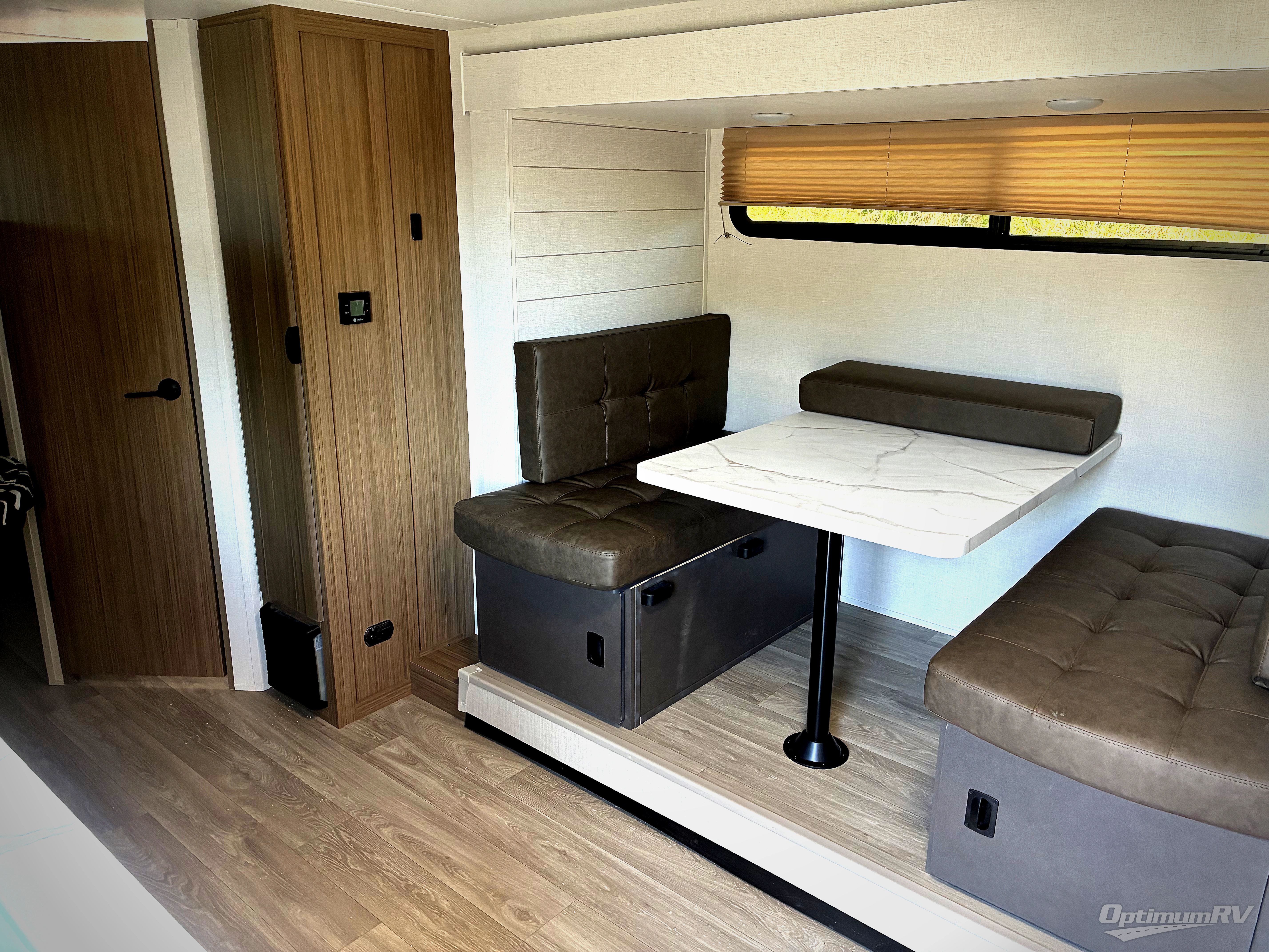 It will be so easy to enjoy time spent in this travel trailer for seven. The front queen bed provides a great night's rest, and there is an overhead cabinet to keep your things organized. Your guests or little ones can claim the double-size bunks for themselves, and there is a full bath adjacent to the bunks for easy nighttime use. A two-burner cooktop in the kitchen will let you make meals for your crew, and a refrigerator keeps leftovers fresh. You can dine at the booth dinette within the slide out or take your plate outdoors to sit under the 15' power awning.